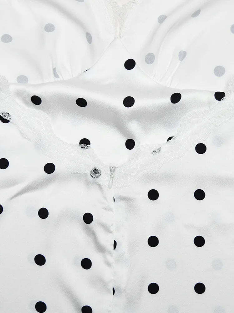 Playful yet sultry, this mini dress features a polka dot print, delicate lace trim, and an open back design. With its silky fabric and flattering cut, it’s the perfect pick for nights out, date nights, or when you want chic retro-inspired vibes.