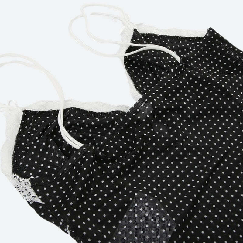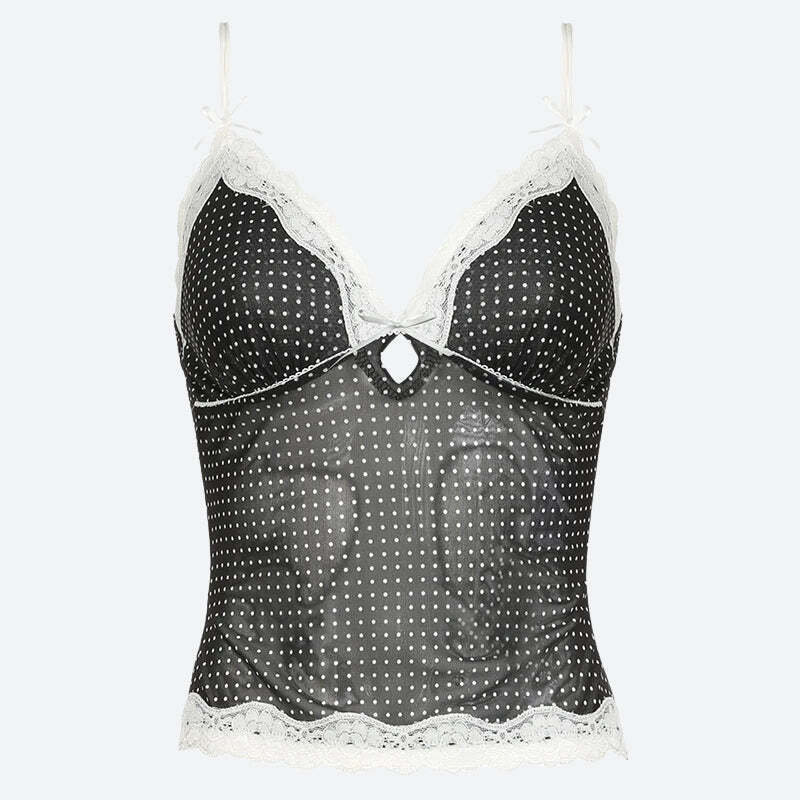 This polka dot mesh top exudes vintage charm with its delicate lace trim and sheer detailing. The soft spaghetti straps and bow accents make it a feminine choice for layering or standalone wear. Pair it with skirts or high-waisted pants for a dreamy aesthetic.