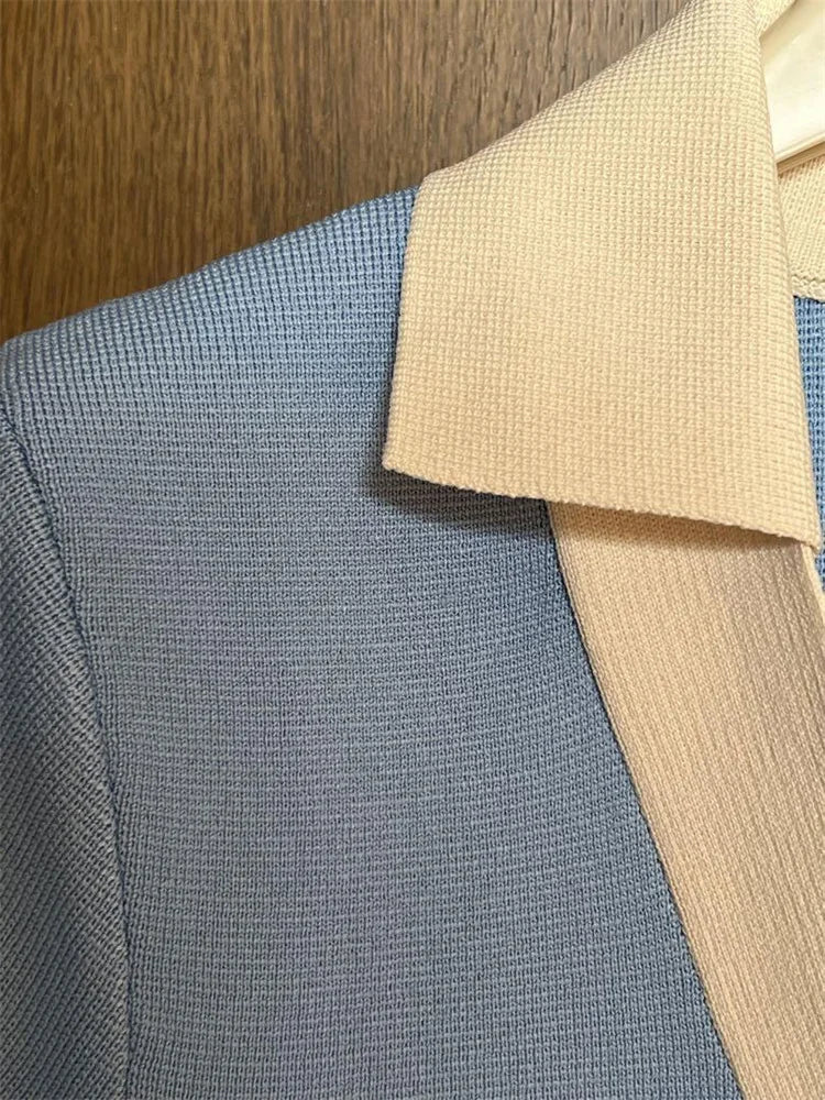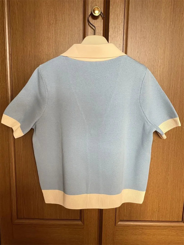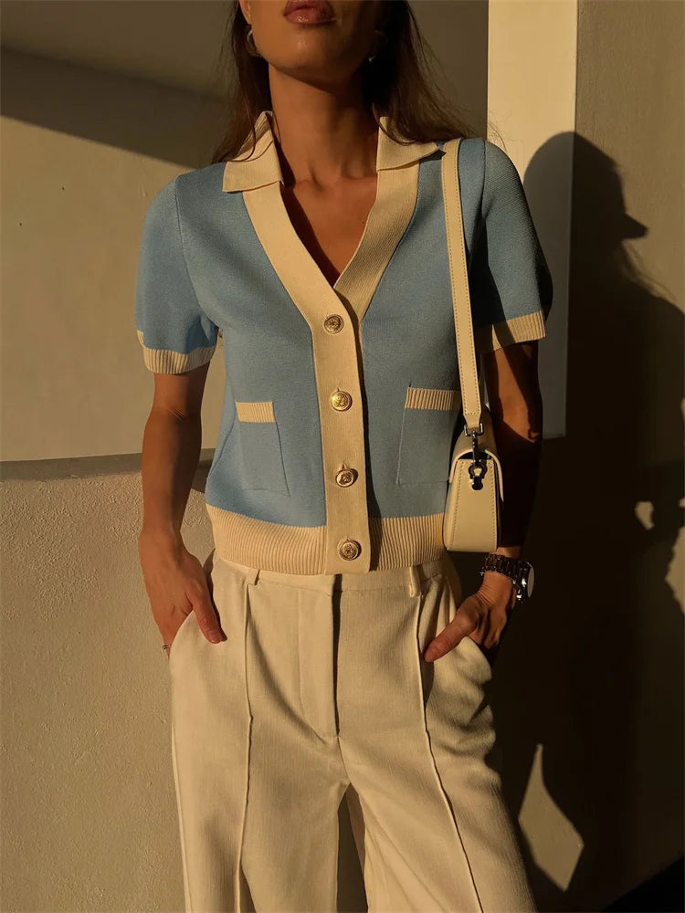 A pastel-toned cardigan with short sleeves, contrast trim, and button-up closure. Its soft knit and cropped fit make it ideal for layering with tanks, dresses, or high-waist pants, giving off a chic yet casual aesthetic that works day to night.