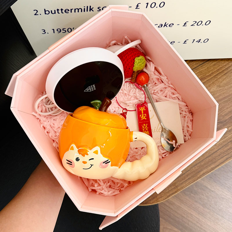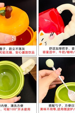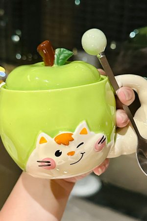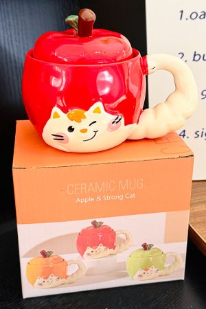 Quirky Apple Cat Ceramic Mug with Lid – a Cute Gift for Birthday Outfit Lovers