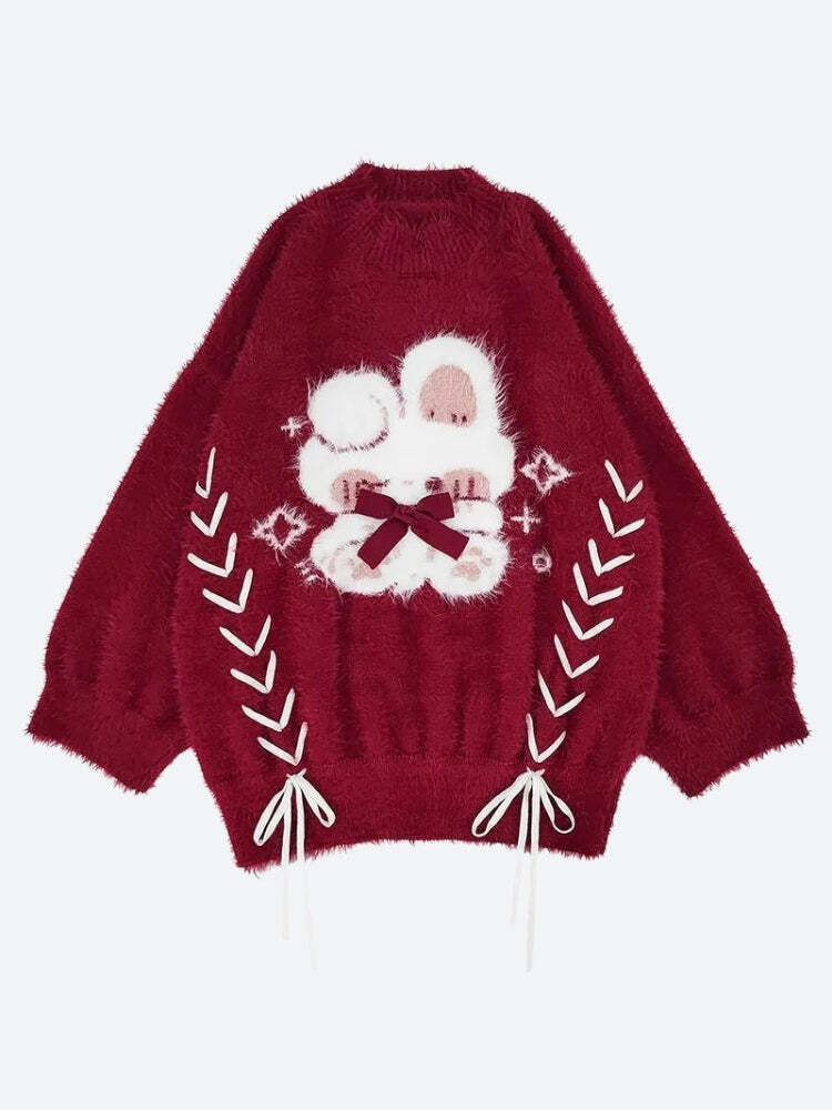 Cuddle up in the Rabbit Fluffy Xmas Sweater, designed with an adorable rabbit motif and soft, oversized fit. This rich burgundy piece features lace-up details and plush textures, ideal for a cozy yet stylish statement.