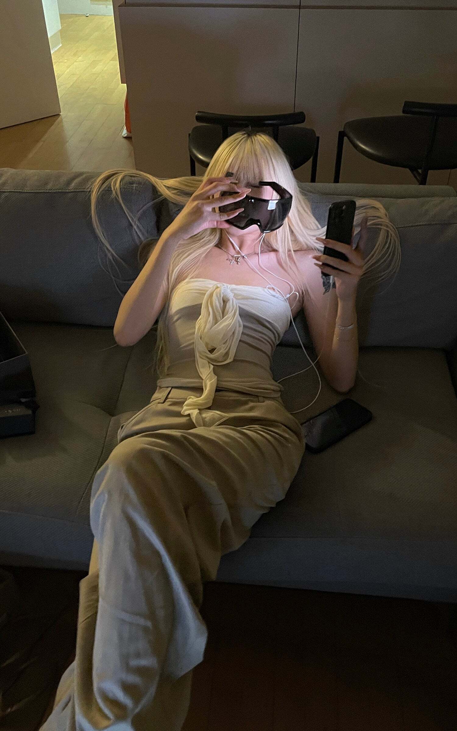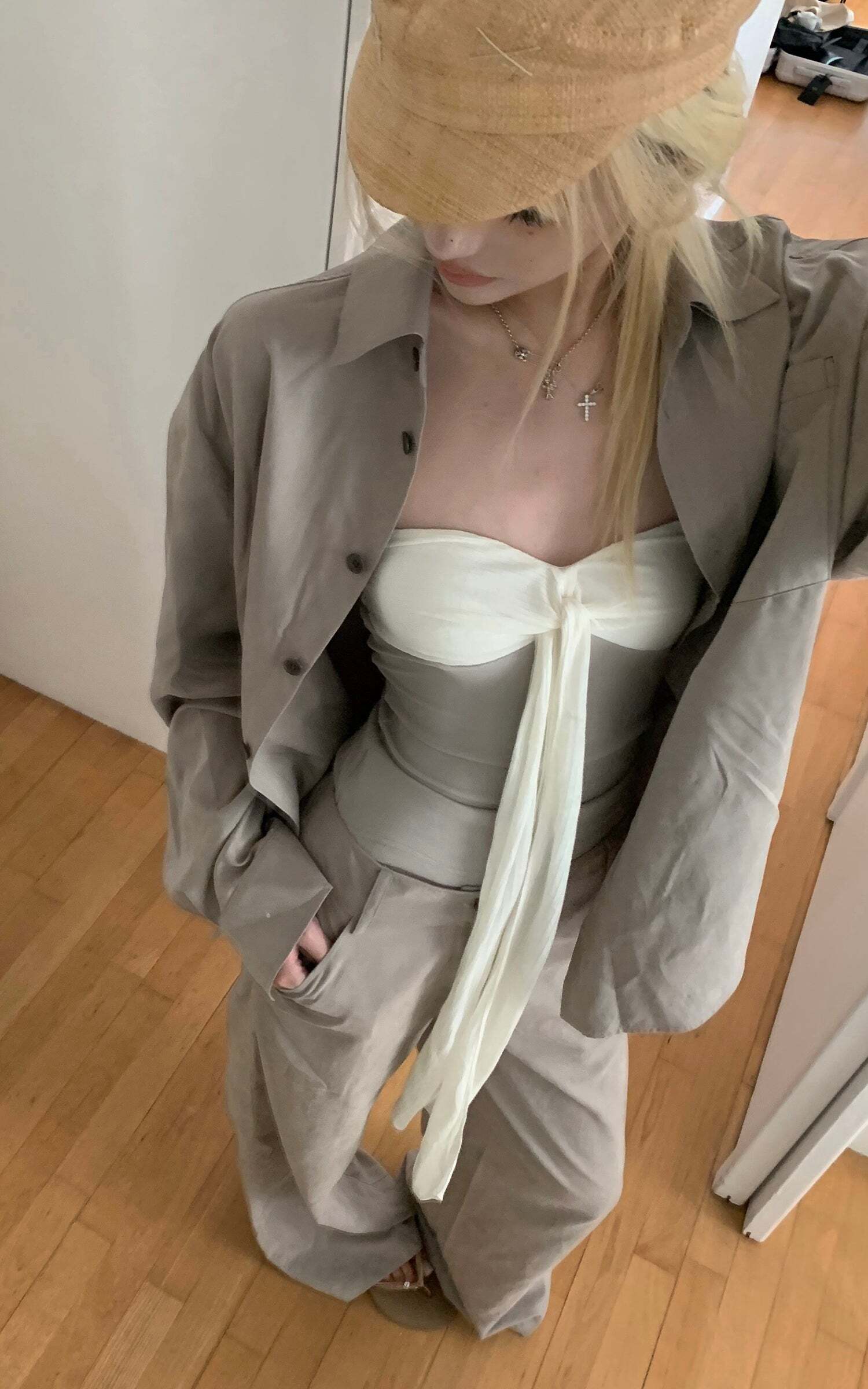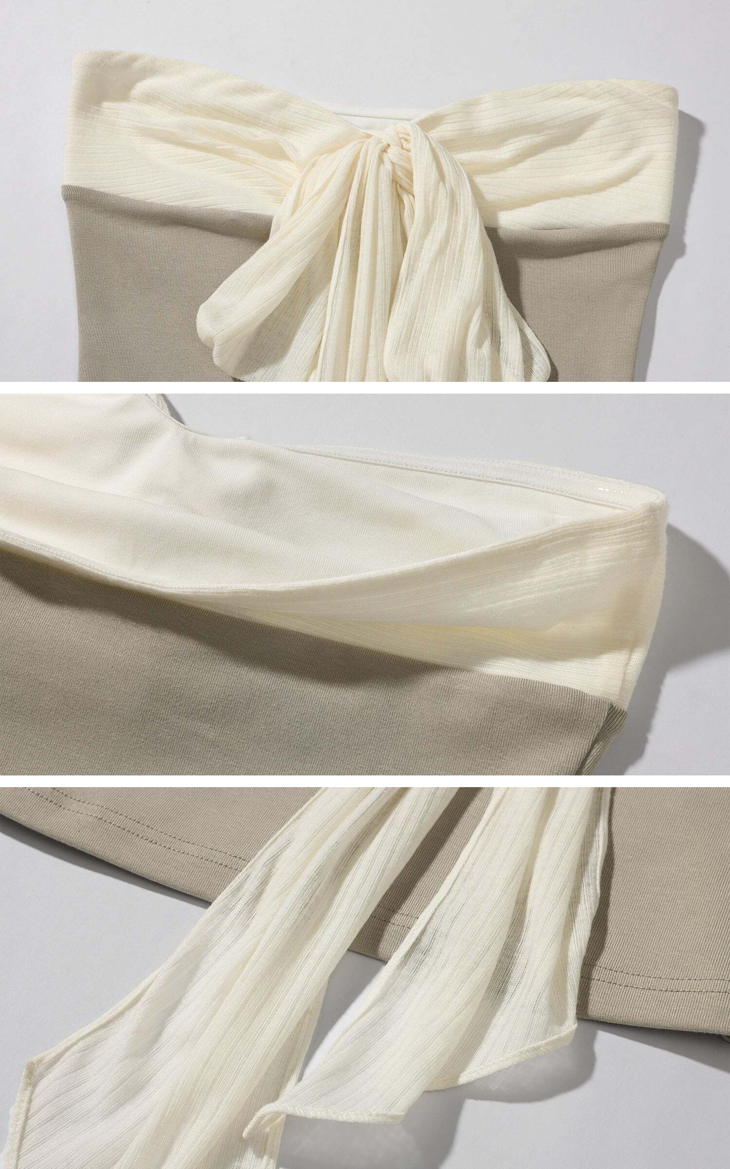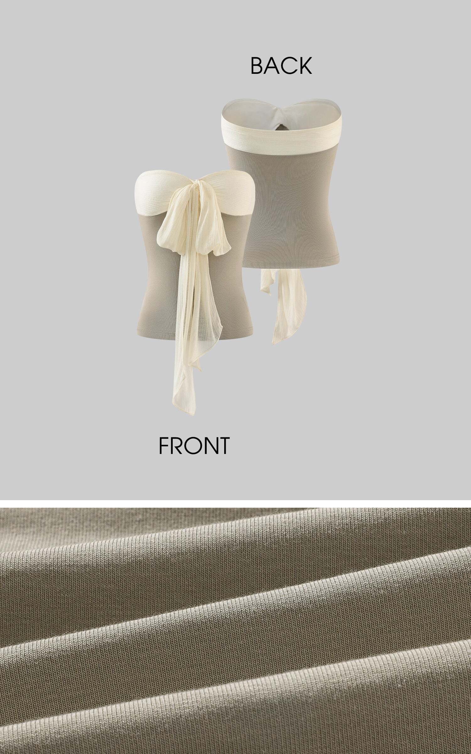 This tube top is defined by its minimal silhouette, balanced with a cascading bow that falls fluidly across the body. Crafted from soft knit and sheer fabric, it molds to the figure while retaining a sense of air and movement. The exposed neckline contrasts with the deconstructed bow, creating a look that is both poetic and restrained.