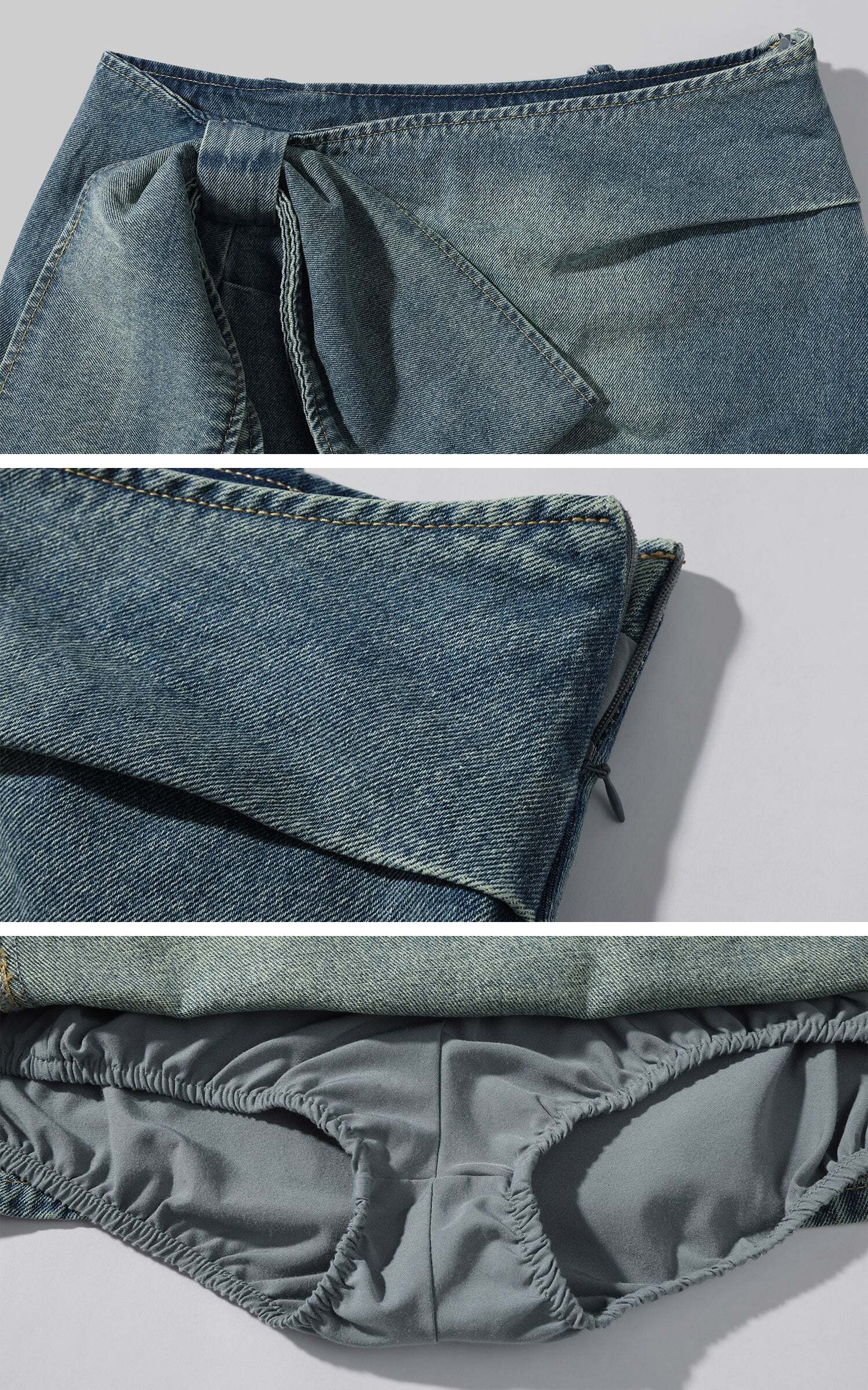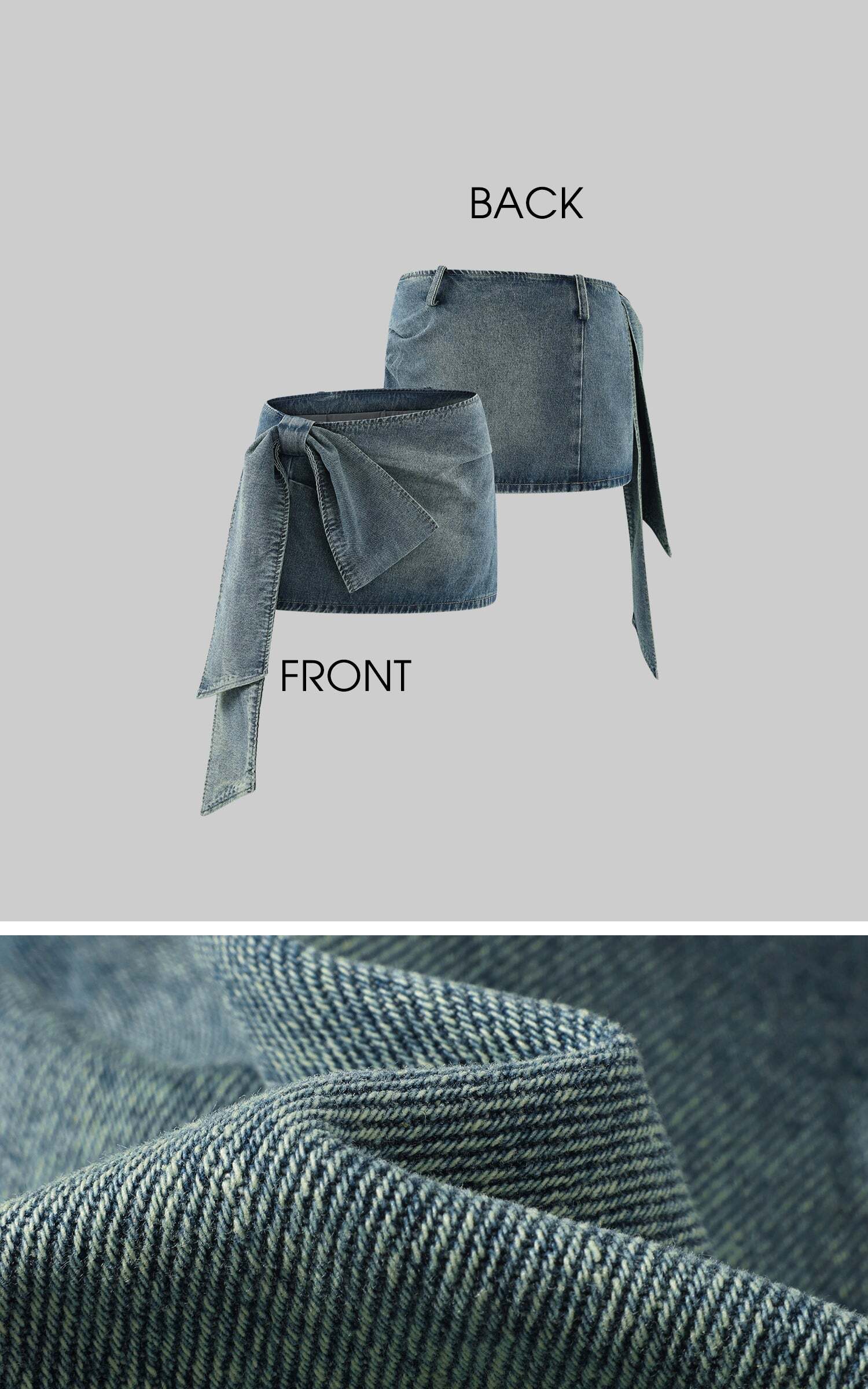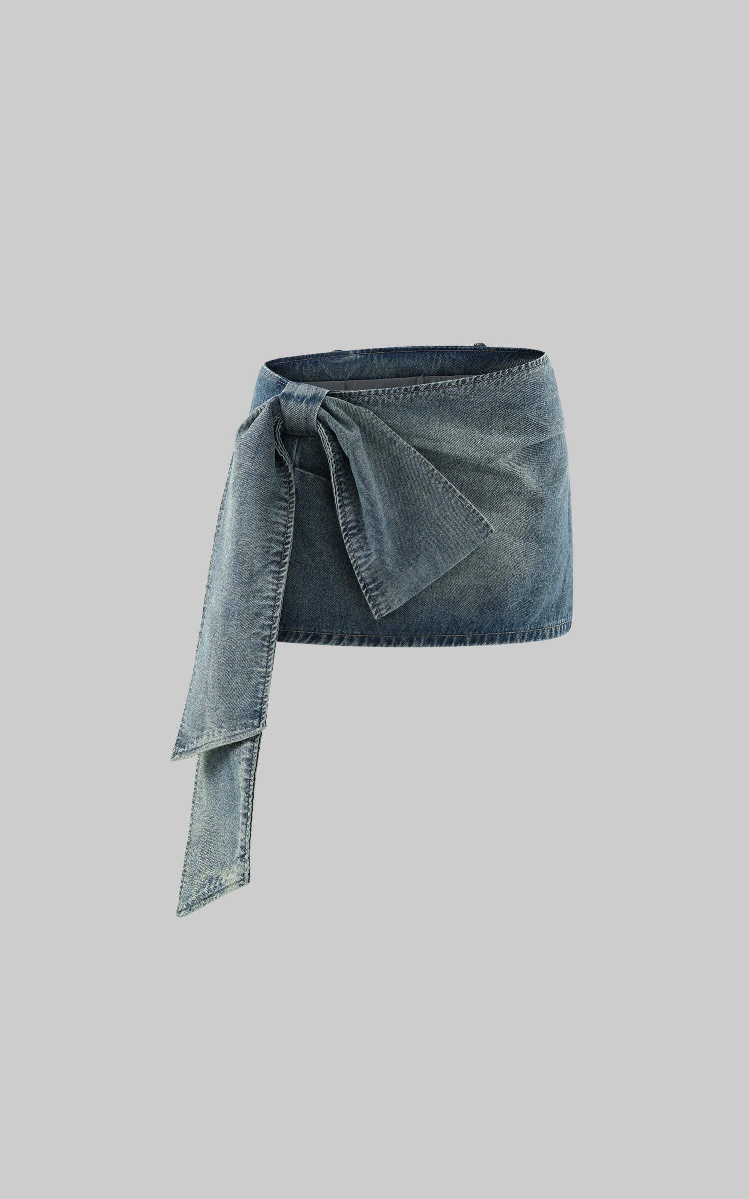 This denim mini skirt redefines the classic silhouette with a deconstructed edge. The asymmetric tie-front drapes down the leg, merging nonchalant ease with a sense of strength. Crafted from soft yet structured washed denim, it features natural fading and fine texture that contour the body without restriction. A concealed side zipper ensures a clean finish, while the built-in lining offers both comfort and security. Perfect paired with cropped tops or tall boots, it moves effortlessly between streetwear and avant-garde styling.