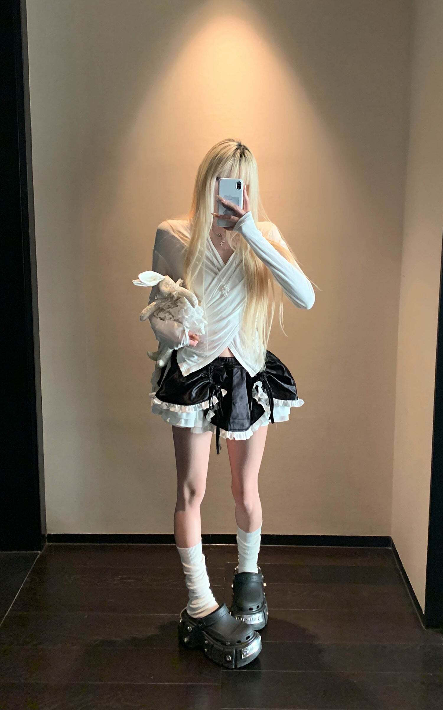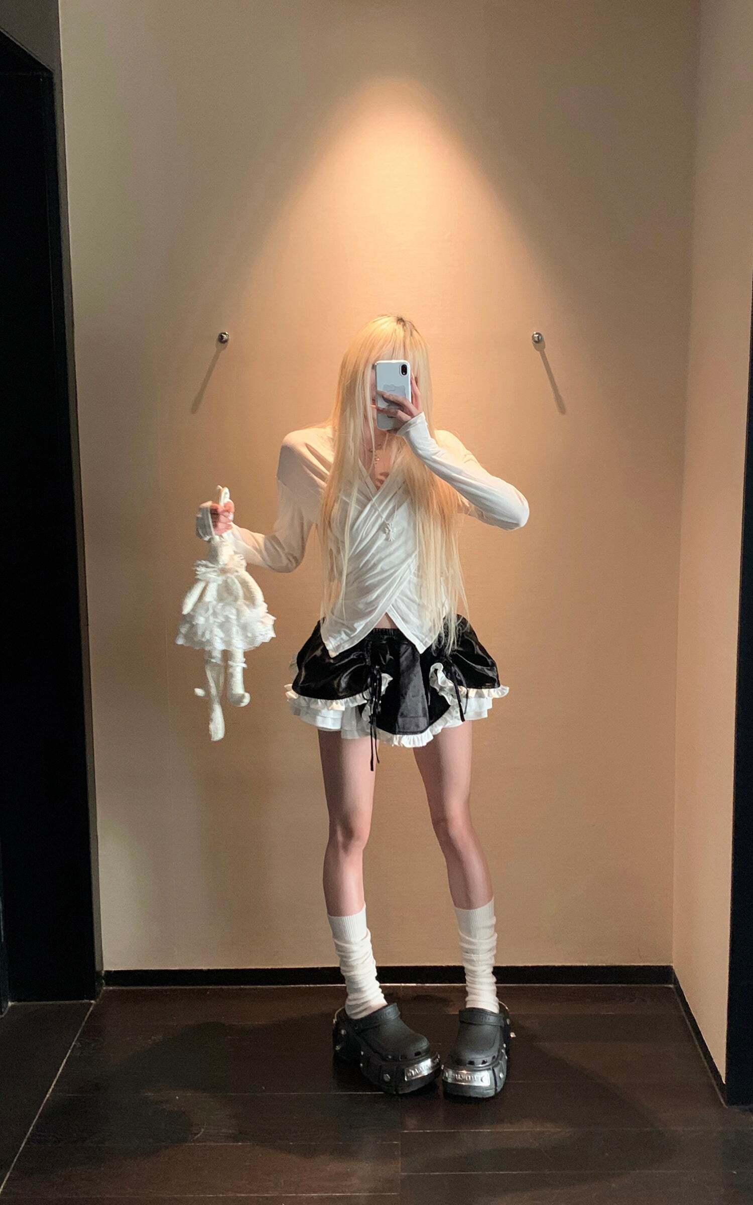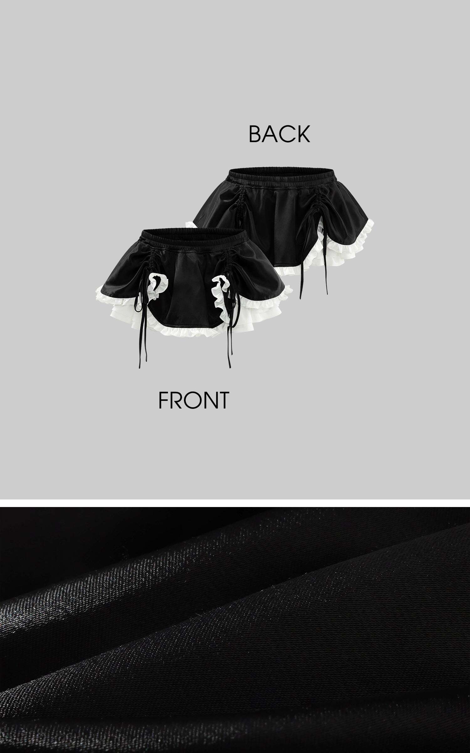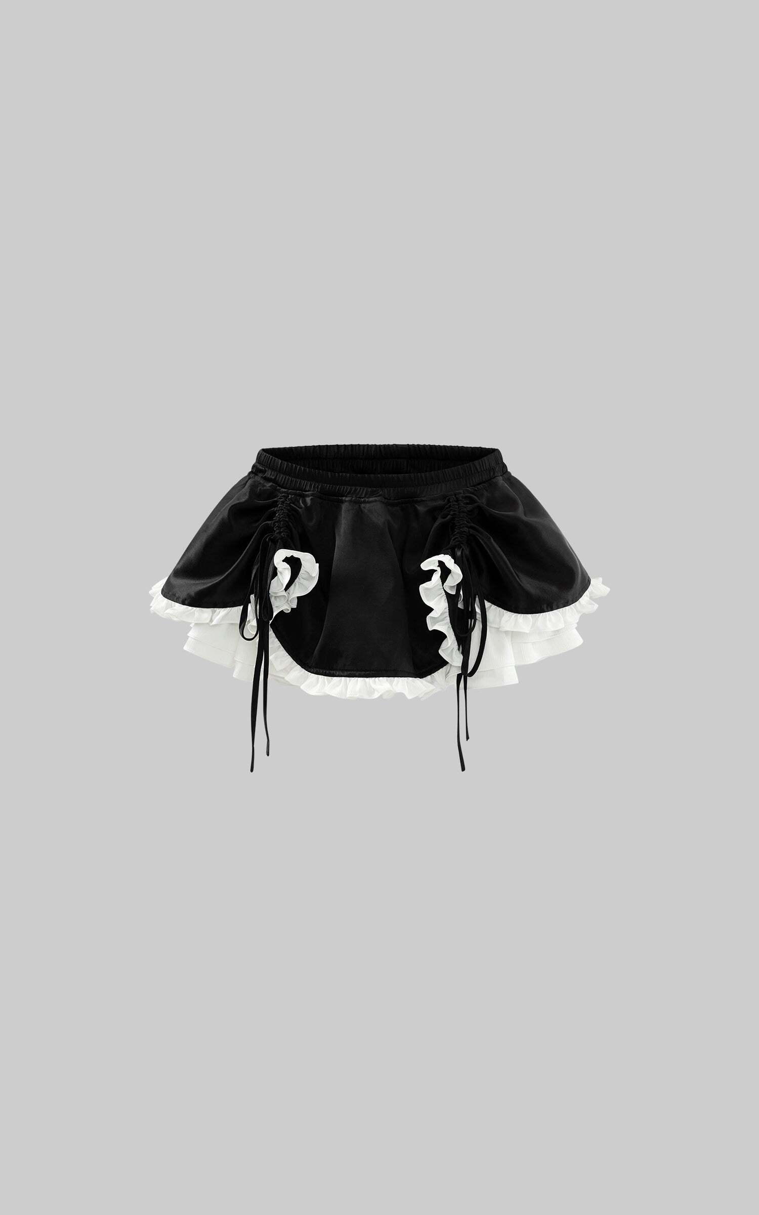 This black skirt unfolds in layered contrasts, merging the luster of satin with the softness of ruffled trim. Adjustable drawstring details at the sides allow subtle shifts in volume, balancing fluidity with structure. The interplay of black and white transforms everyday wear into a theatrical gesture, suspended between poetry and edge.