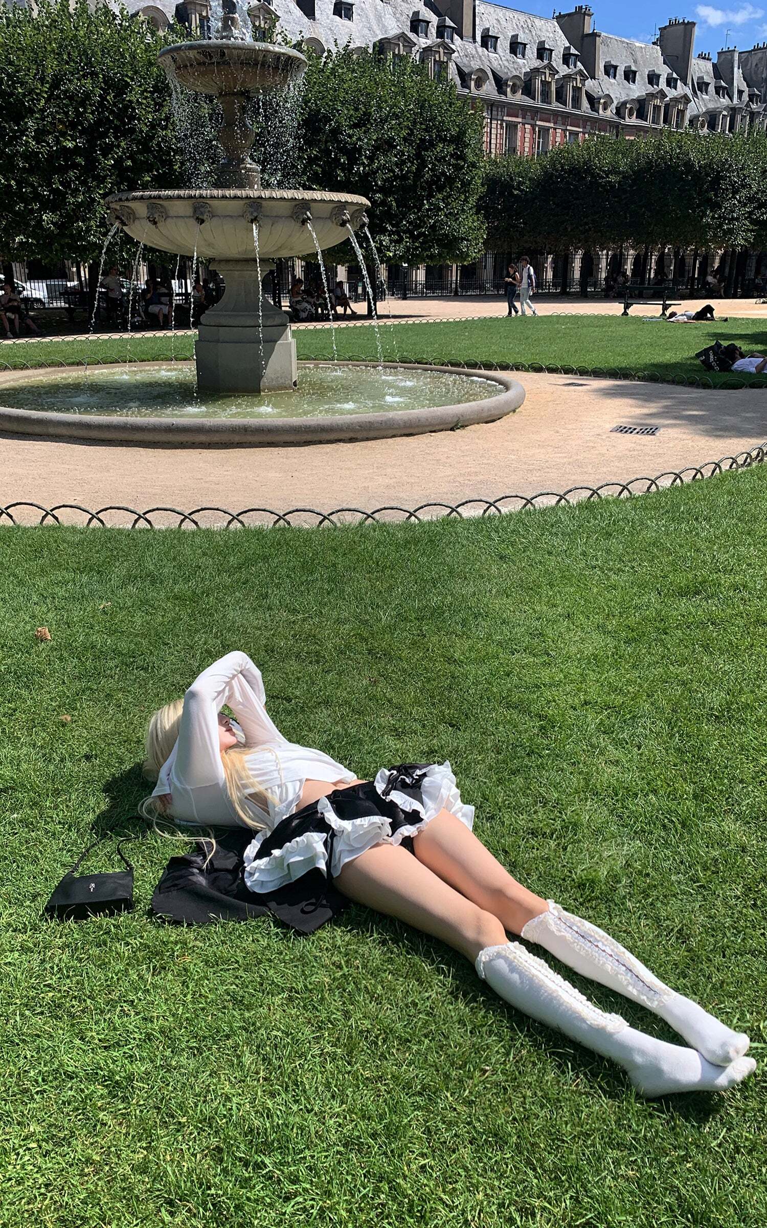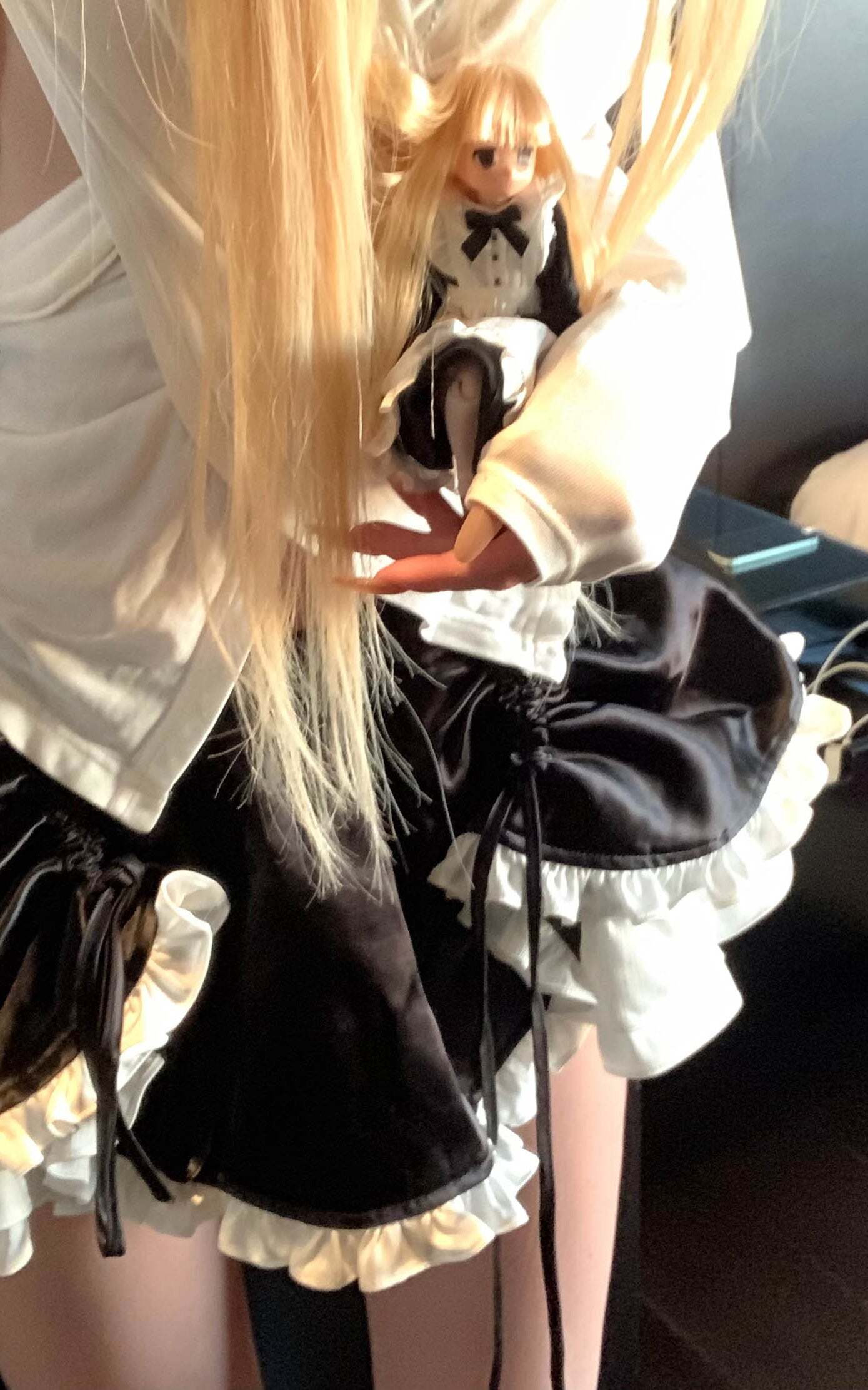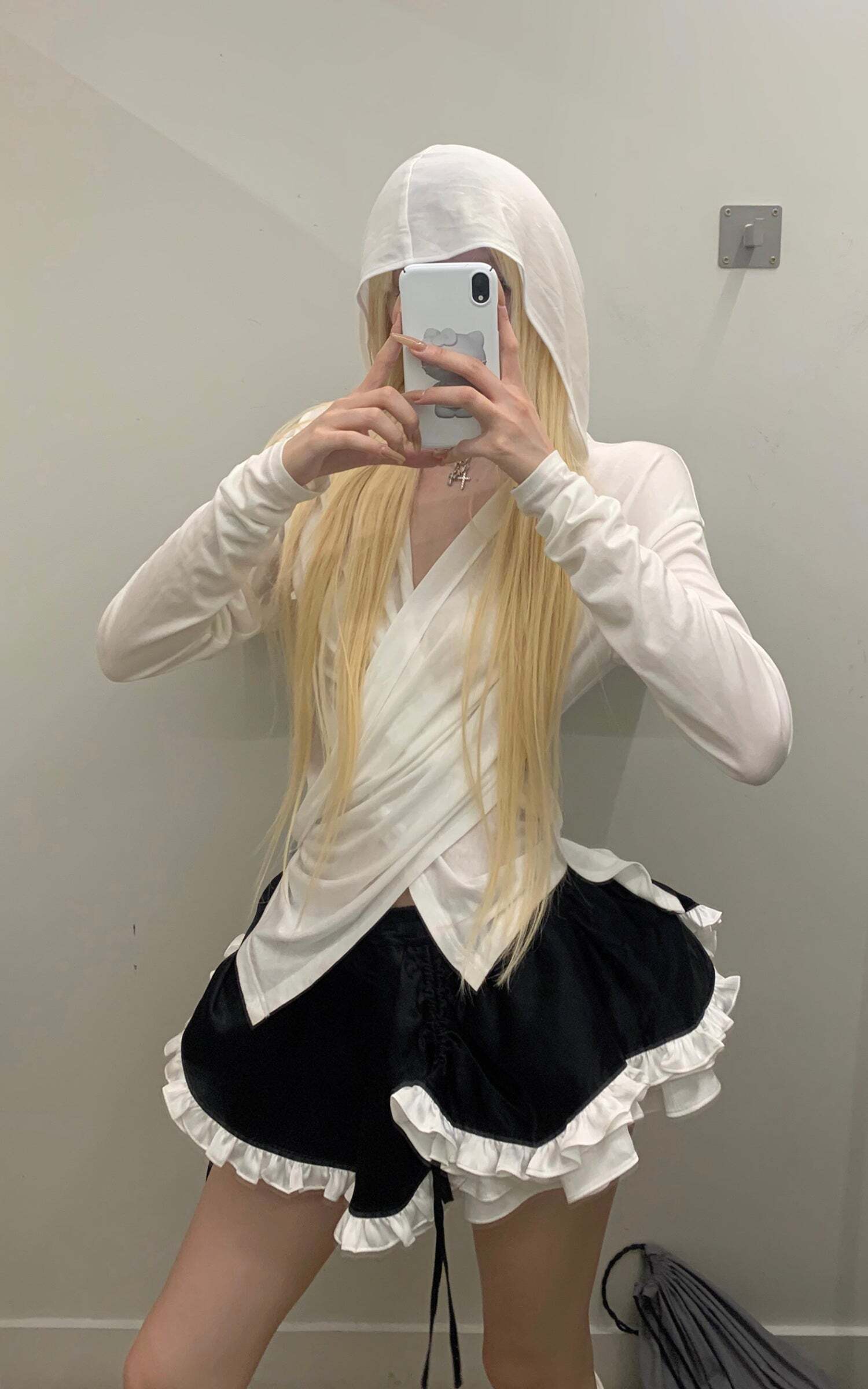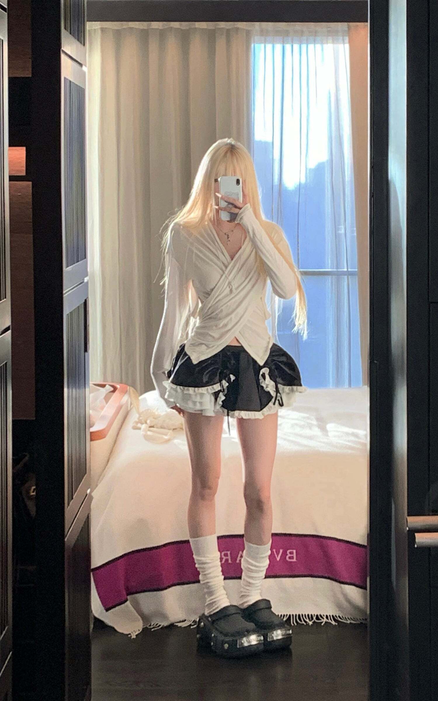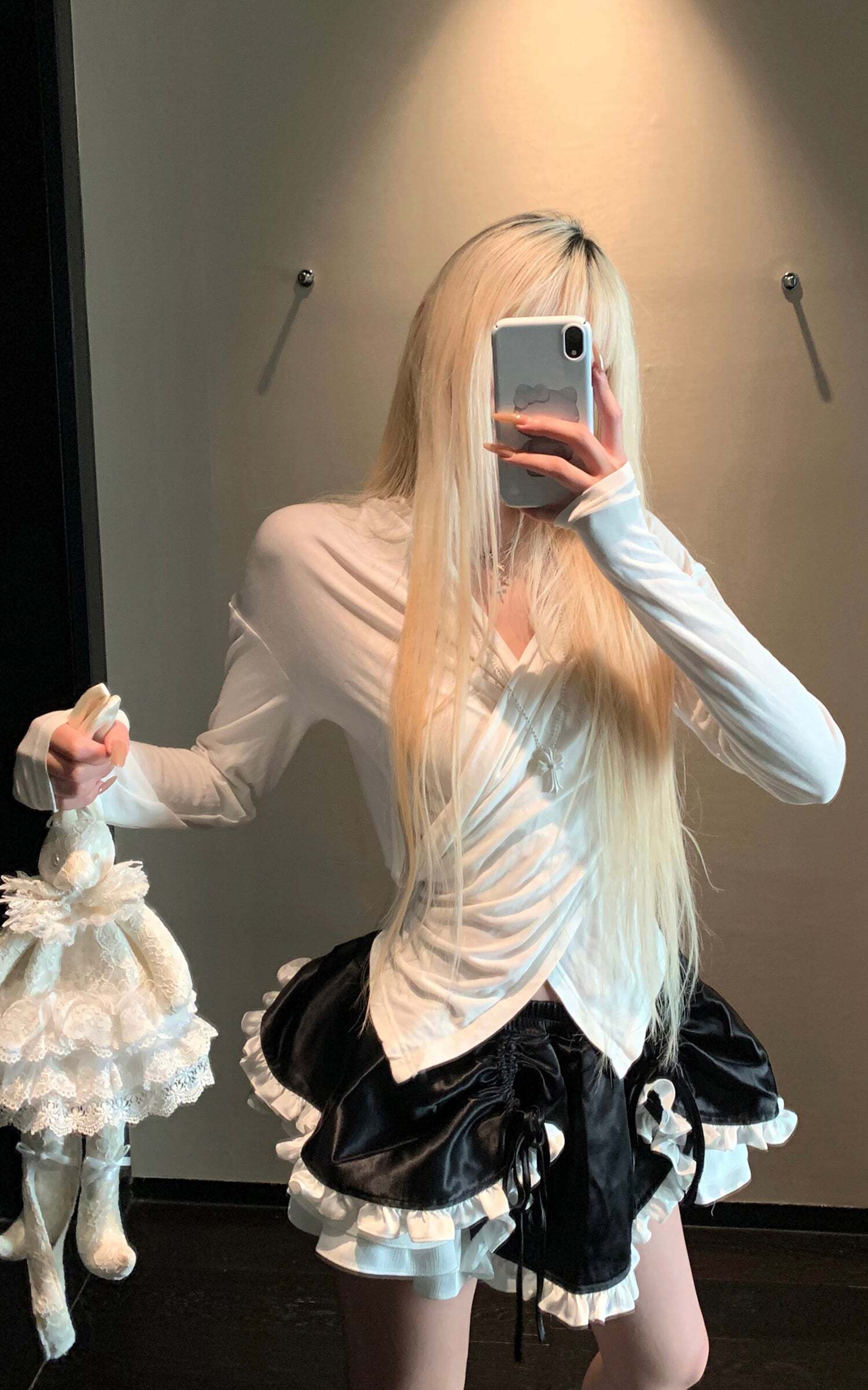 This black skirt unfolds in layered contrasts, merging the luster of satin with the softness of ruffled trim. Adjustable drawstring details at the sides allow subtle shifts in volume, balancing fluidity with structure. The interplay of black and white transforms everyday wear into a theatrical gesture, suspended between poetry and edge.