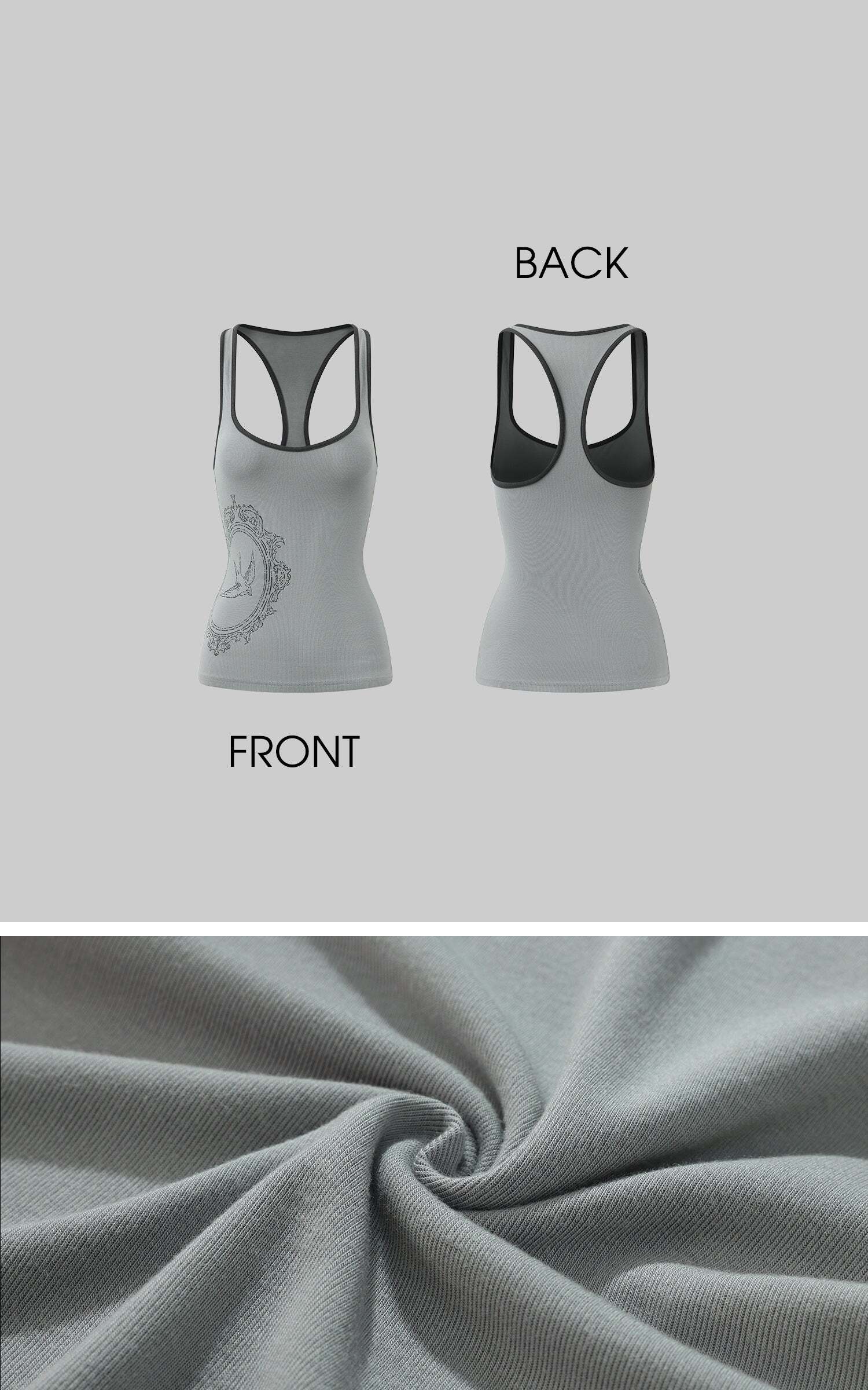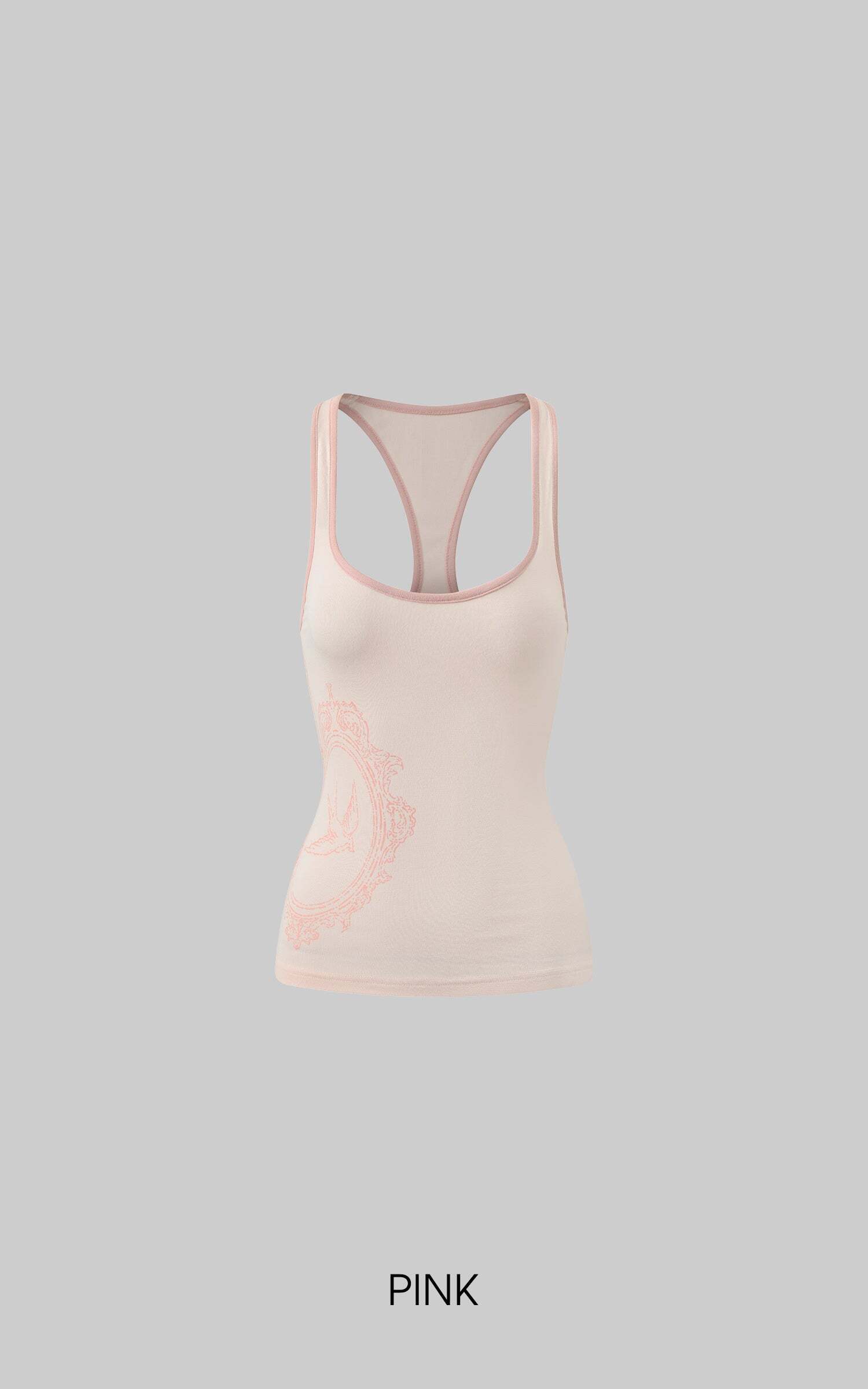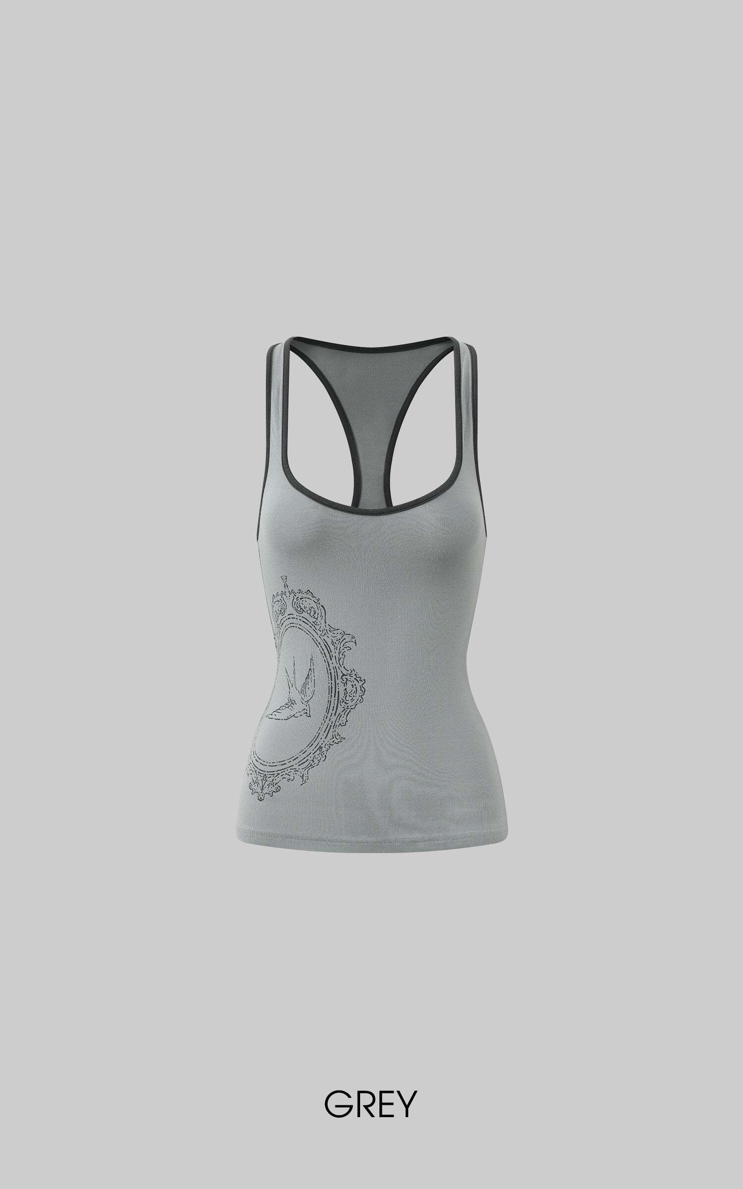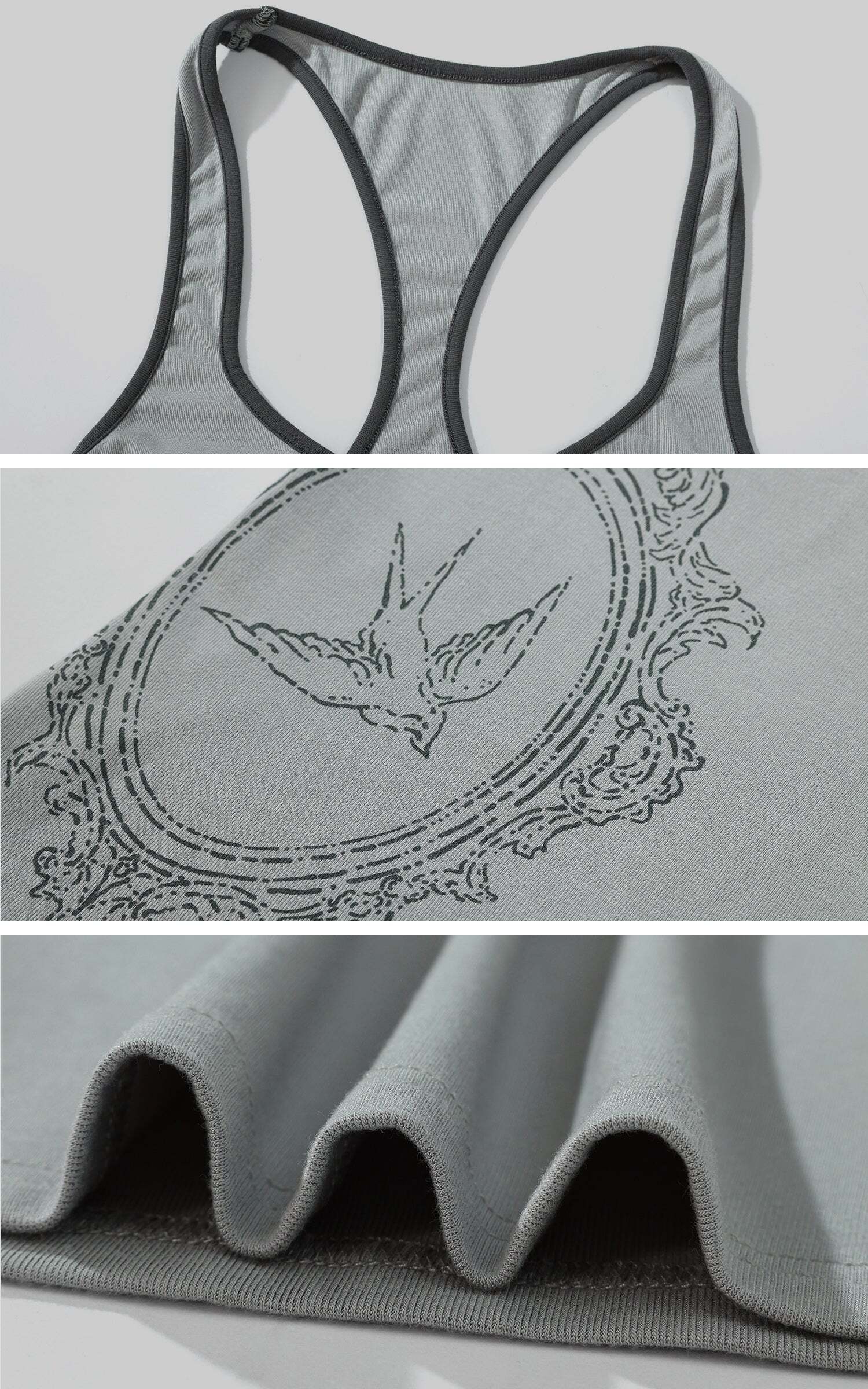 Made from soft ribbed cotton, this fitted top embraces the skin with a barely-there comfort. Inspired by classical frames and adorned with a soaring bird, the contrast print across the chest speaks softly yet powerfully. Slender shoulder straps and a cinched waist carve a sharp, delicate silhouette. Whether worn alone or layered, it sketches a solitary, free-spirited figure, imbued with a stark, quiet intensity.