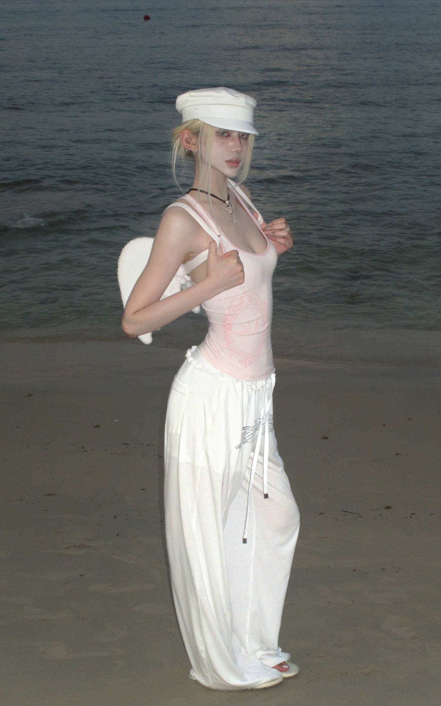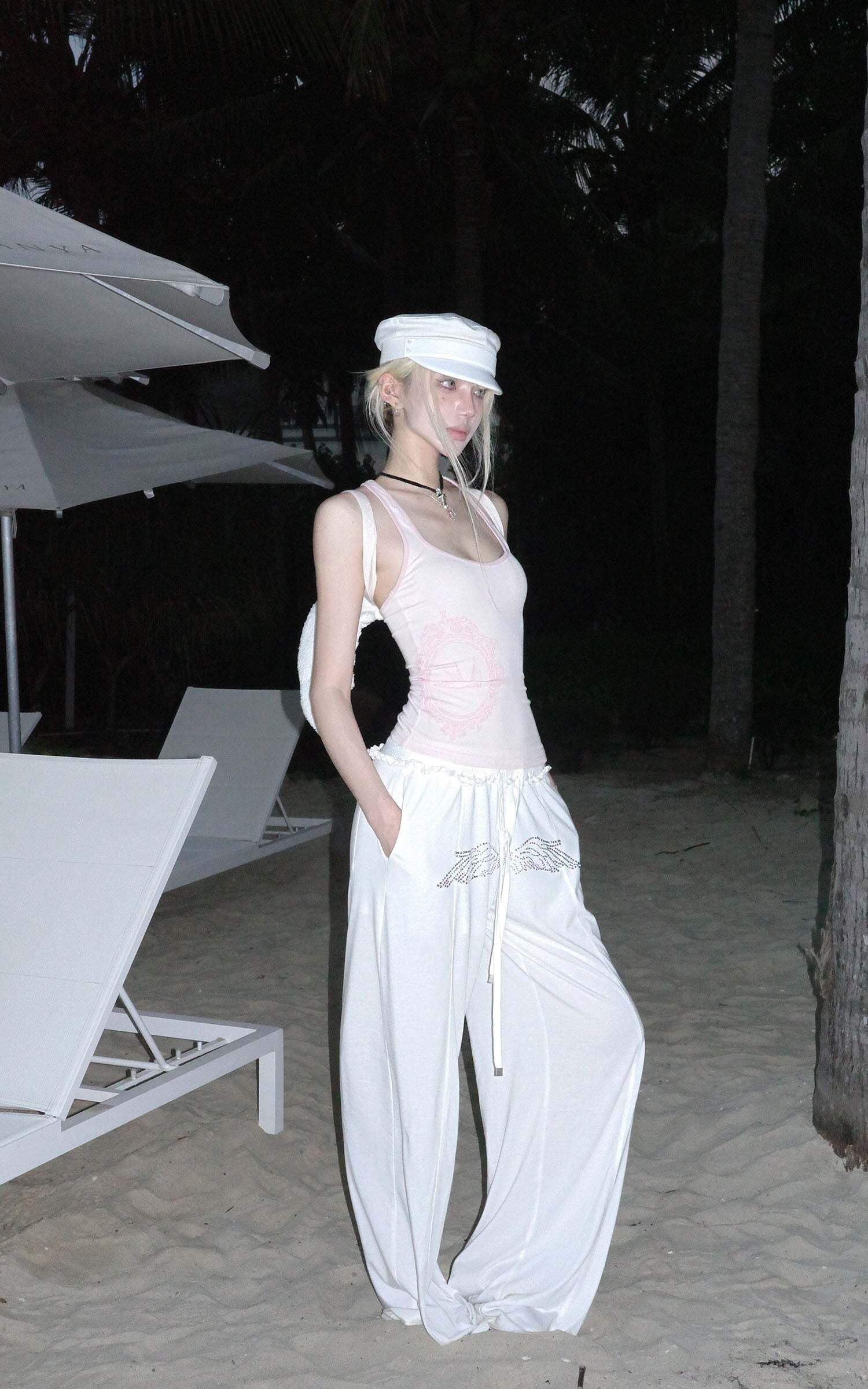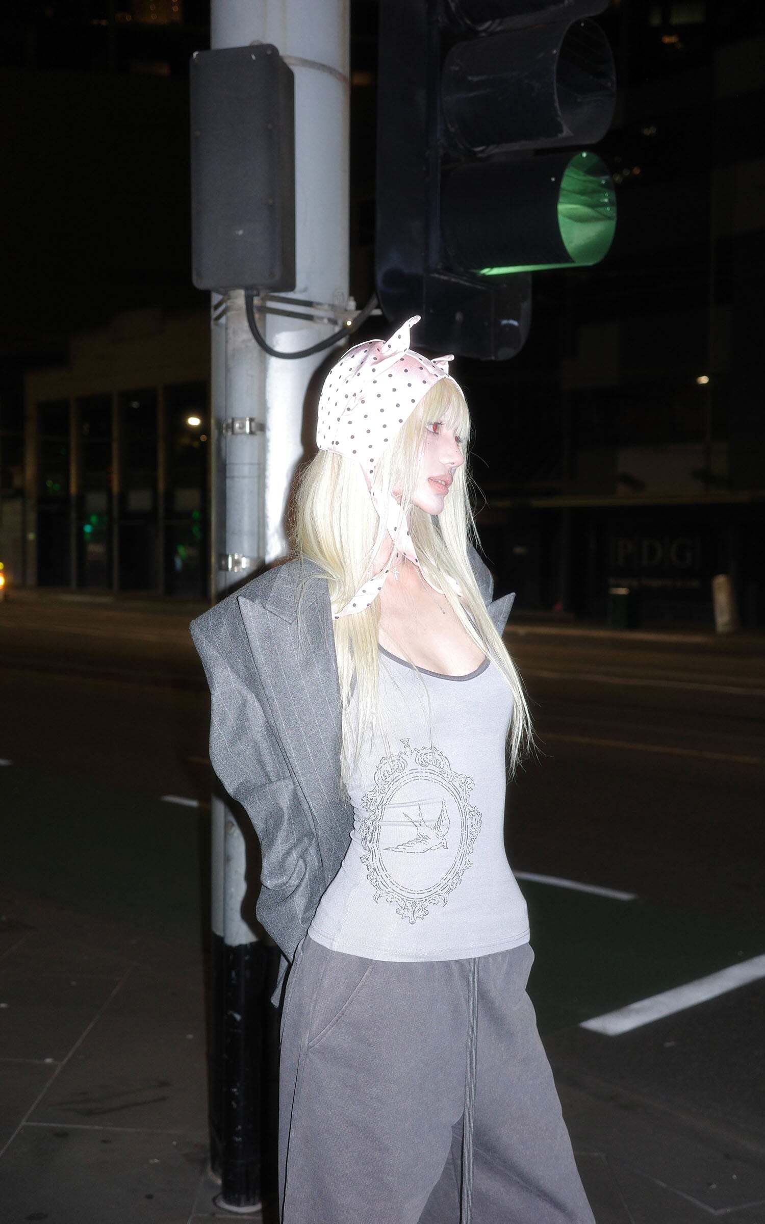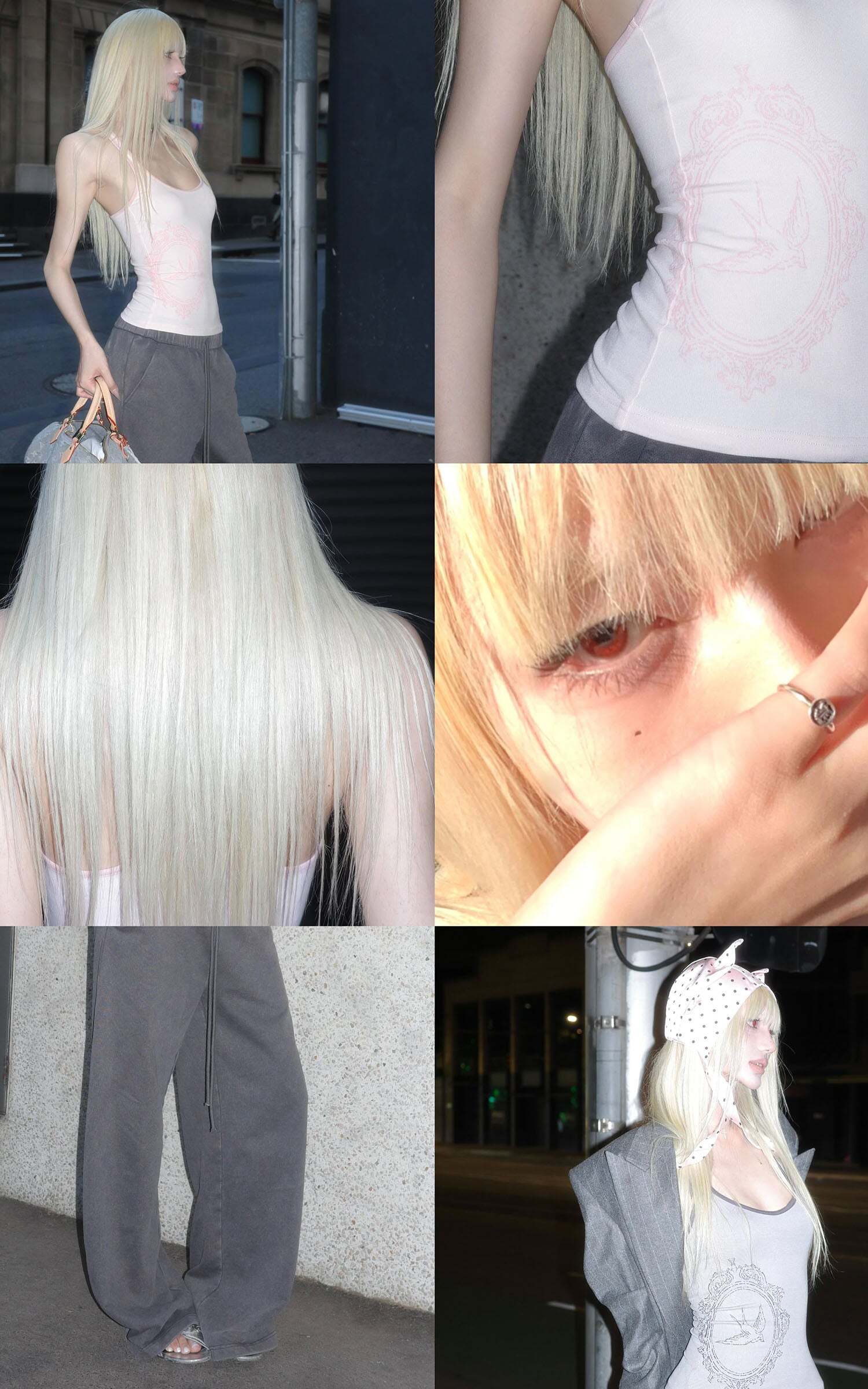 Made from soft ribbed cotton, this fitted top embraces the skin with a barely-there comfort. Inspired by classical frames and adorned with a soaring bird, the contrast print across the chest speaks softly yet powerfully. Slender shoulder straps and a cinched waist carve a sharp, delicate silhouette. Whether worn alone or layered, it sketches a solitary, free-spirited figure, imbued with a stark, quiet intensity.