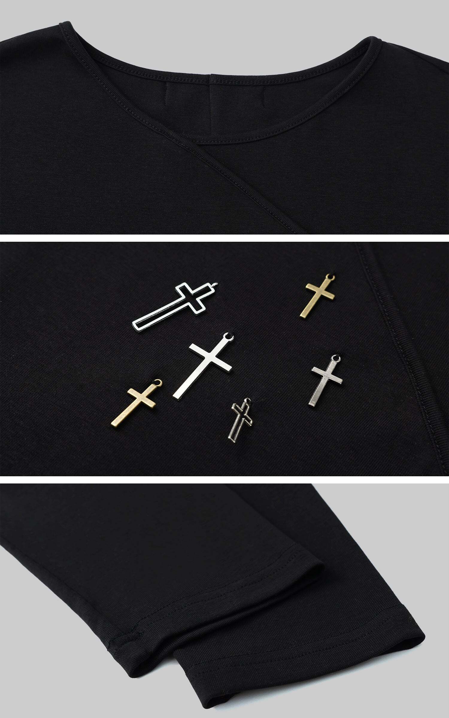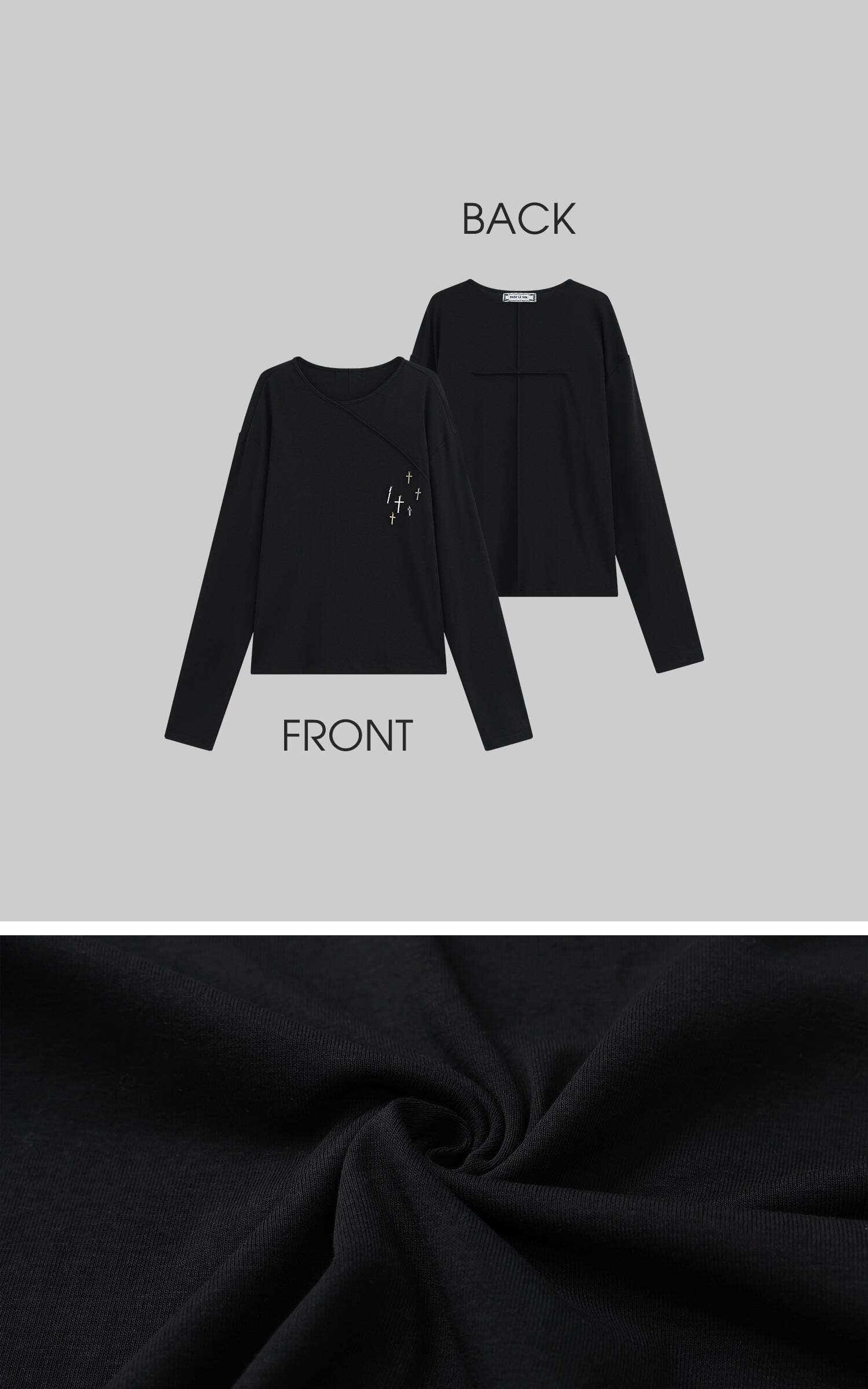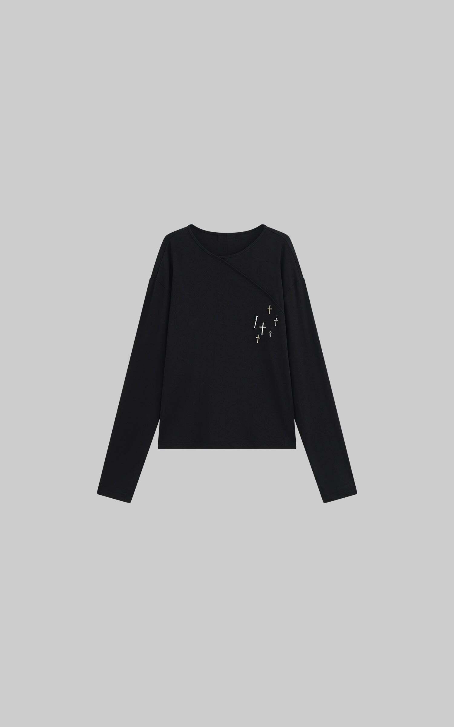 This base layer tee features a minimalist silhouette with asymmetric cuts, adorned with metallic cross pendants on the chest, exuding an edgy, avant-garde vibe. Crafted from high-stretch fabric, it offers a snug, flexible fit, perfect for solo wear or layering. A versatile wardrobe essential that adds a distinctive visual punch to your look.