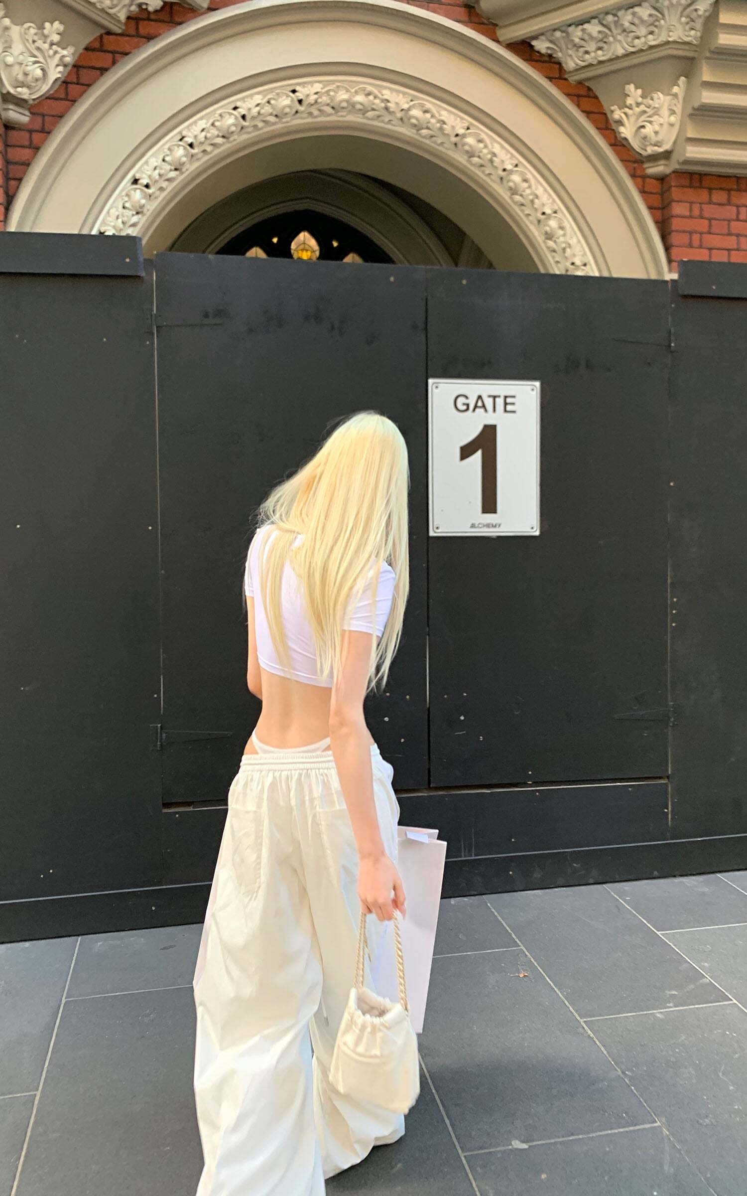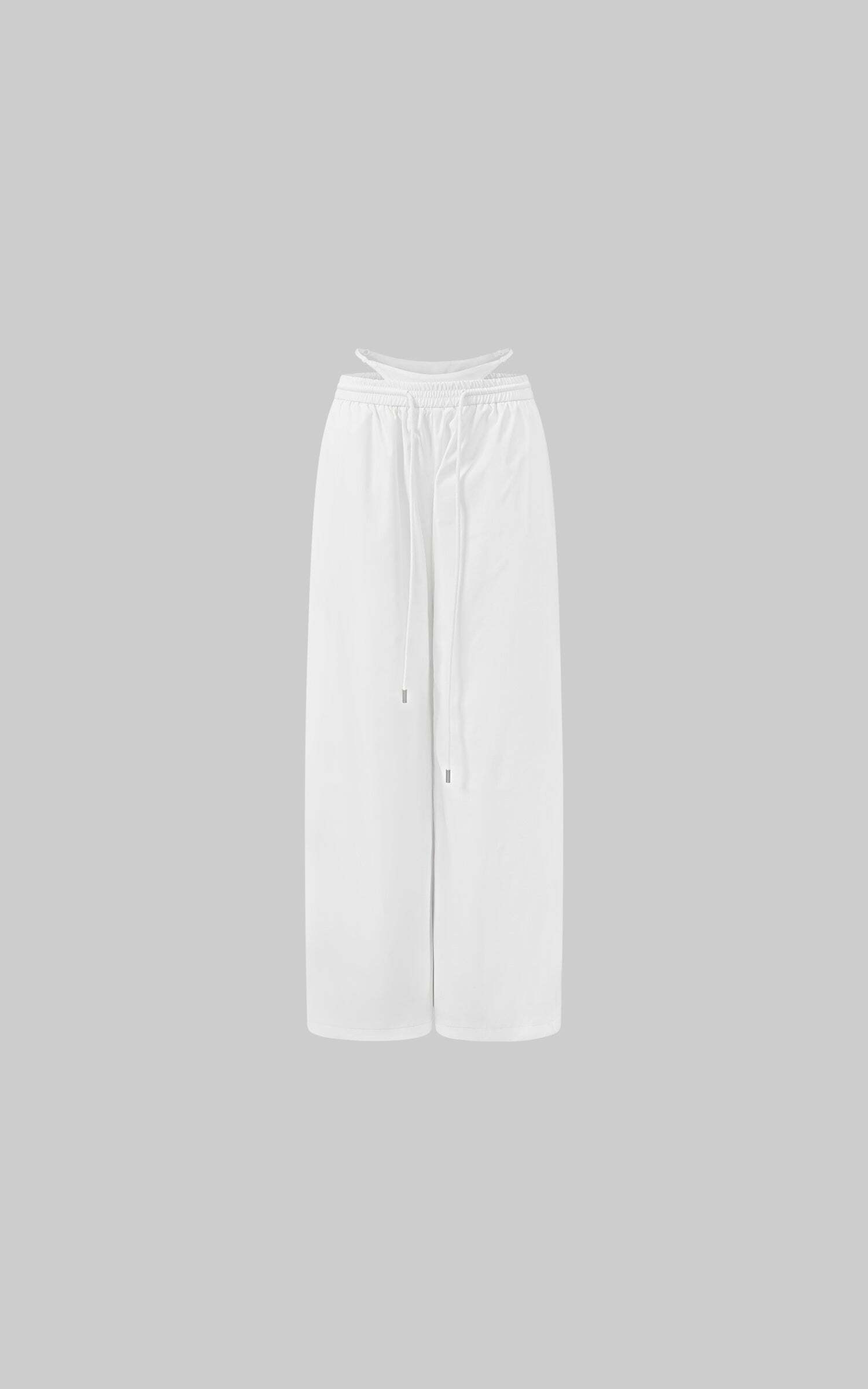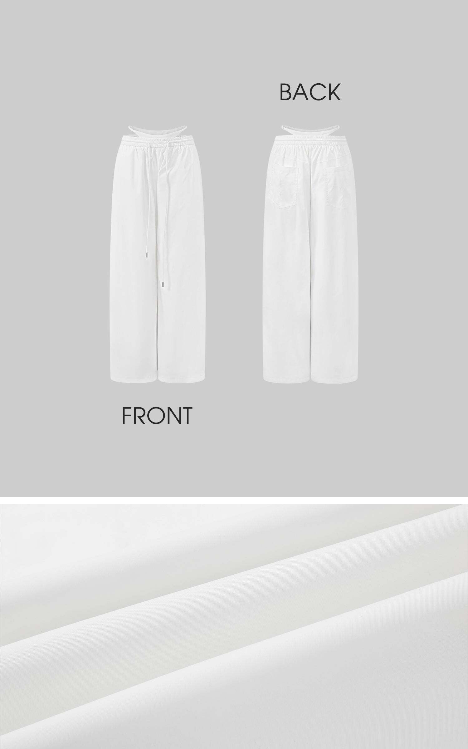 Structure, divided. Intention, veiled.These cargo trousers feature a deconstructed double-waistband—an inner layer that subtly seduces, and an outer shell that commands with volume. Cut from a dense cotton-blend twill with a muted matte finish, the silhouette holds shape without stiffness. Metallic tips on the drawstrings punctuate the fluid tension between utility and affectation. Pair with sculpted tops for heightened contrast.