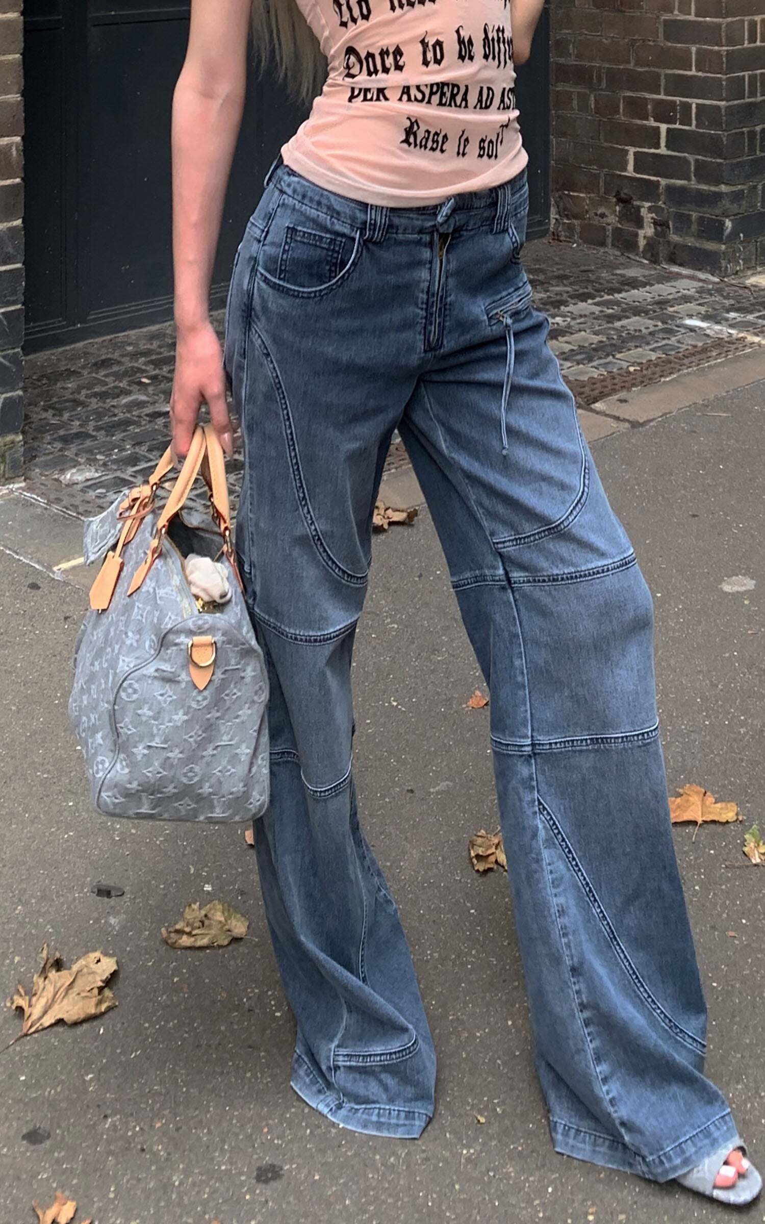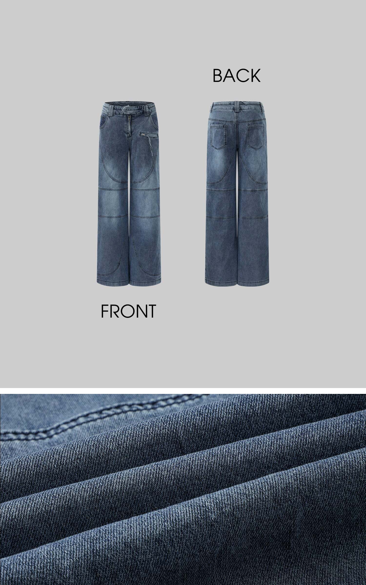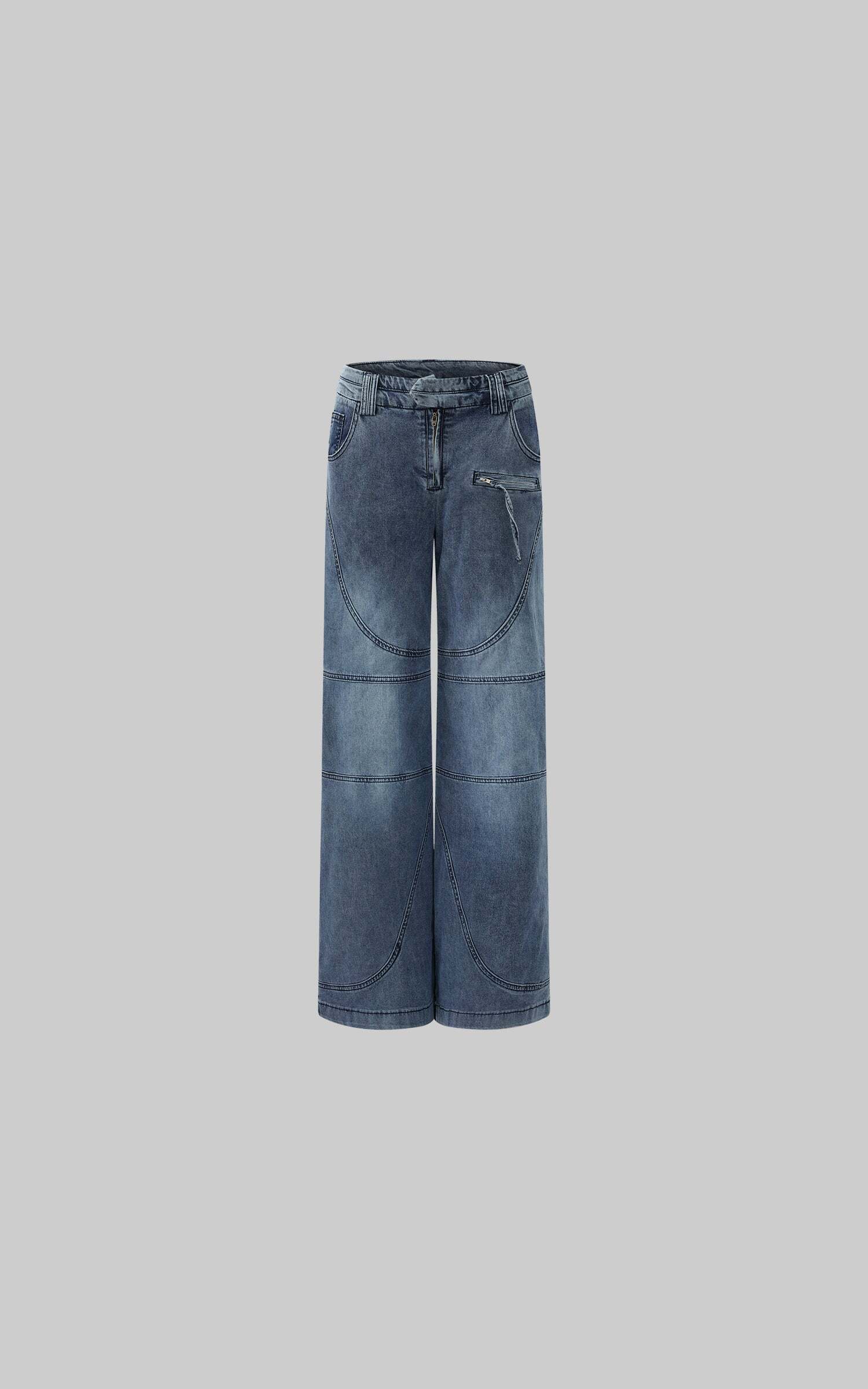 Defined by sweeping curved panel seams, the structure evokes the rigidity of bones and the fluidity of motion in equal measure. The washed indigo tone exudes a faded restraint, while subtle creases and distressed edges suggest quiet erosion over time. An asymmetric zip pocket and exposed stitching inject a utilitarian tension, interrupting symmetry with calculated unease. With a wide straight-leg cut, the silhouette walks the line between function and introspection—effortlessly merging street sensibility with contemplative poise.