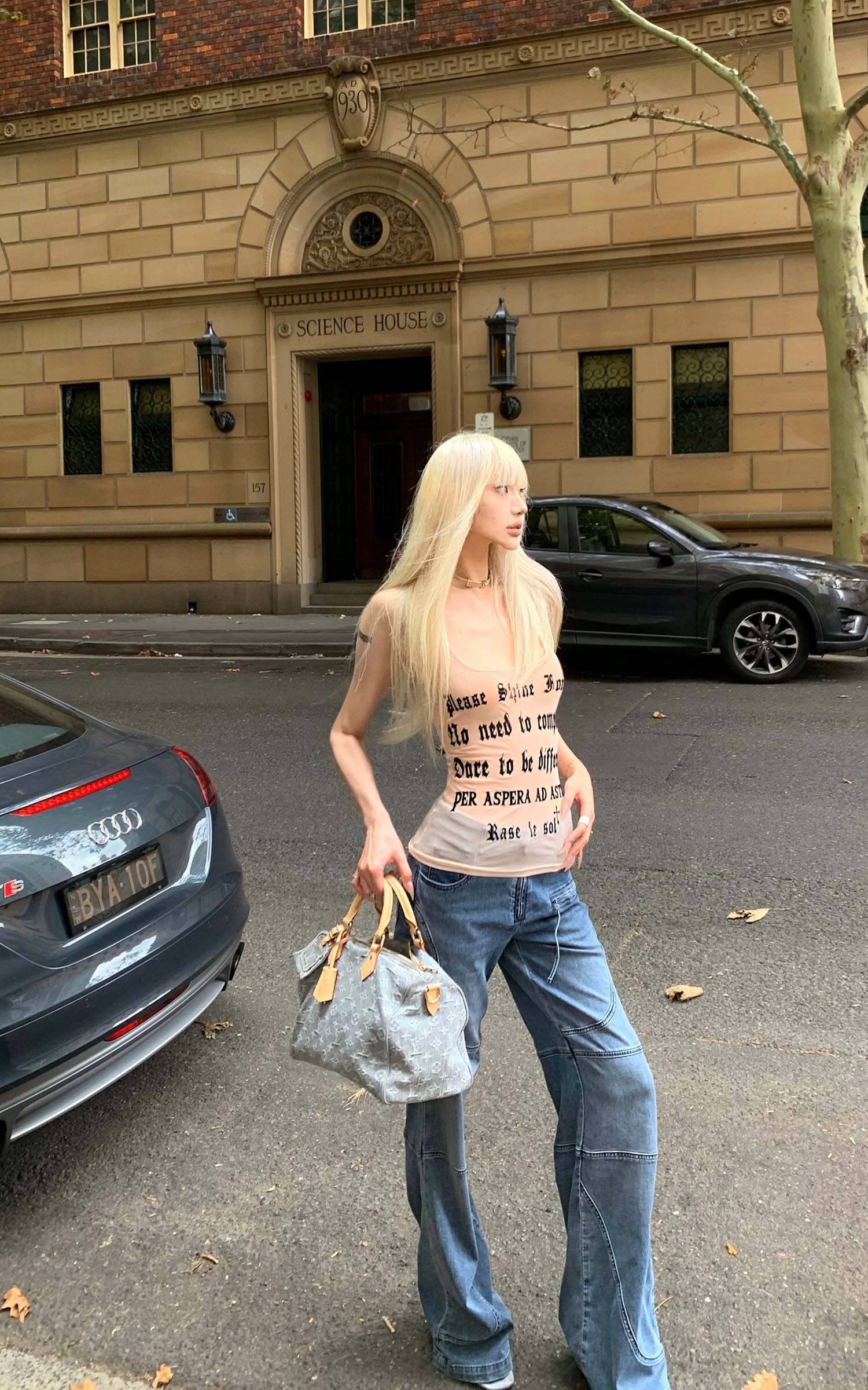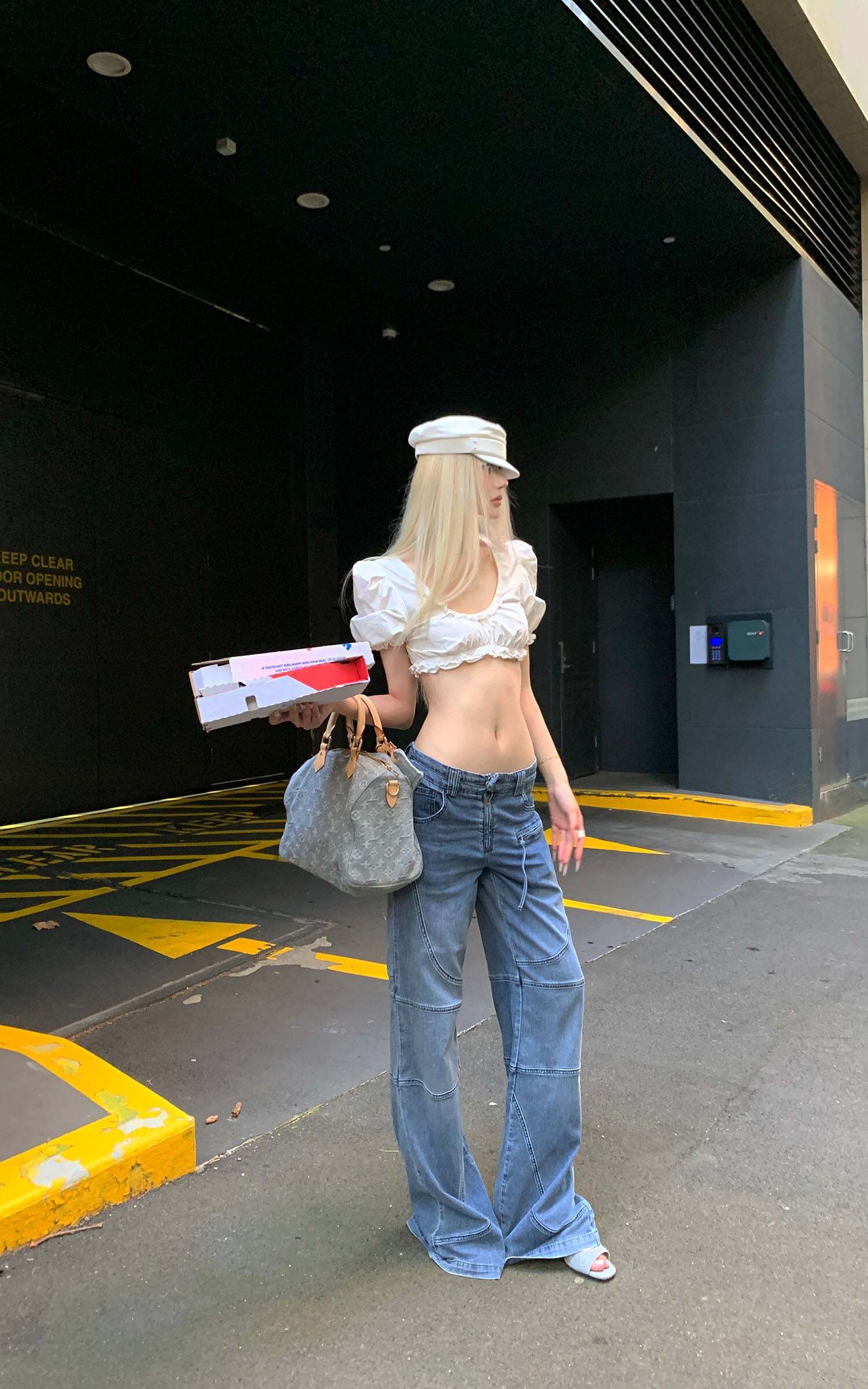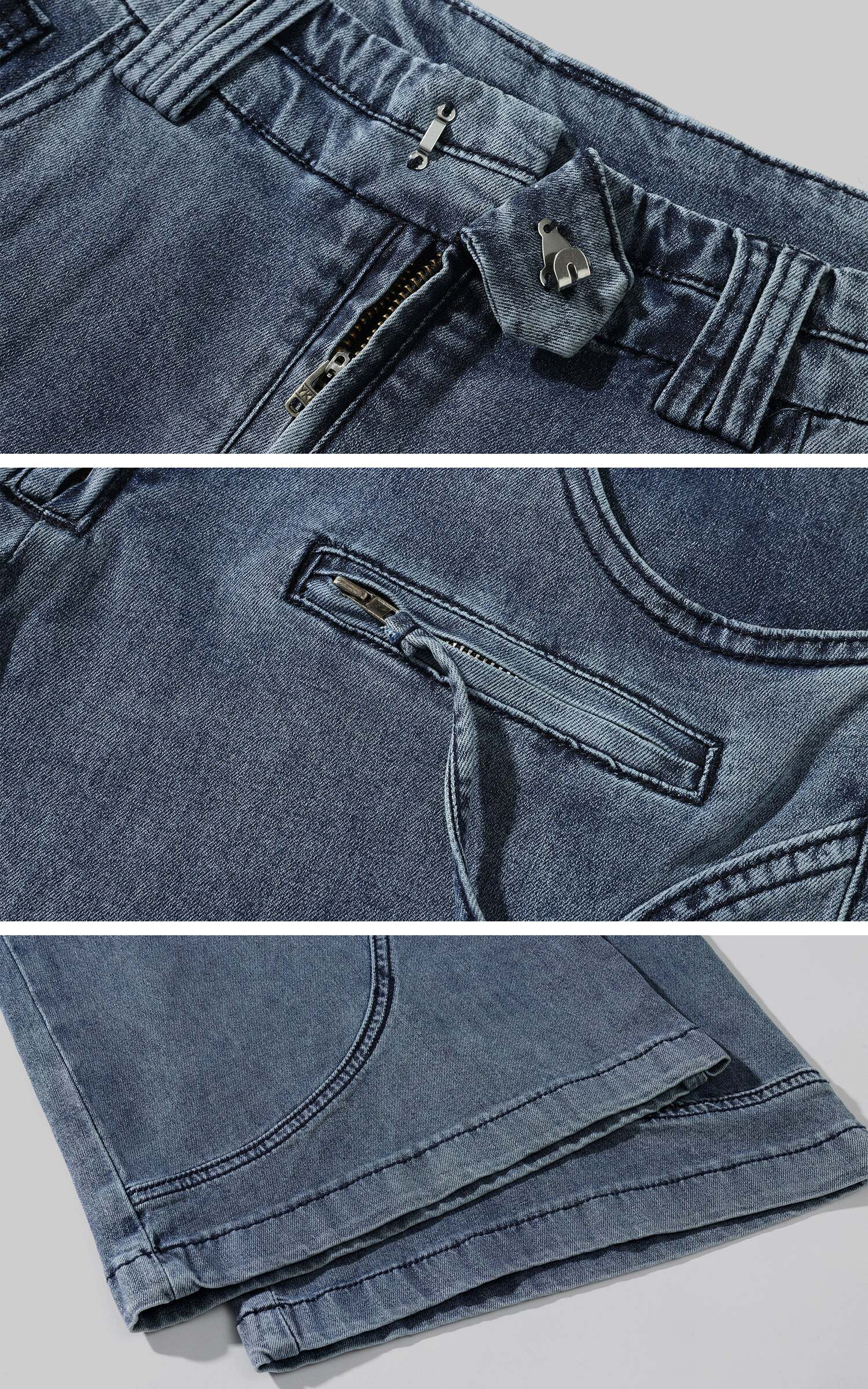 Defined by sweeping curved panel seams, the structure evokes the rigidity of bones and the fluidity of motion in equal measure. The washed indigo tone exudes a faded restraint, while subtle creases and distressed edges suggest quiet erosion over time. An asymmetric zip pocket and exposed stitching inject a utilitarian tension, interrupting symmetry with calculated unease. With a wide straight-leg cut, the silhouette walks the line between function and introspection—effortlessly merging street sensibility with contemplative poise.