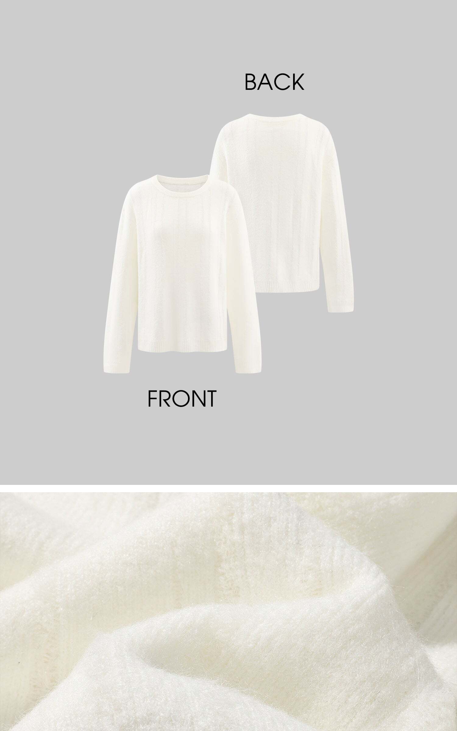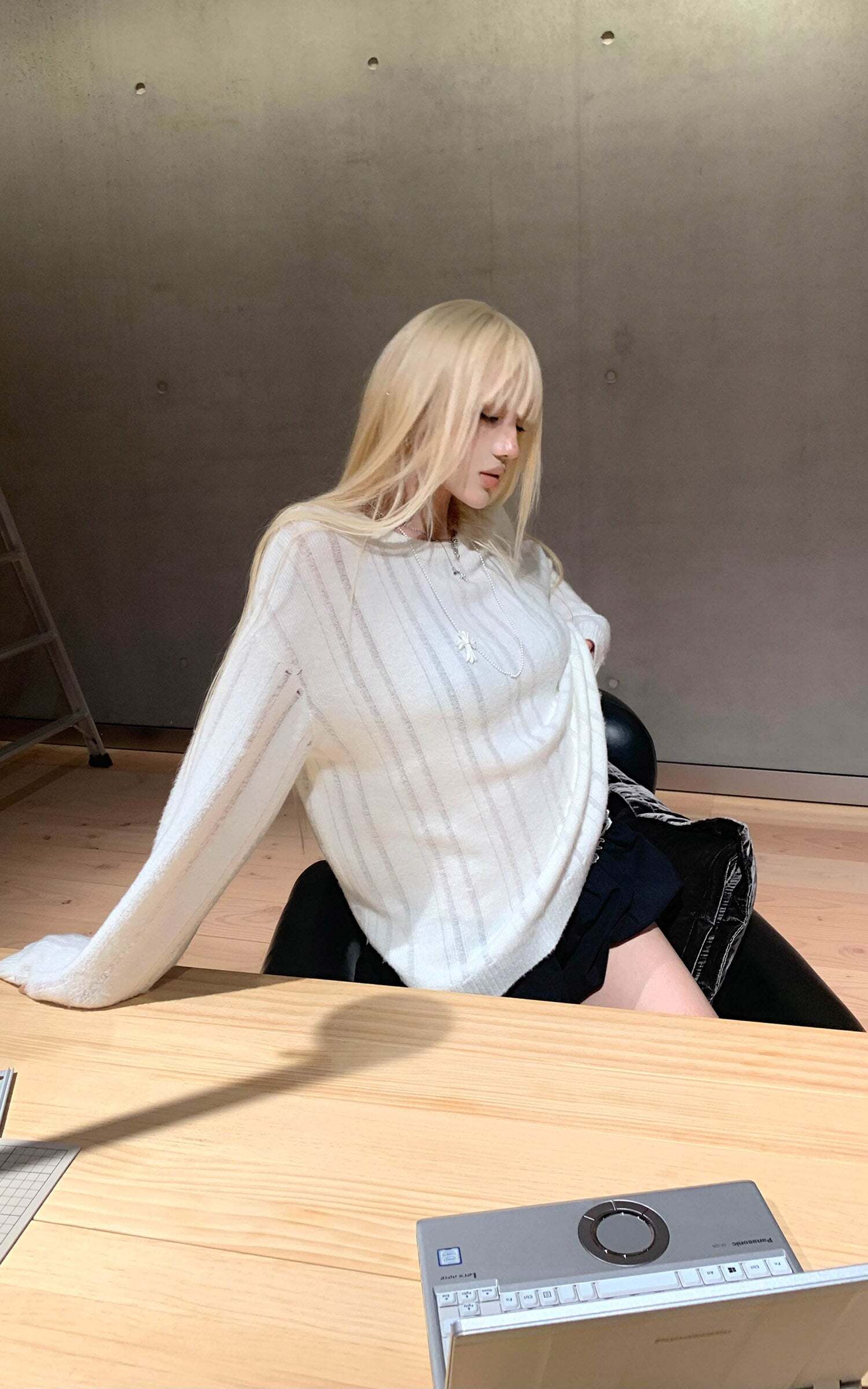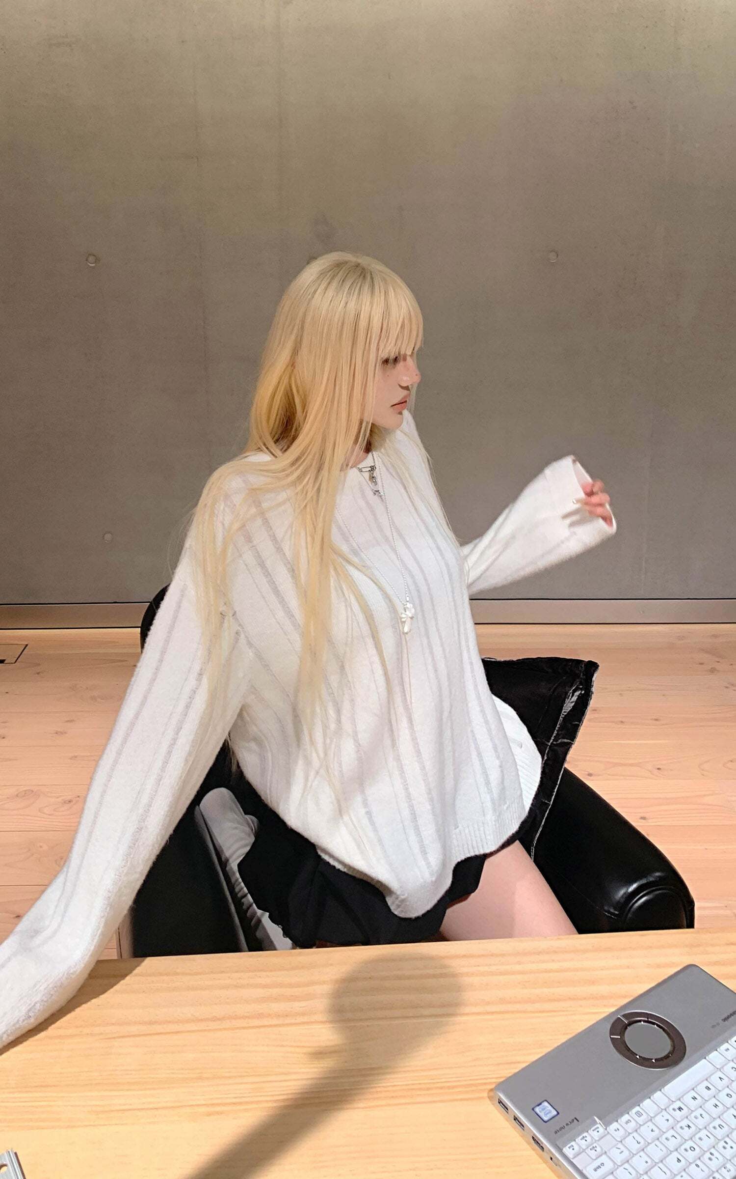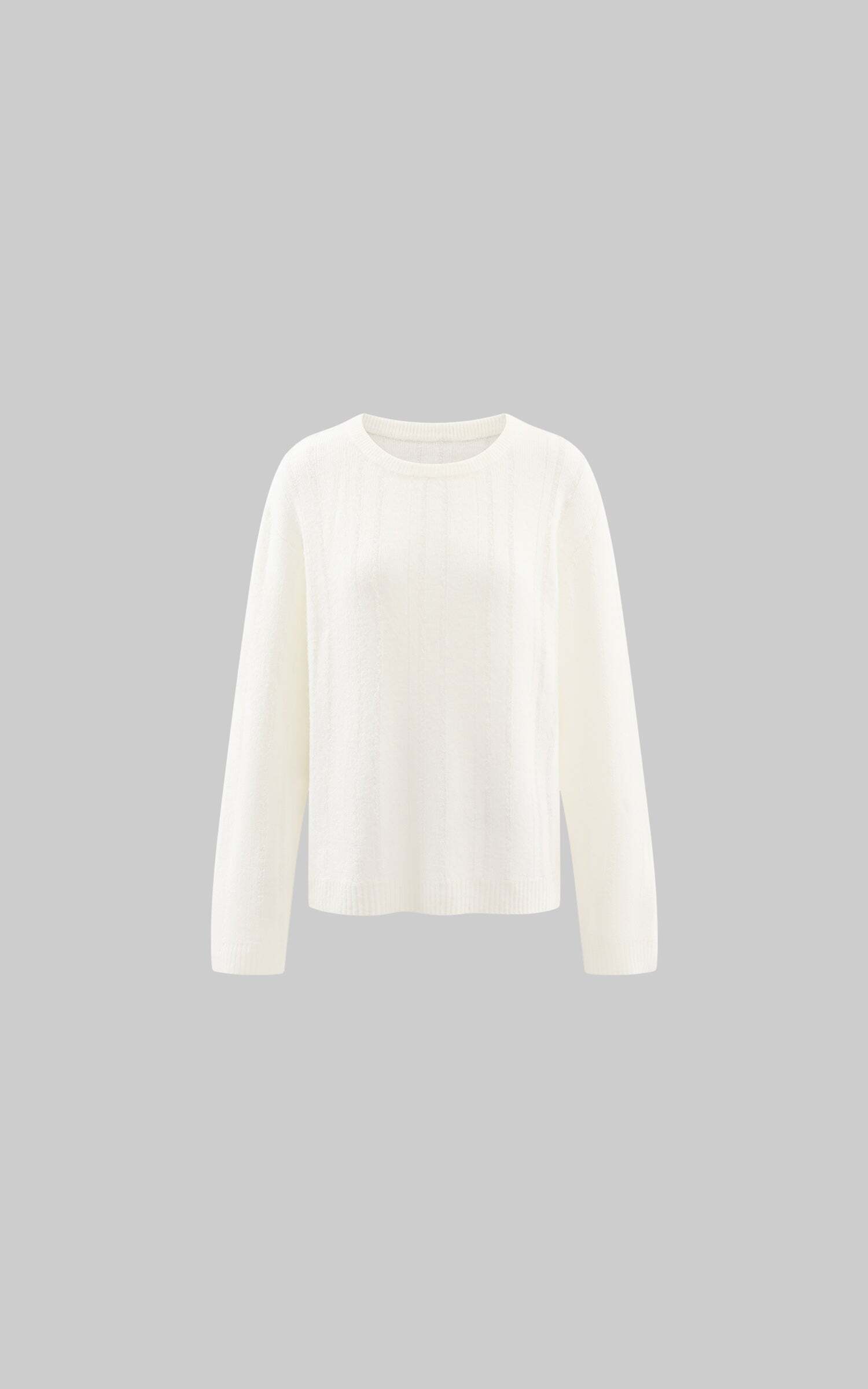 Crafted from soft knit yarn with subtle vertical textures, this sweater drapes effortlessly in a relaxed silhouette. The understated crew neckline and elongated sleeves evoke restraint and quiet strength. Its loose form creates a sense of ease and detachment, standing alone as a statement piece or layered with depth and intention.