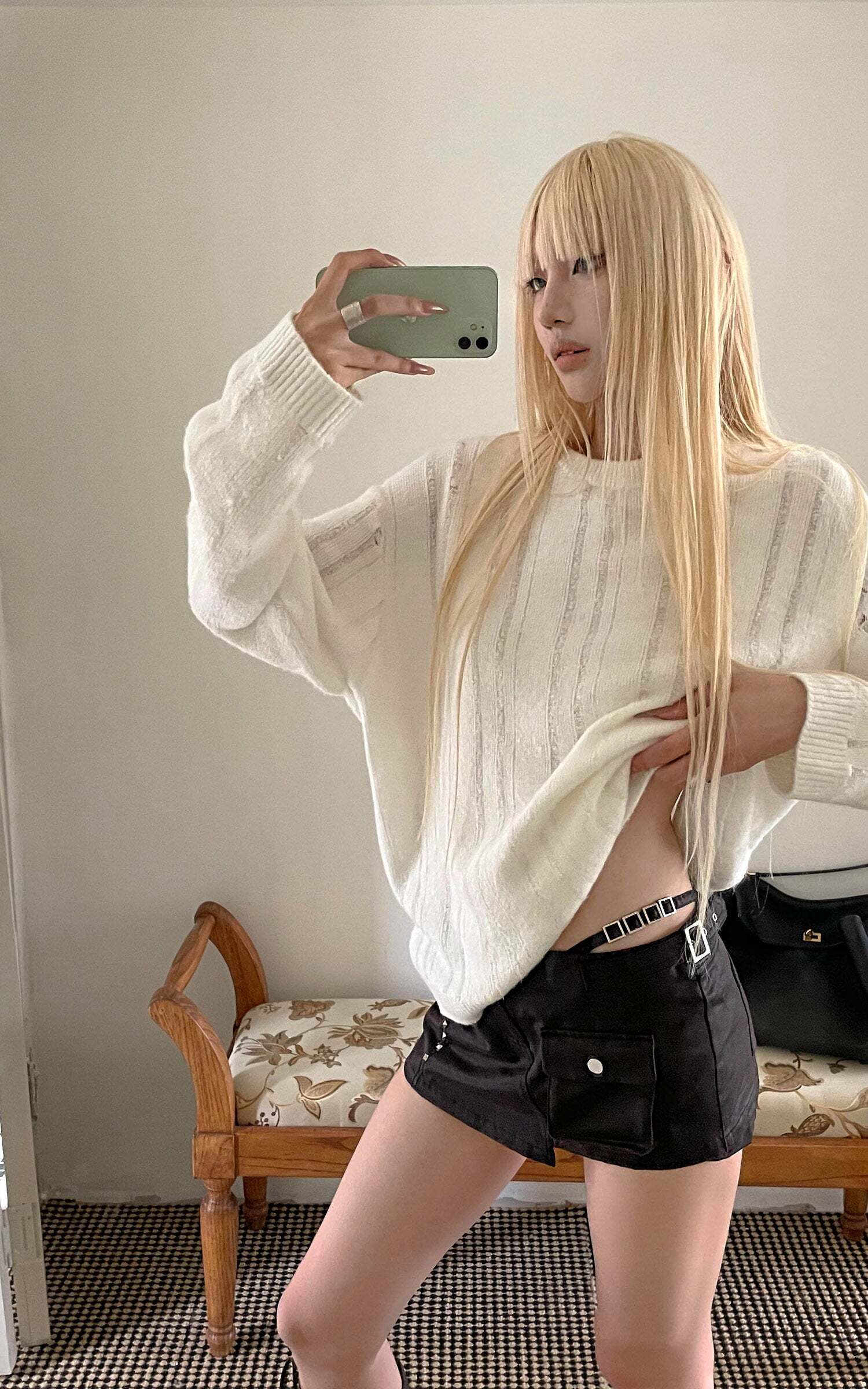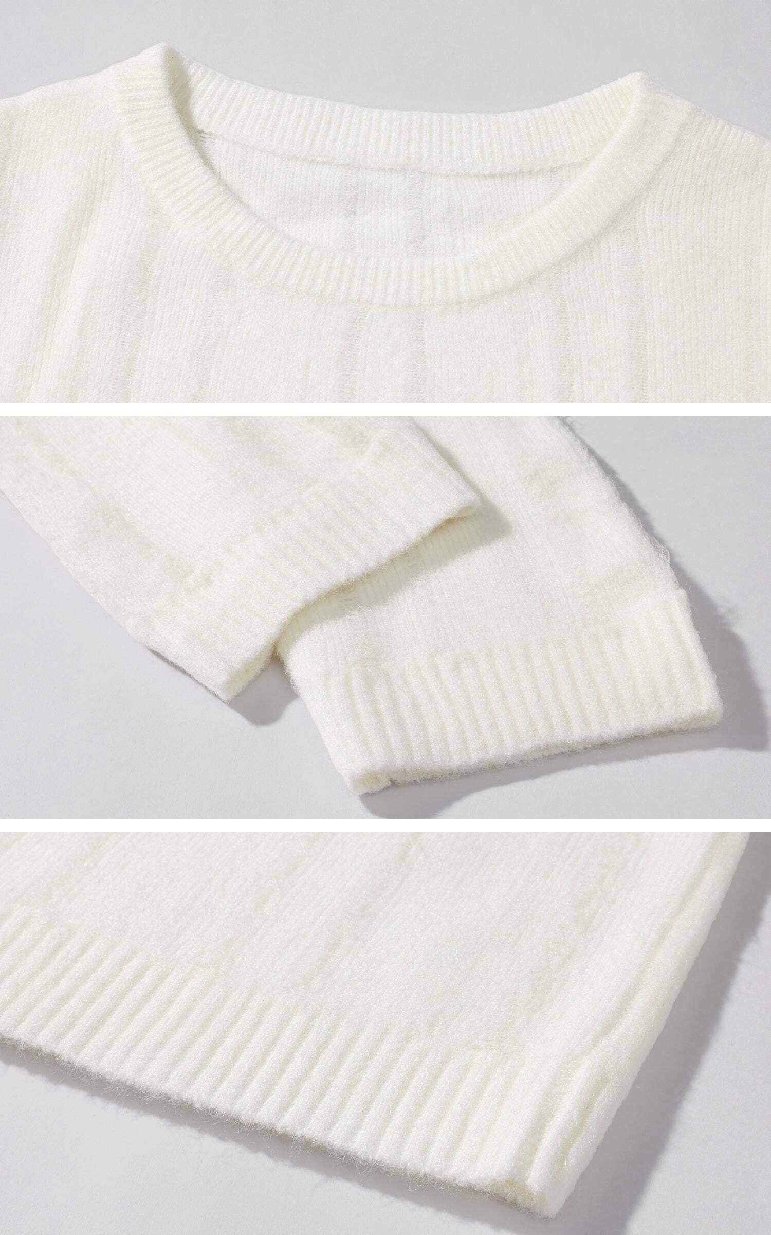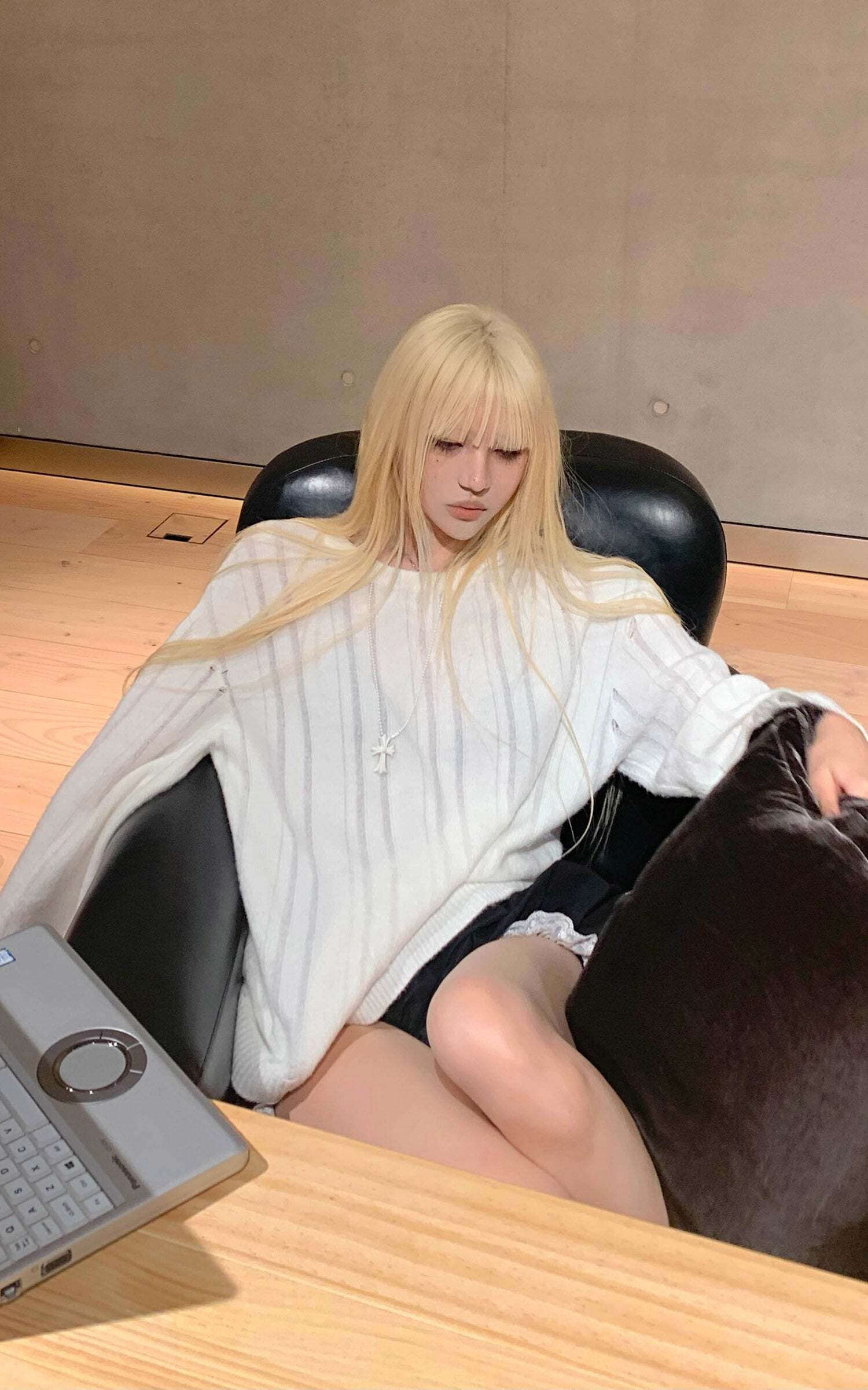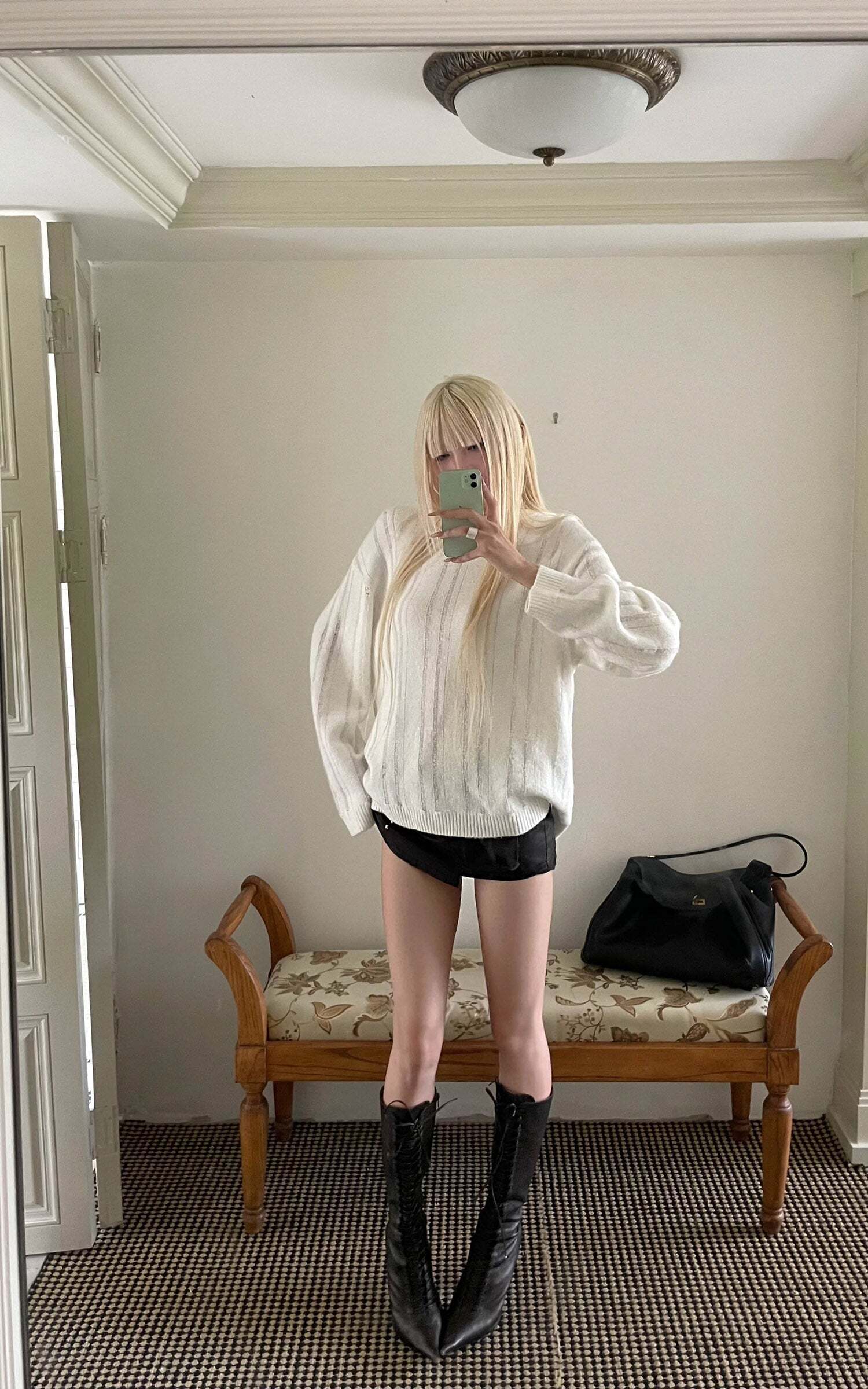 Crafted from soft knit yarn with subtle vertical textures, this sweater drapes effortlessly in a relaxed silhouette. The understated crew neckline and elongated sleeves evoke restraint and quiet strength. Its loose form creates a sense of ease and detachment, standing alone as a statement piece or layered with depth and intention.