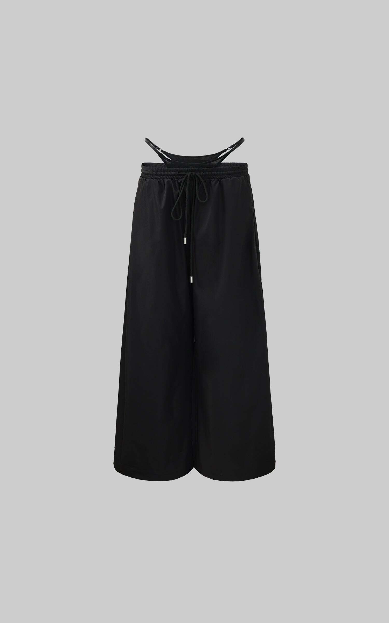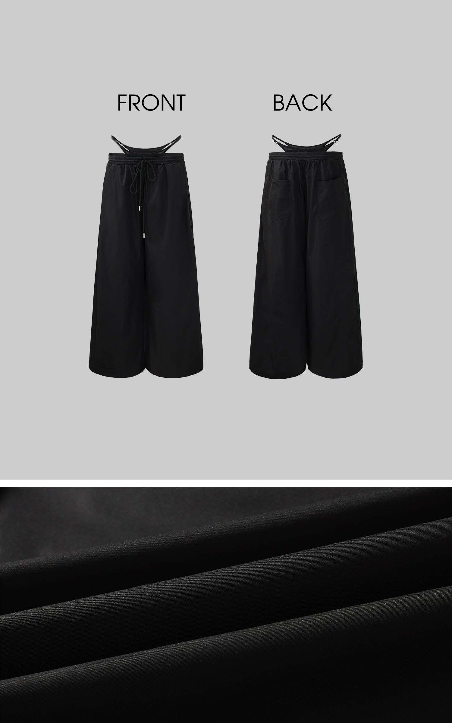 These black wide-leg pants are constructed from a crisp yet lightweight fabric, designed with a built-in adjustable waistband that wraps like a hidden gesture beneath the outer shell. The fluid drape moves with silent tension, breathing rhythm into each step. The surface remains restrained—smooth with a subtle structure. Best styled with form-fitting tops or sculptural silhouettes to emphasize the quiet power of layering and exposure.