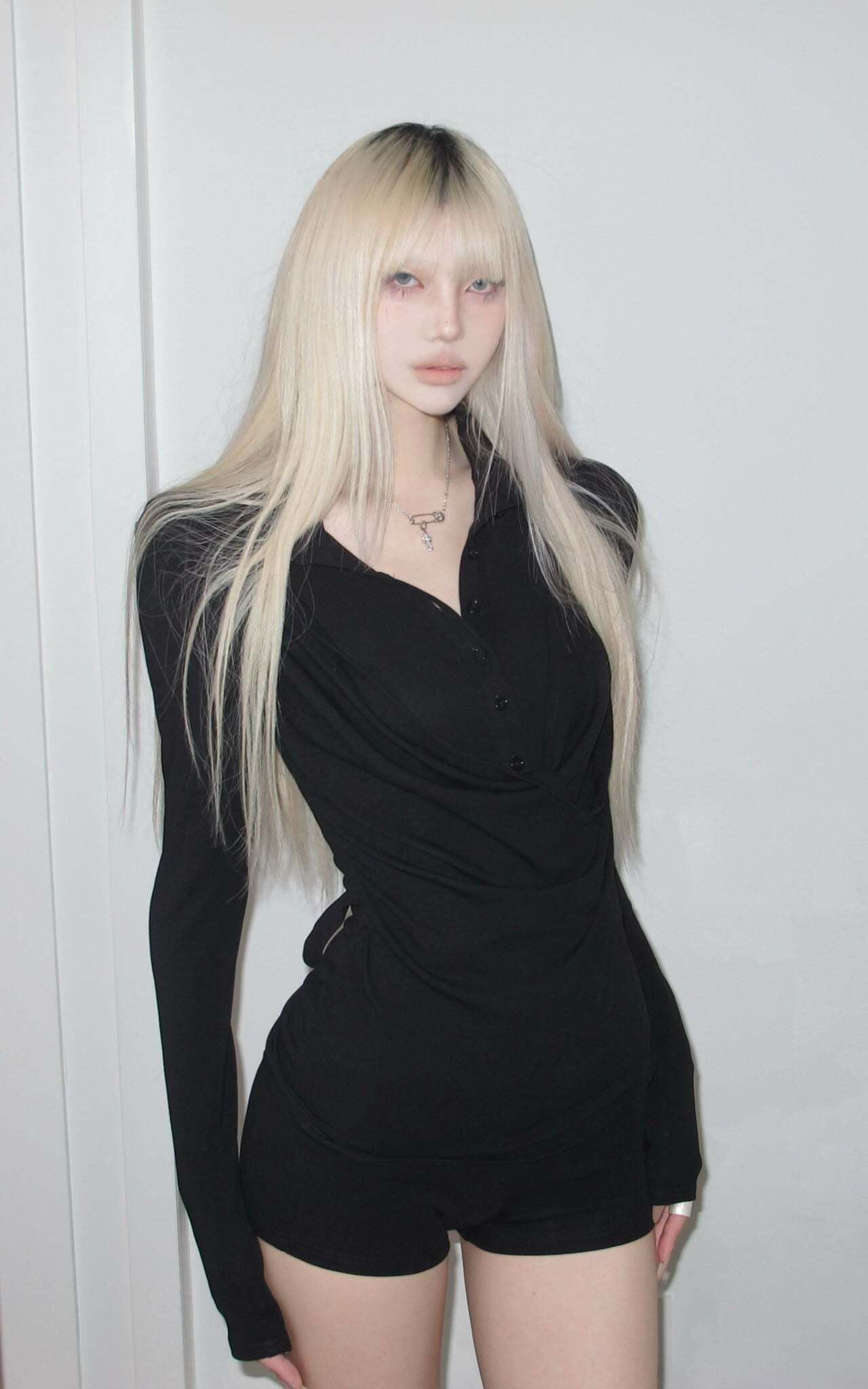 This long sleeve T-shirt features an elegant draped neckline, creating a fluid silhouette that exudes a casual yet refined vibe. The slim-fit design naturally contours the body, while the high-quality stretch fabric ensures comfort and flexibility. Classic collar and button details add a touch of vintage charm to the minimalist design. Whether styled with tailored trousers or layered under a jacket, this T-shirt is a versatile staple that highlights understated individuality.