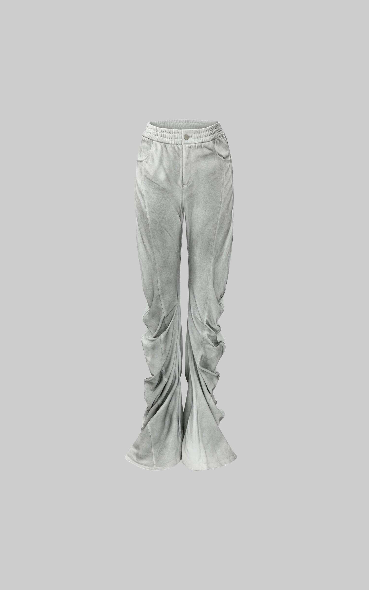 This is not a pant that seeks symmetry. It collapses with ease, pooling at the ankles like a silent ripple. The washed-out grey breathes like faded memory—starting from a gathered waist and tracing soft curves down the leg. Its cut avoids sharpness, choosing instead the gentleness of relinquished armor. Every fold, every slack gesture, carries the weight of an unspoken farewell. Unassuming, yet piercing.