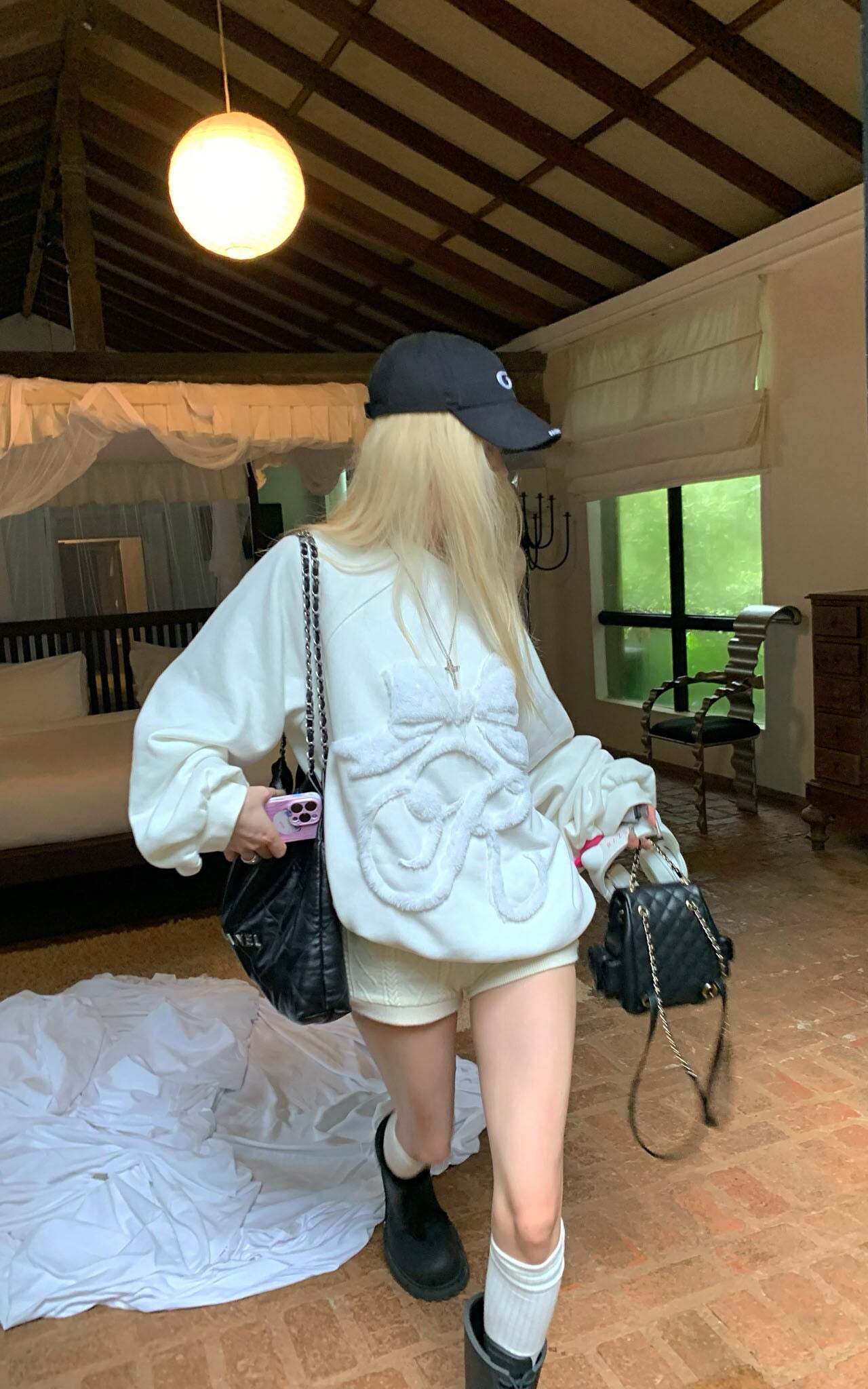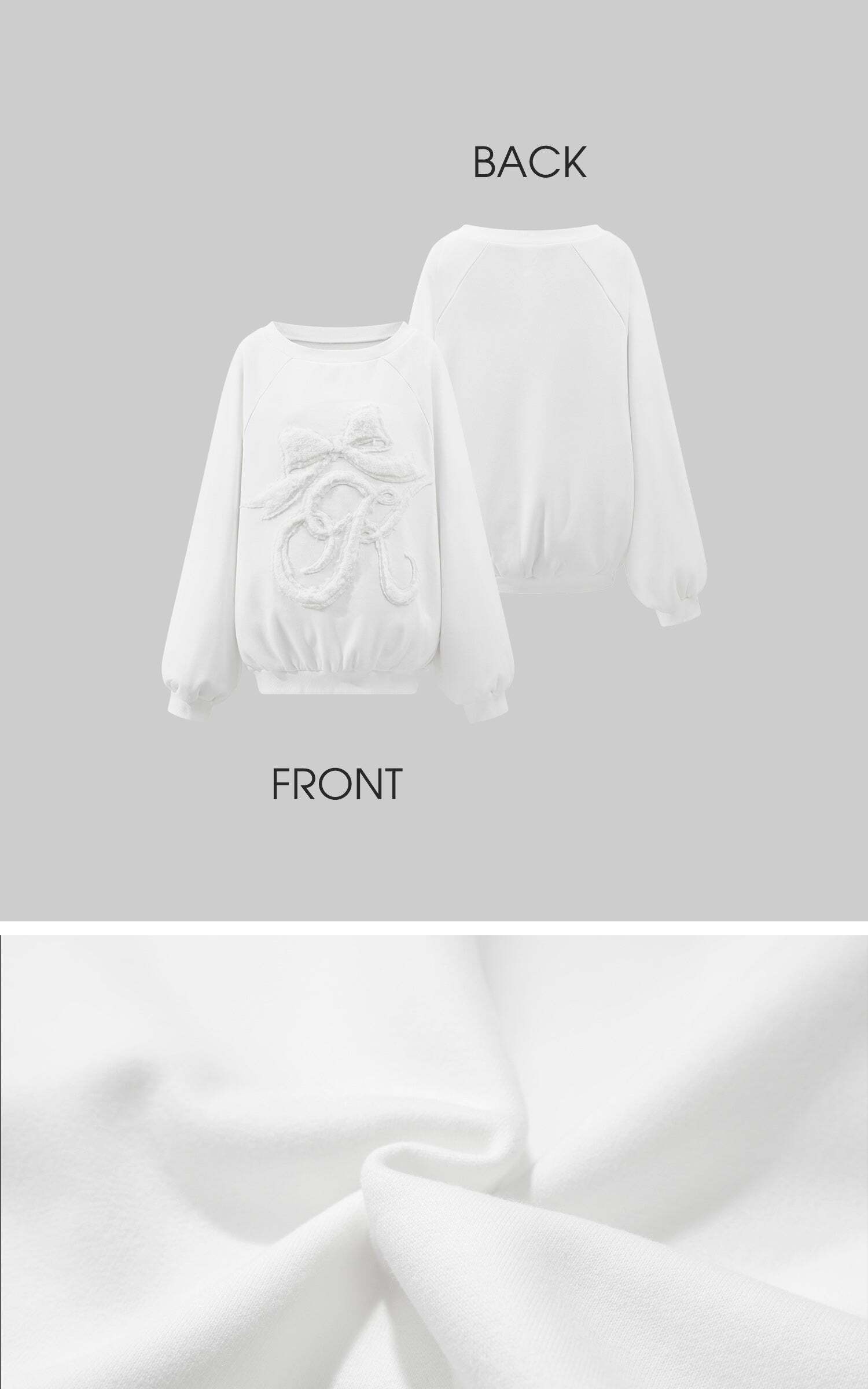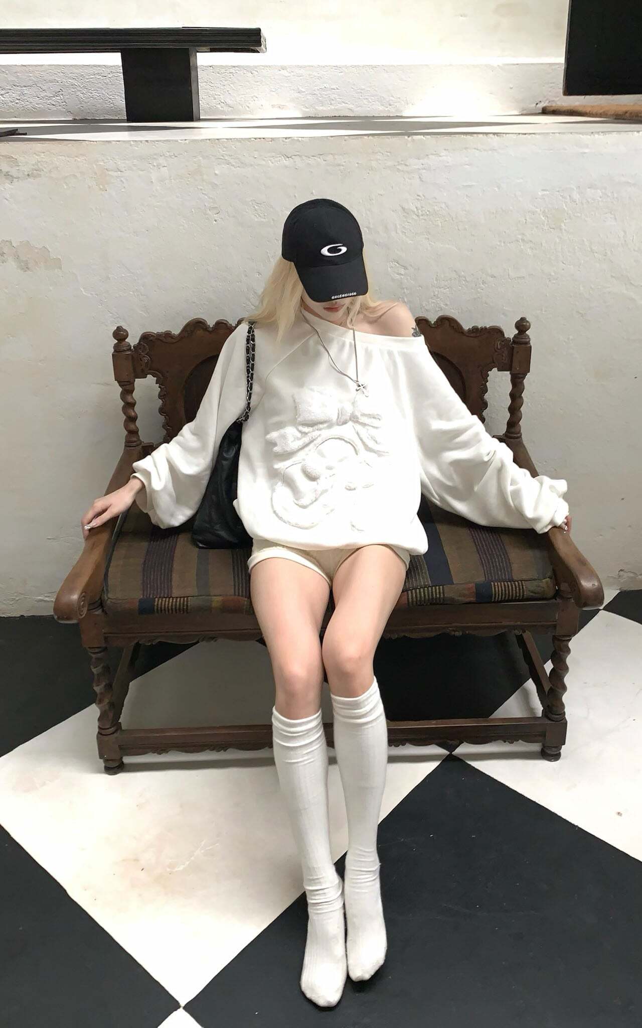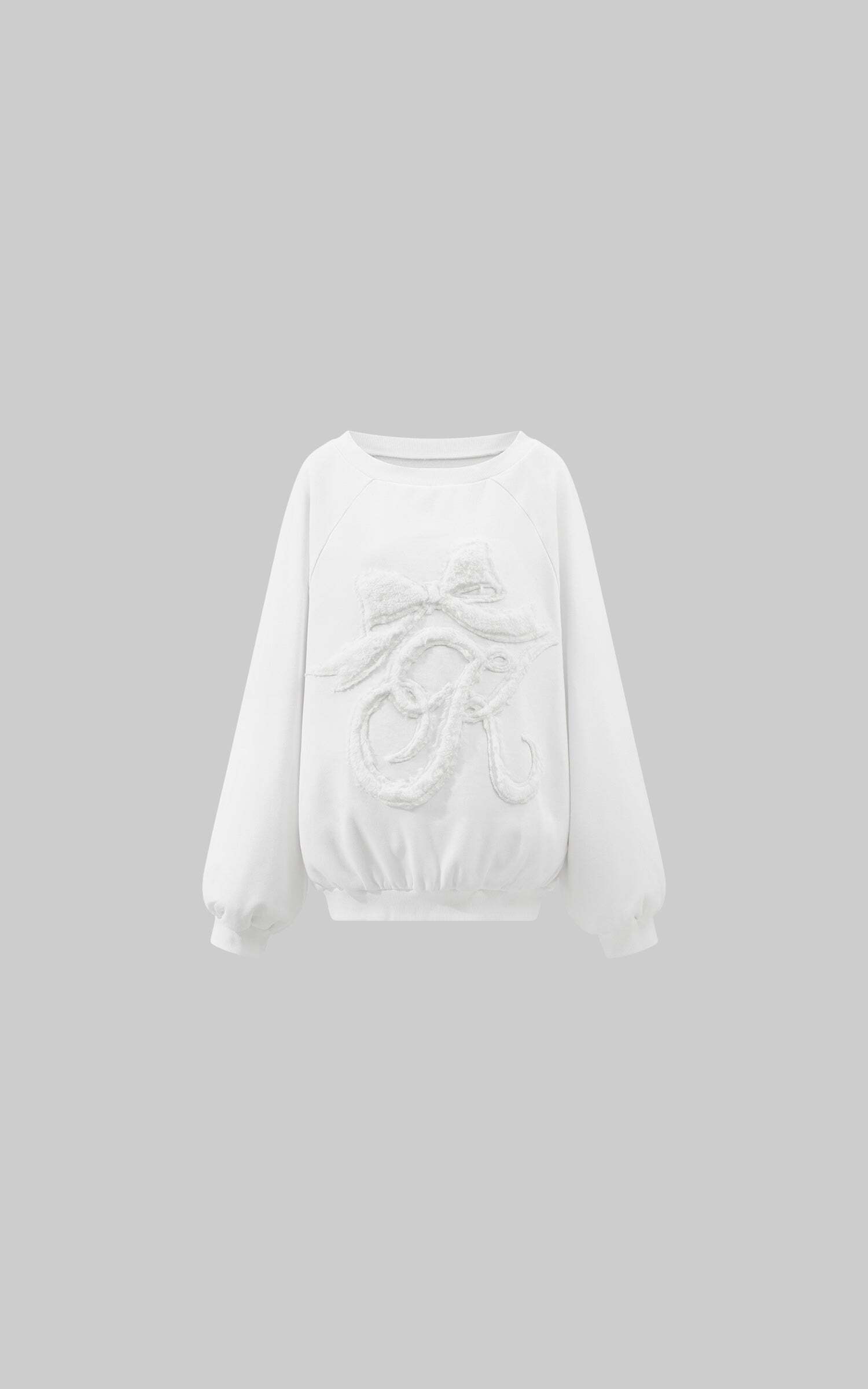 A delicate interplay of structure and softness, this off-shoulder sweatshirt embodies effortless charm. The oversized silhouette drapes naturally over the body, creating a relaxed yet refined profile. The plush embroidered bow at the front adds a textural contrast, evoking a sense of quiet opulence. Dropped shoulders and ribbed cuffs enhance the laid-back appeal, while the asymmetric neckline subtly exposes the collarbone, balancing femininity and edge. Wear it with tailored shorts or wide-leg trousers for an understated statement.