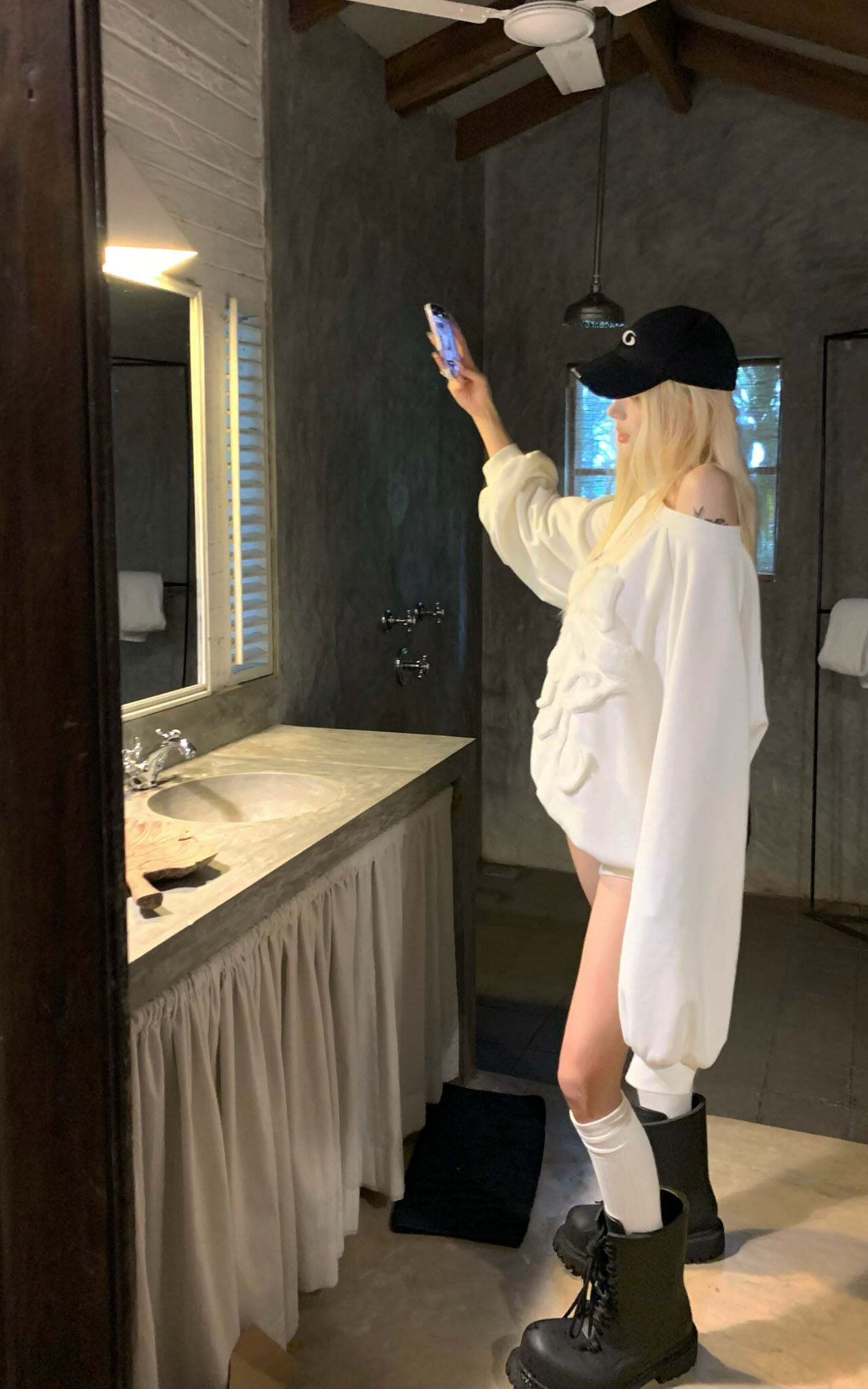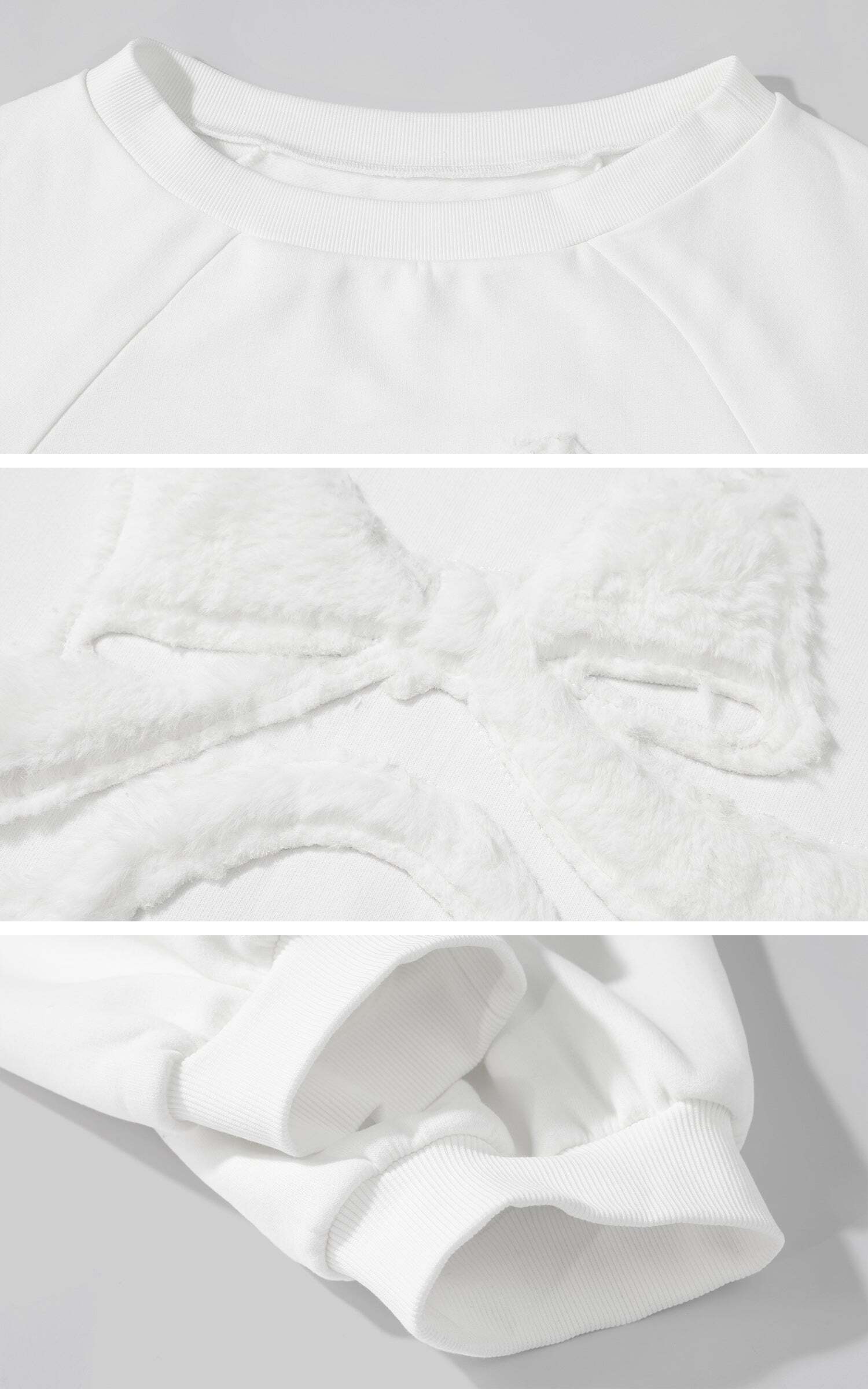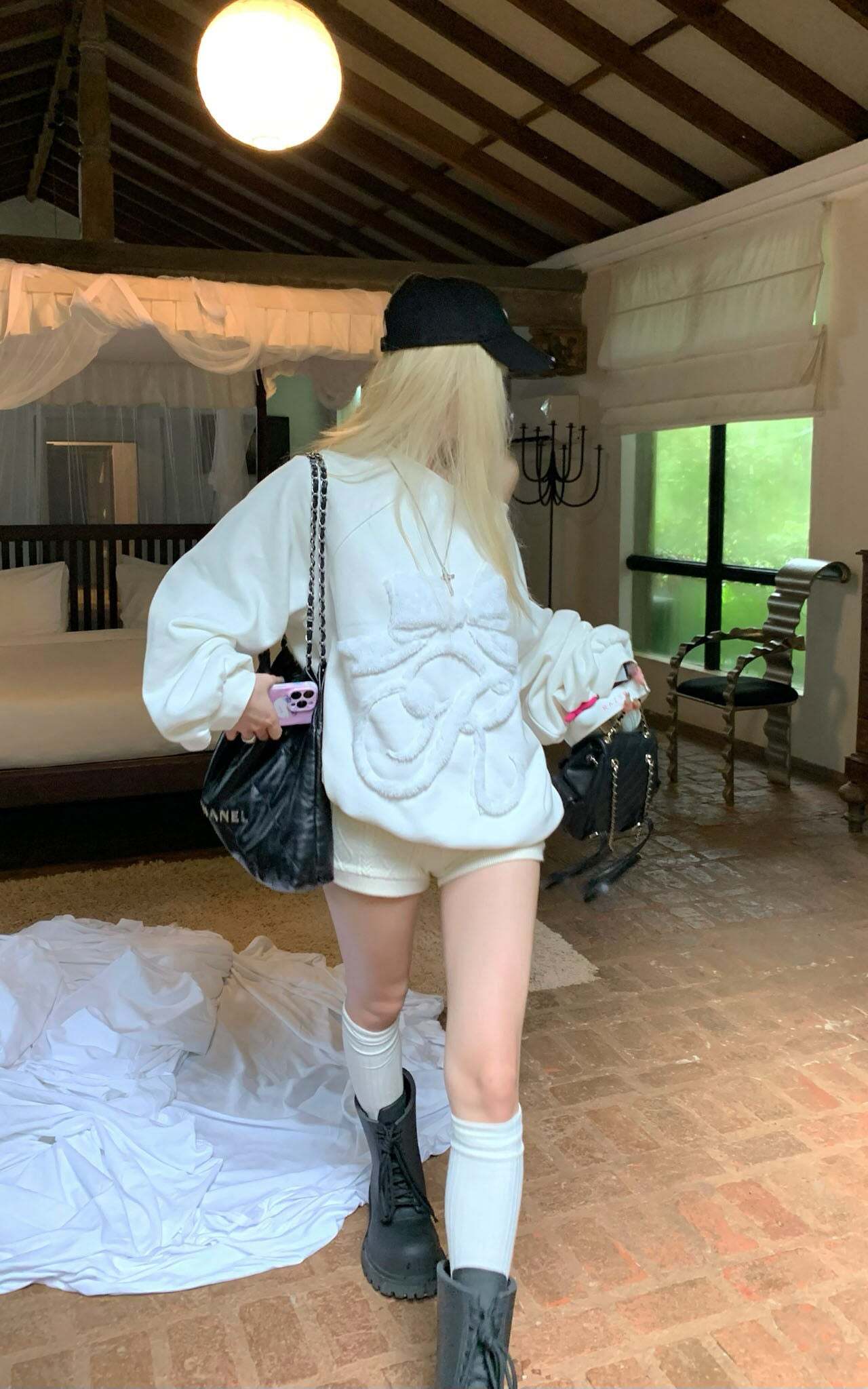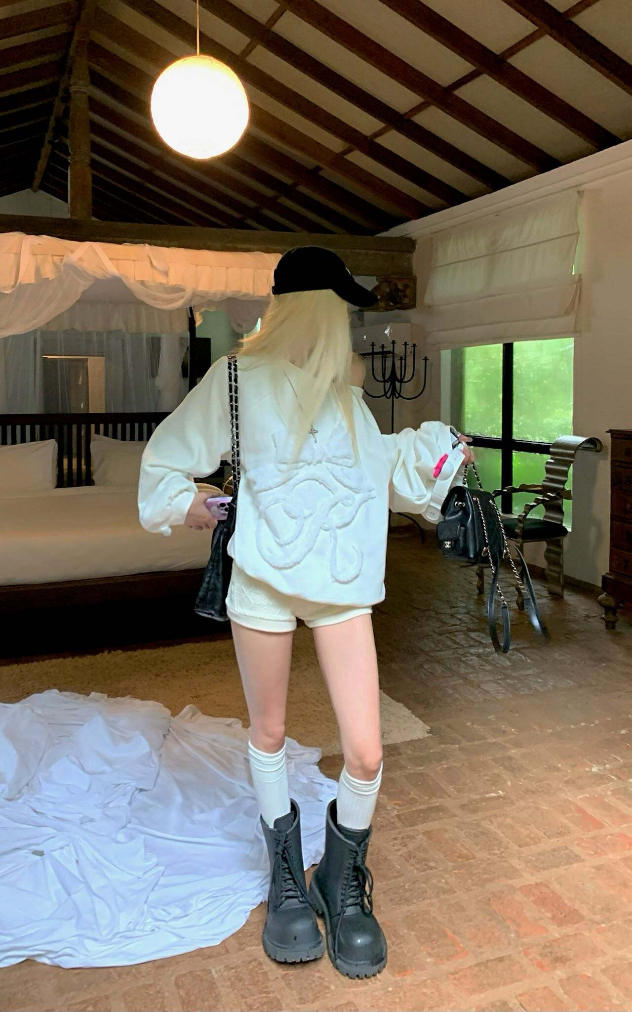 A delicate interplay of structure and softness, this off-shoulder sweatshirt embodies effortless charm. The oversized silhouette drapes naturally over the body, creating a relaxed yet refined profile. The plush embroidered bow at the front adds a textural contrast, evoking a sense of quiet opulence. Dropped shoulders and ribbed cuffs enhance the laid-back appeal, while the asymmetric neckline subtly exposes the collarbone, balancing femininity and edge. Wear it with tailored shorts or wide-leg trousers for an understated statement.