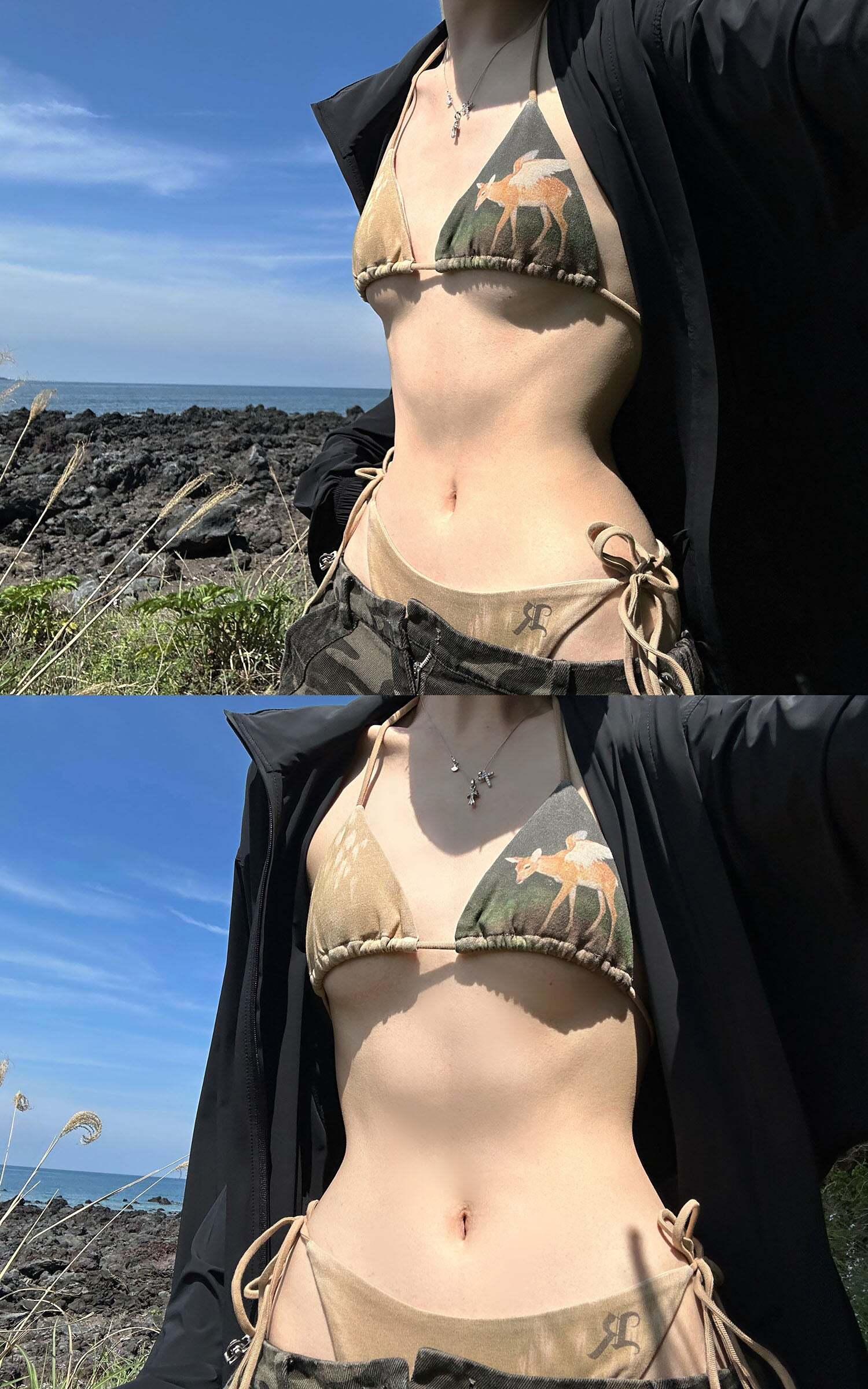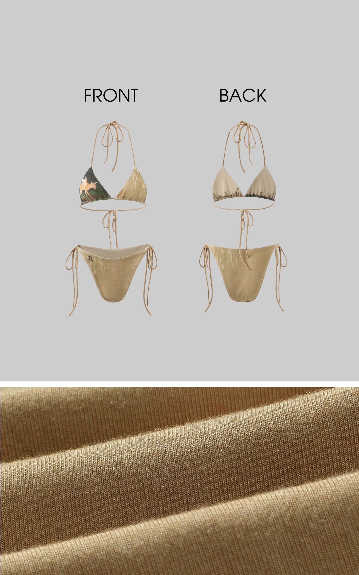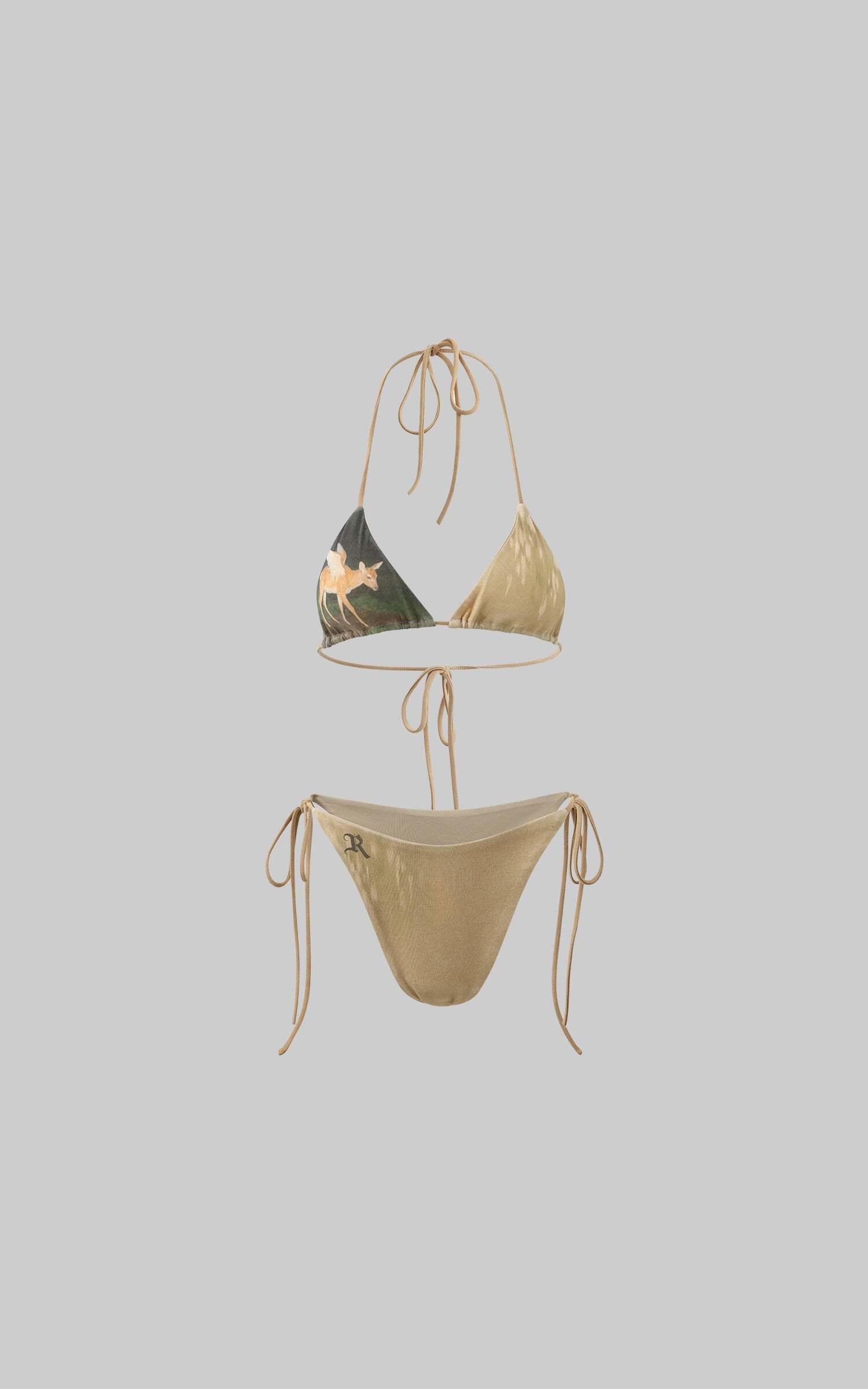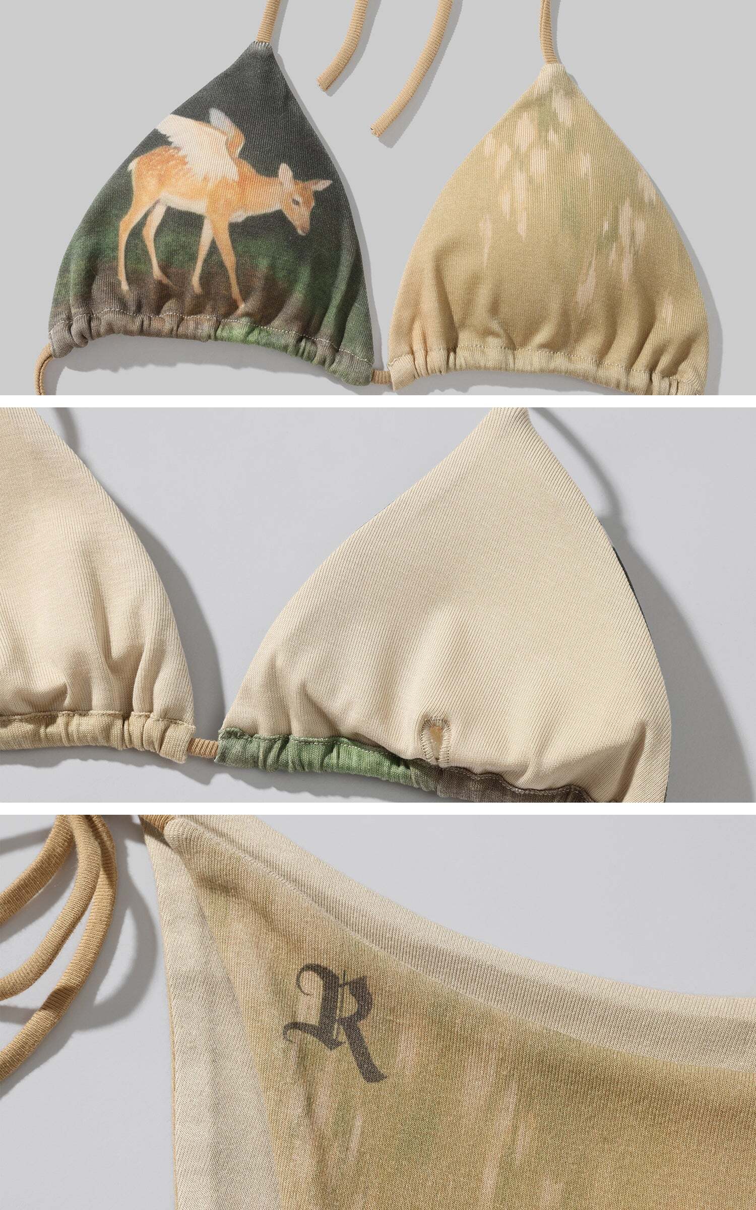 Like a forest mirage under a veil of soft light, the triangle bikini top features a muted khaki base with asymmetrical color blocking—one side depicting a winged fawn, evoking the presence of a forest spirit. The low-rise bottom is detailed with an “R” print, finished with delicate side ties for an adjustable fit. The fabric is soft and lightweight, with a naturally textured appearance and a faint vintage patina—reminiscent of garments weathered by time and sun. Ideal for basking under the sun or layering into your summer styling—between wilderness and urban drift.