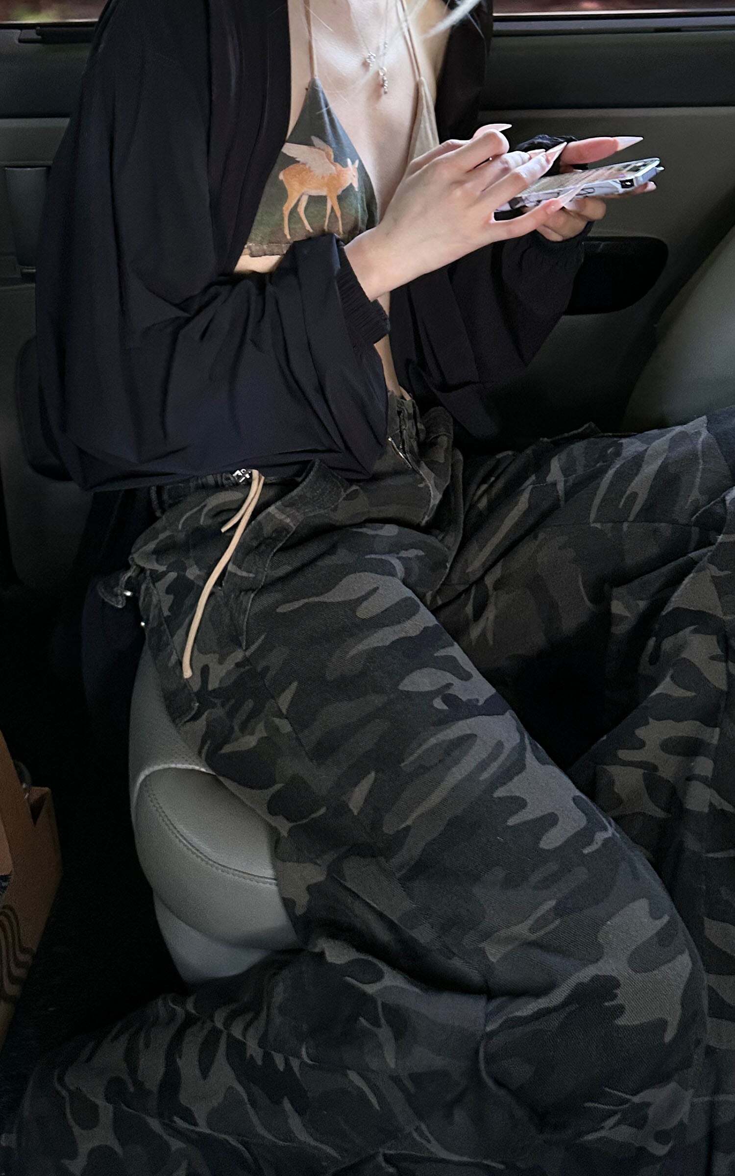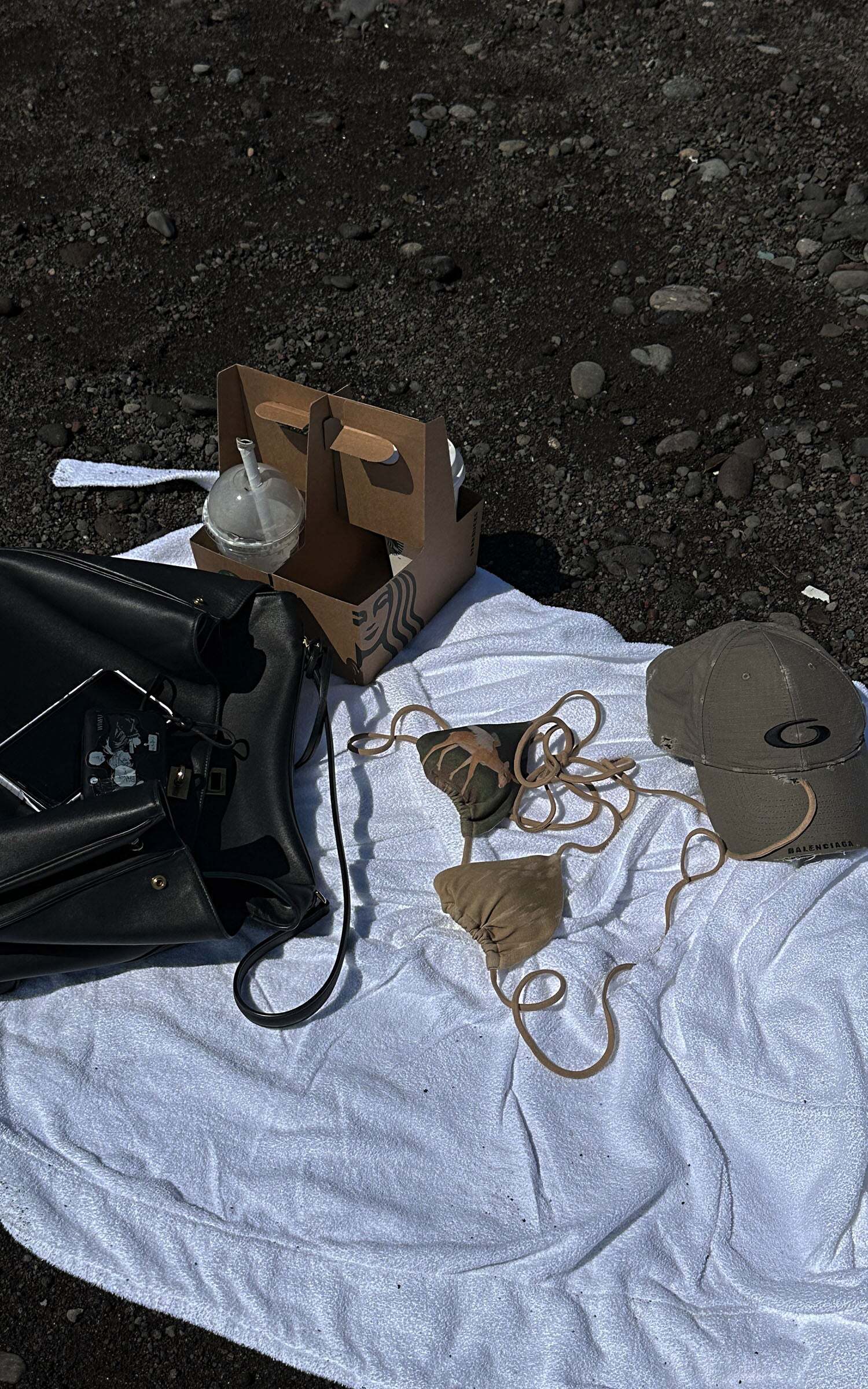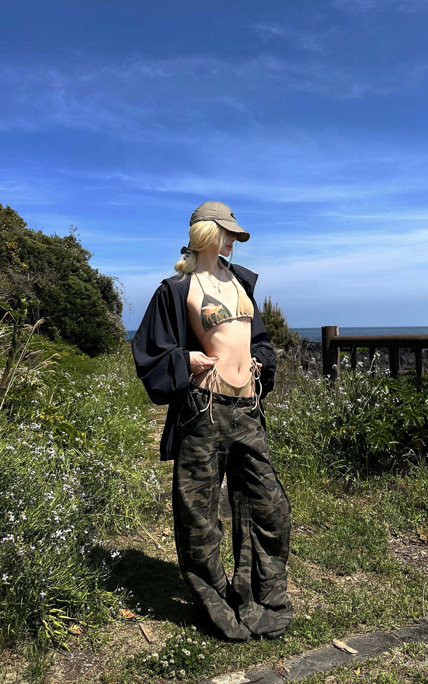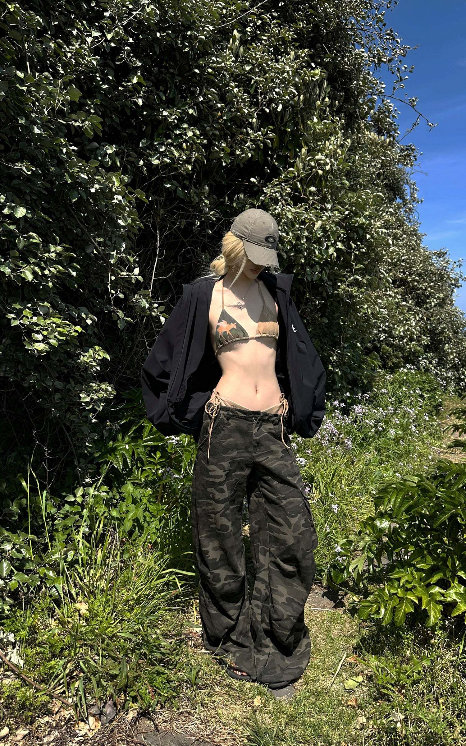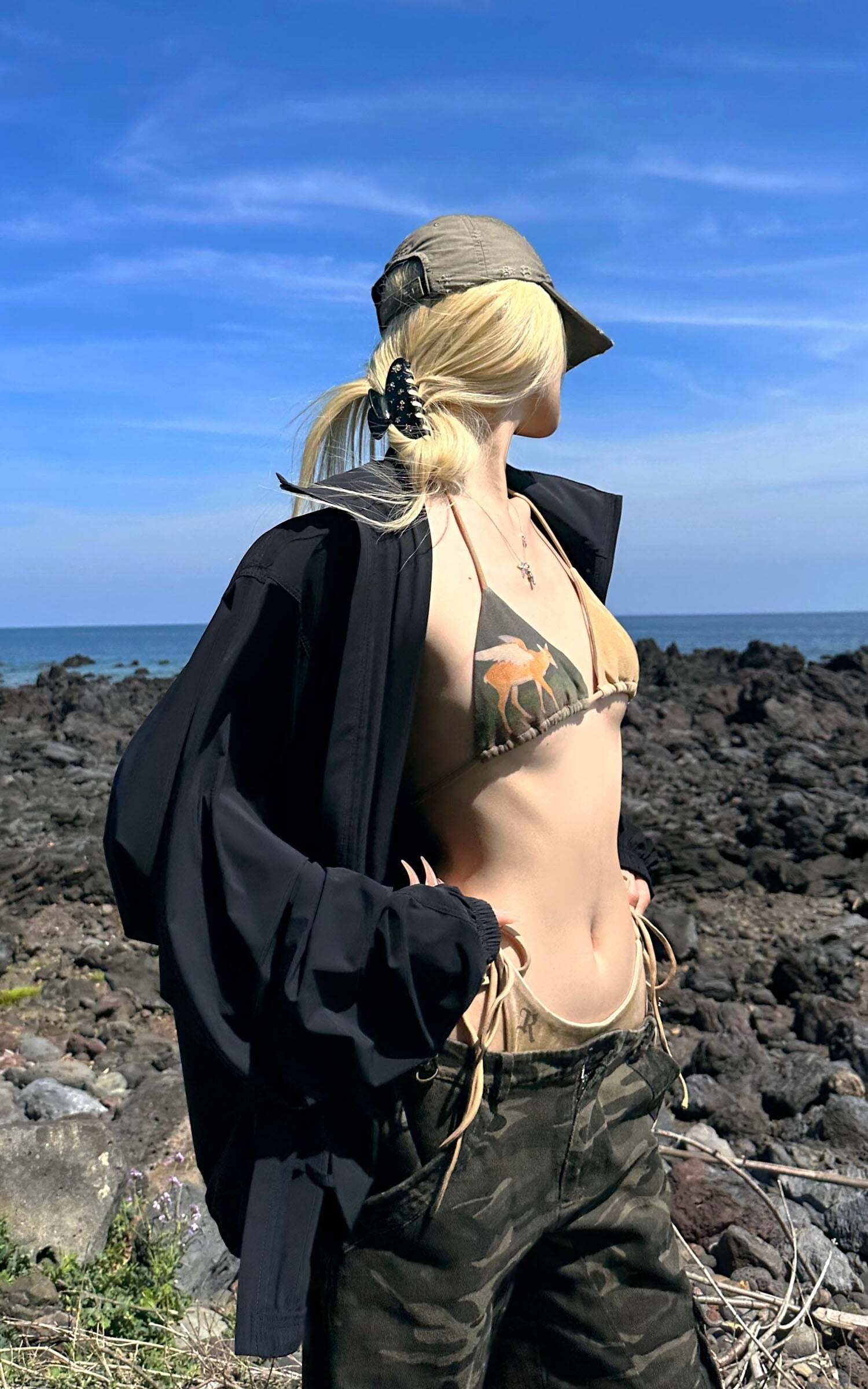 Like a forest mirage under a veil of soft light, the triangle bikini top features a muted khaki base with asymmetrical color blocking—one side depicting a winged fawn, evoking the presence of a forest spirit. The low-rise bottom is detailed with an “R” print, finished with delicate side ties for an adjustable fit. The fabric is soft and lightweight, with a naturally textured appearance and a faint vintage patina—reminiscent of garments weathered by time and sun. Ideal for basking under the sun or layering into your summer styling—between wilderness and urban drift.