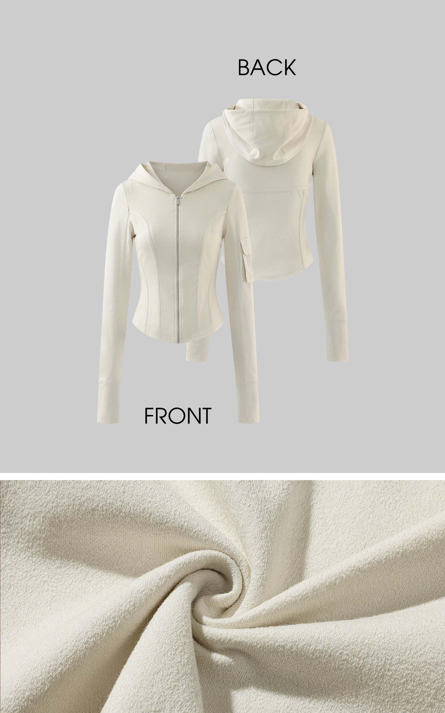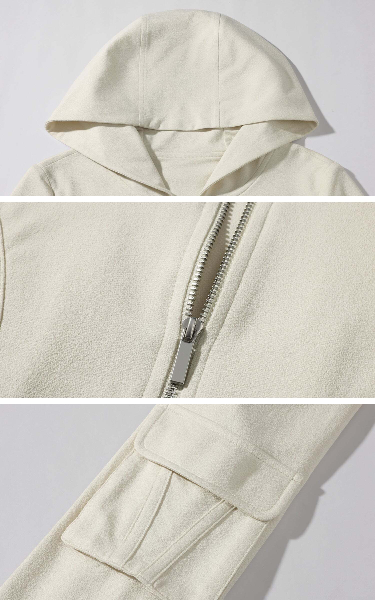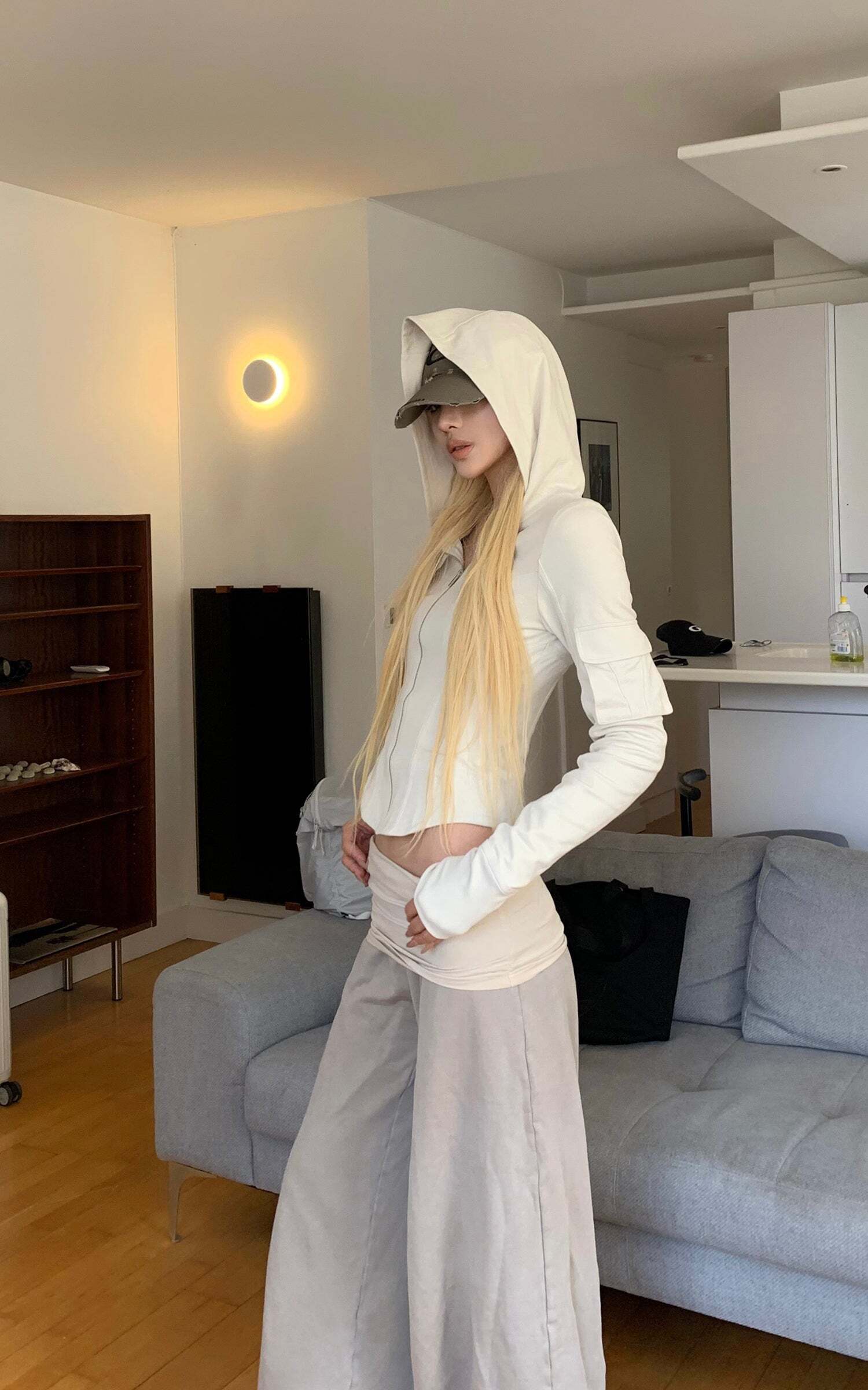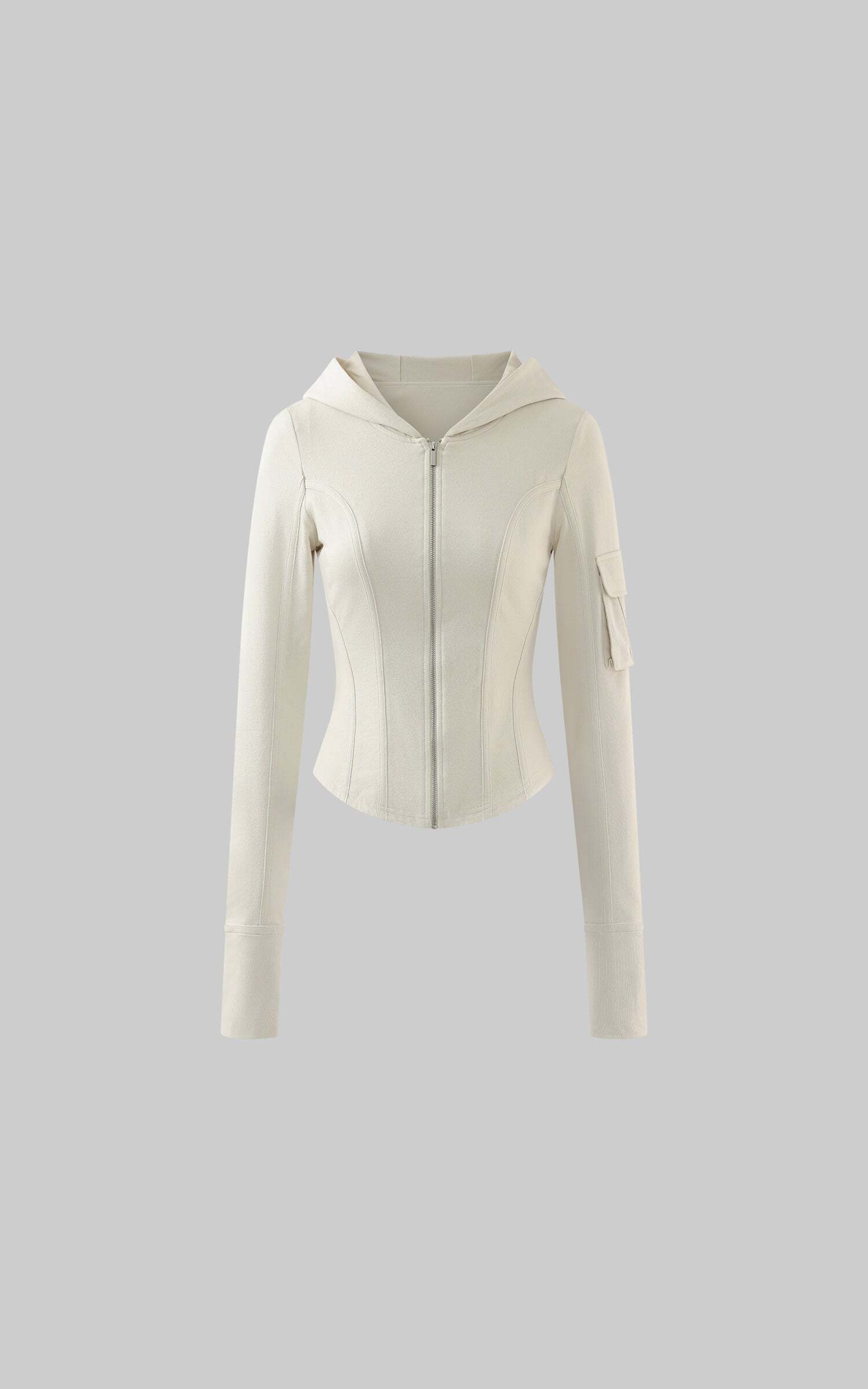 This jacket contours the body with clean, architectural lines, its fitted waist creating a stark yet fluid silhouette. Crafted from a dense yet flexible fabric, it carries a sense of structure, while the metal zipper and sleeve pocket detail echo utility and strength. The hood closes in as a shield from the world, while the open zip breathes freedom and release. A garment for both solitude and movement—equally at home on the road or beneath the night’s silence.