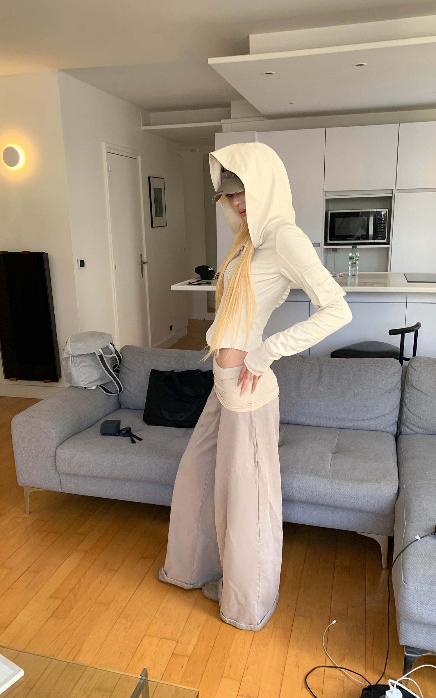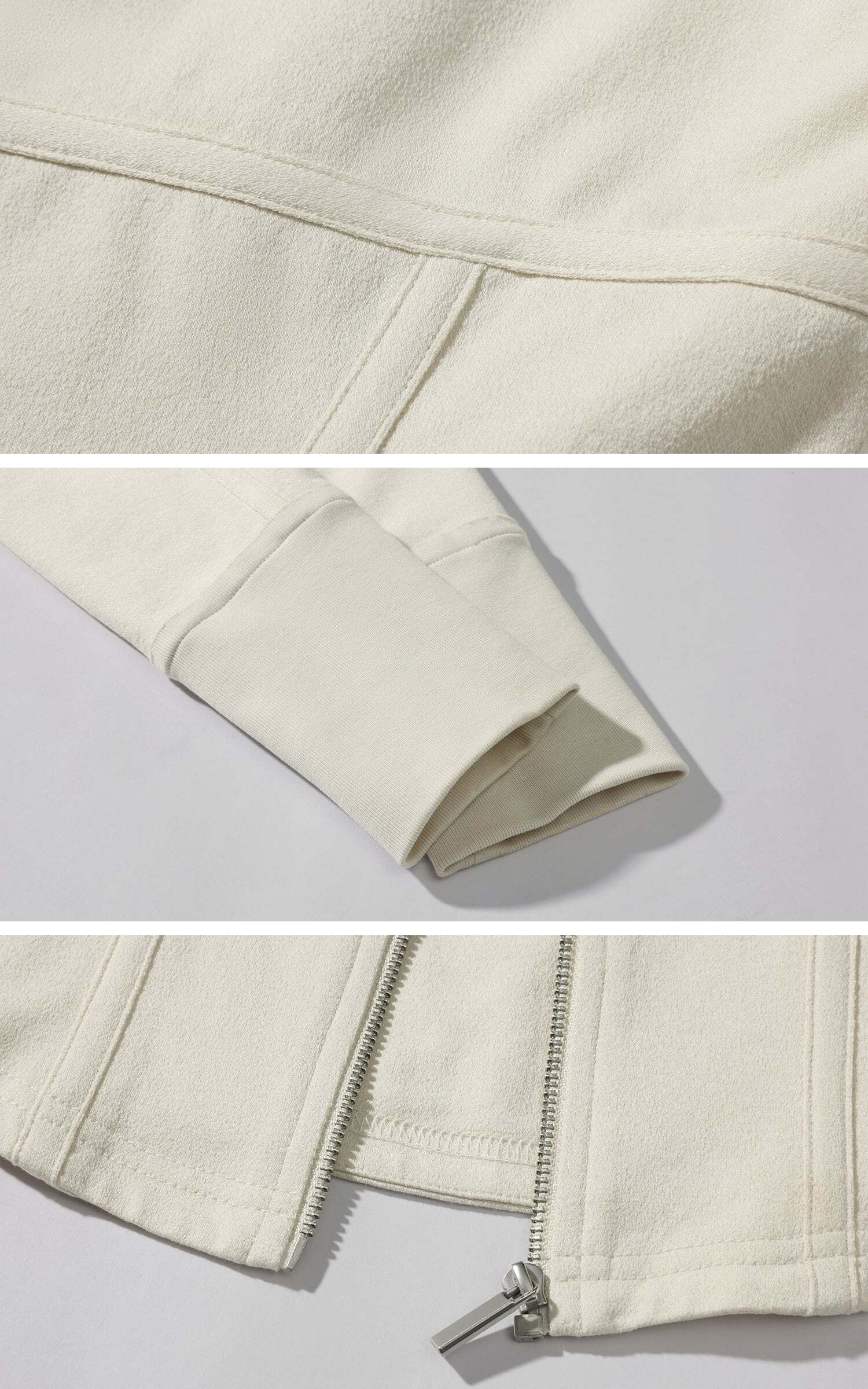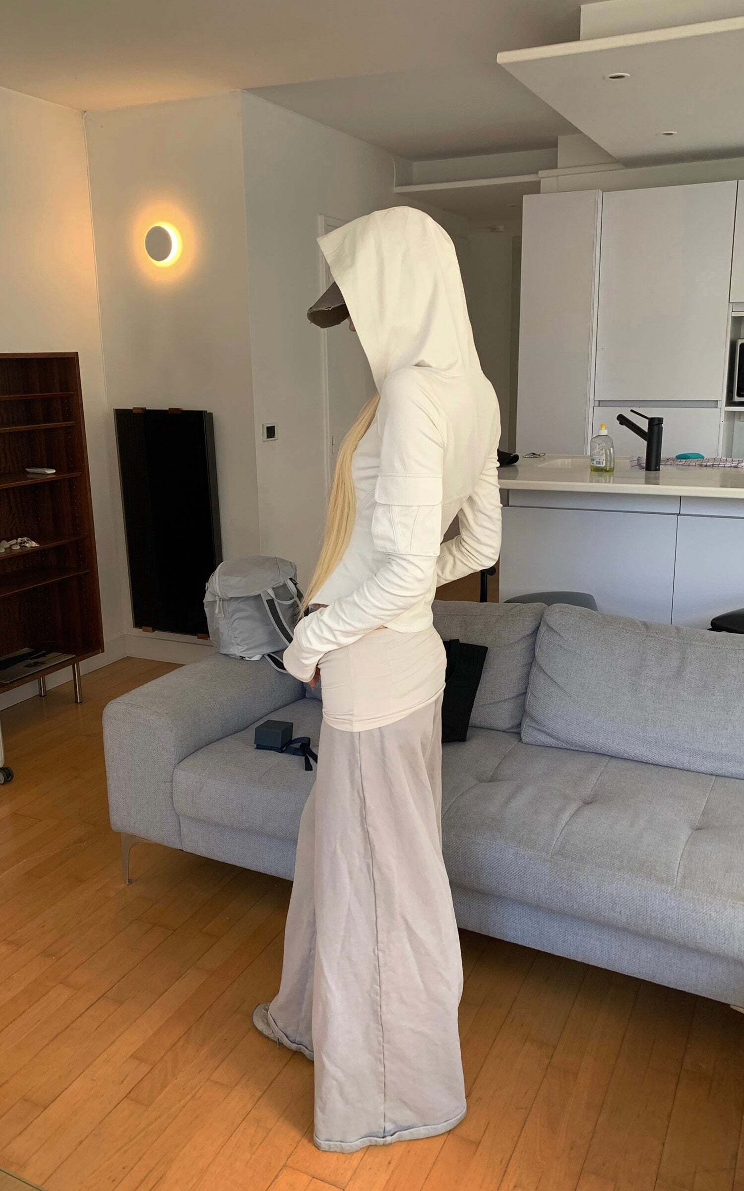 This jacket contours the body with clean, architectural lines, its fitted waist creating a stark yet fluid silhouette. Crafted from a dense yet flexible fabric, it carries a sense of structure, while the metal zipper and sleeve pocket detail echo utility and strength. The hood closes in as a shield from the world, while the open zip breathes freedom and release. A garment for both solitude and movement—equally at home on the road or beneath the night’s silence.