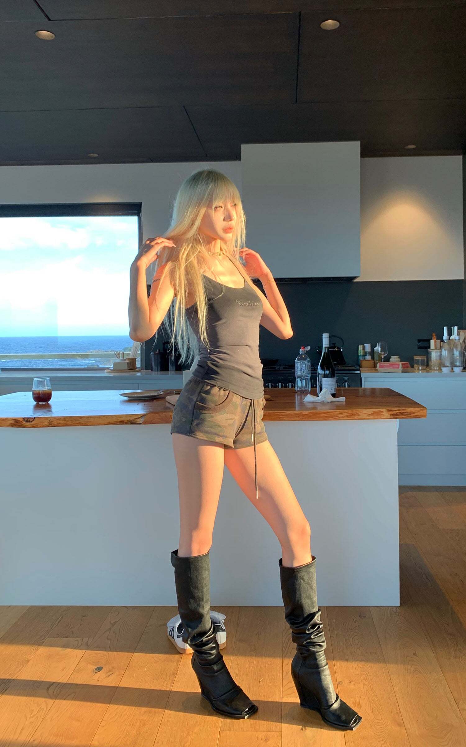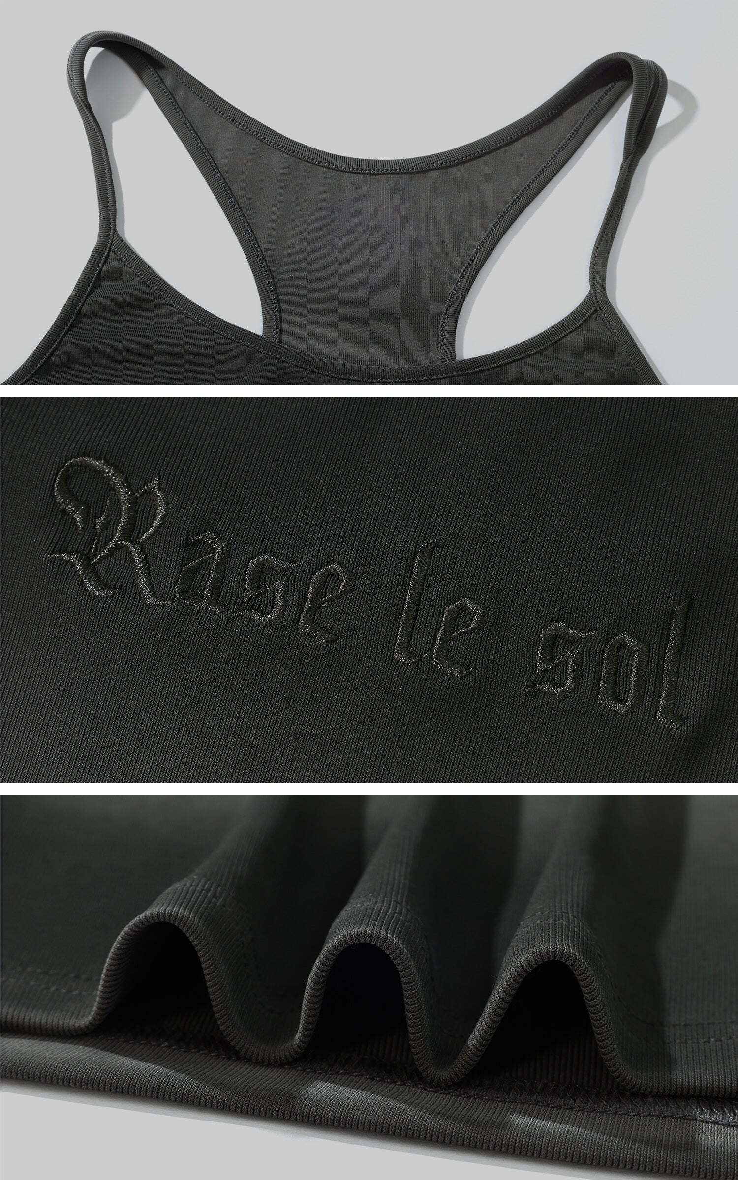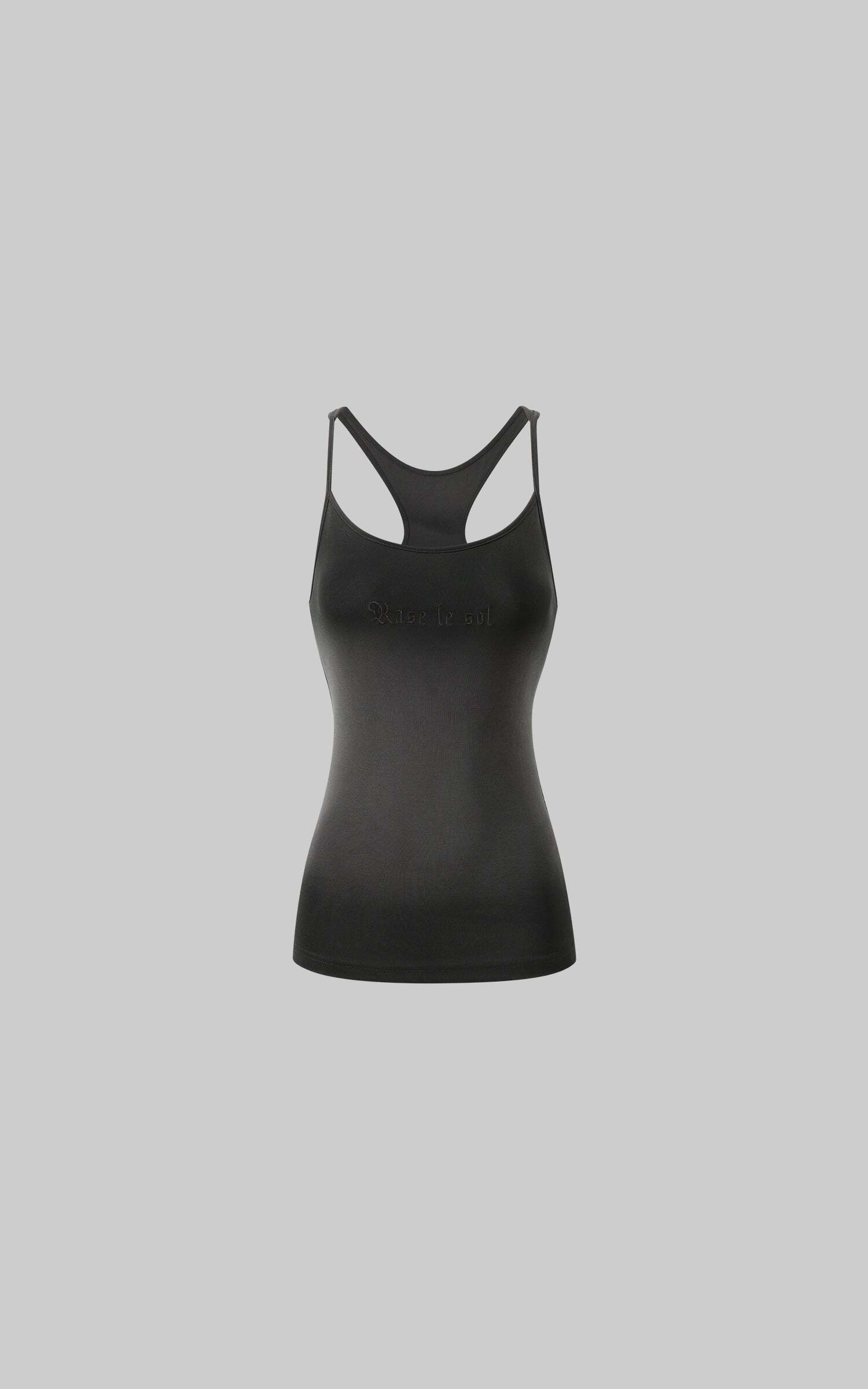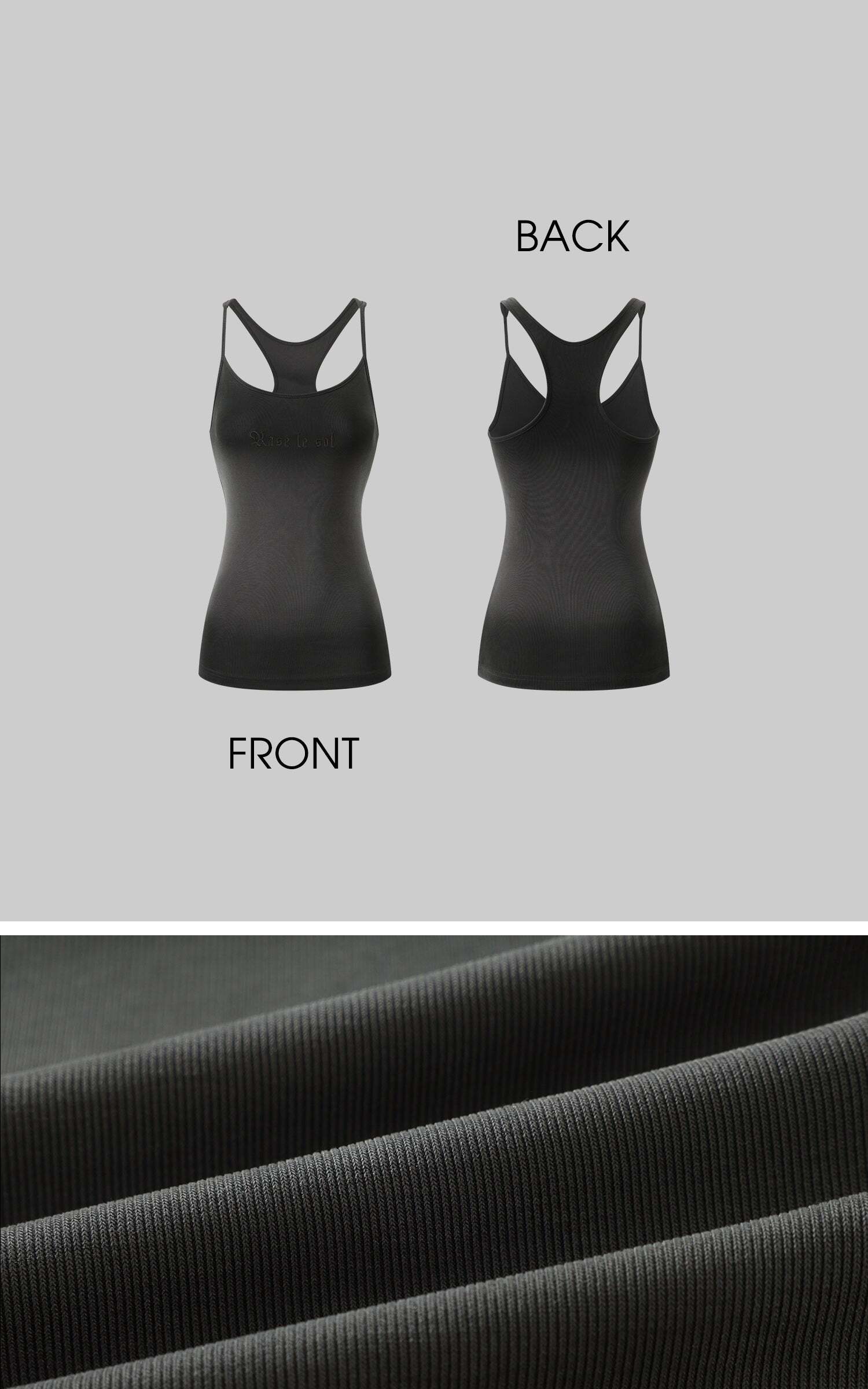 A tank top sketched in silent lines. The fitted silhouette and elastic ribbed fabric embrace the body with soft precision, tracing its most natural form. Fine straps cross the back, shaping a structure that is sharp yet unforced. A muted embroidery at the chest marks a quiet, personal insignia. Light but charged with tension, it stands strong whether worn alone or as an unseen, cutting layer.