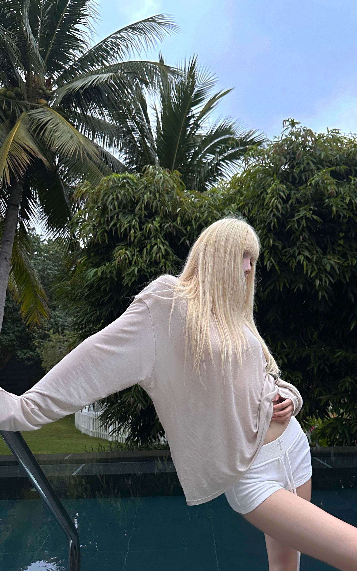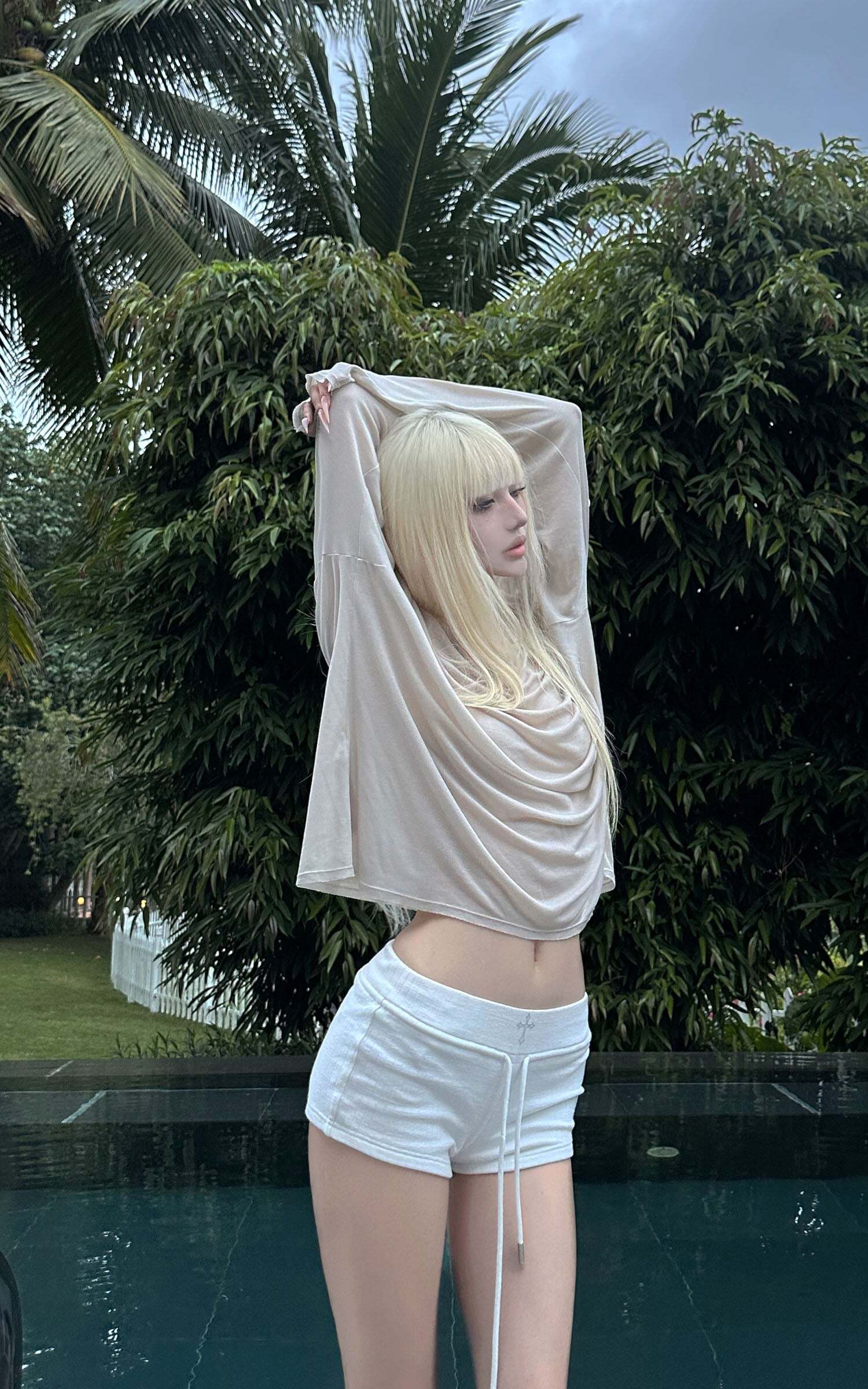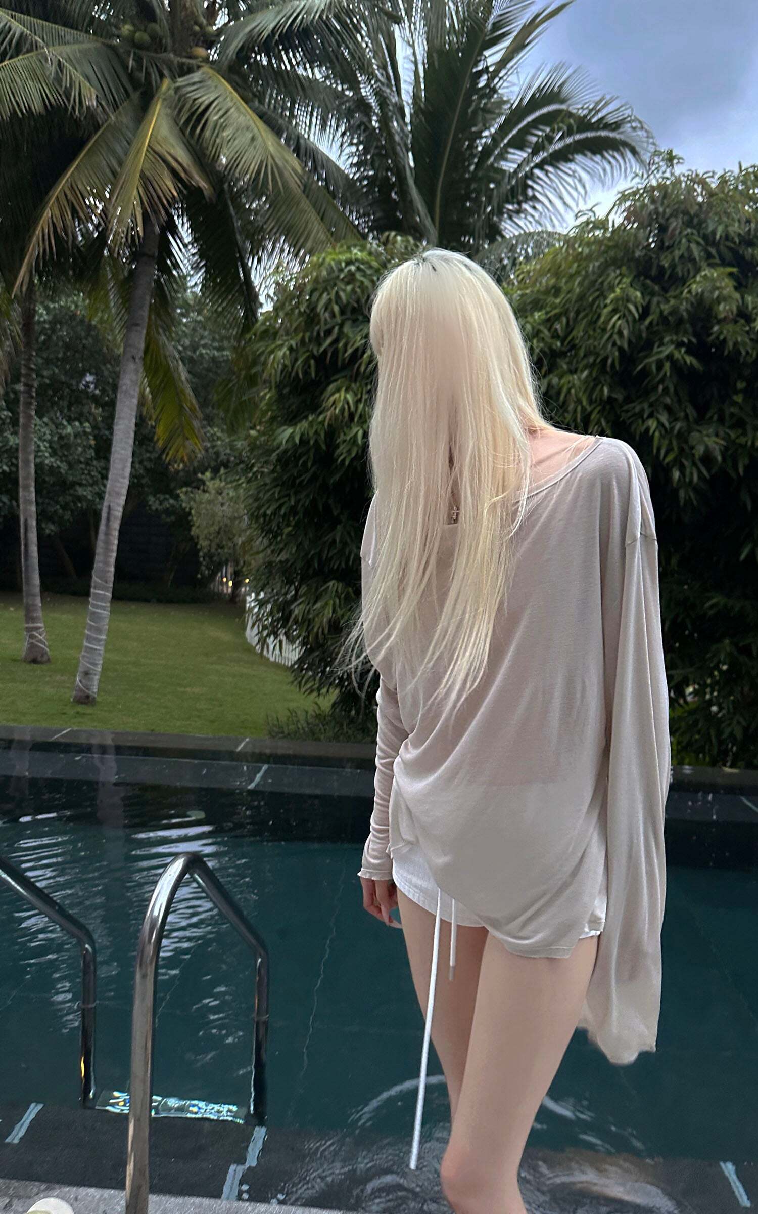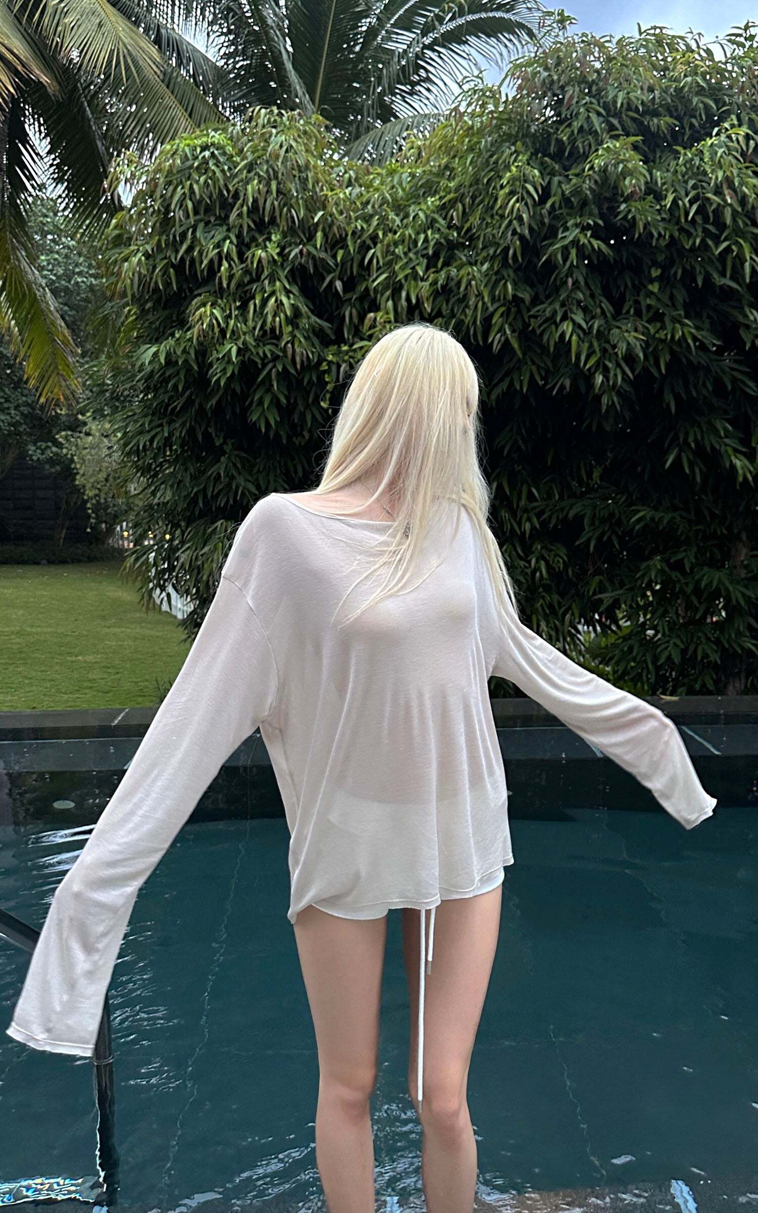 This loose-knit top reads like a quiet poem of softness and surrender. The semi-sheer off-white fabric clings to the body with featherlight grace, shifting gently with every breath—like a murmur just below the surface. Dropped shoulders and extended sleeves imbue the silhouette with deliberate dissonance, evoking a sense of delicate imbalance. Raw-edge finishing underscores its untouched, natural state—a quiet rebellion in texture. The material is supple and skin-friendly, ideal for layering or wearing alone to explore the interplay of form and light, purity and desire.