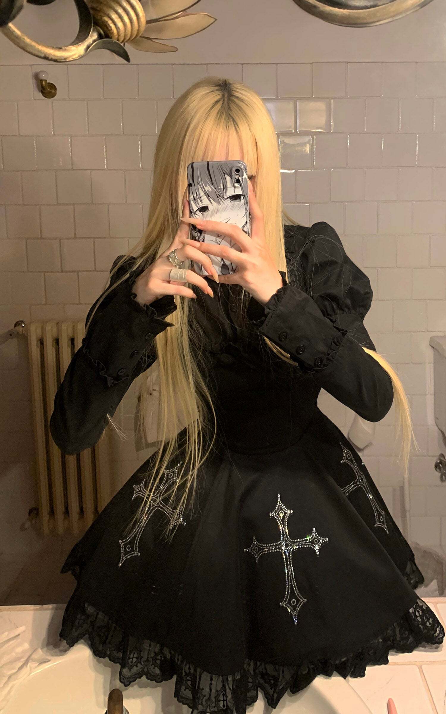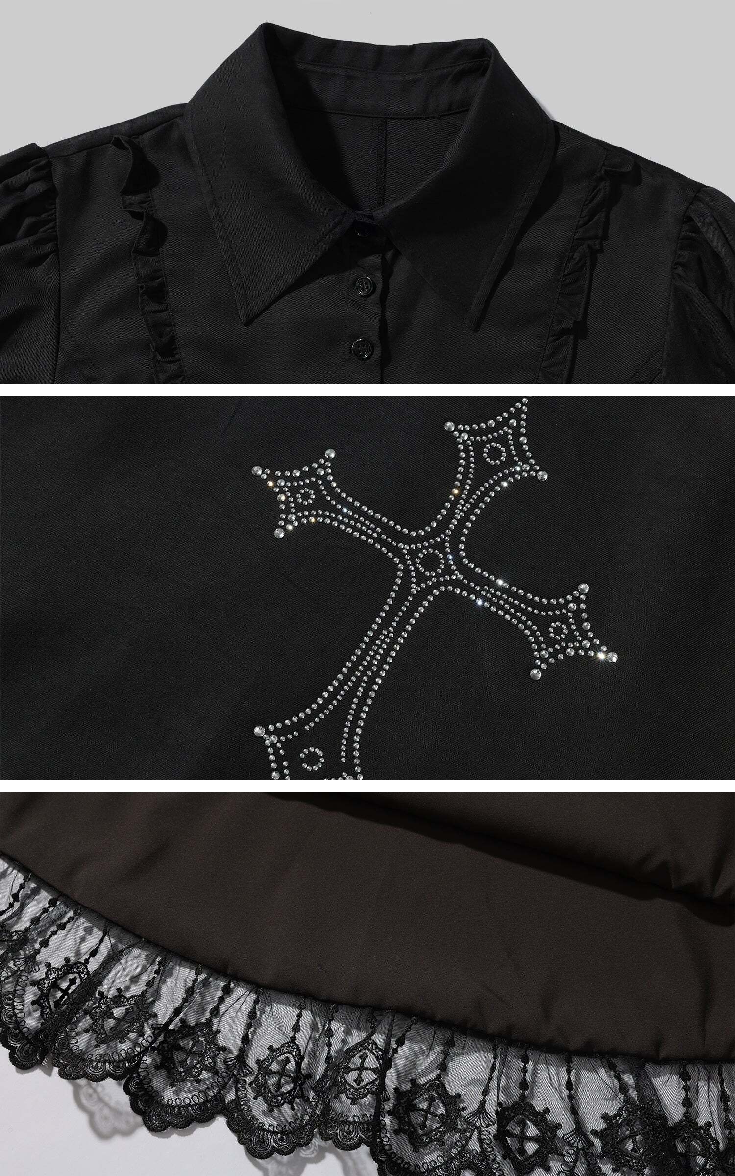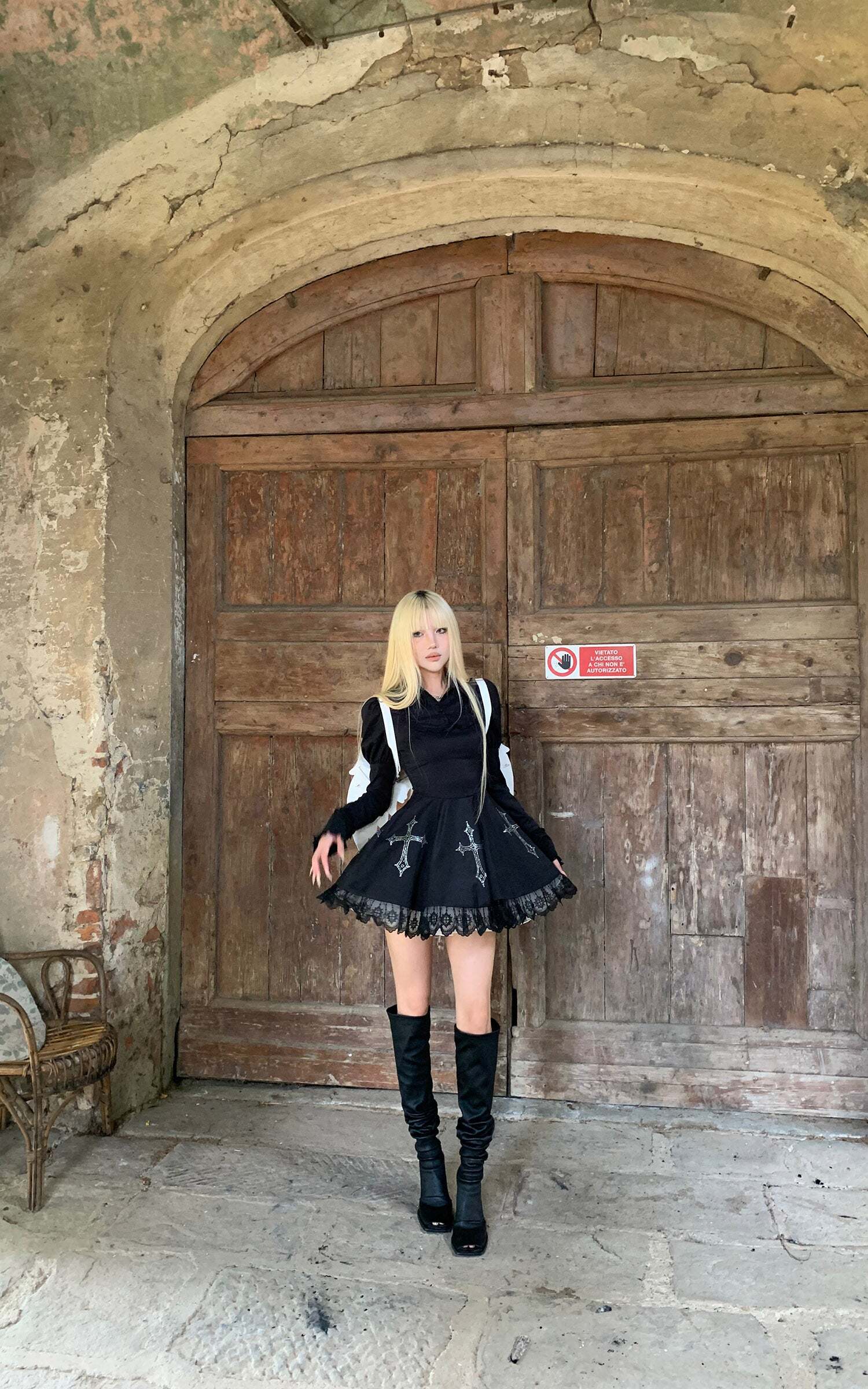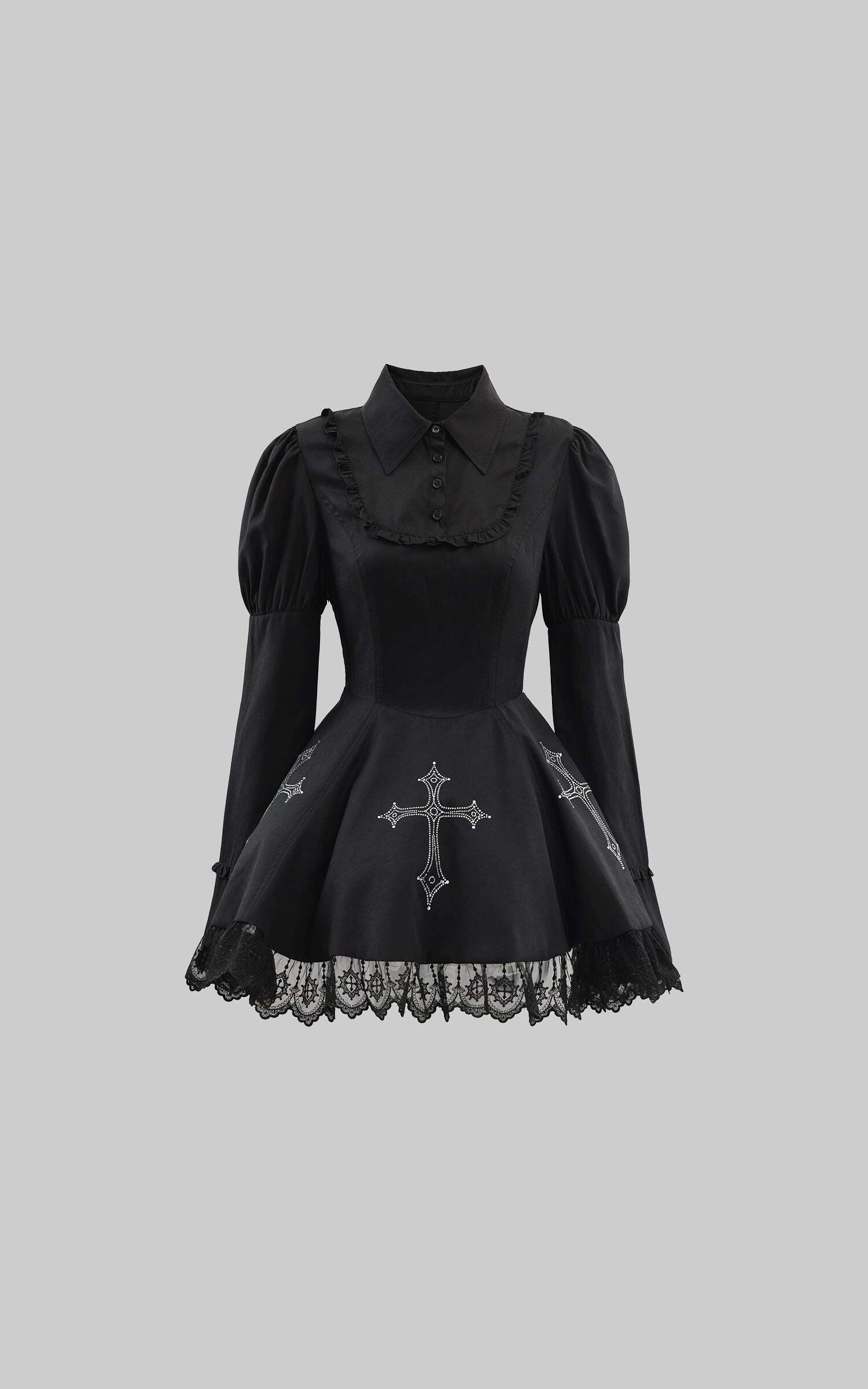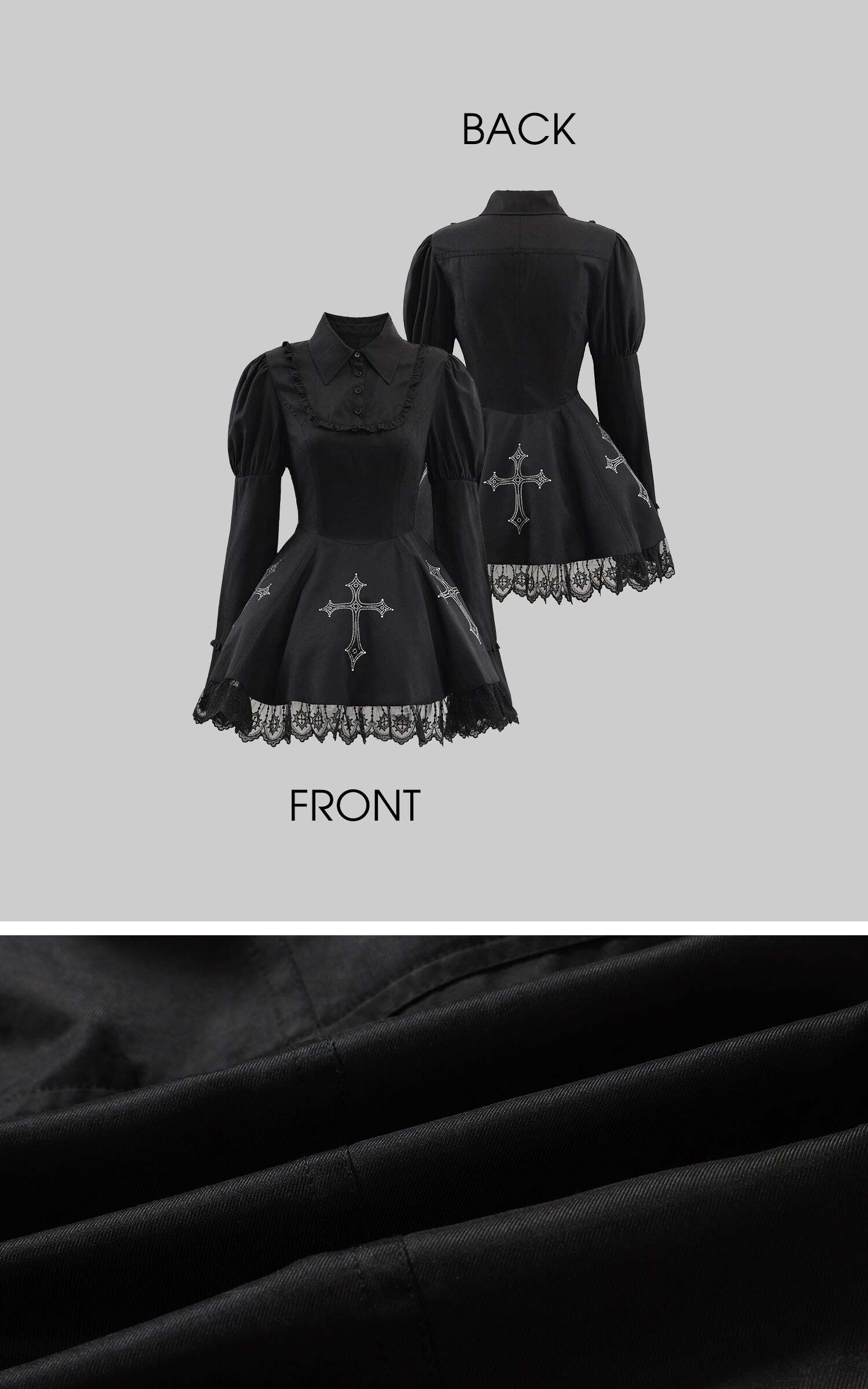 Gothic Dress with Cross Embroidery and Lace Hem – Vampire – Vampire Costume Aesthetic