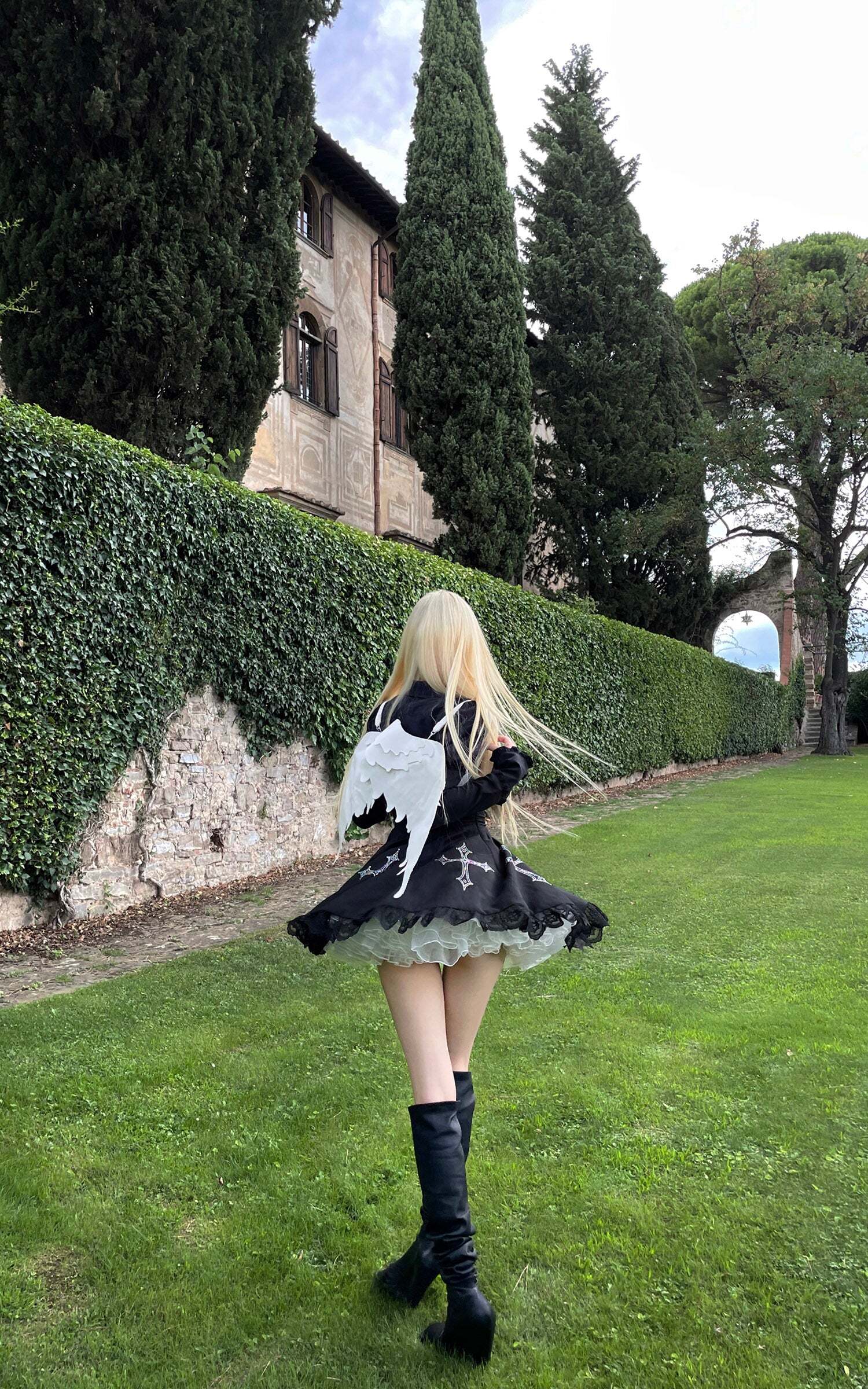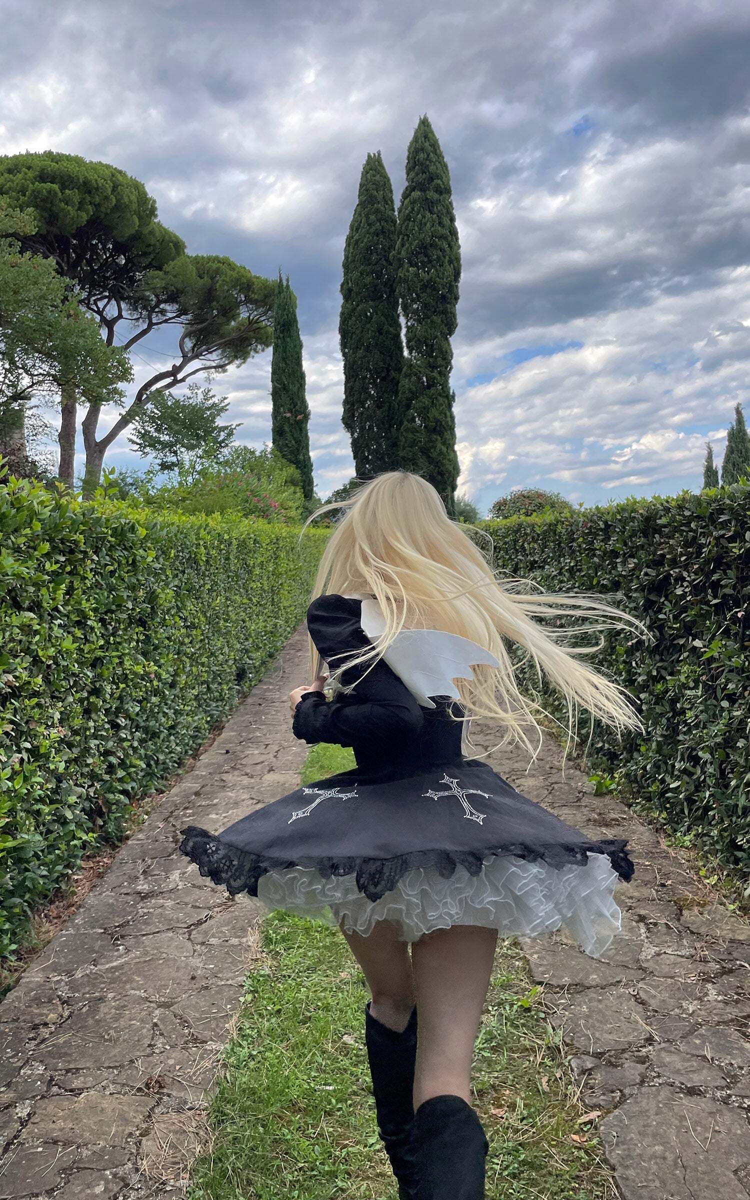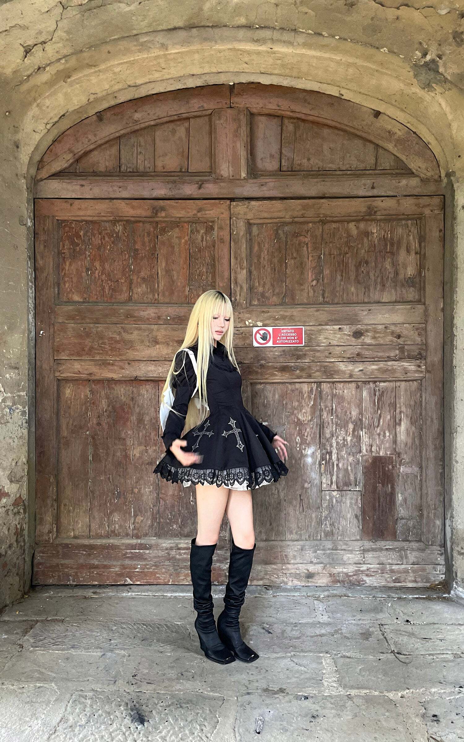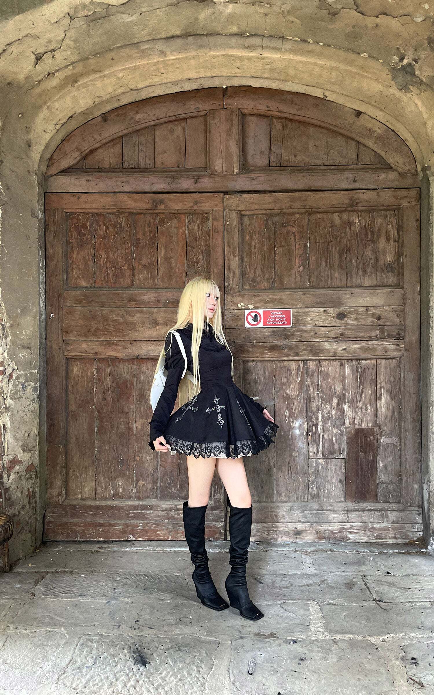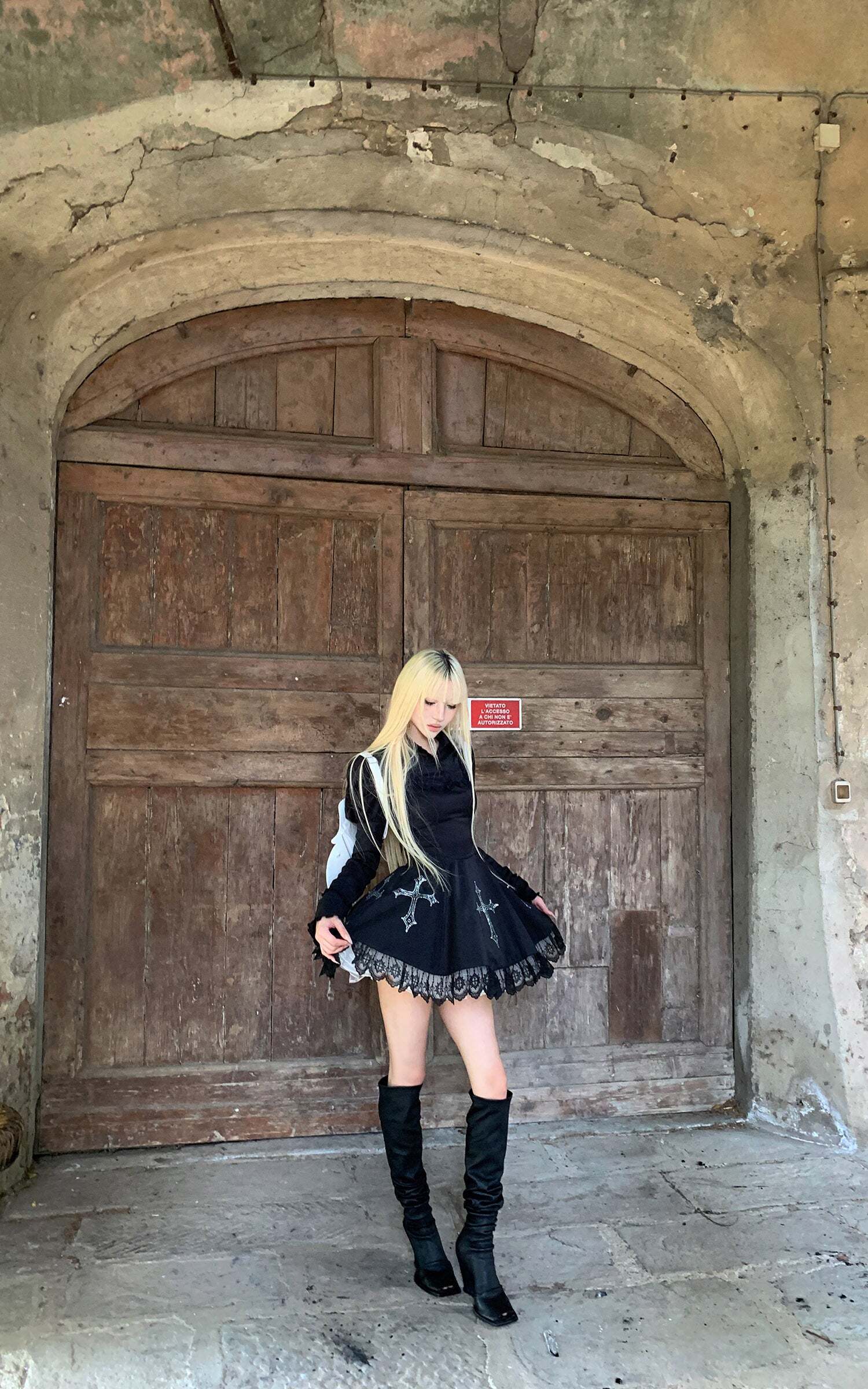 Gothic Dress with Cross Embroidery and Lace Hem – Vampire – Vampire Costume Aesthetic