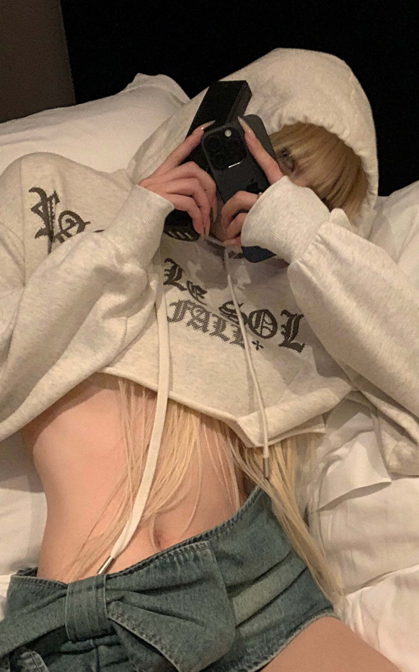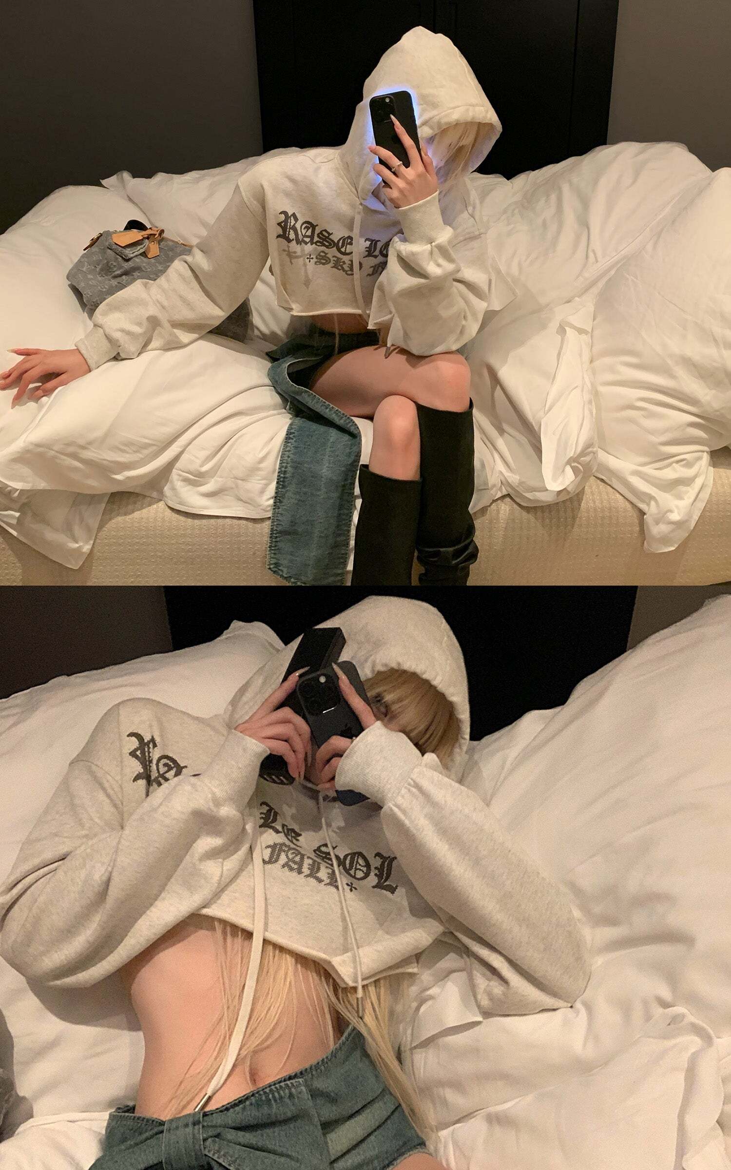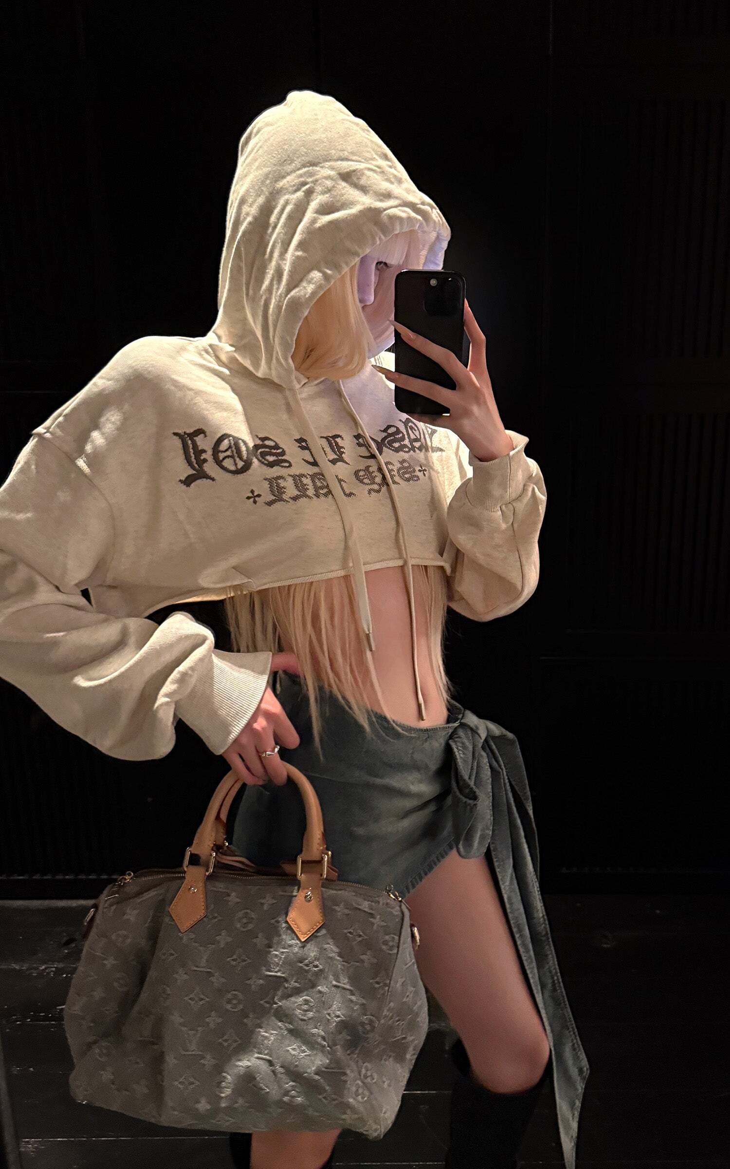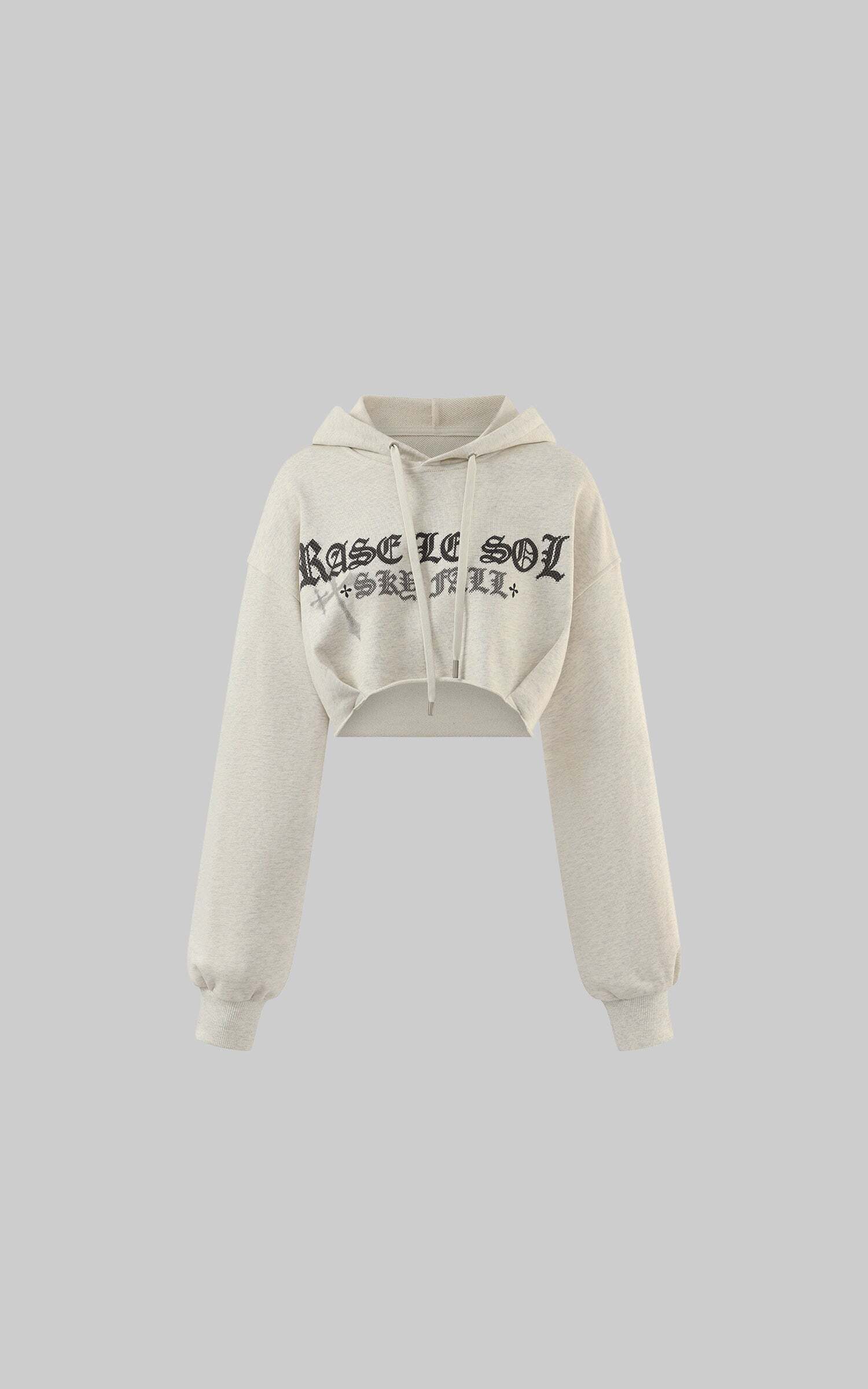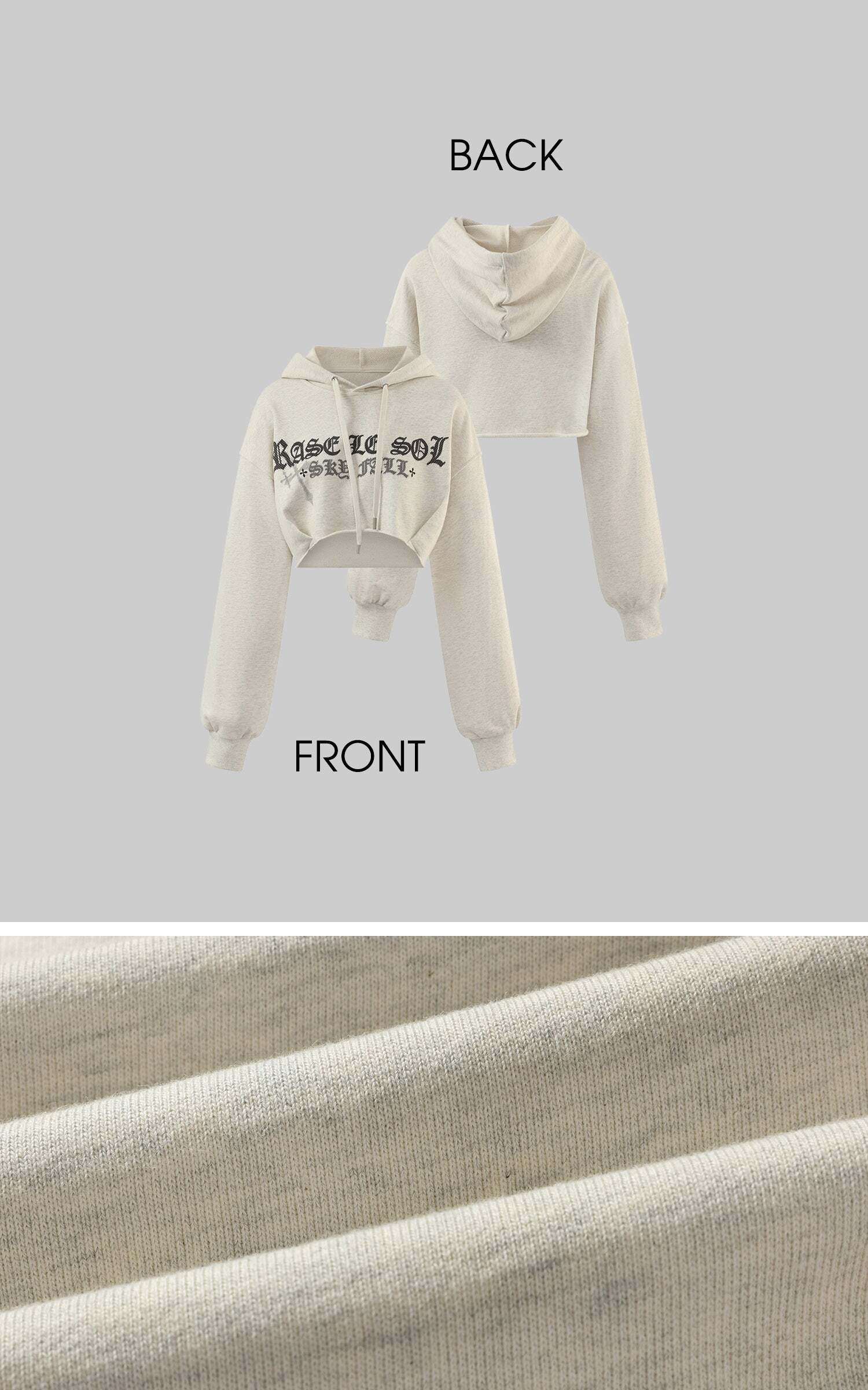A soft rebellion—this cropped hoodie features a raw hem, wide long sleeves, and pixel-style gothic lettering across the chest. Made from a midweight cotton blend with soft brushed backing, it drapes over the body with nonchalance and reveals the lower back in motion. Oversized drawstrings complete the slouchy silhouette, contrasting the tight vertical cut. Wear it layered or alone to emphasize the tension between softness and edge.
