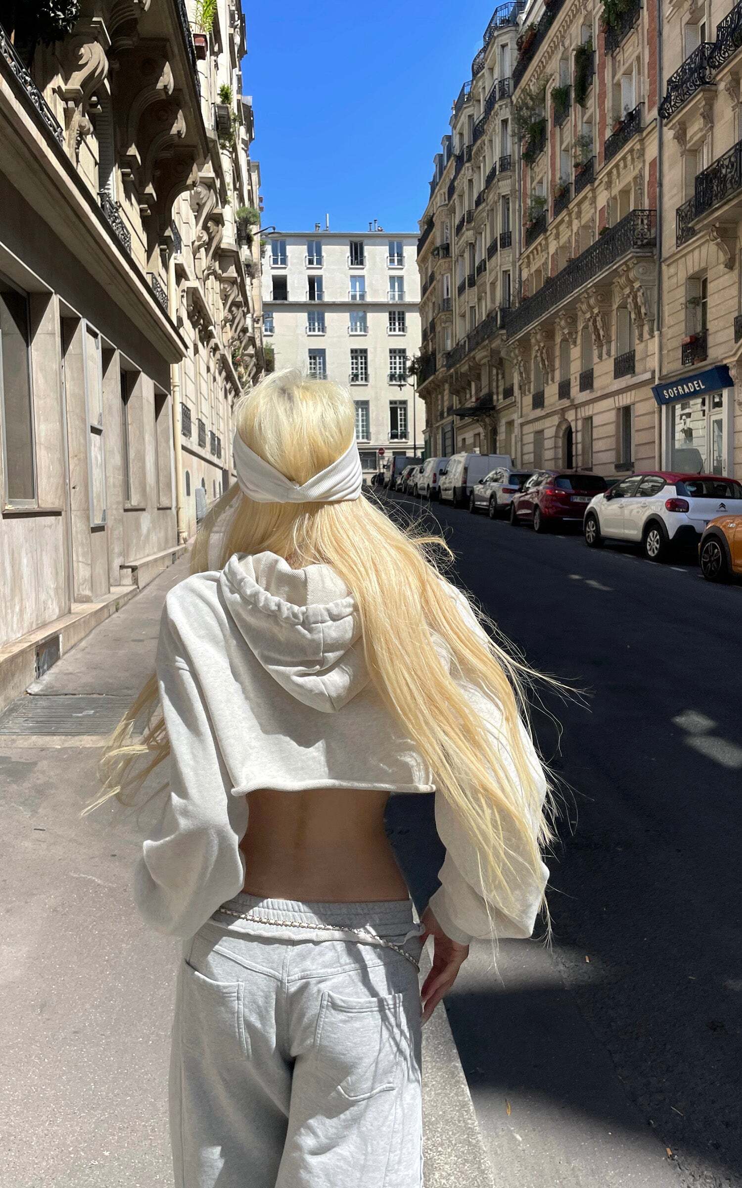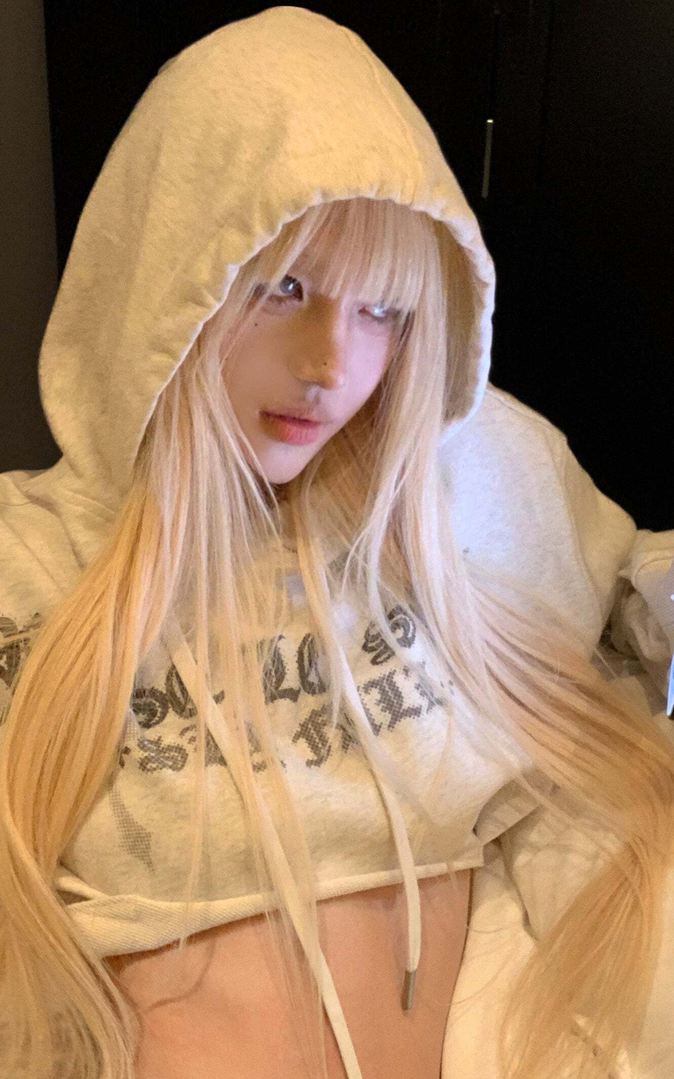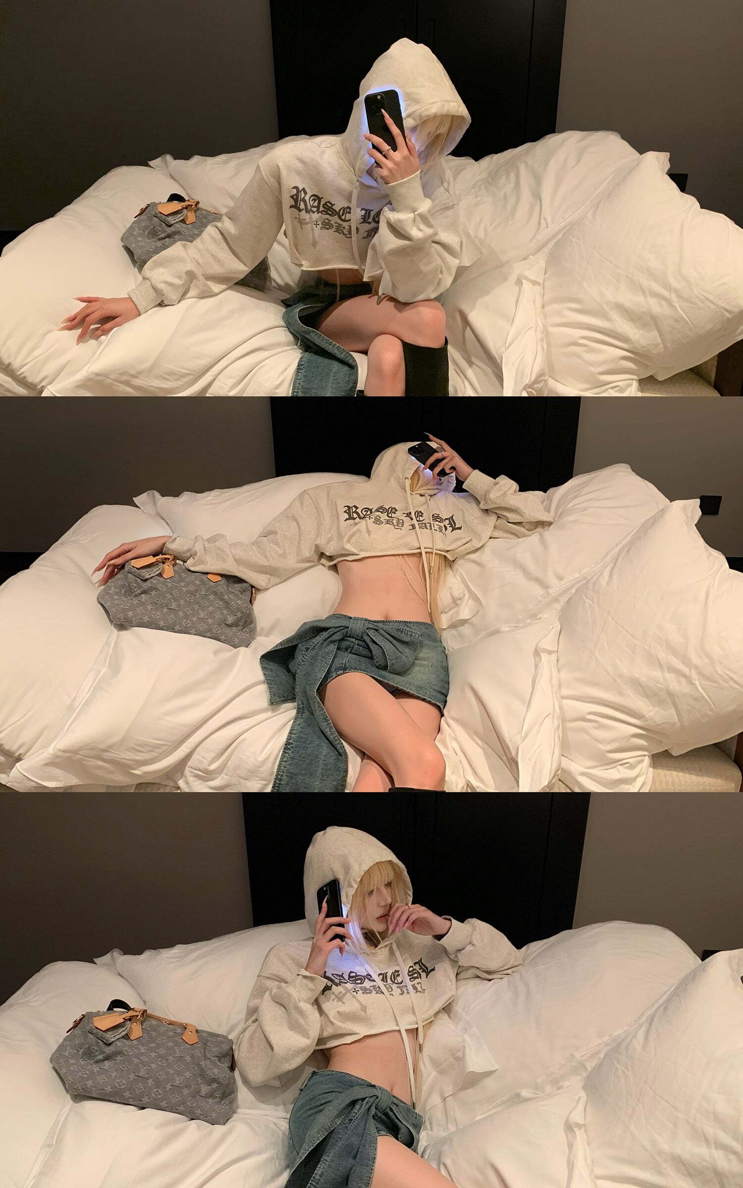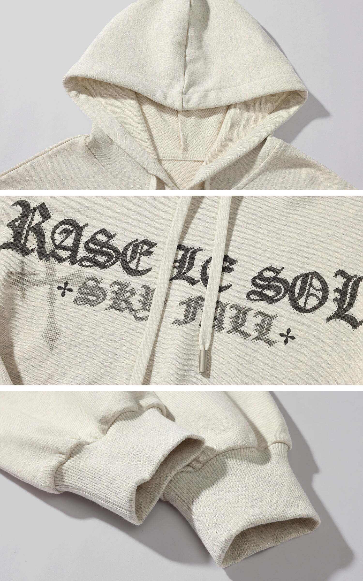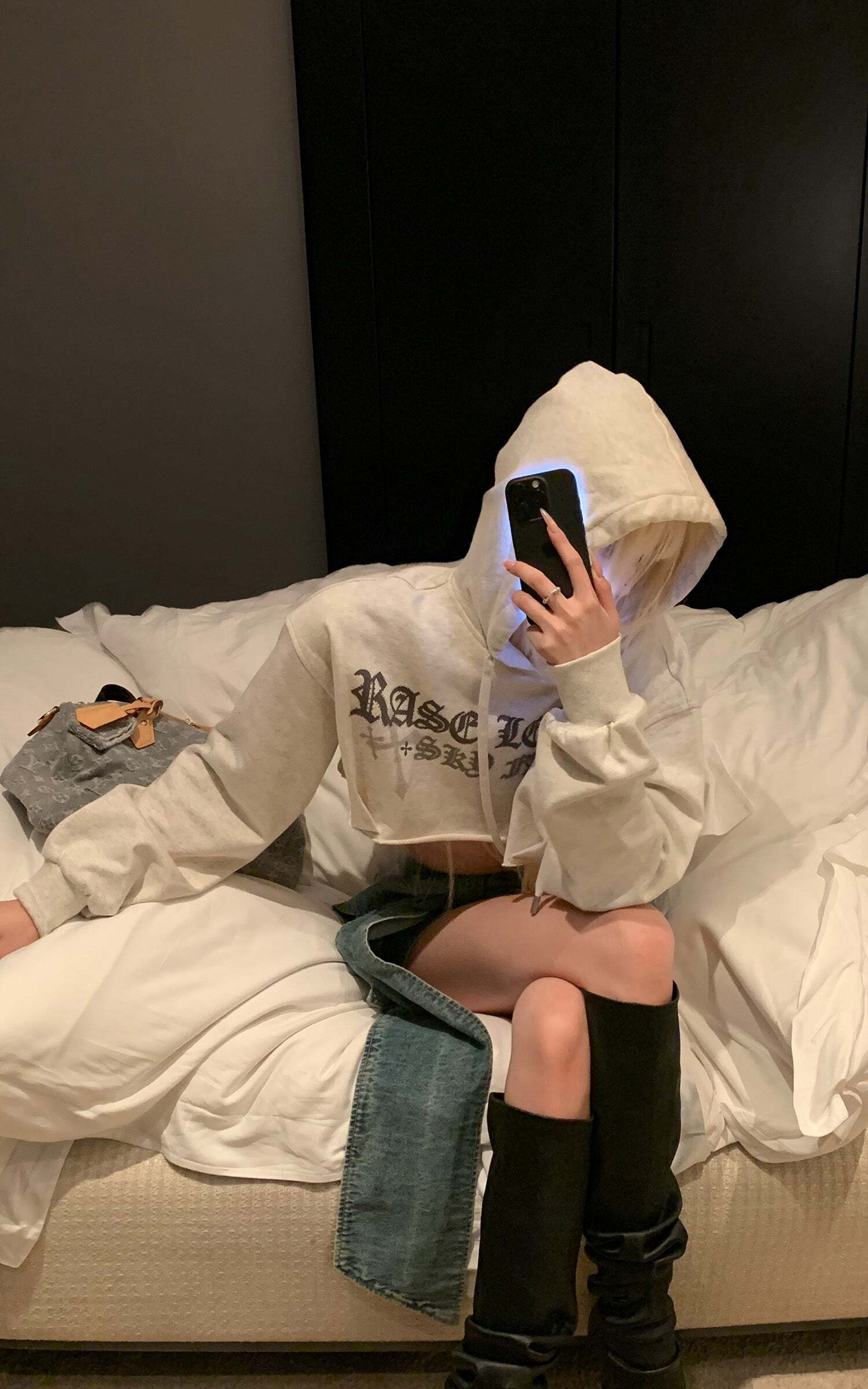 A soft rebellion—this cropped hoodie features a raw hem, wide long sleeves, and pixel-style gothic lettering across the chest. Made from a midweight cotton blend with soft brushed backing, it drapes over the body with nonchalance and reveals the lower back in motion. Oversized drawstrings complete the slouchy silhouette, contrasting the tight vertical cut. Wear it layered or alone to emphasize the tension between softness and edge.