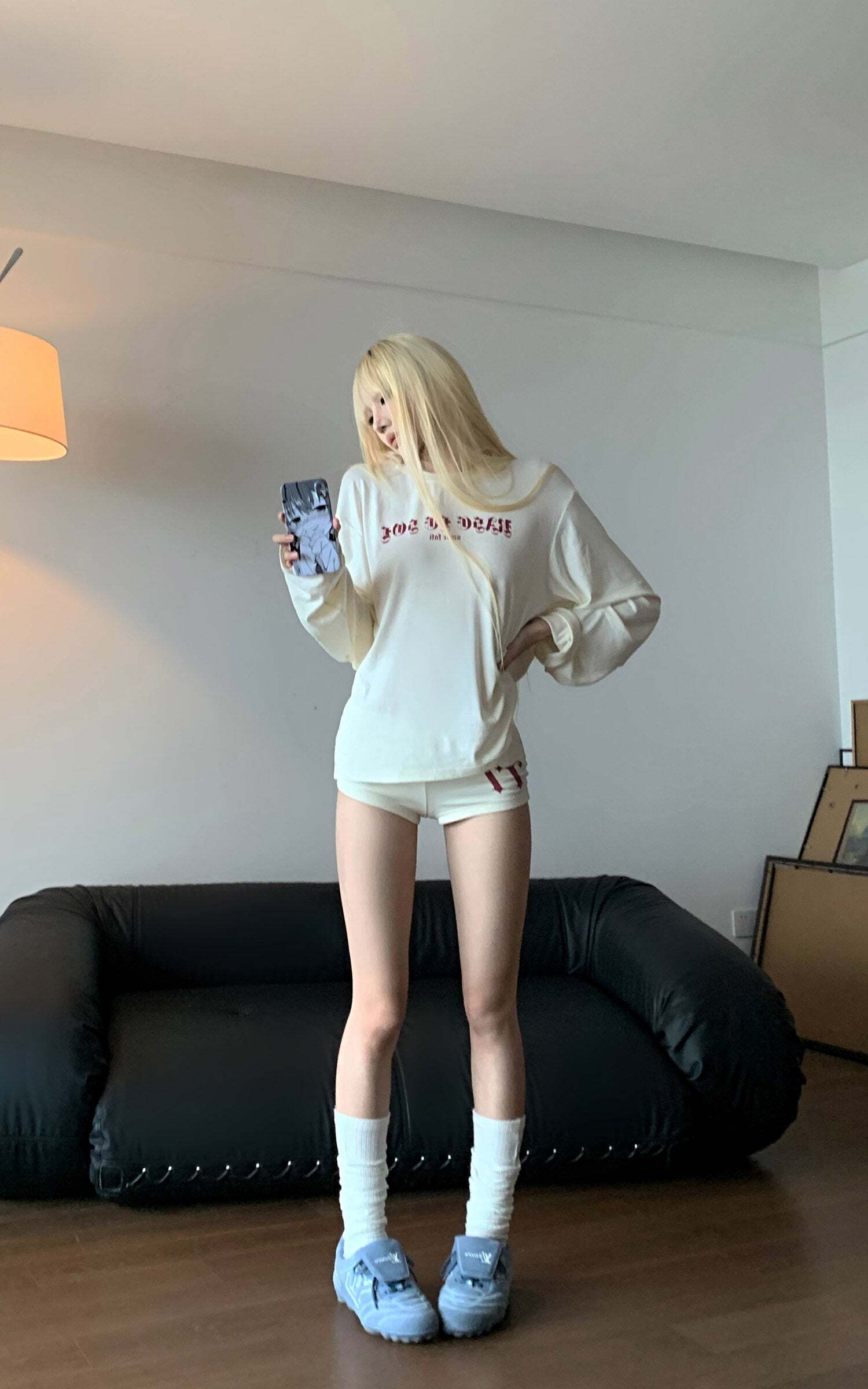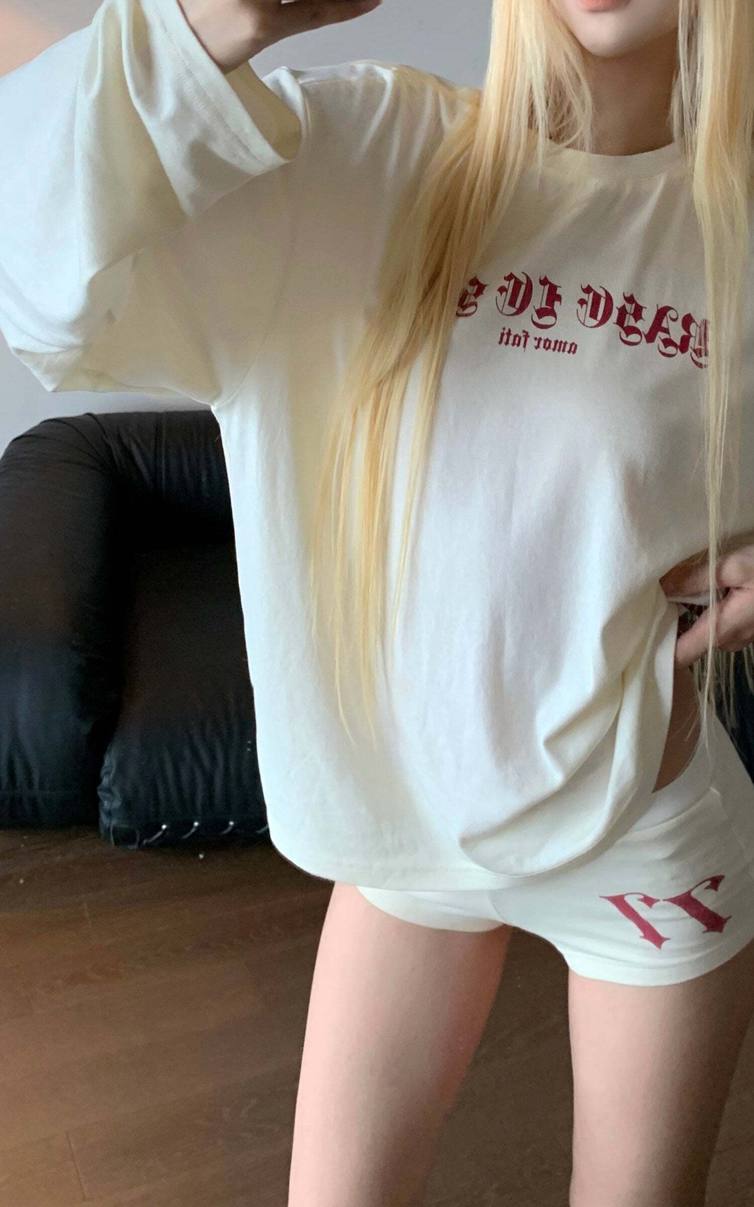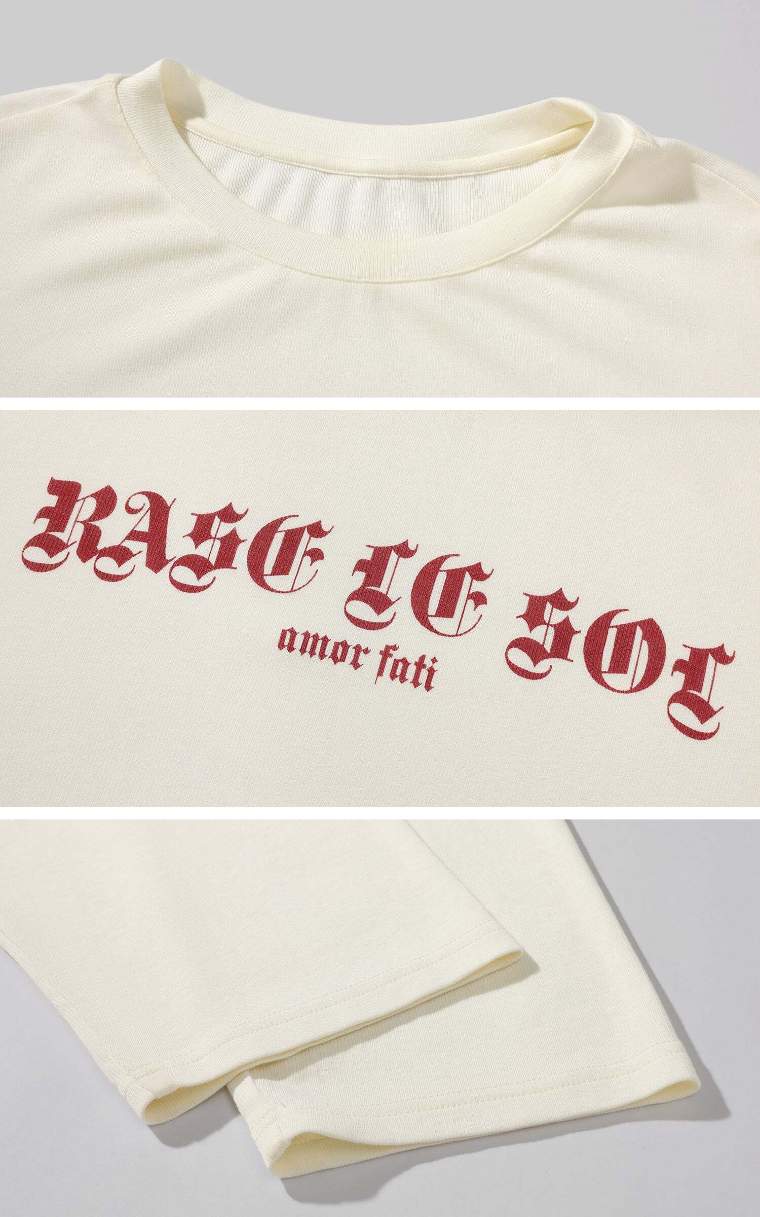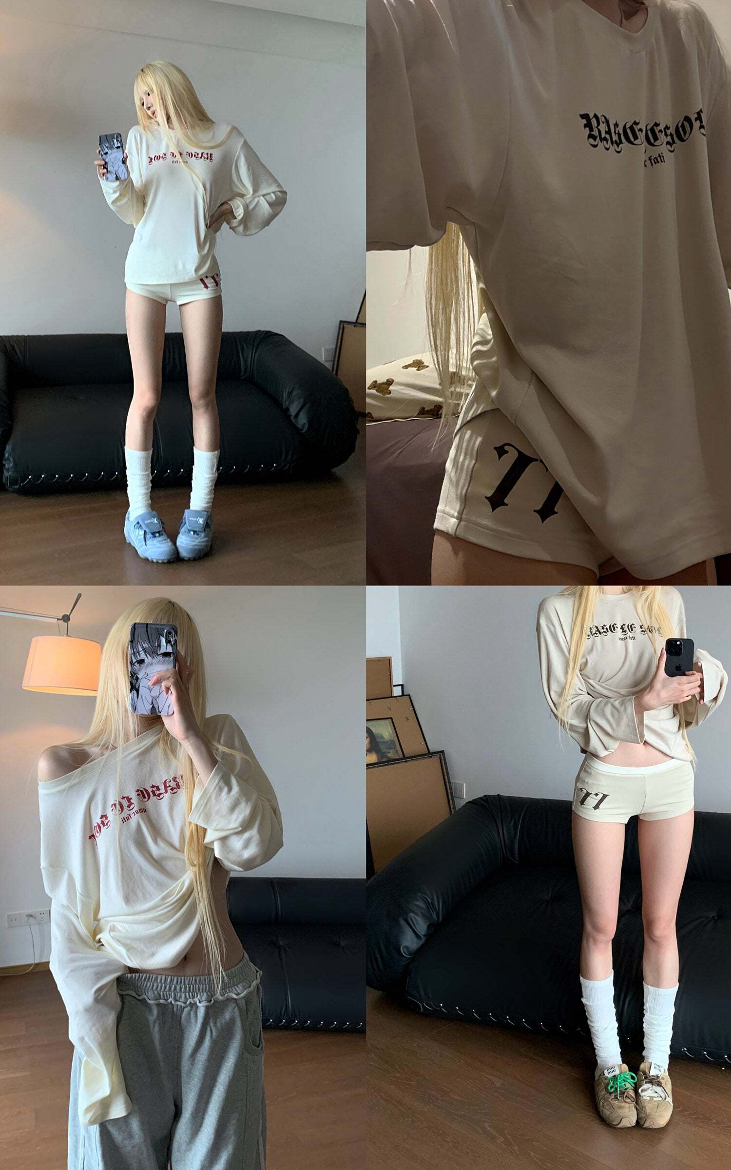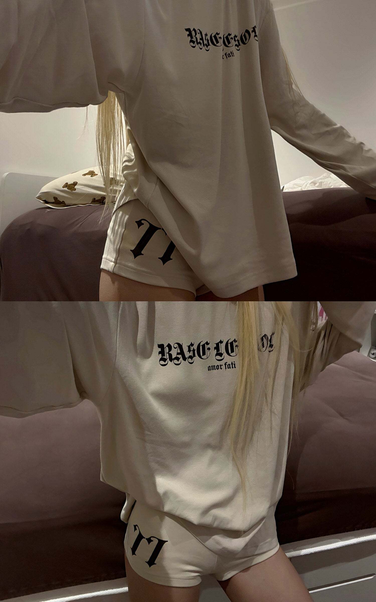 A soft long-sleeve tee with a loose silhouette and bold gothic lettering across the chest adds a hint of darkness to a relaxed mood. Paired with high-stretch knit shorts that contour the leg with subtle sensuality. The low-saturation tones and understated design evoke a quiet, solitary confidence. Wear as a set or separate for a layered, composed expression.