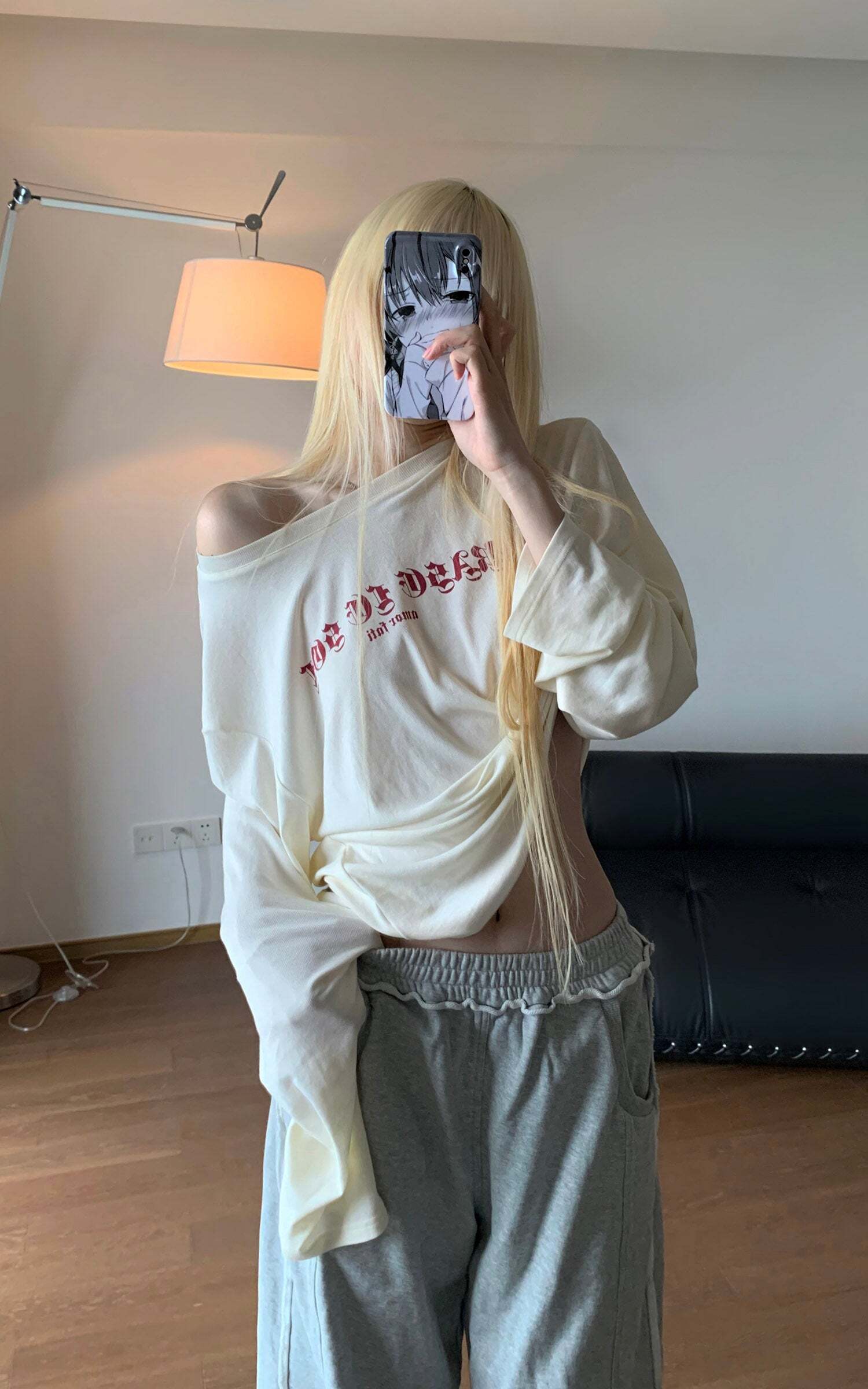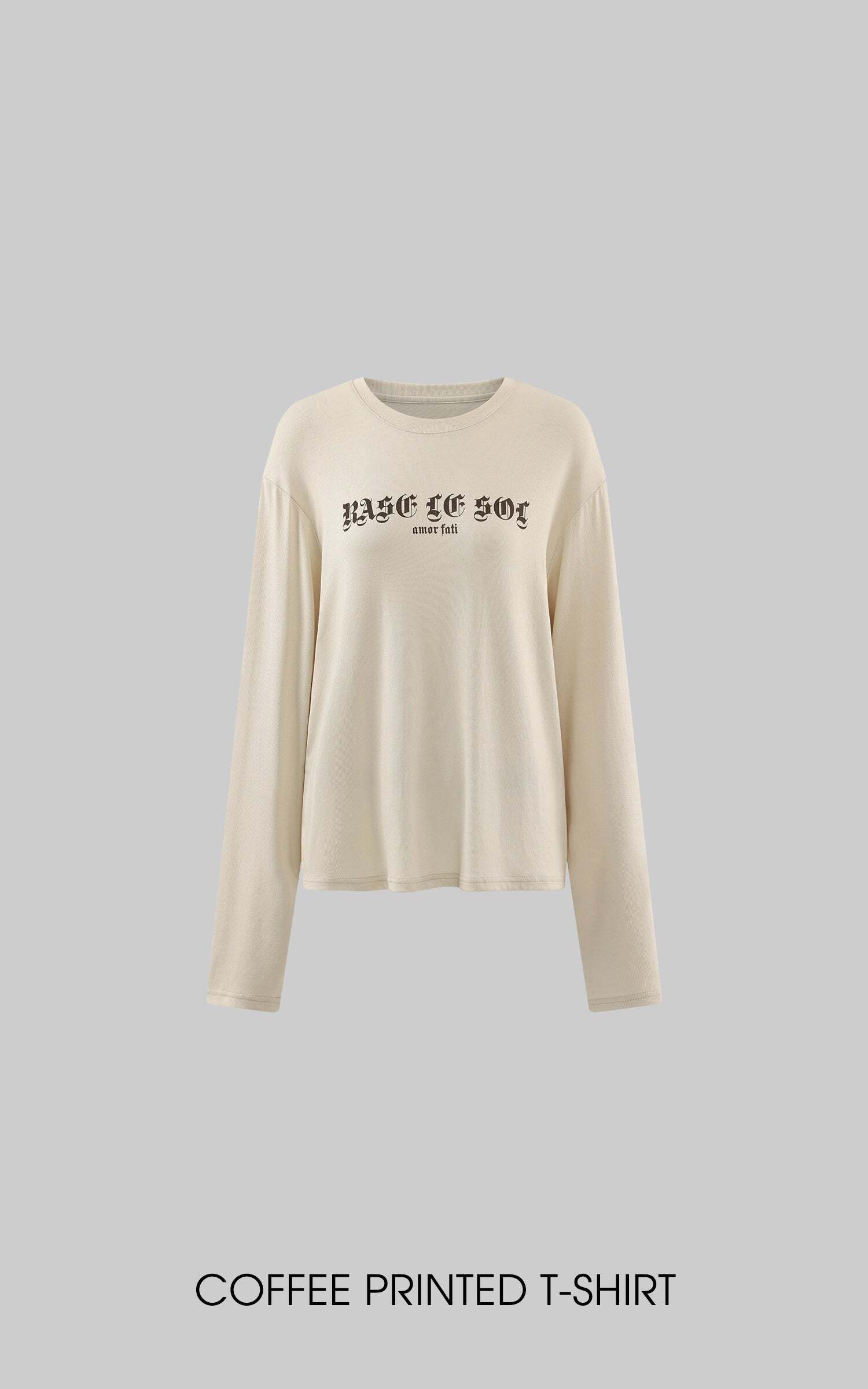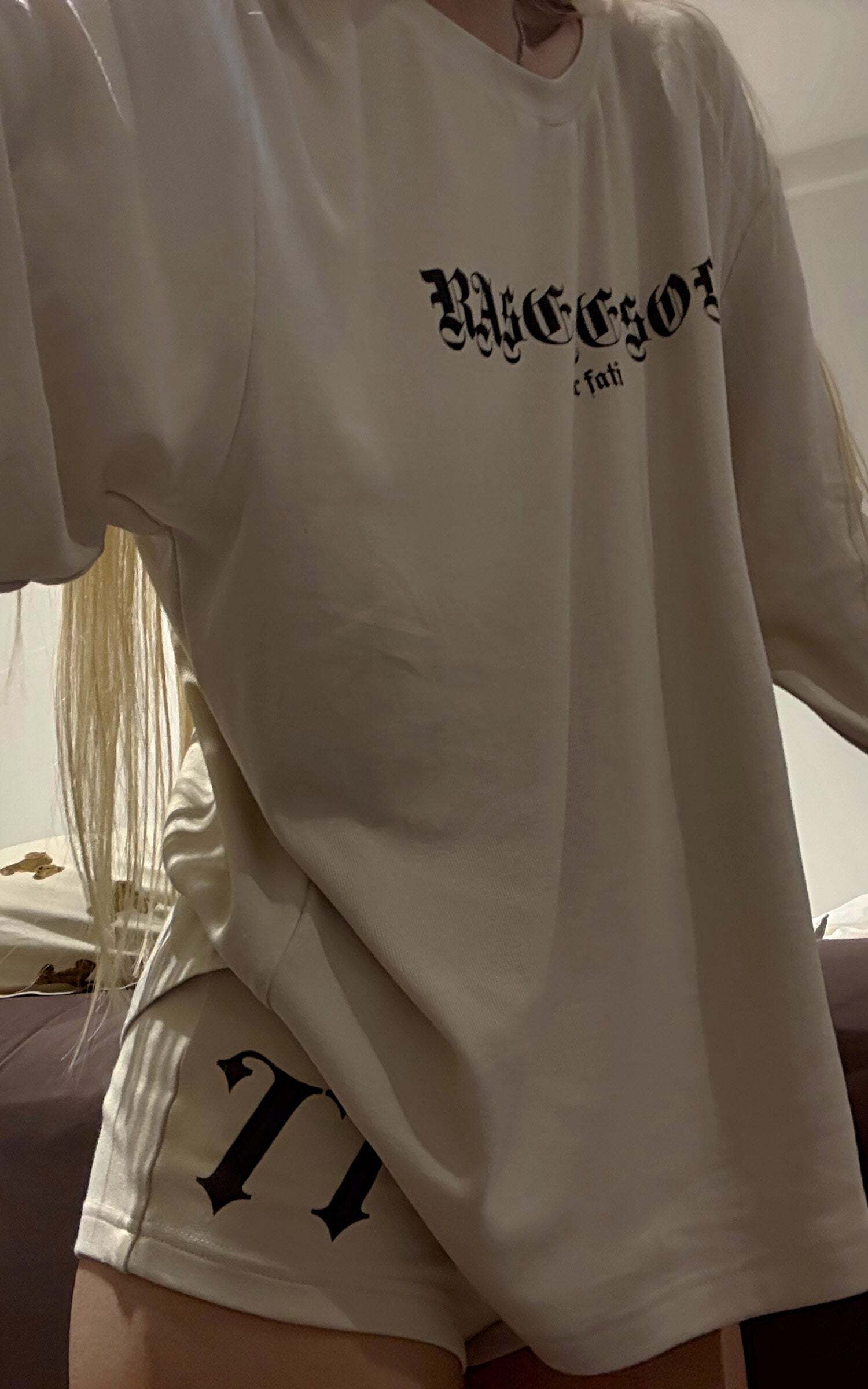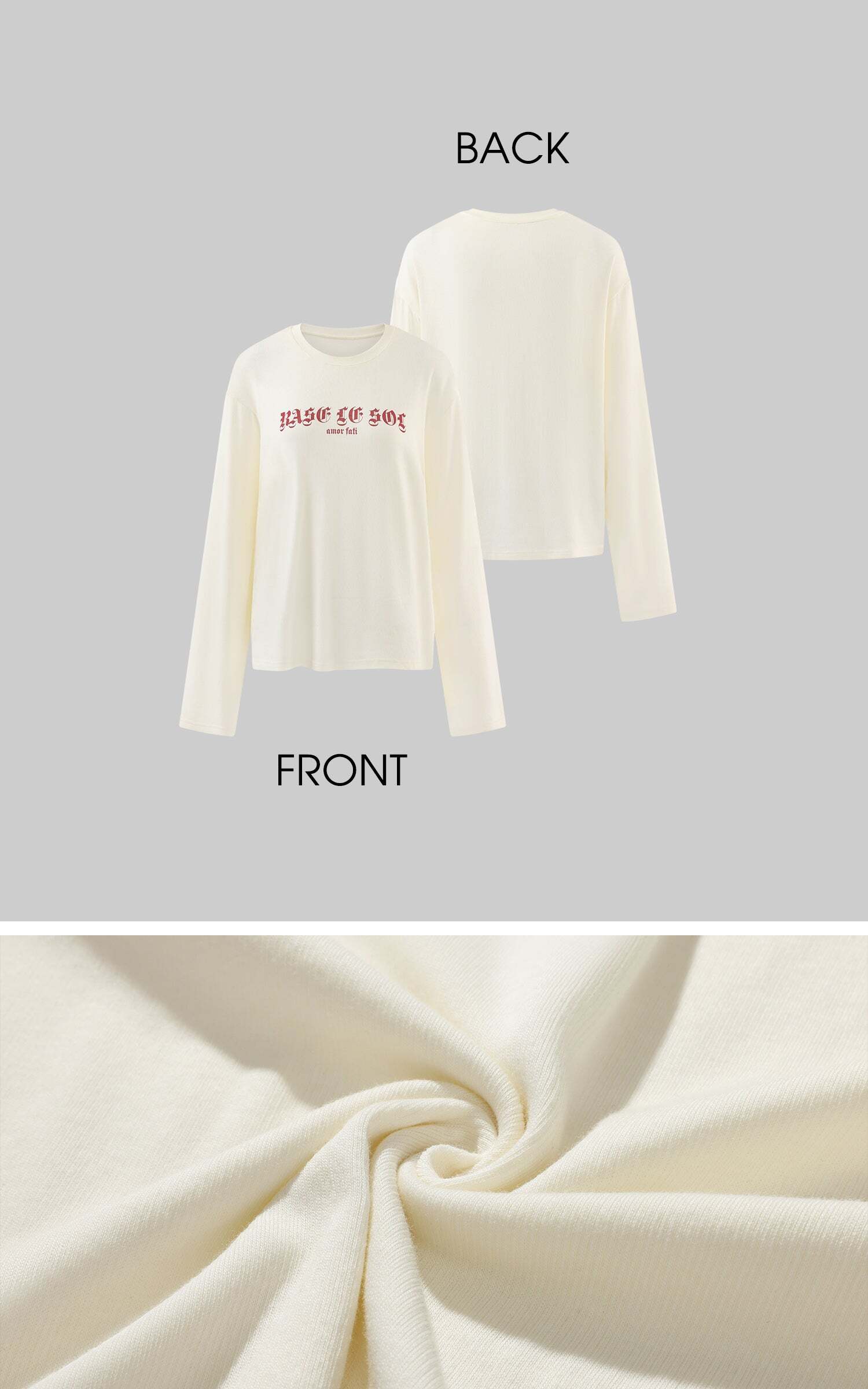A soft long-sleeve tee with a loose silhouette and bold gothic lettering across the chest adds a hint of darkness to a relaxed mood. Paired with high-stretch knit shorts that contour the leg with subtle sensuality. The low-saturation tones and understated design evoke a quiet, solitary confidence. Wear as a set or separate for a layered, composed expression.