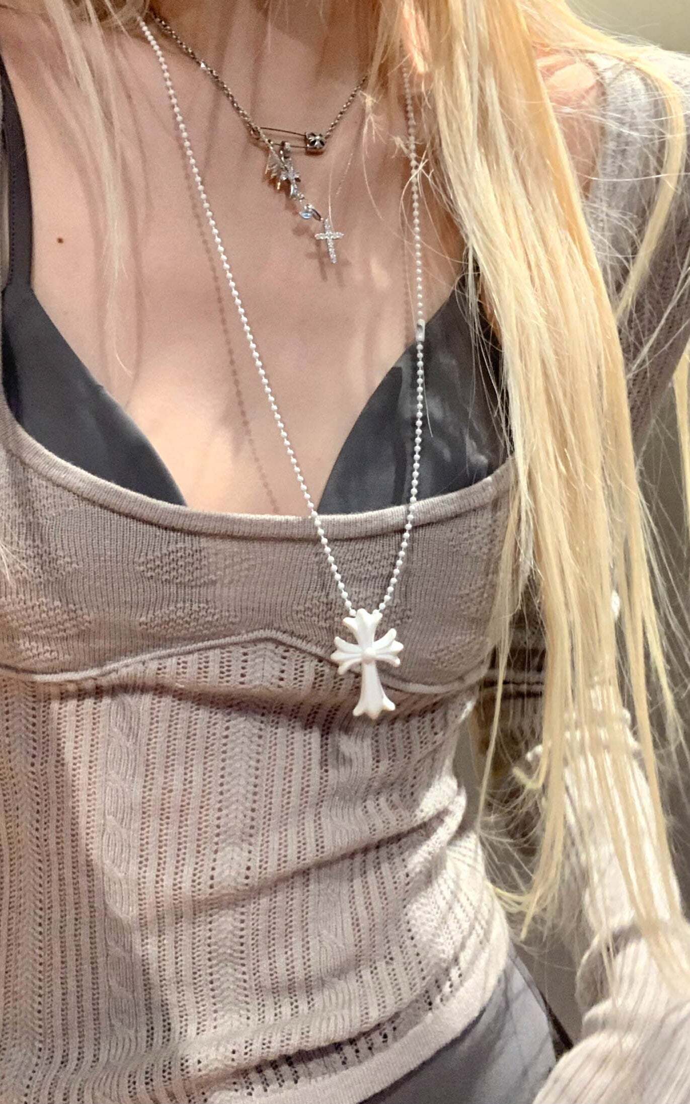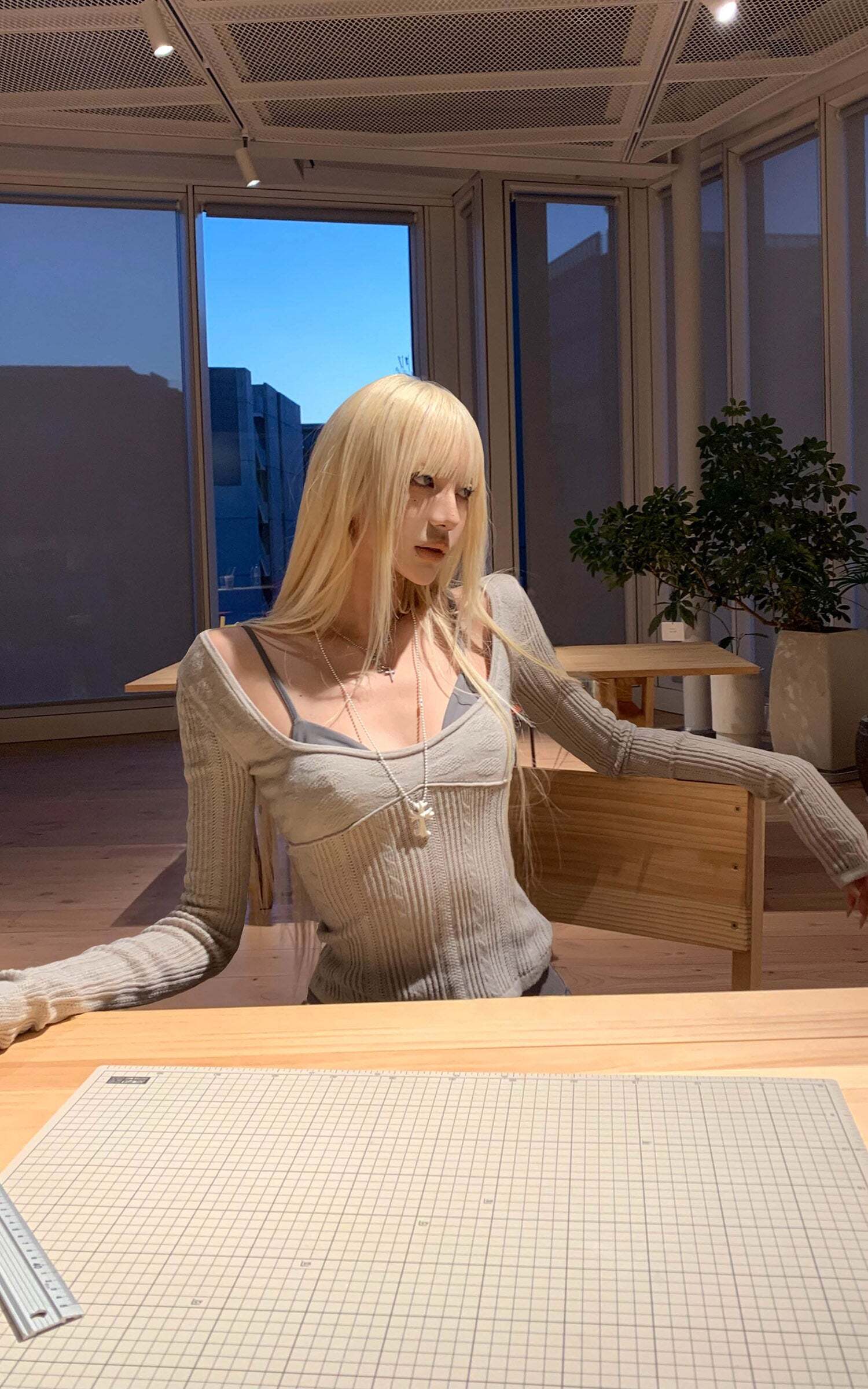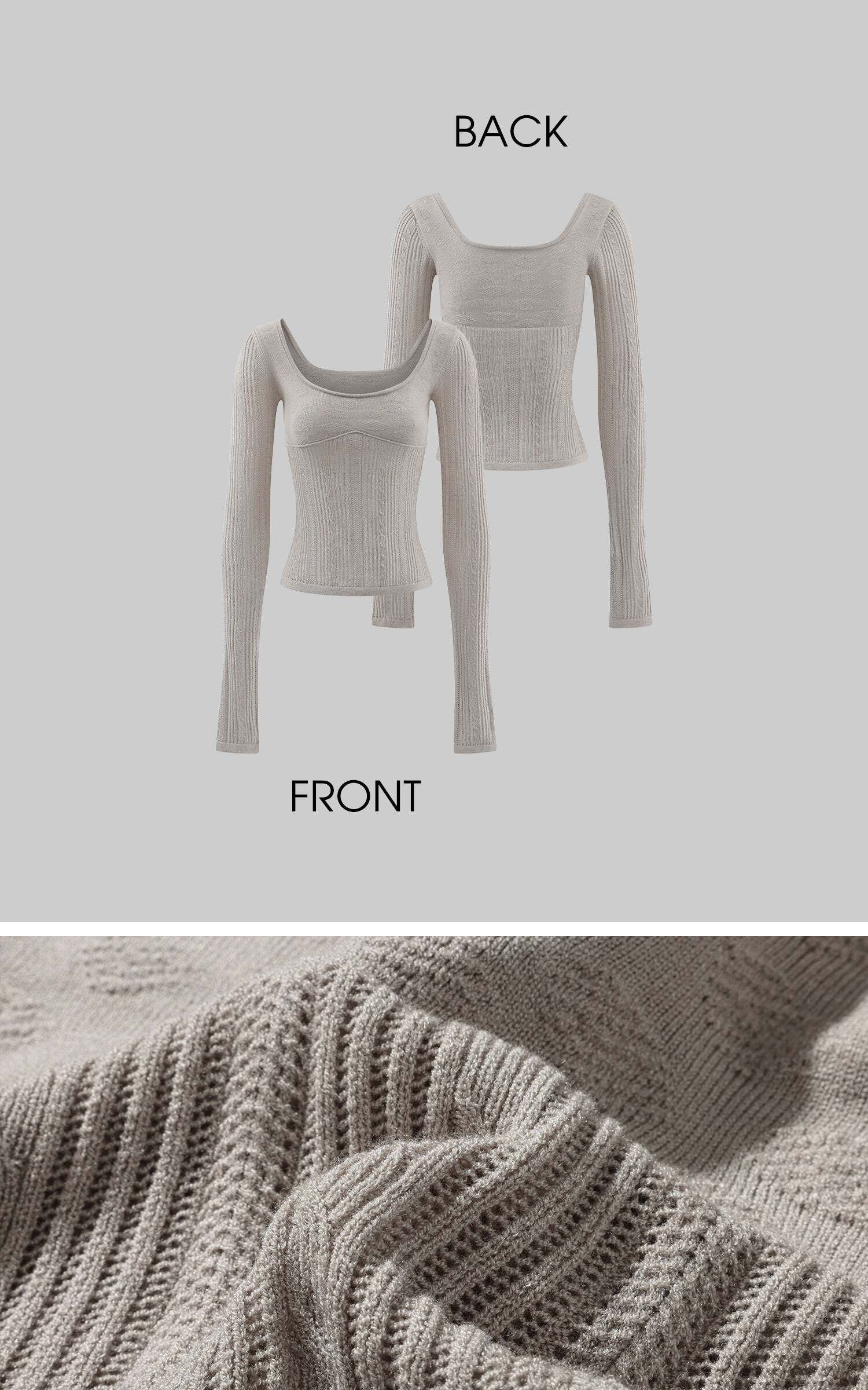 A dialogue of restraint and intensity—this set pairs a finely ribbed knit top with a minimalist triangle bra. The knit reveals subtle transparency through its patterned textures, clinging close yet allowing space to breathe. A square neckline frames the collarbone, while elongated sleeves extend with a sense of detachment. The inner bra, sharp in tone, cuts against the knit surface to create layered contrast and quiet tension. Together, the pieces evoke a sense of shadow-like presence—silent, austere, and unforgettable.
