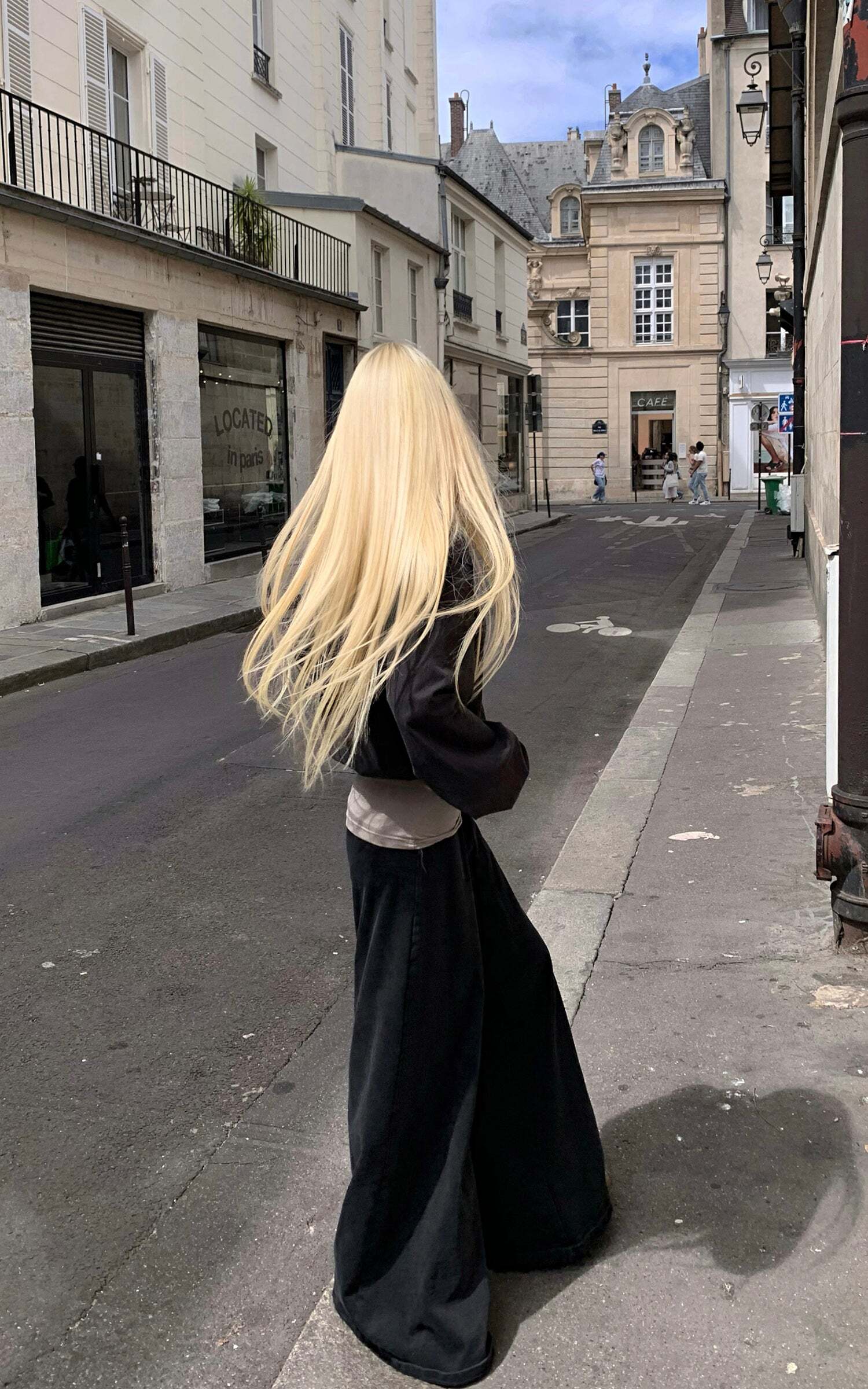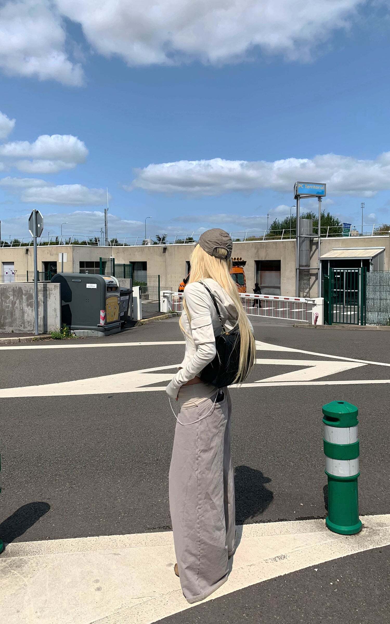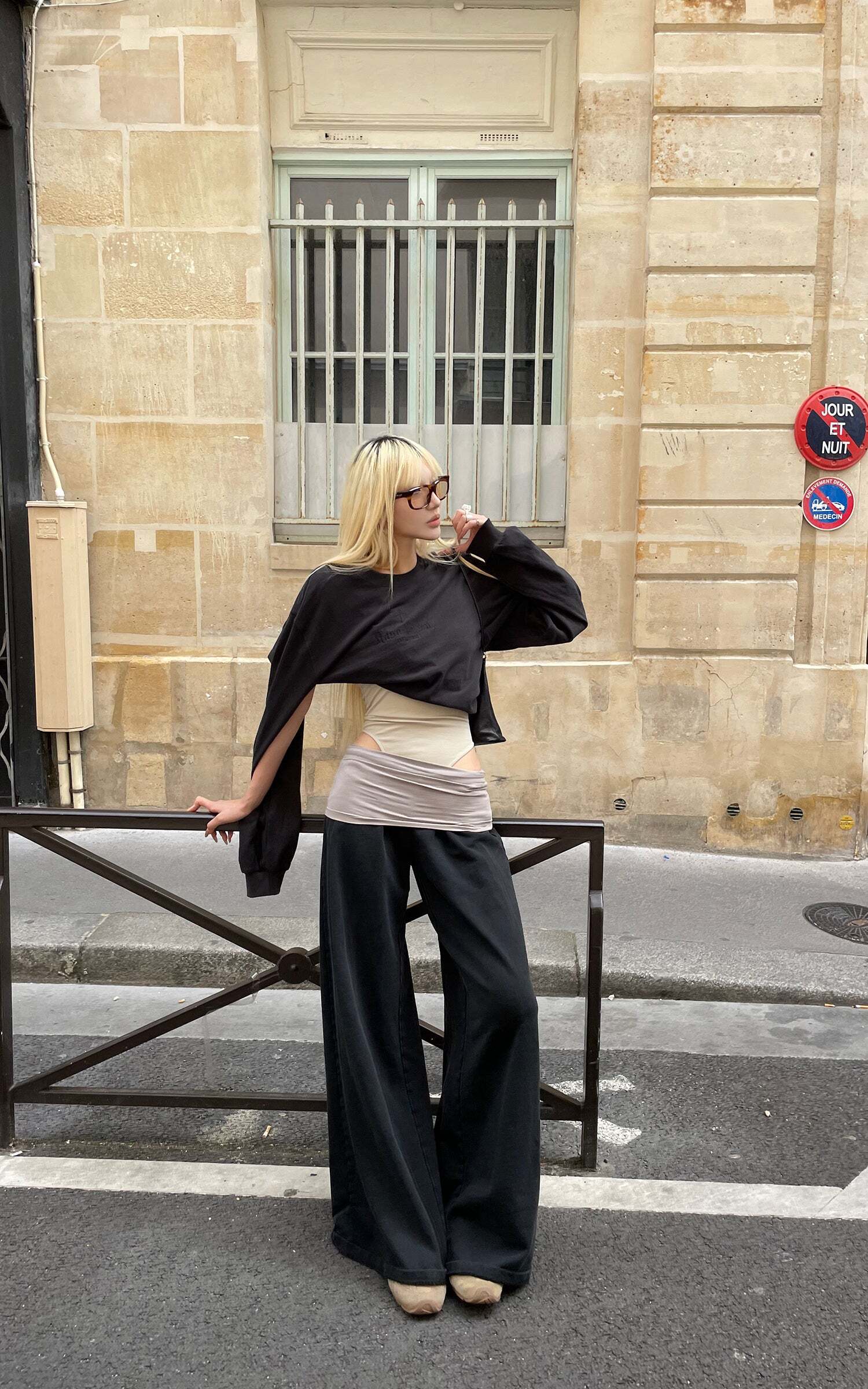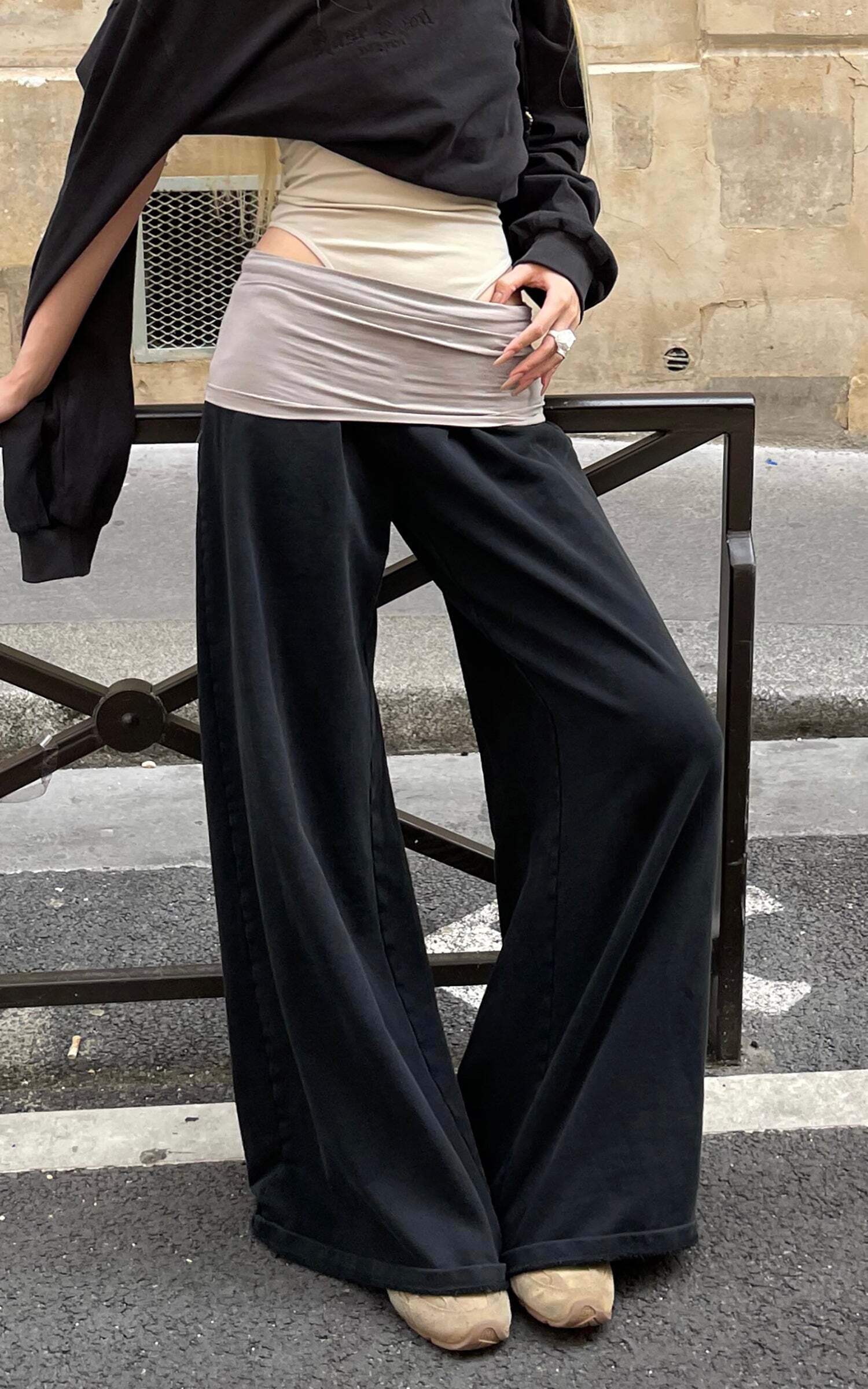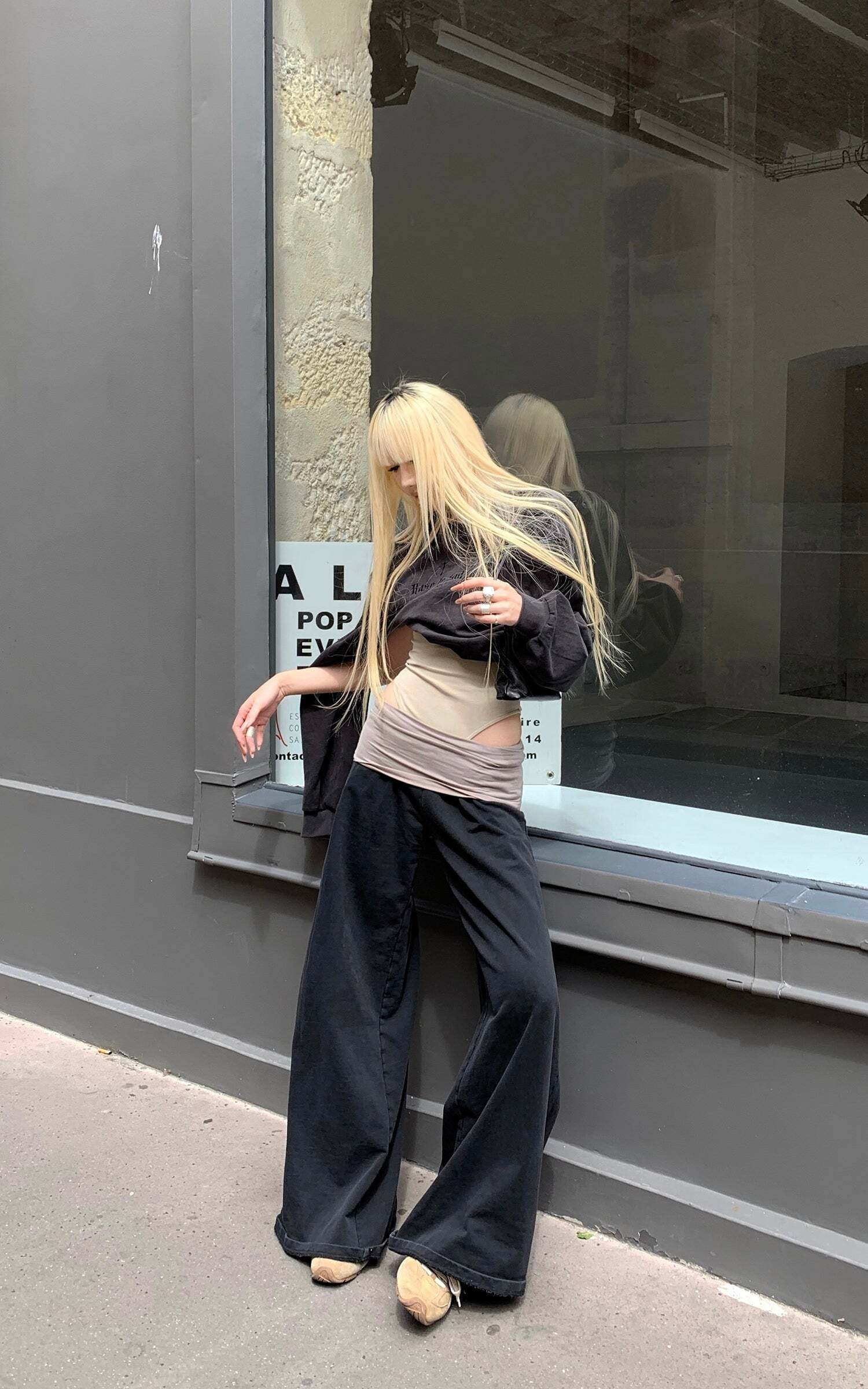 A pair of wide-leg pants with a sculptural presence. The layered waistband creates a subtle contrast, breathing with the movement of the body. Relaxed volume flows with each step, framing rhythm and ease. Worn alone or paired with sheer shirts and fitted tops, it conveys a restrained yet liberated tension.