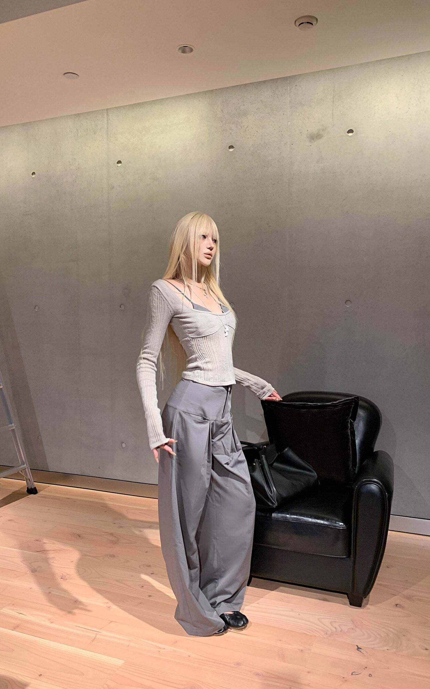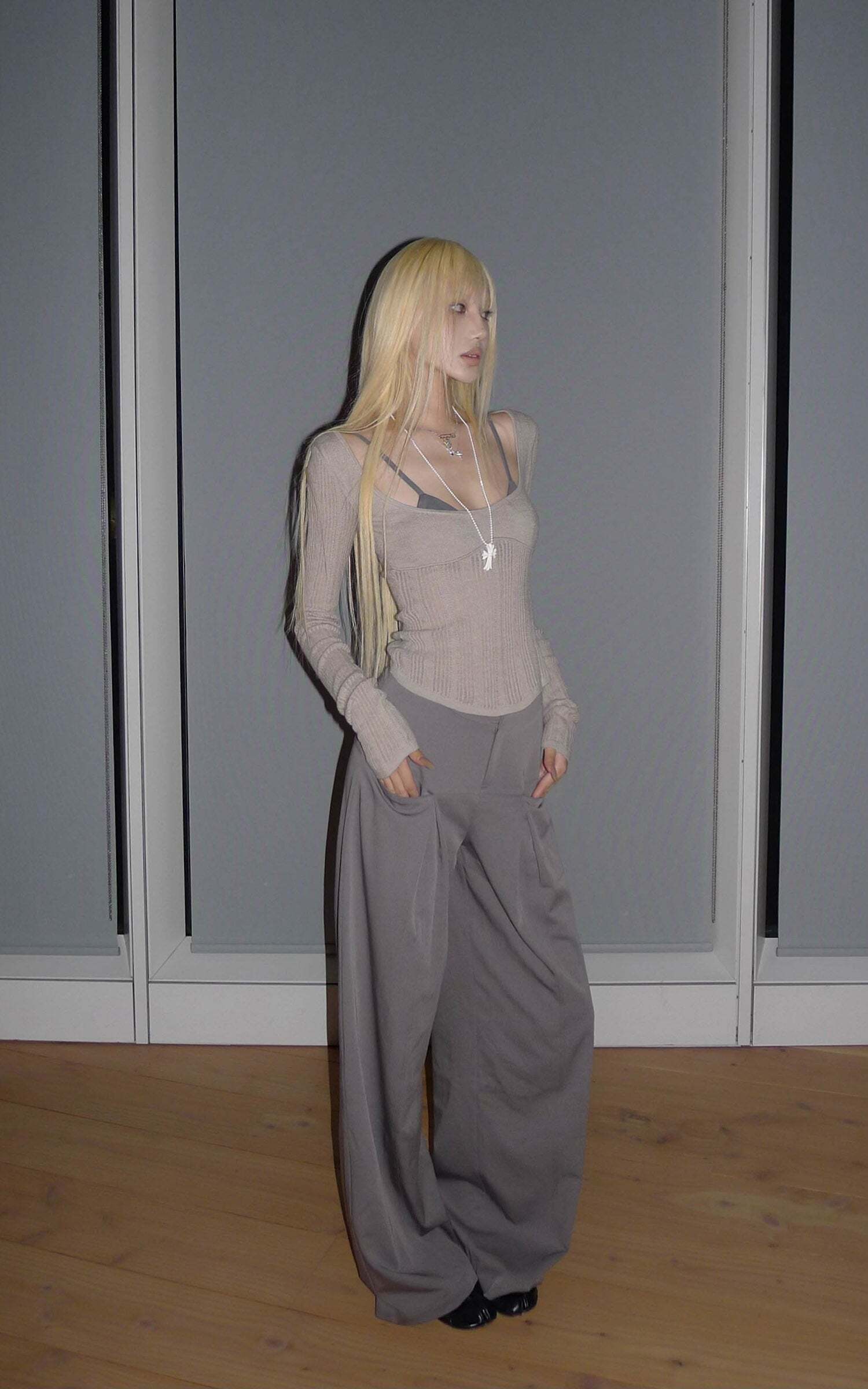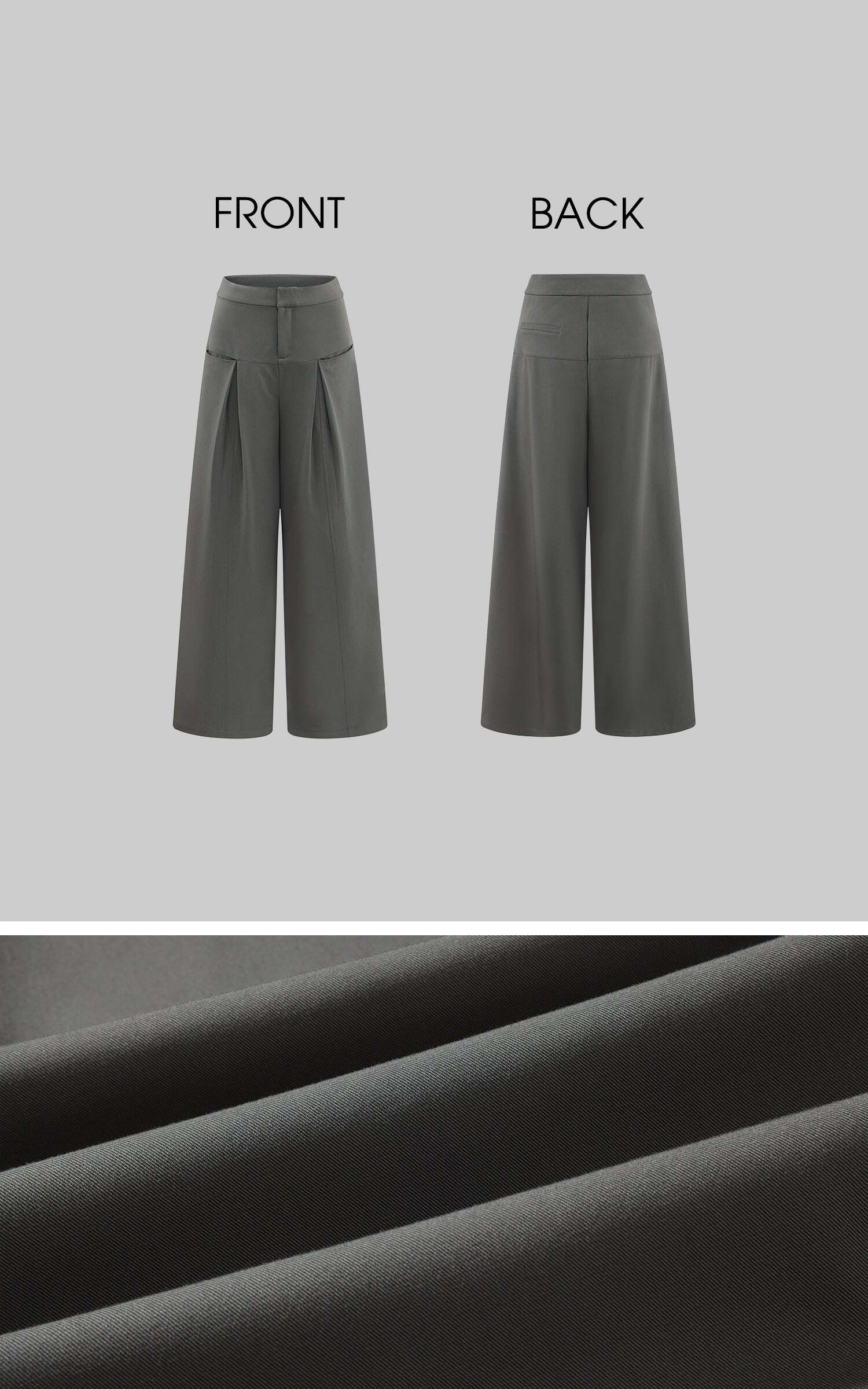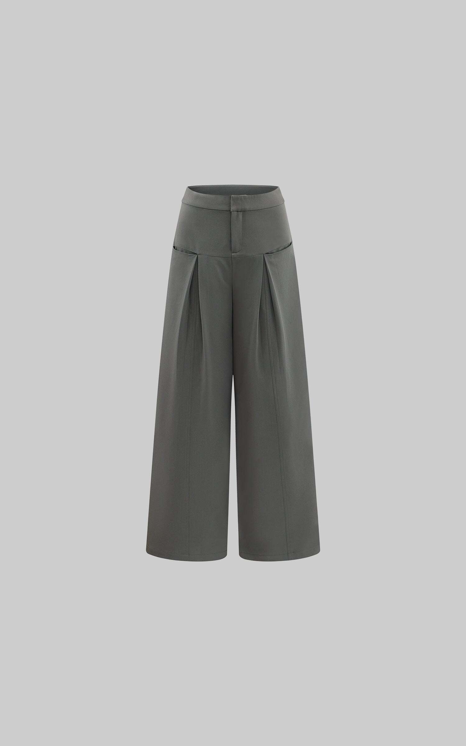 Lines extend through the silhouette, pleats layering at the waist to form sculptural shadows. A structured fabric contrasts with the relaxed, floor-grazing cut, giving both freedom and tension to the body. The wide legs move with restraint, carrying a sense of architectural order. It exists at the threshold of everyday and stance—casual yet sharpened with poise.