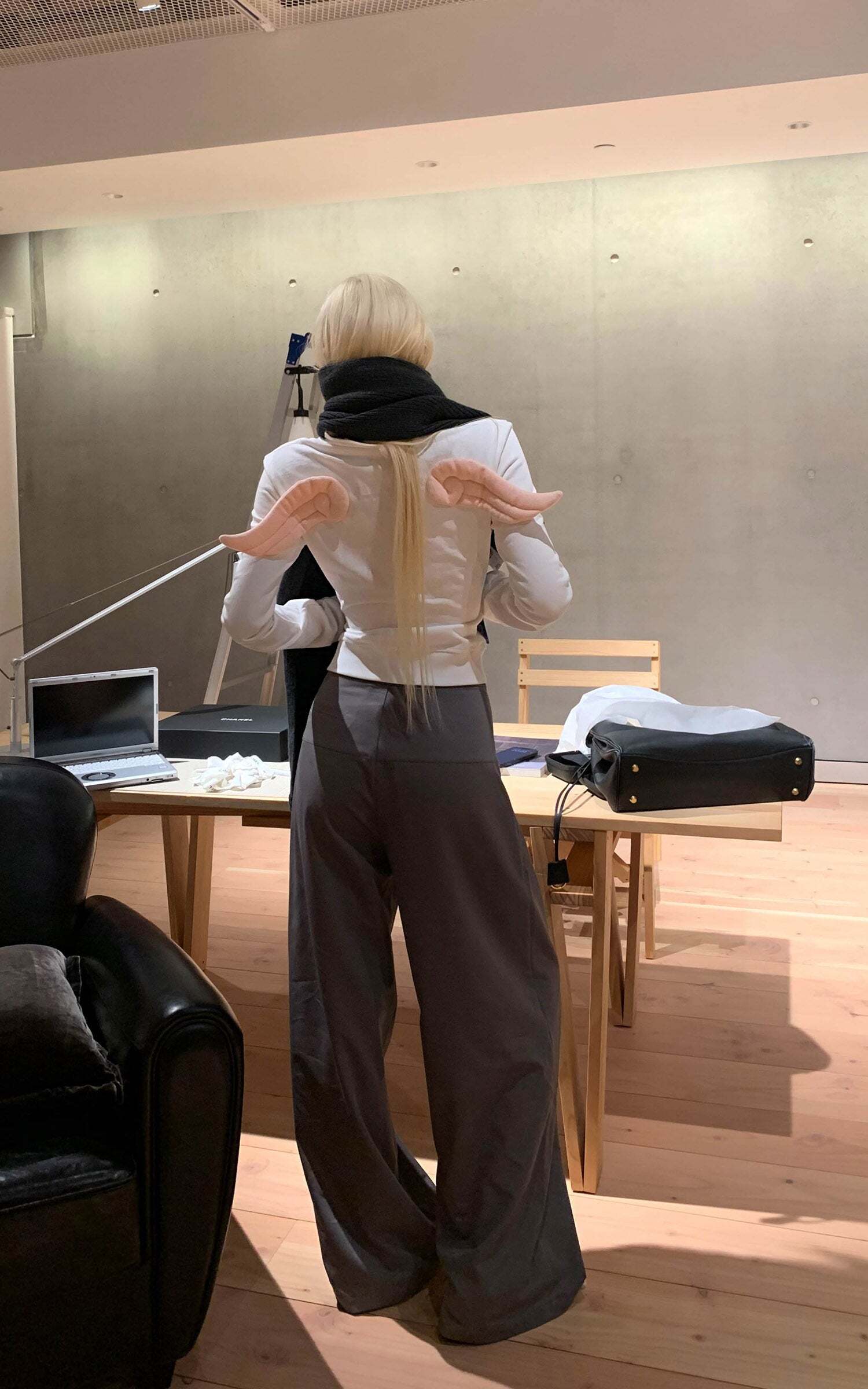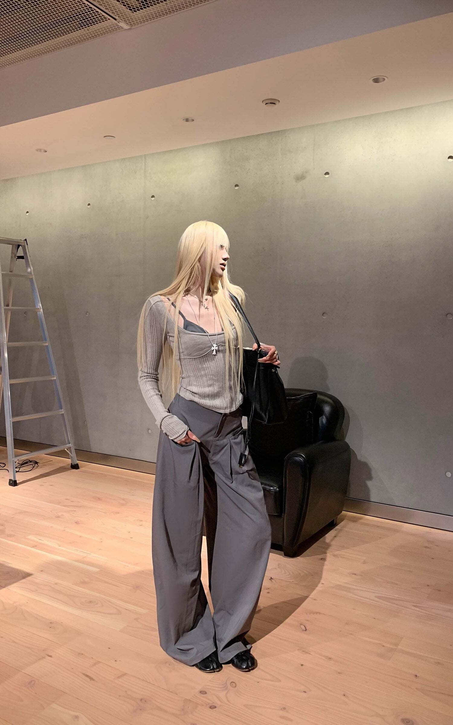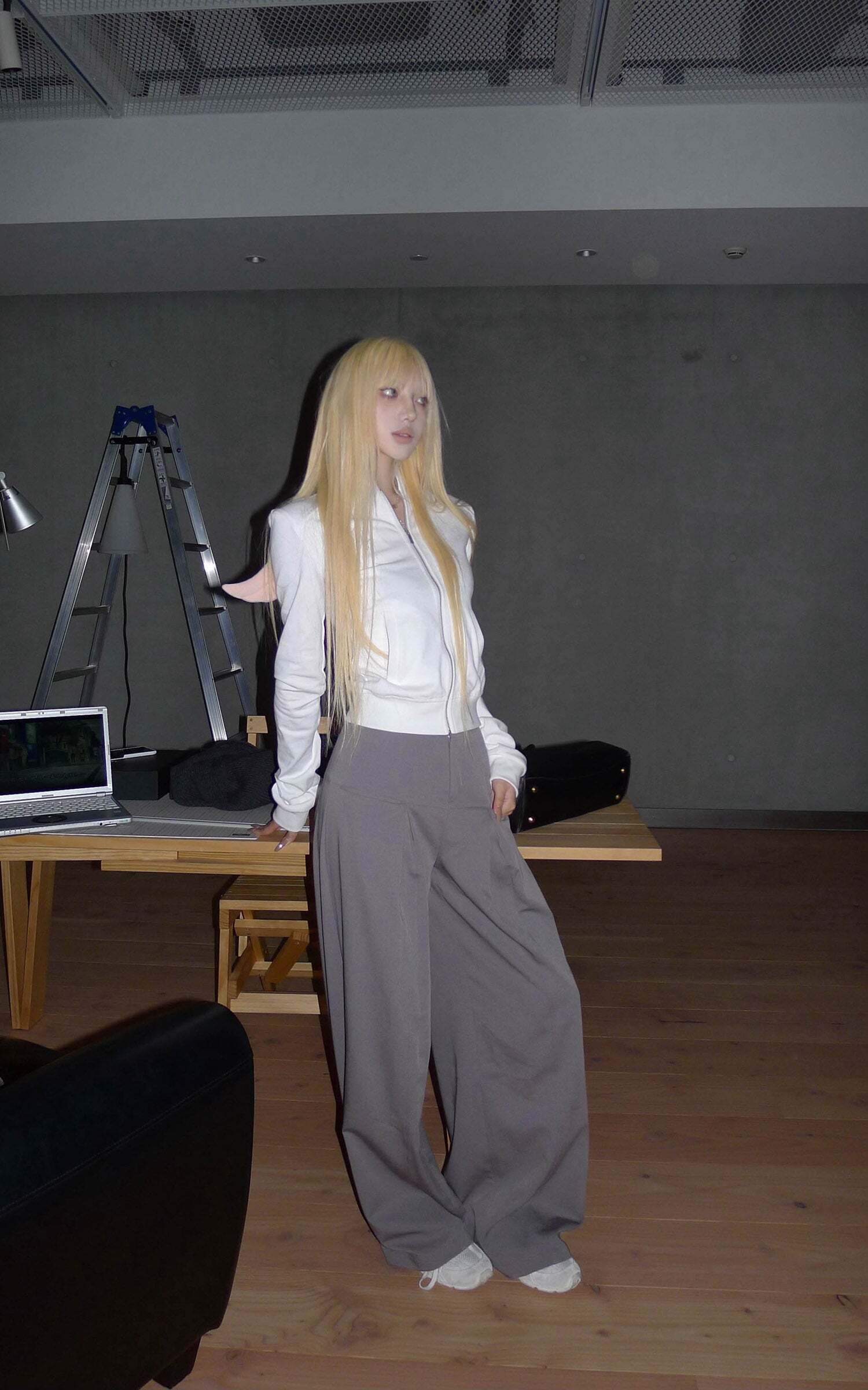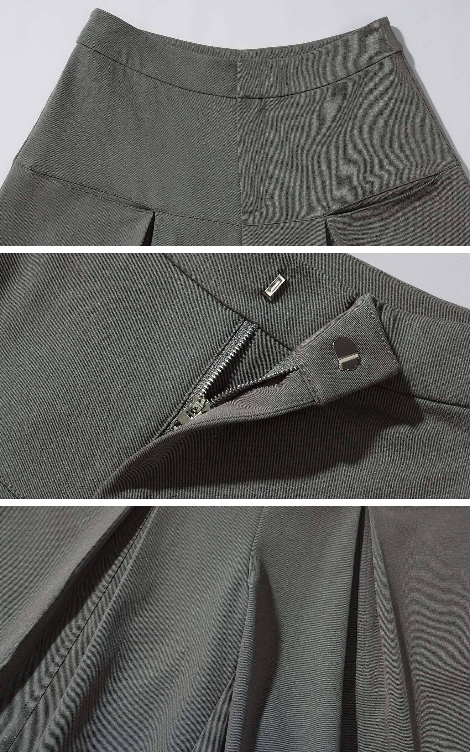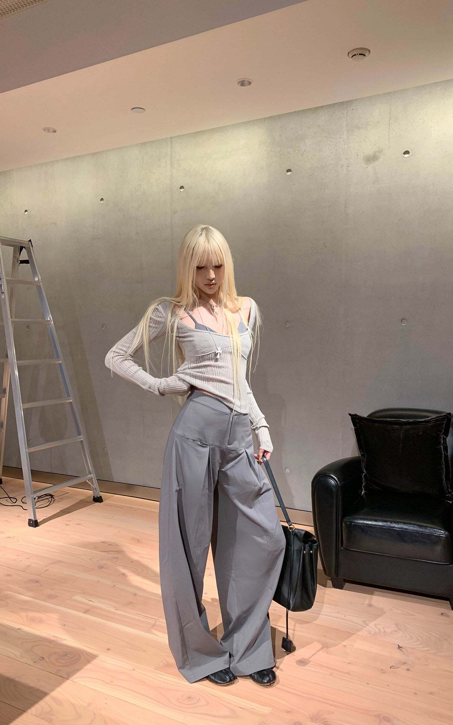 Lines extend through the silhouette, pleats layering at the waist to form sculptural shadows. A structured fabric contrasts with the relaxed, floor-grazing cut, giving both freedom and tension to the body. The wide legs move with restraint, carrying a sense of architectural order. It exists at the threshold of everyday and stance—casual yet sharpened with poise.