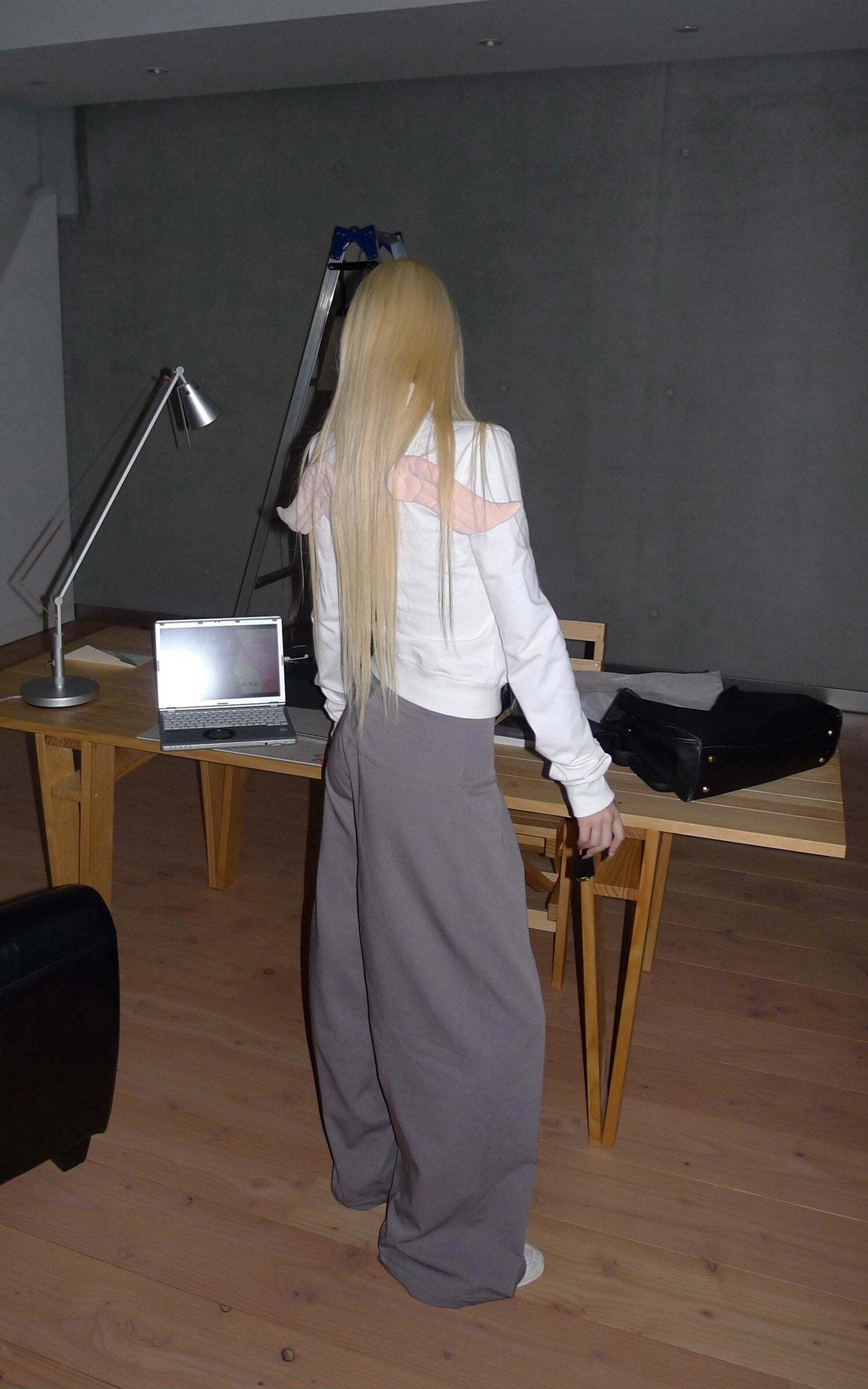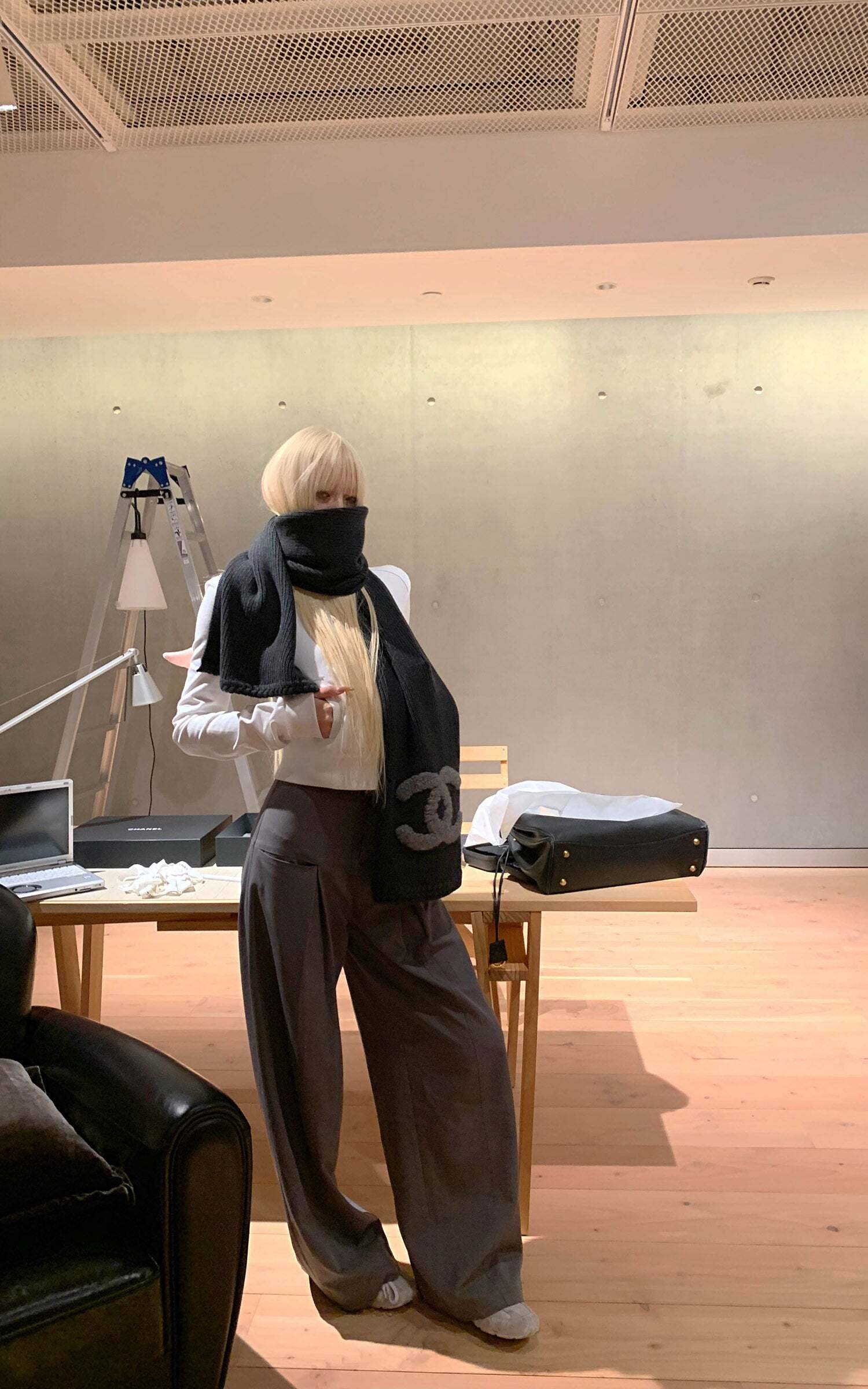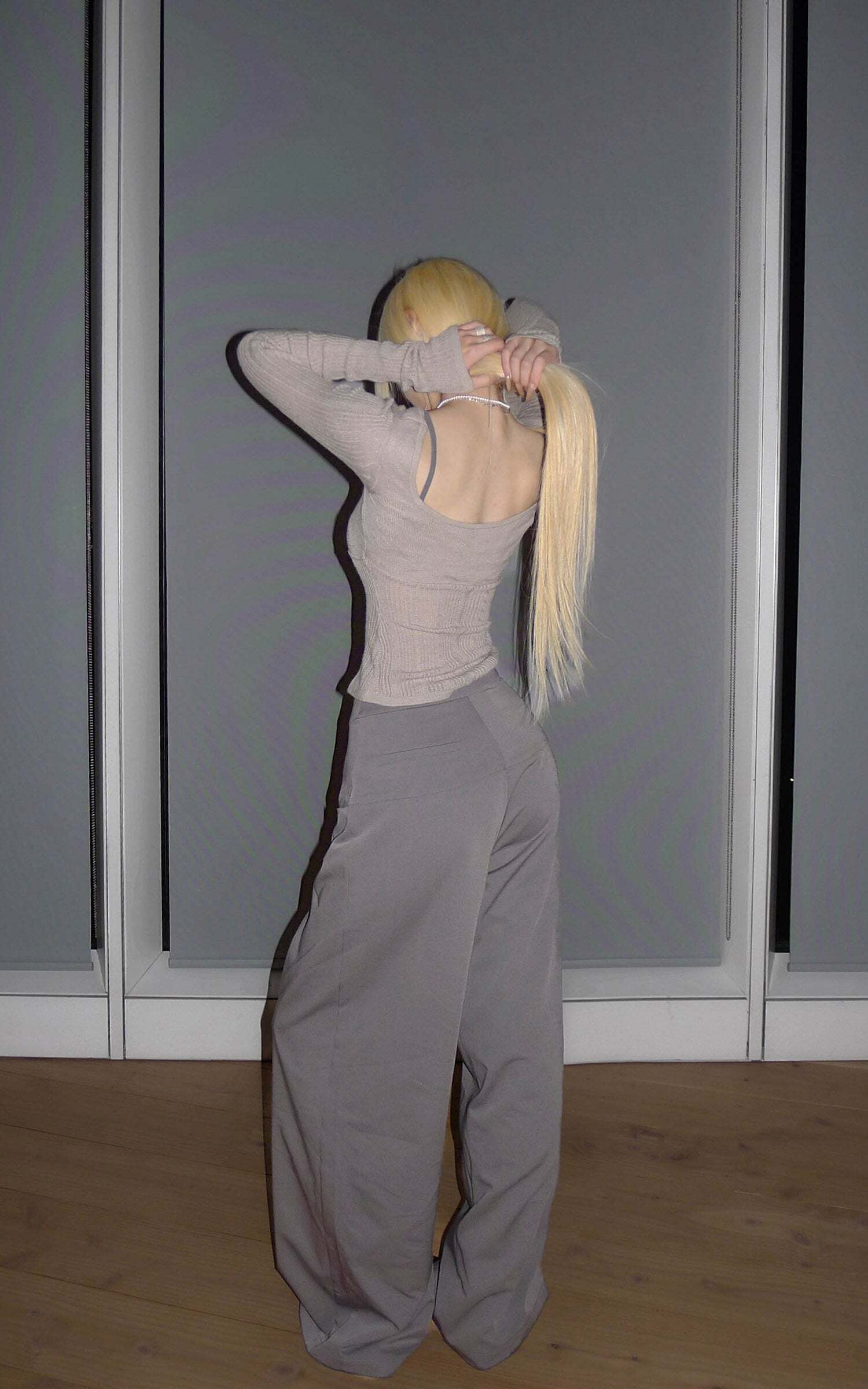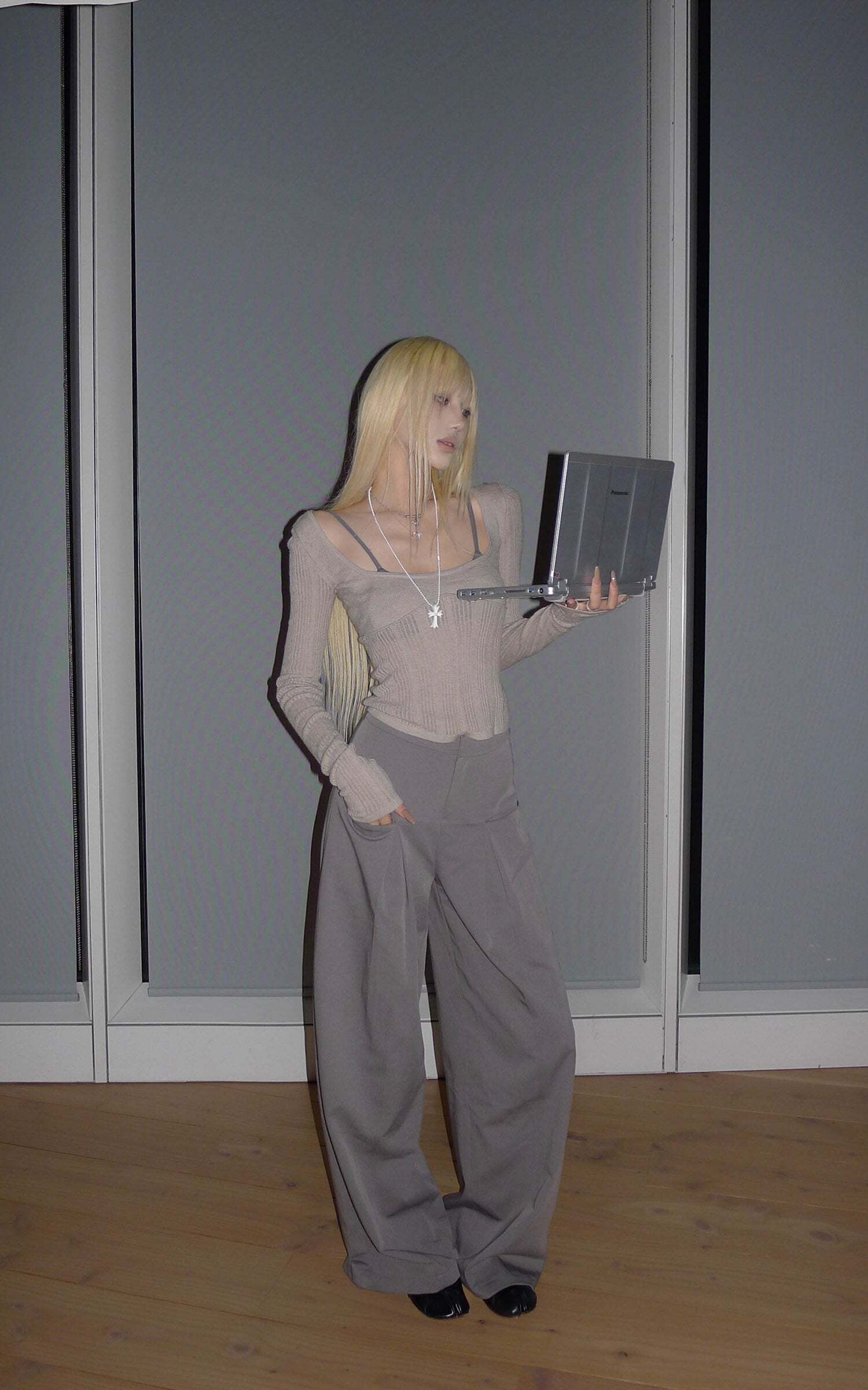 Lines extend through the silhouette, pleats layering at the waist to form sculptural shadows. A structured fabric contrasts with the relaxed, floor-grazing cut, giving both freedom and tension to the body. The wide legs move with restraint, carrying a sense of architectural order. It exists at the threshold of everyday and stance—casual yet sharpened with poise.