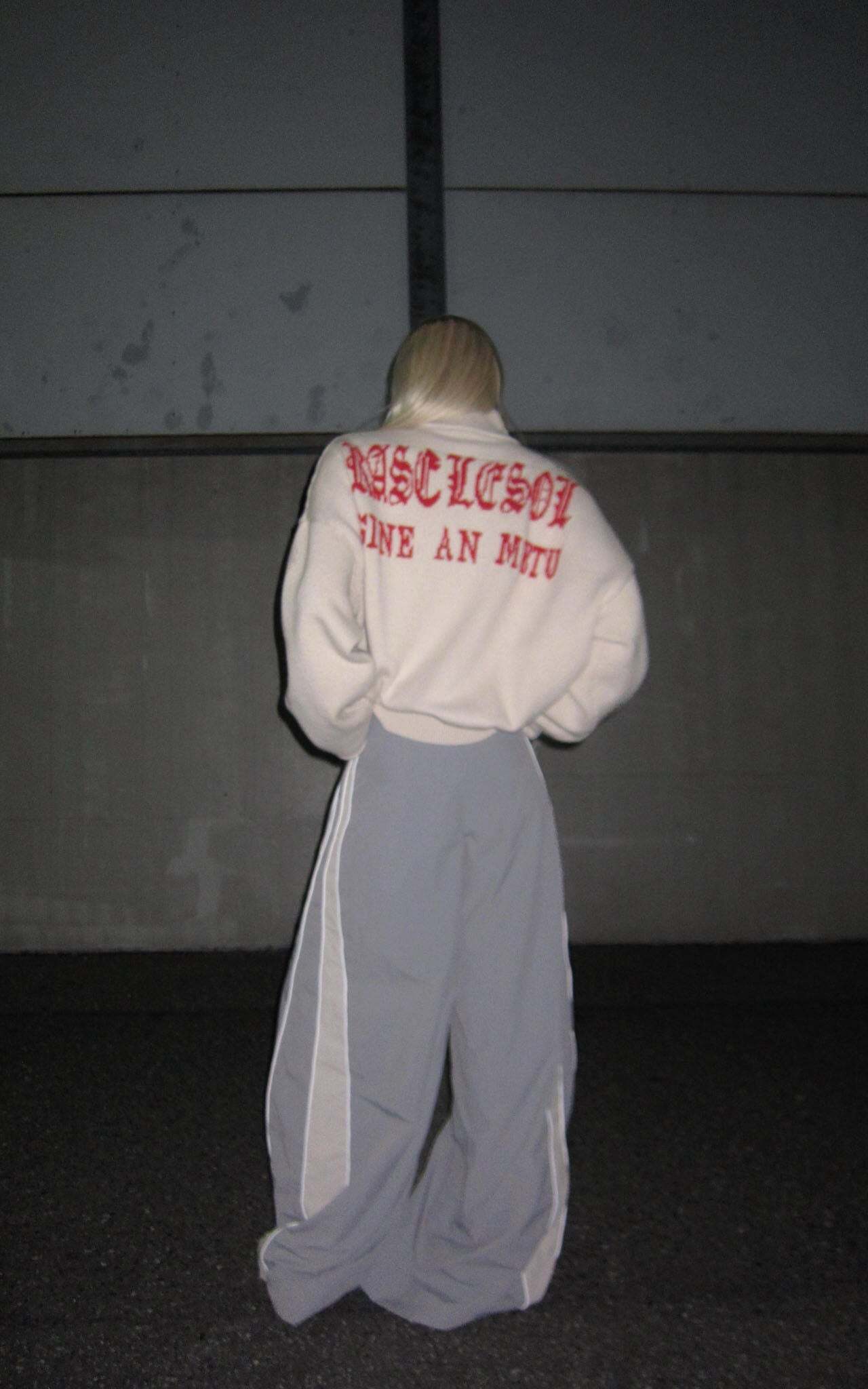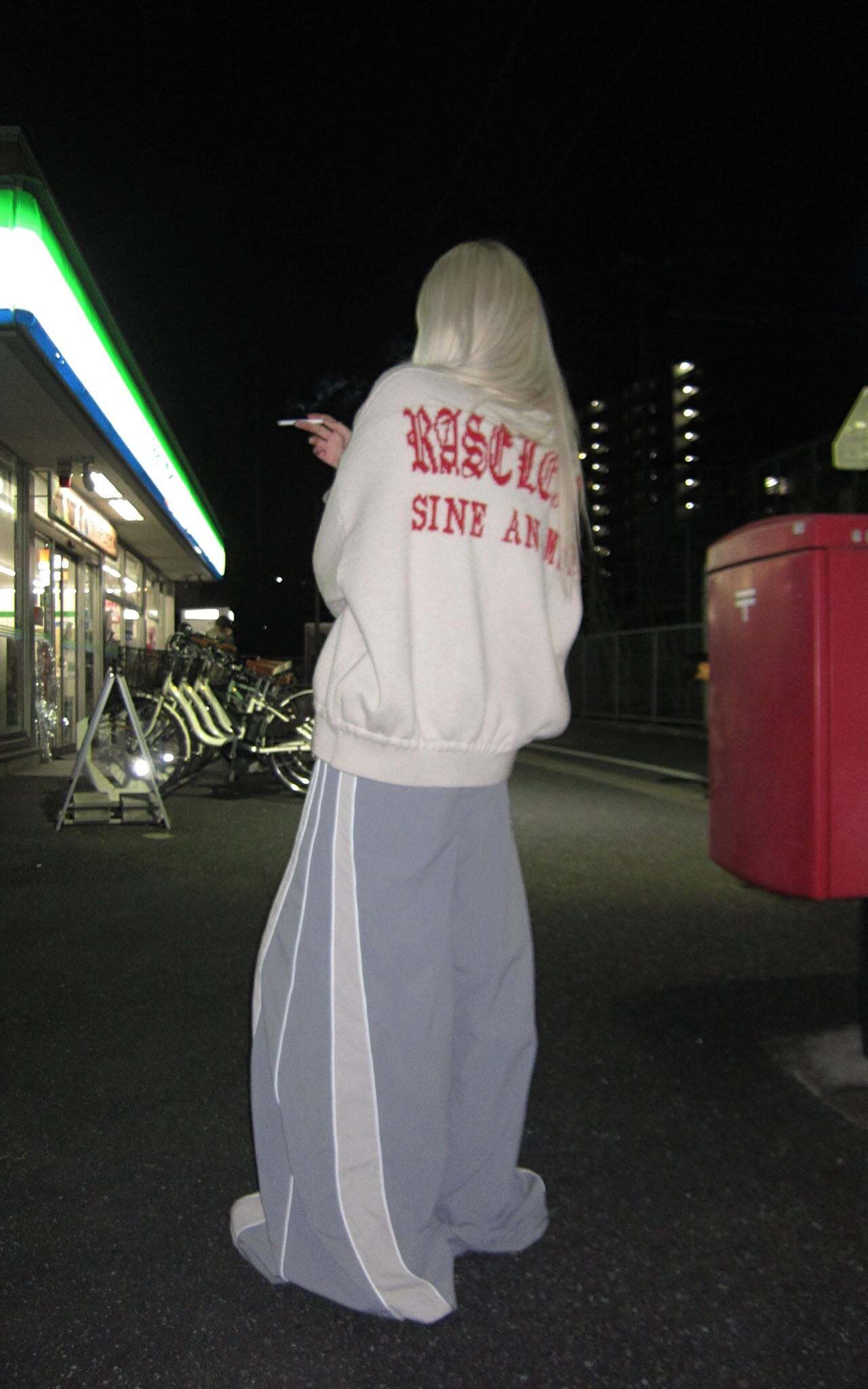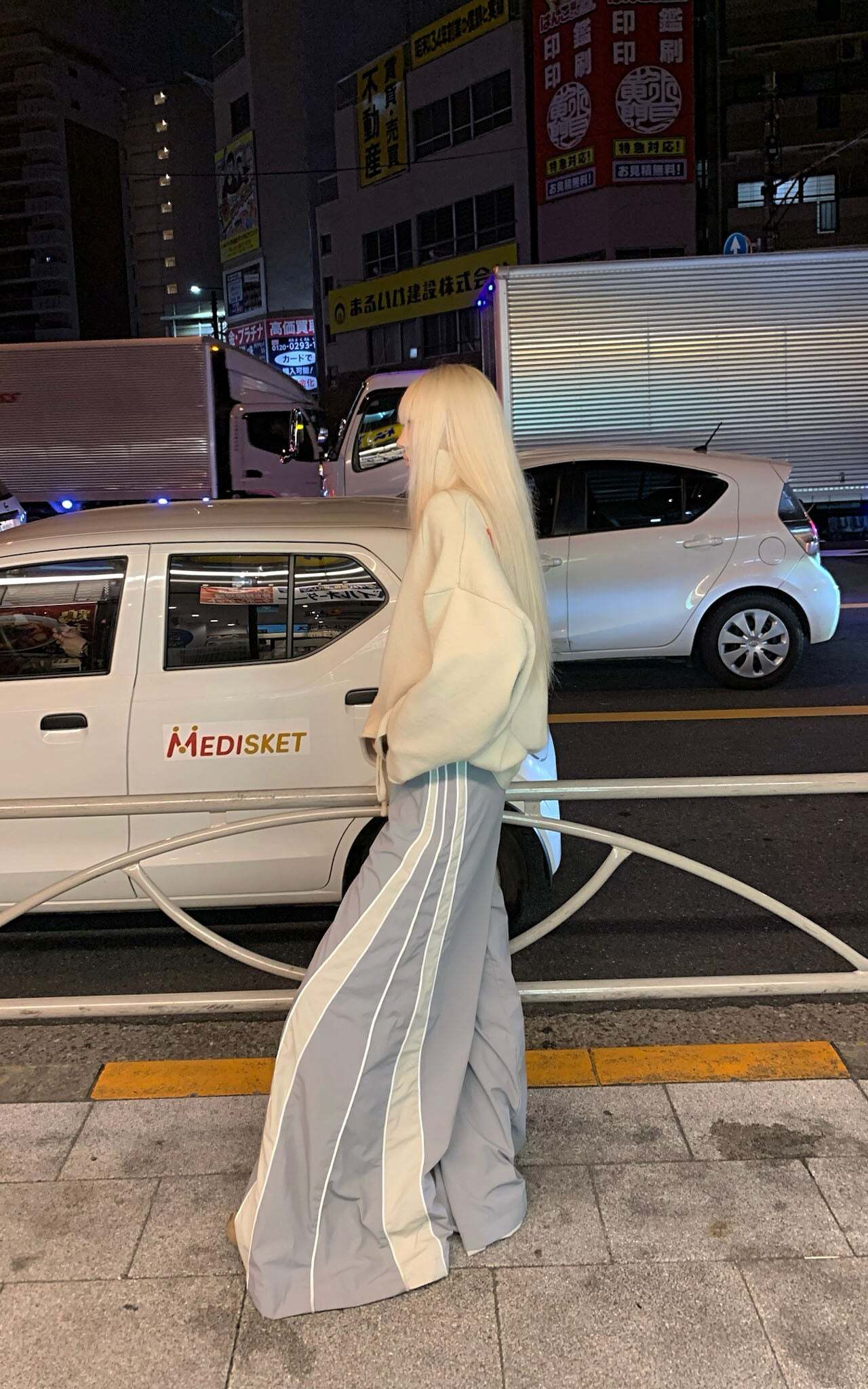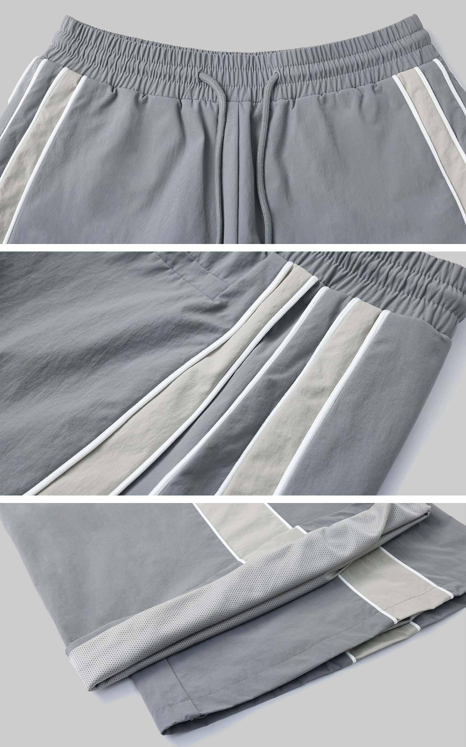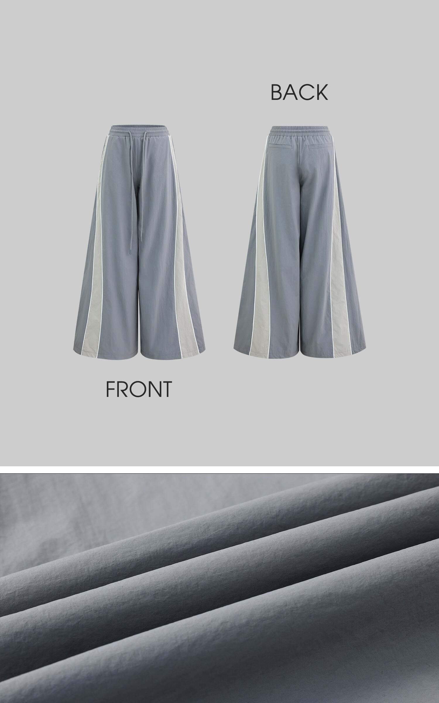 These high-waisted wide-leg pants are crafted from soft, lightweight fabric and feature sleek lines that embody a modern fusion of minimalism and boldness. Colorblock detailing runs along the sides, adding dynamic movement and depth to the silhouette. The elasticated waistband with a drawstring ensures a comfortable fit for various body shapes. The exaggerated wide-leg design creates a dramatic shape that pairs effortlessly with oversized jackets or fitted tops, offering a distinct sartorial statement. This piece perfectly balances functionality and style, making it ideal for navigating urban environments.