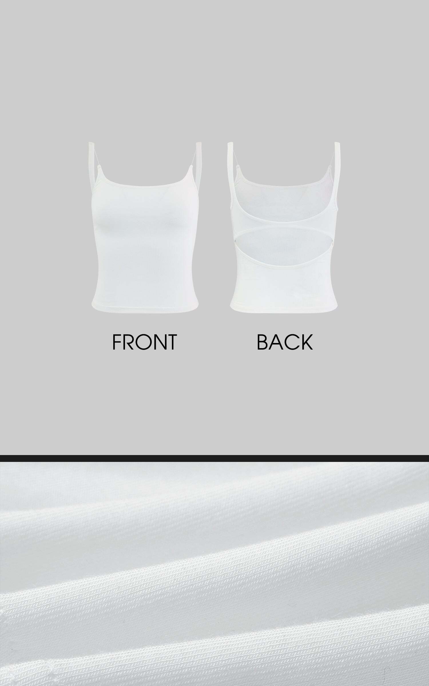 A minimalistic essential redefined with modern detailing. This white knit tank top features soft, body-skimming fabric with a touch of stretch for ultimate comfort. The front is designed with delicate invisible fishline straps, creating a barely-there look while offering subtle support. The back cut-out adds an edgy twist to the minimalist silhouette. Style it with wide-leg trousers or layer it under structured jackets for a sleek and versatile outfit.