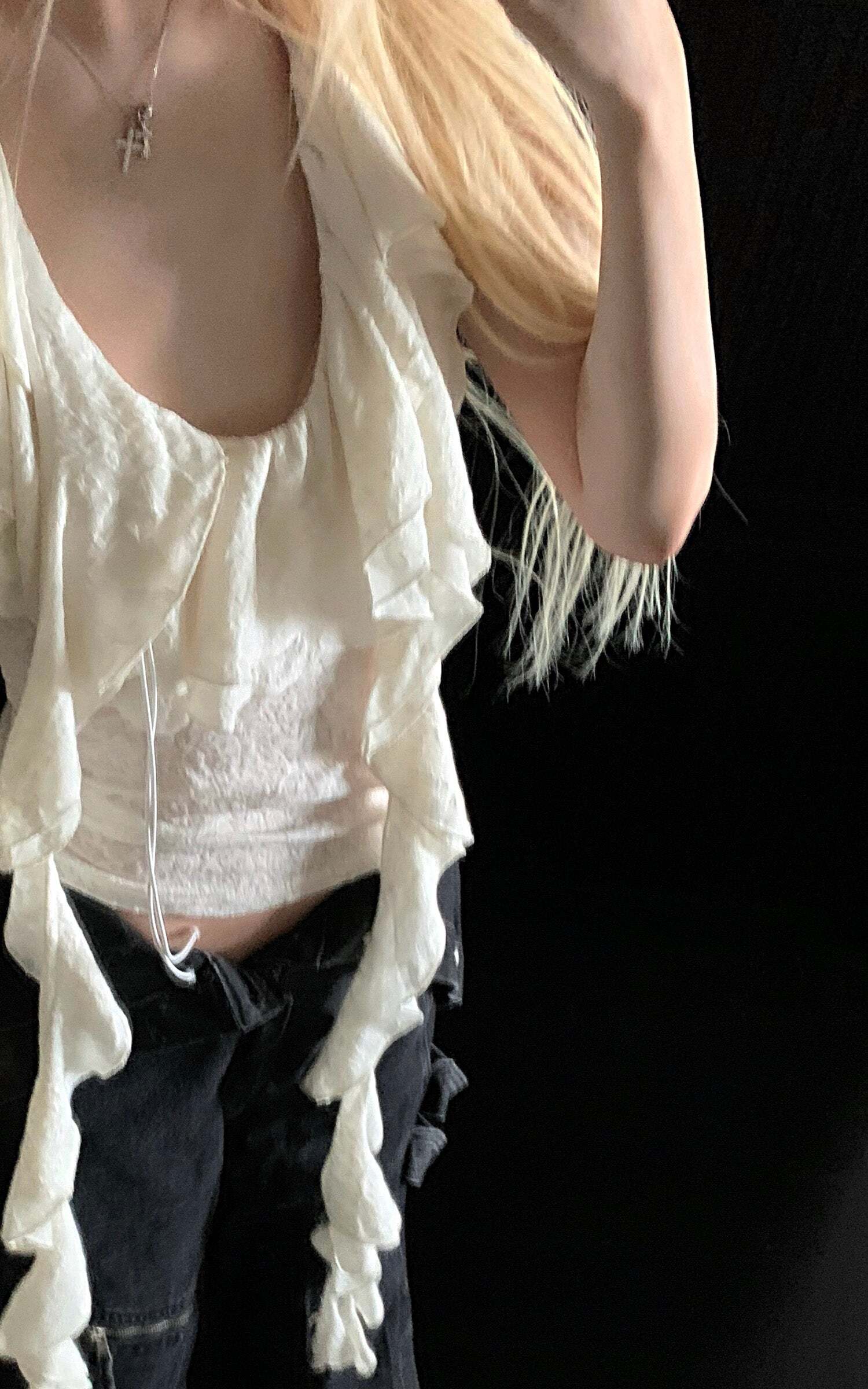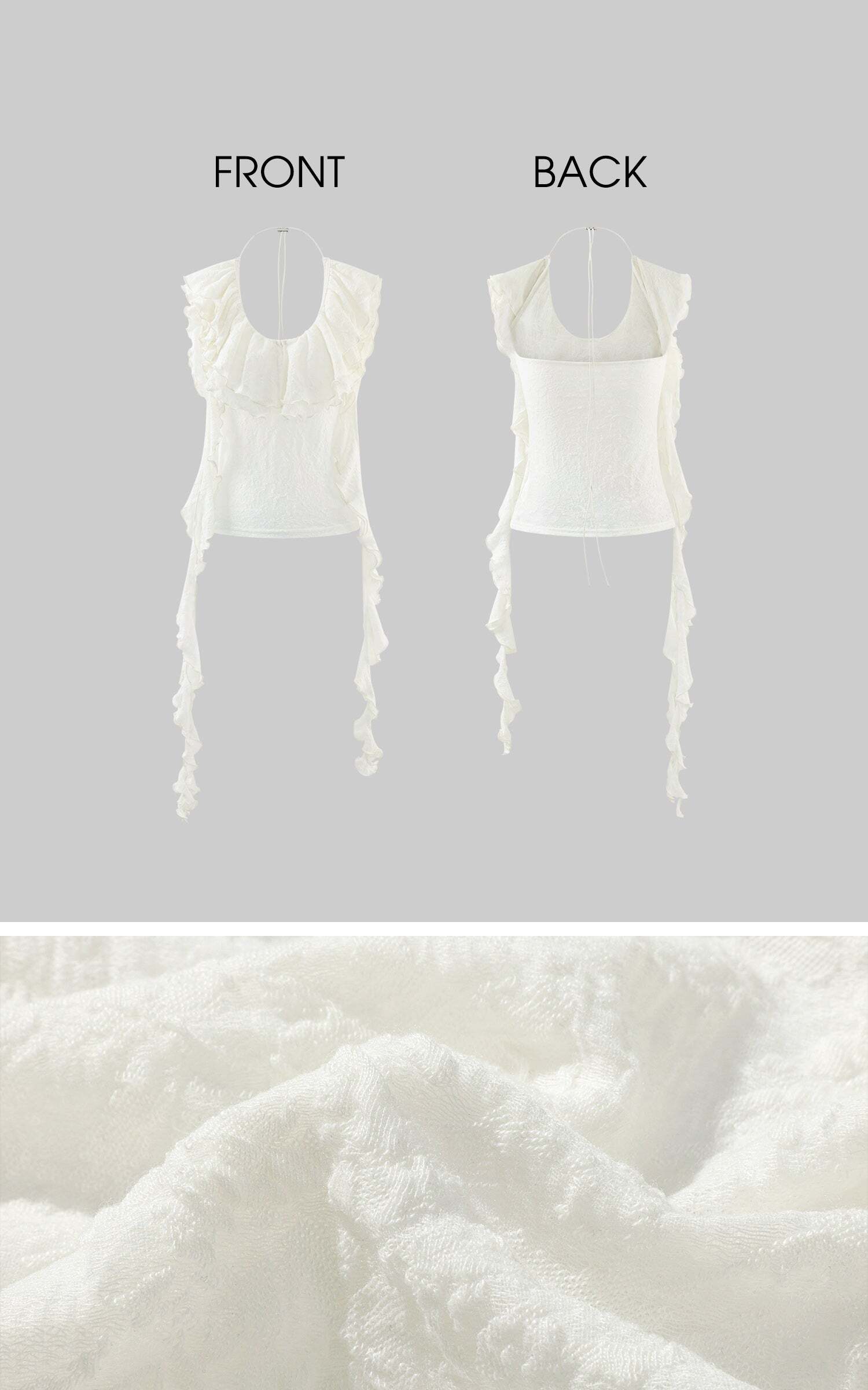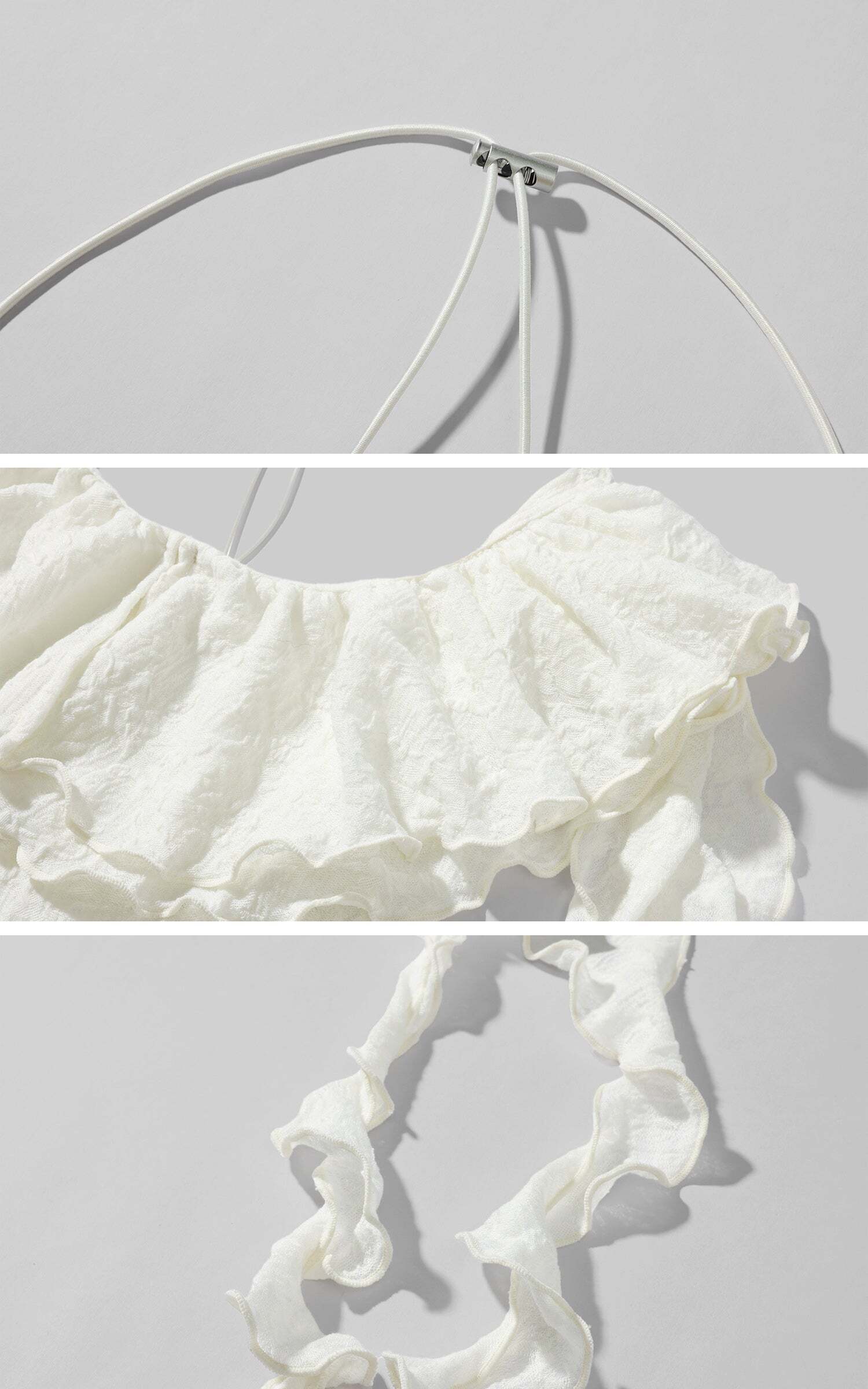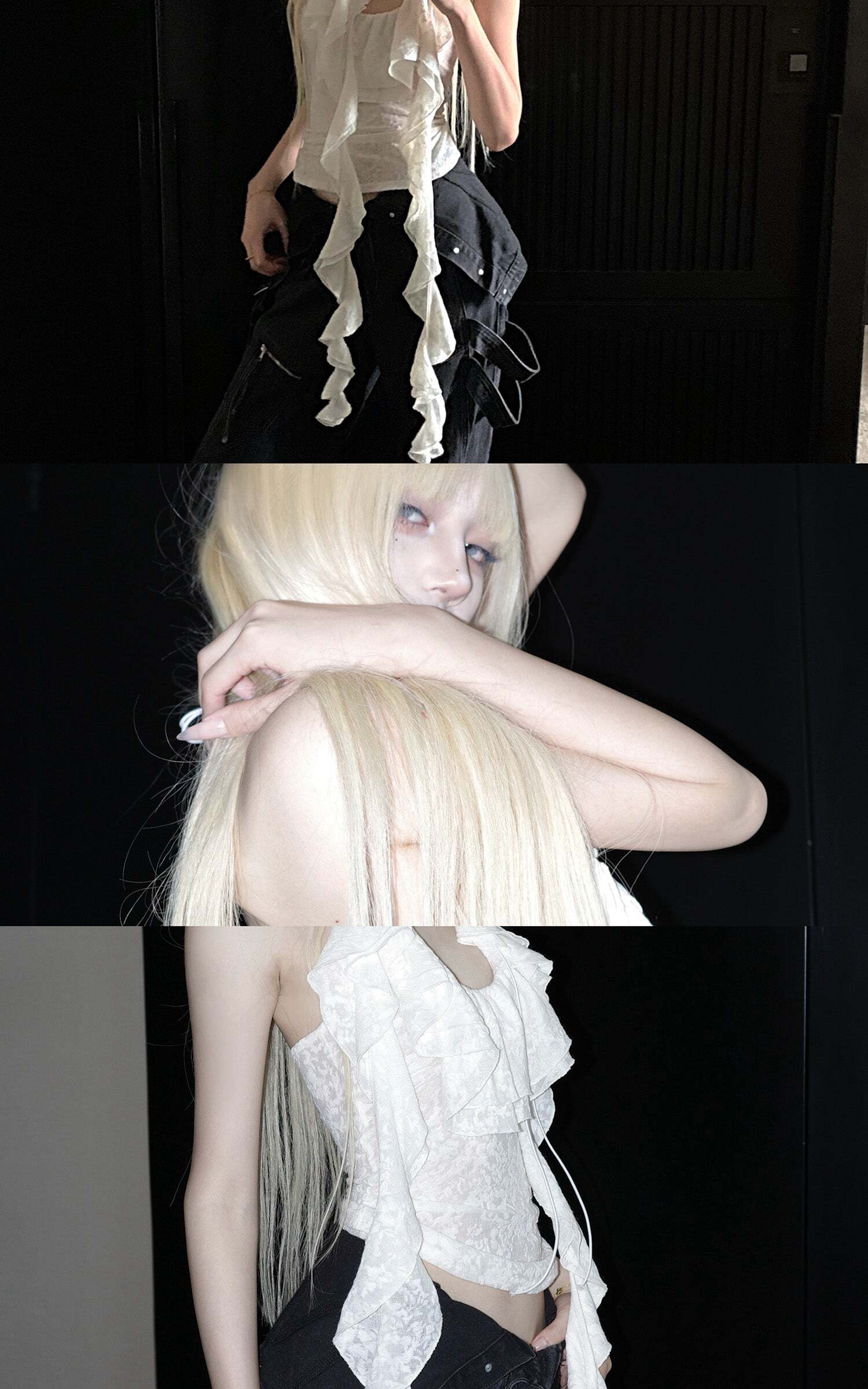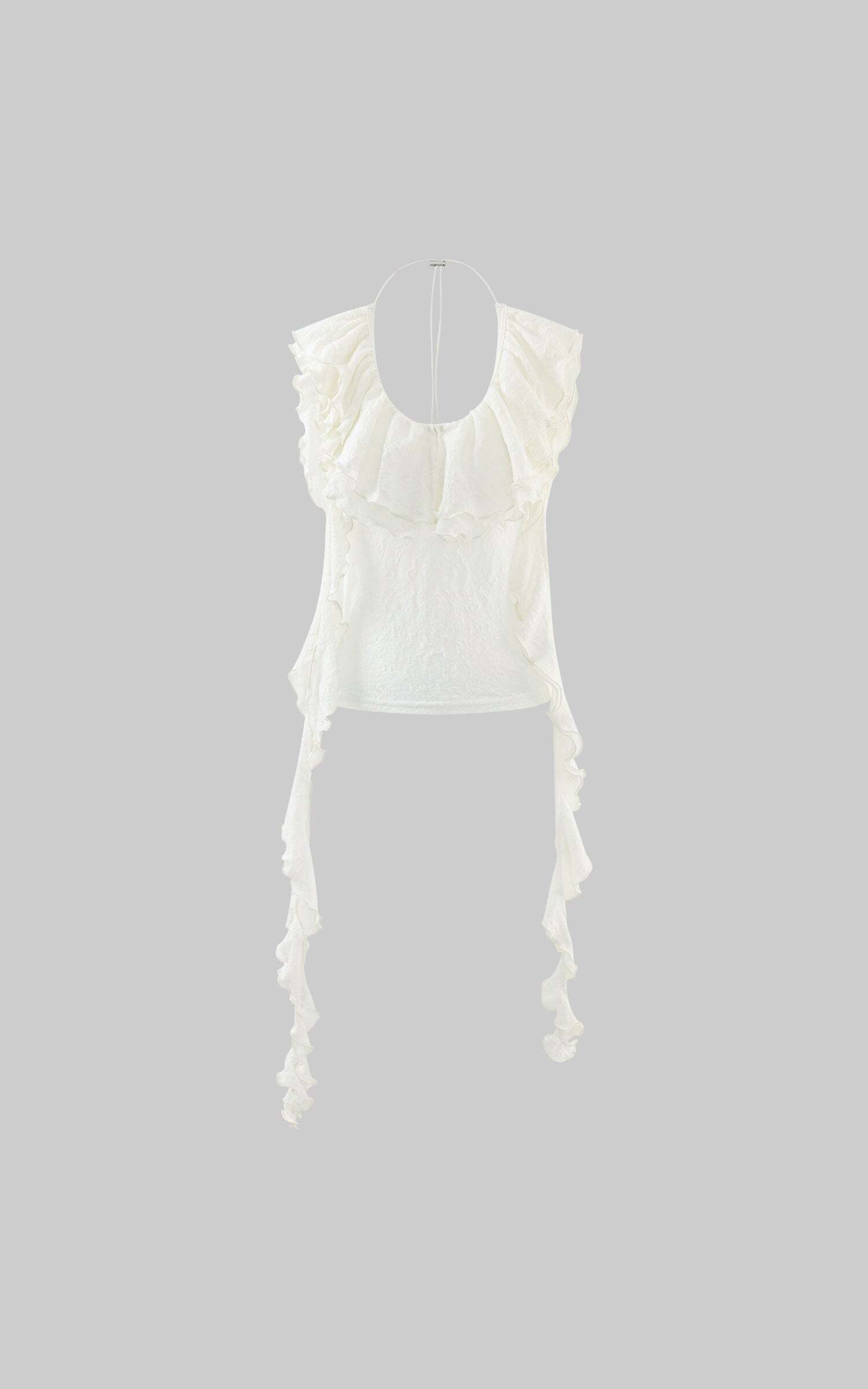 Carving a silhouette both tender and severe, this halter top fuses delicate texture with structured intensity. The semi-sheer lace base clings close like a second skin, while cascading asymmetric ruffles fall from the neckline past the waistline—like verses tumbling in silence. A thin circular strap at the back, secured by an adjustable metal clasp, floats lightly while anchoring the bodice with precision. Best paired with sharply cut bottoms or noir-toned pieces, this design radiates emotion through restraint.