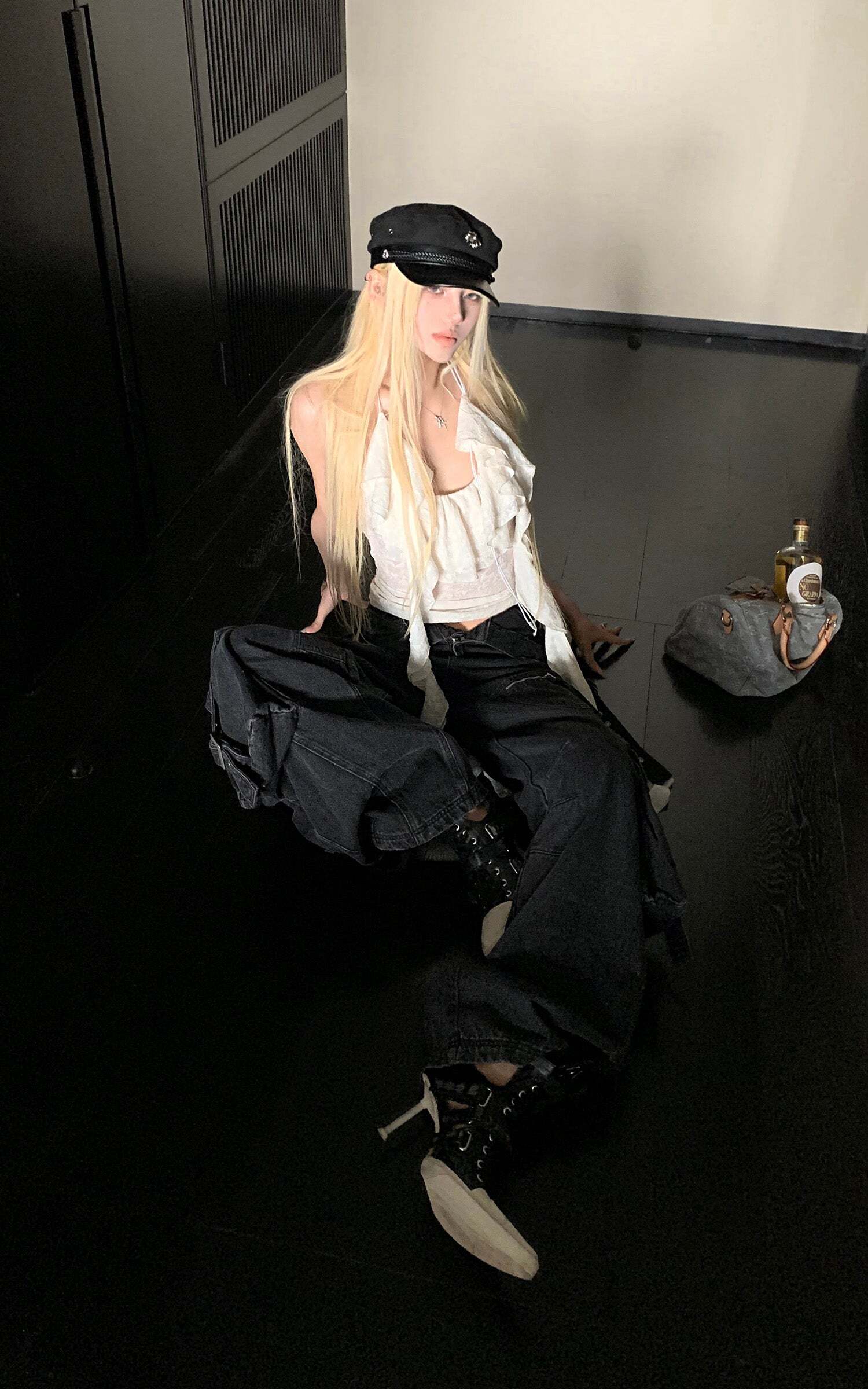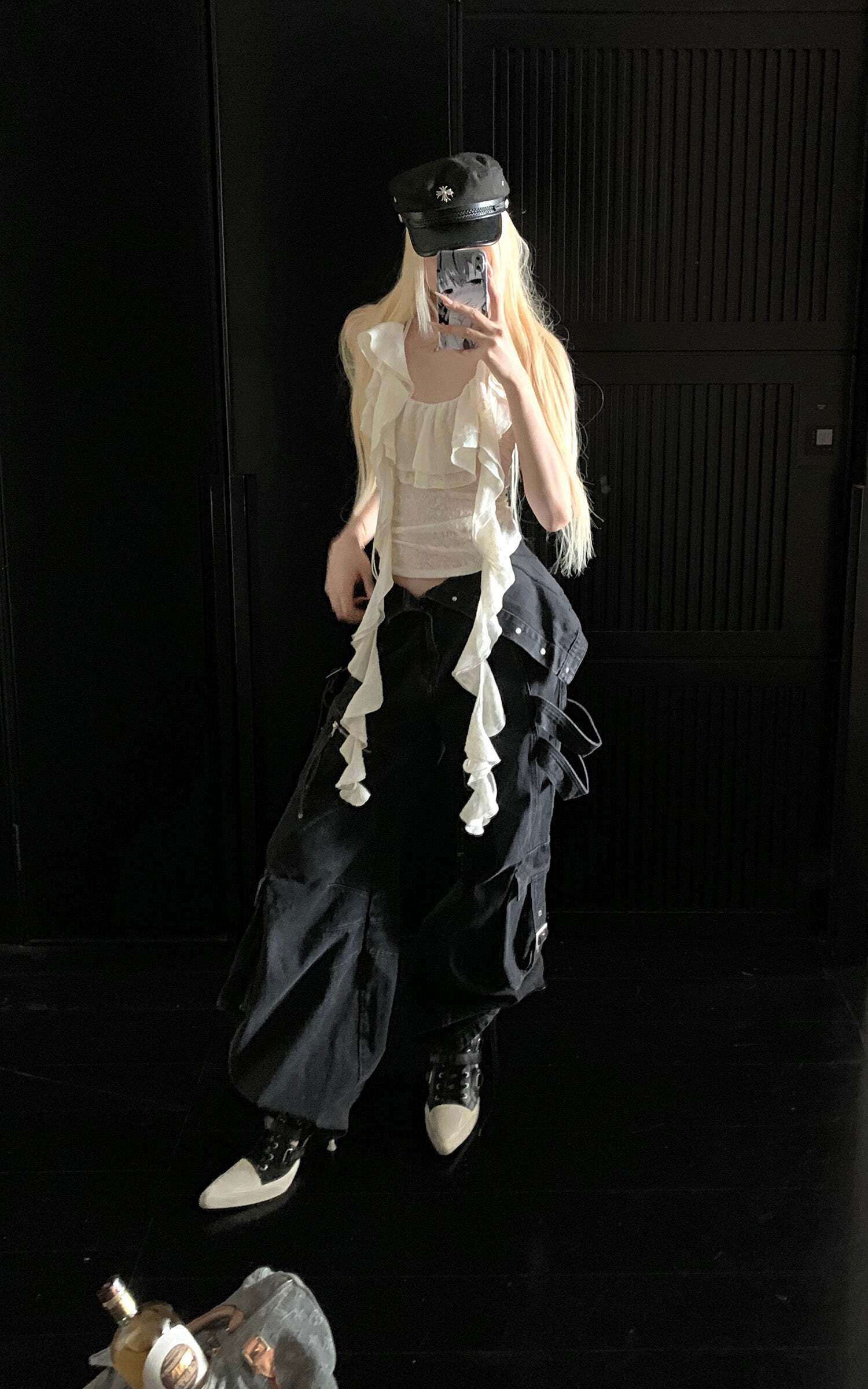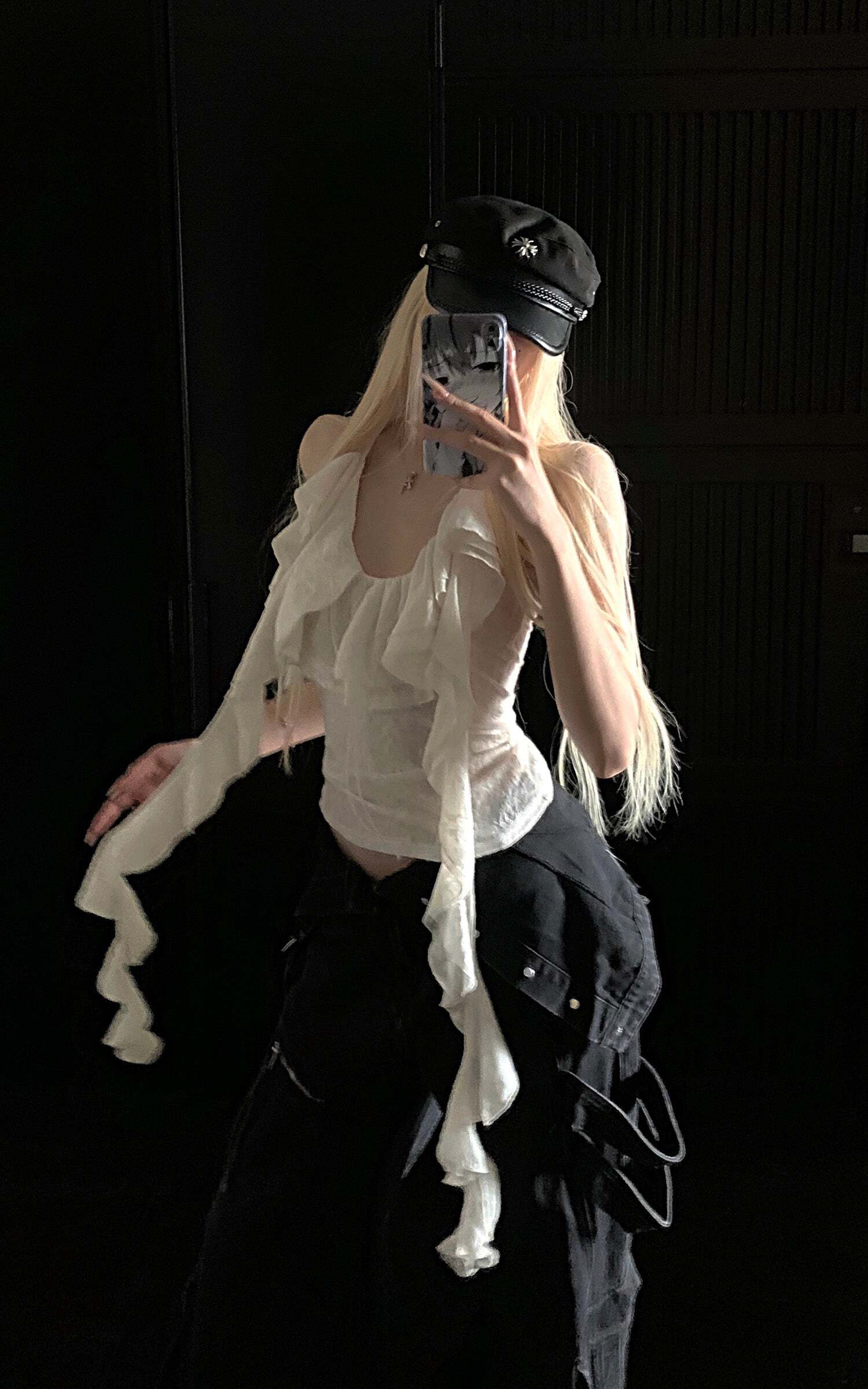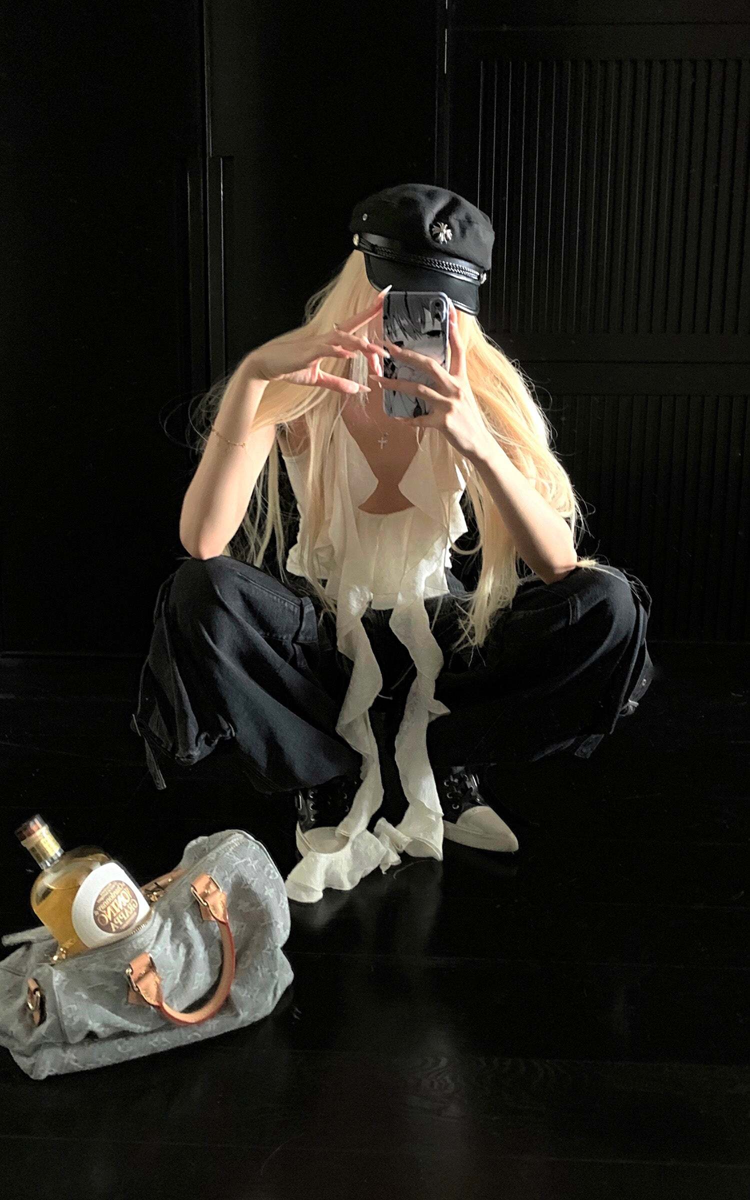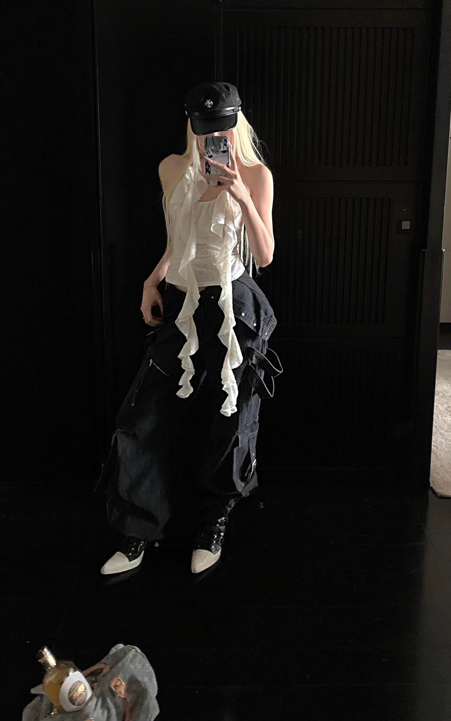 Carving a silhouette both tender and severe, this halter top fuses delicate texture with structured intensity. The semi-sheer lace base clings close like a second skin, while cascading asymmetric ruffles fall from the neckline past the waistline—like verses tumbling in silence. A thin circular strap at the back, secured by an adjustable metal clasp, floats lightly while anchoring the bodice with precision. Best paired with sharply cut bottoms or noir-toned pieces, this design radiates emotion through restraint.