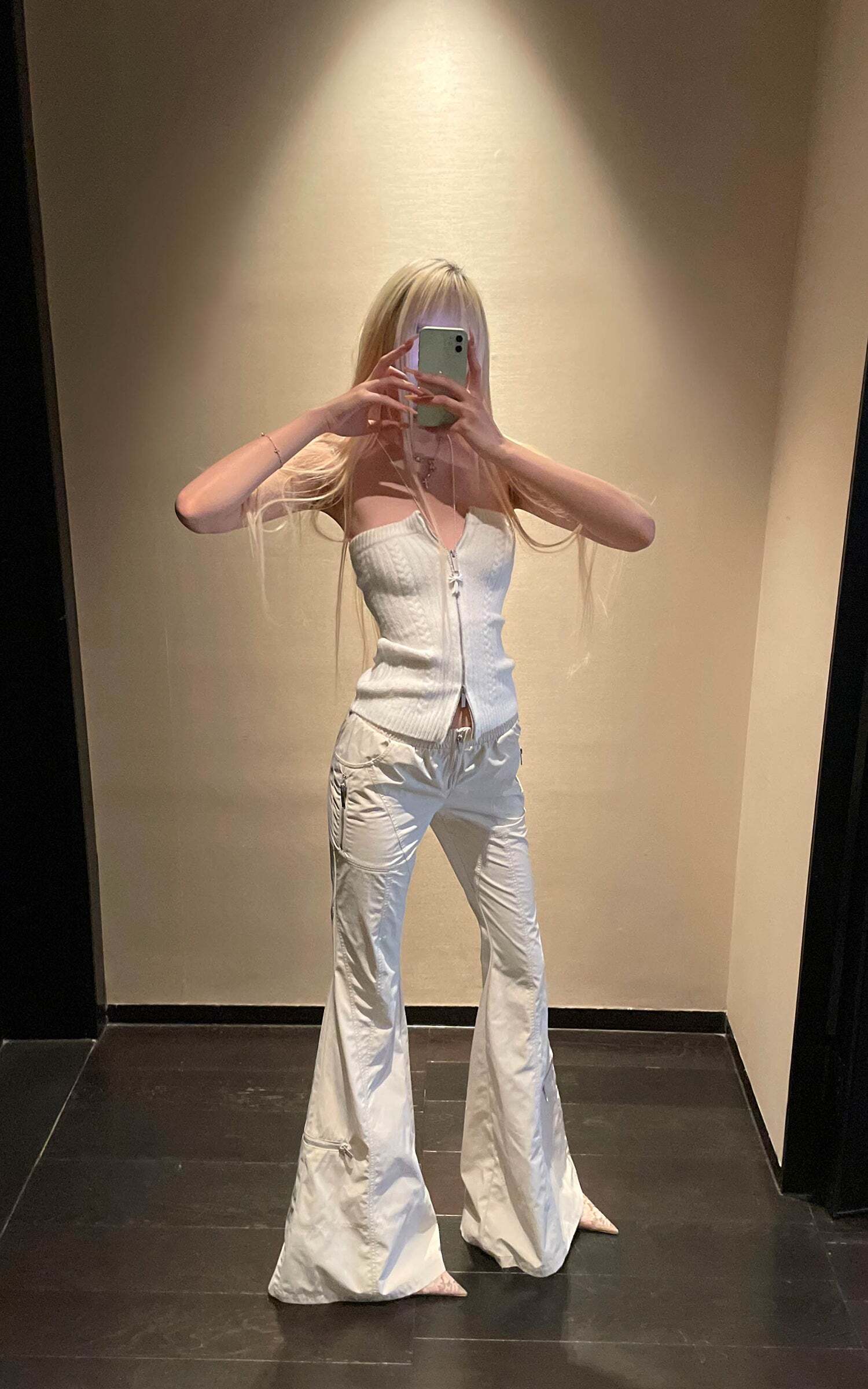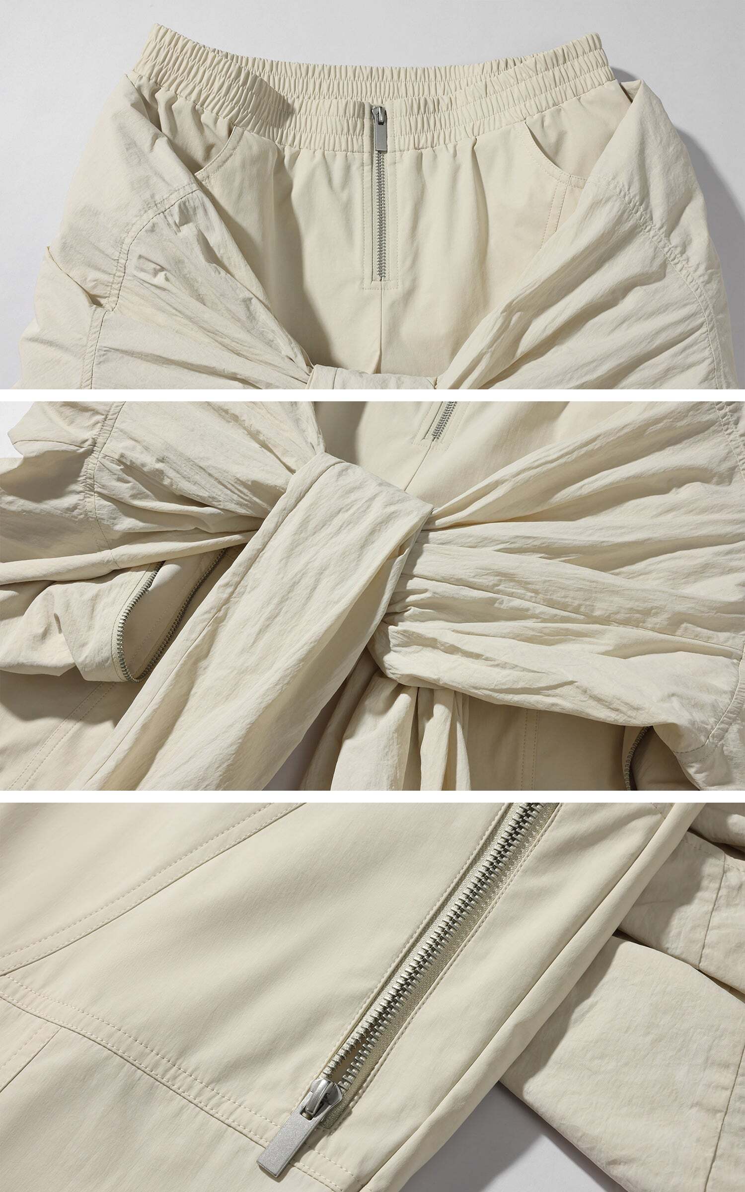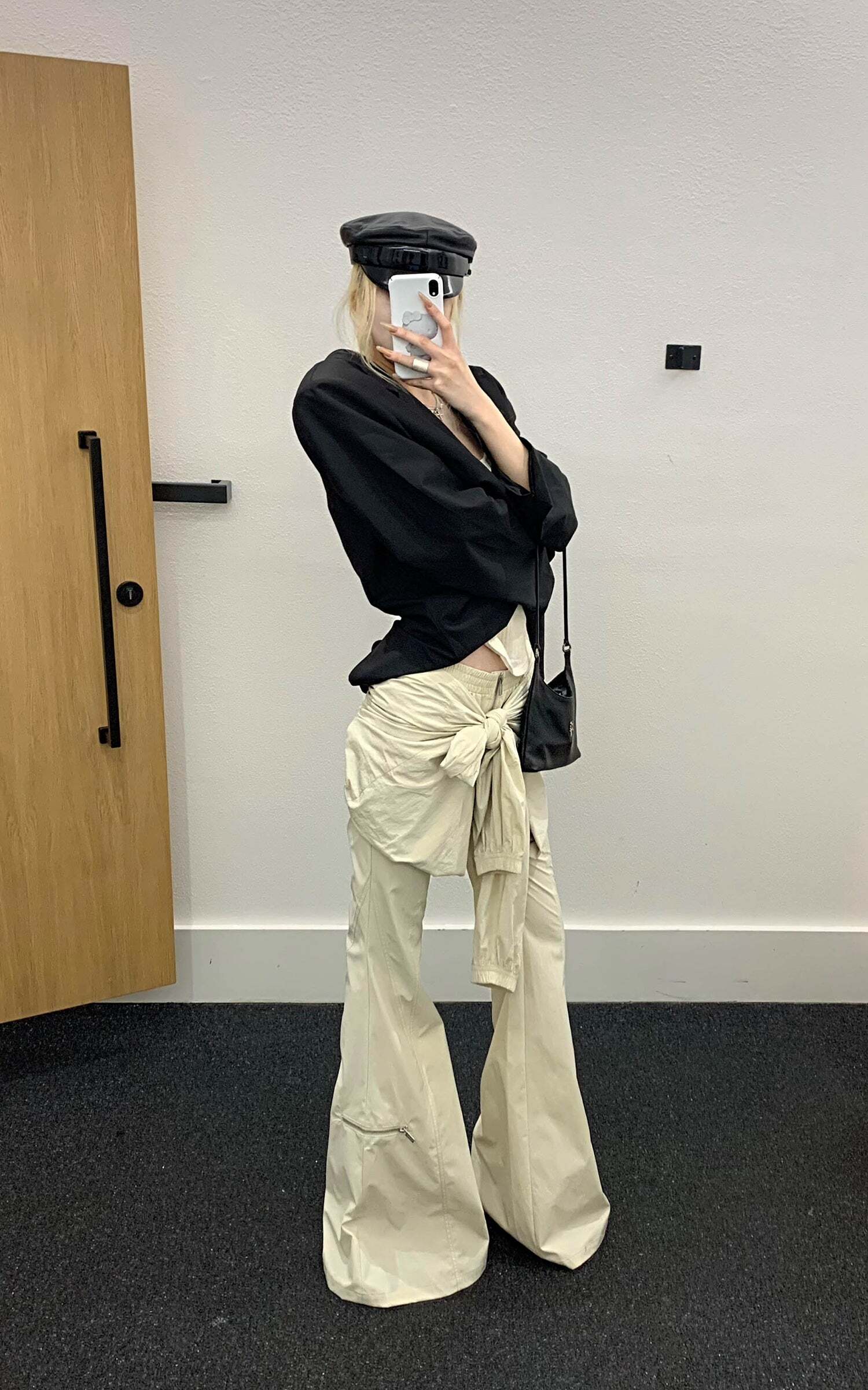 These casual pants embody a deconstructed spirit, layering tension and fluidity in their form. A knotted detail at the waist recalls the gesture of a jacket tied loosely, disrupting the silhouette with asymmetrical drama. The relaxed fit extends into a flared hem, accentuated by zipper details and gathered textures that heighten dimensionality and movement. Crafted from lightweight yet durable fabric, they shift seamlessly from everyday wear to a striking presence under nightfall.