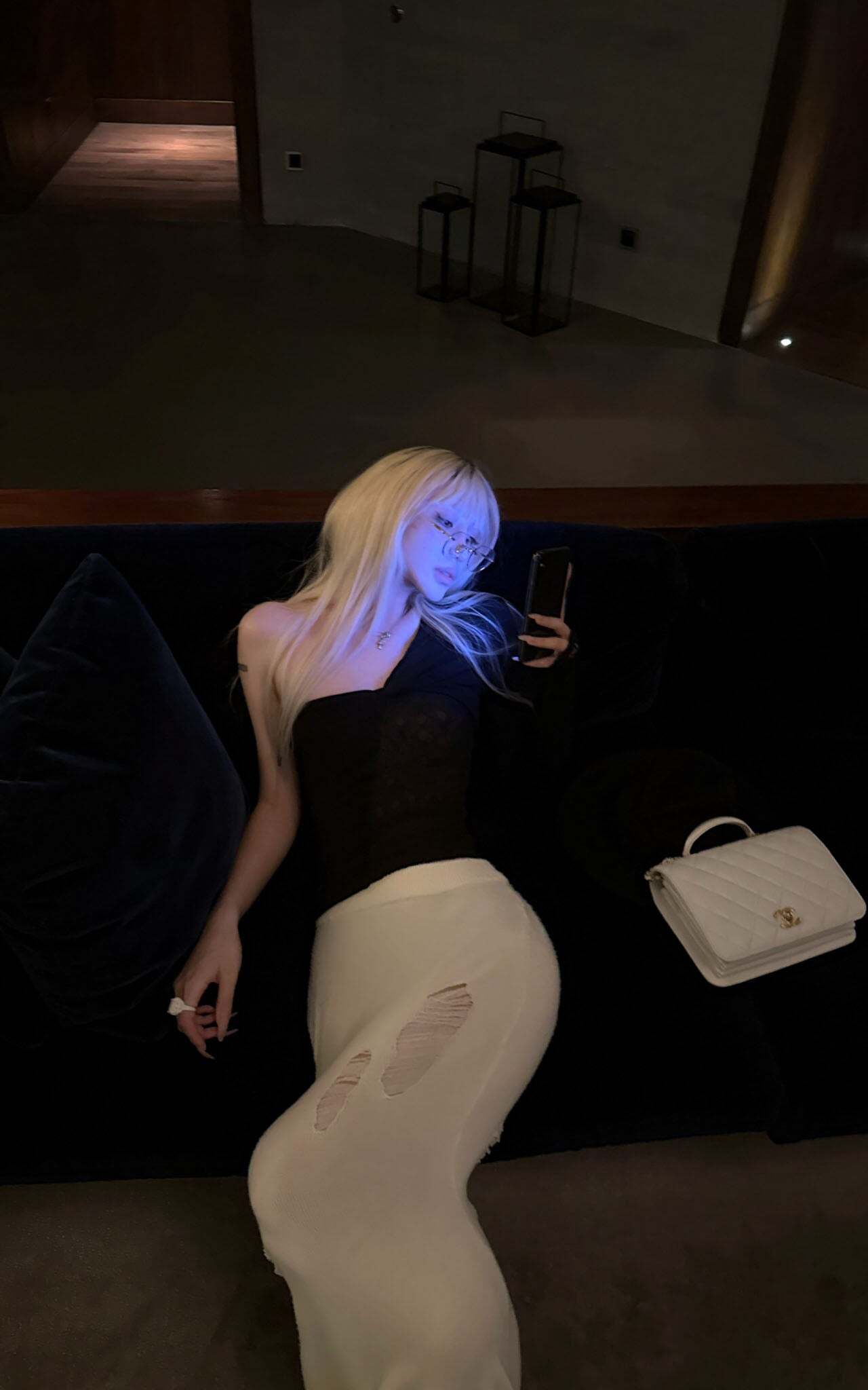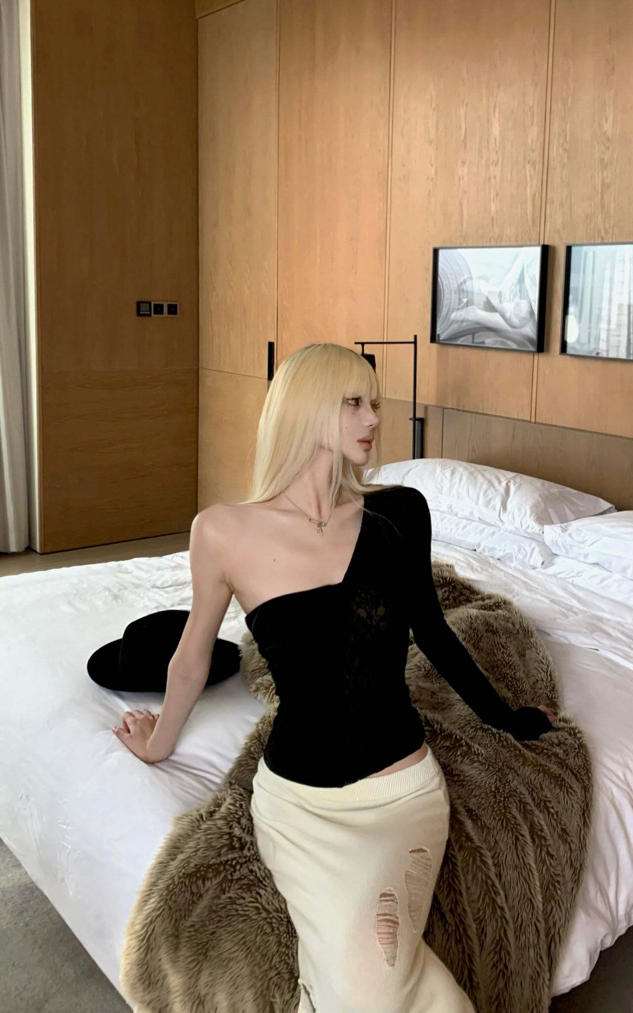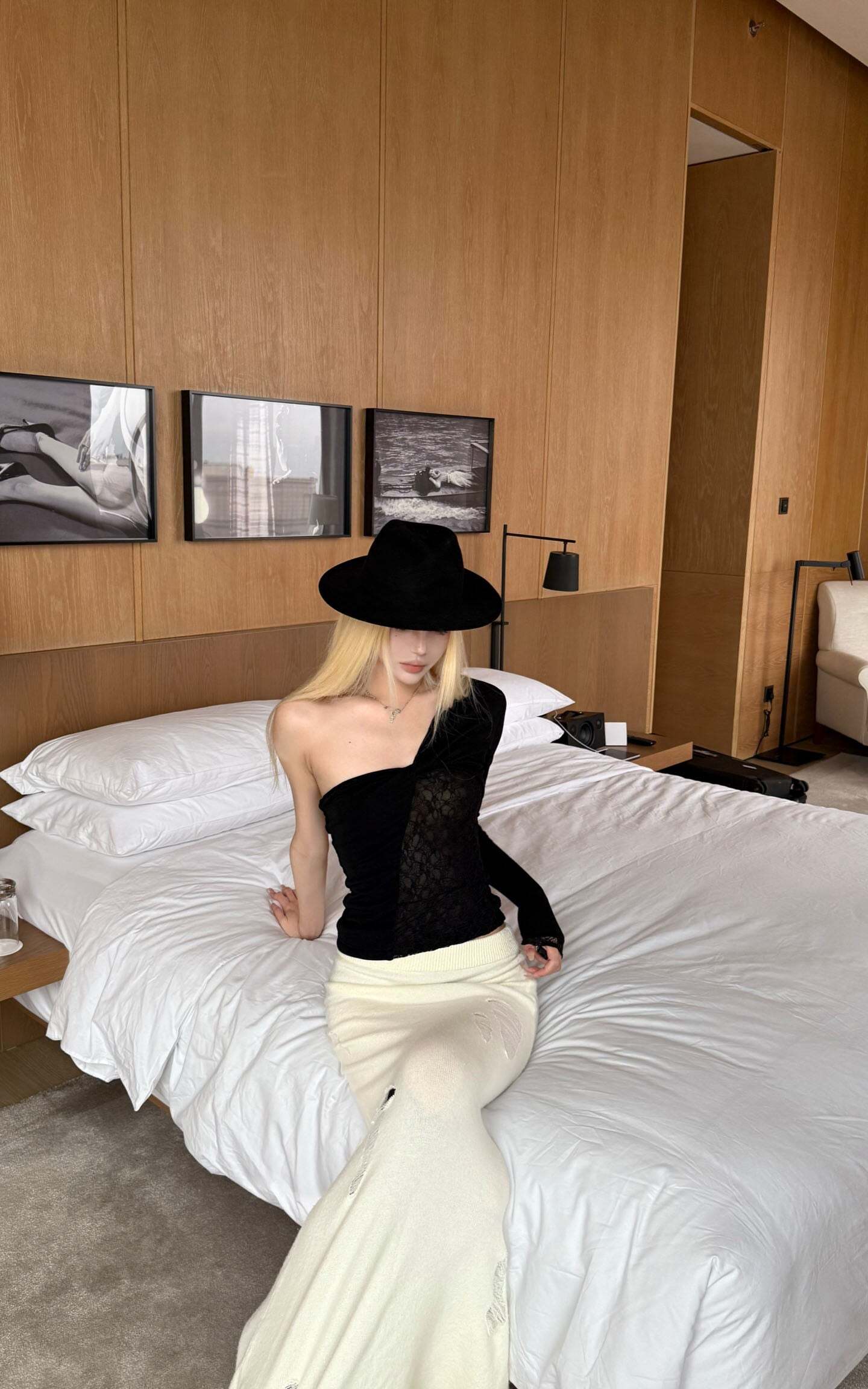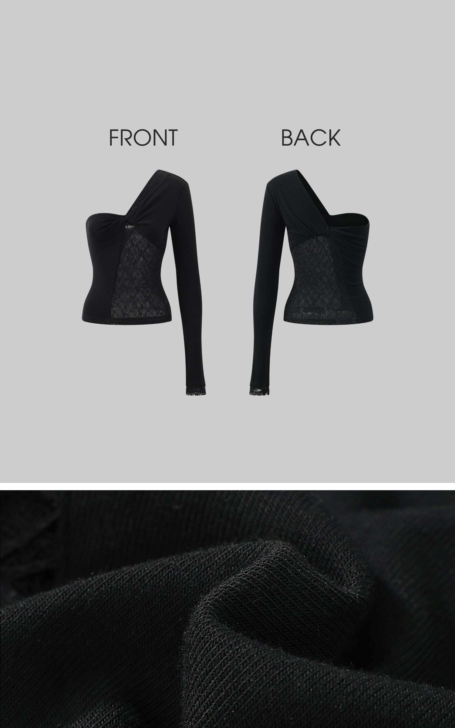 This off-shoulder top features a delicate combination of lace and mesh panels, creating a sophisticated interplay of texture and form. The single sleeve design and twisted front detail lend fluidity and an architectural edge to the silhouette. Intricate lace textures subtly reveal the natural glow of the skin, adding a refined touch of sensuality. The soft, stretchy fabric hugs the body comfortably, ensuring a flattering fit. Perfect for both casual and evening wear, this piece elevates any outfit with its distinctive character.