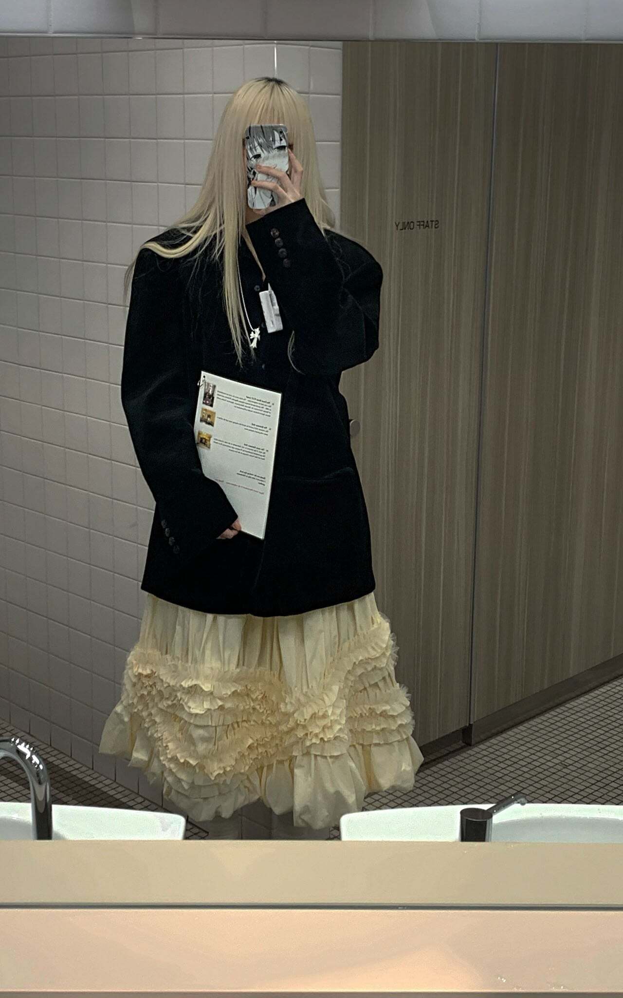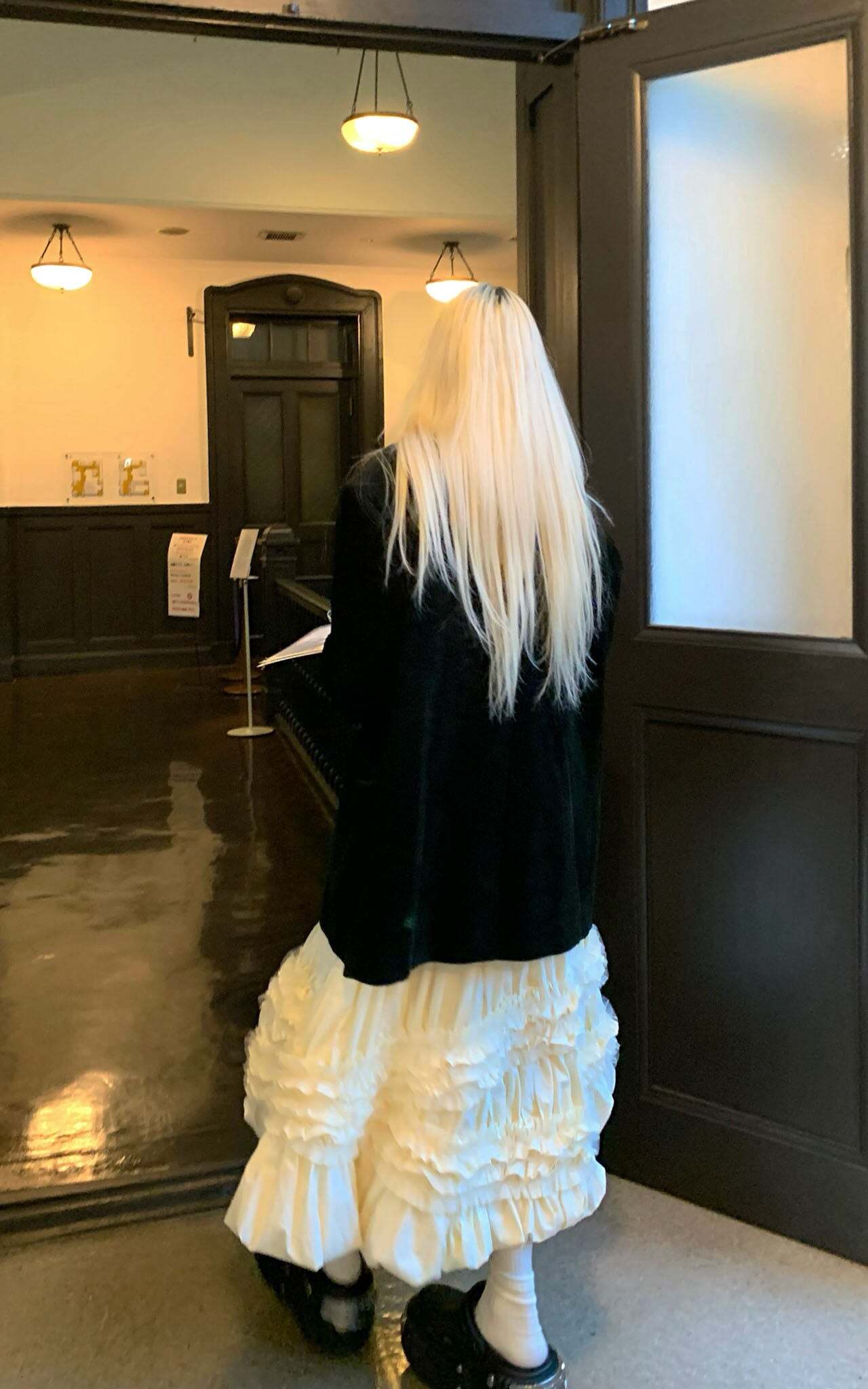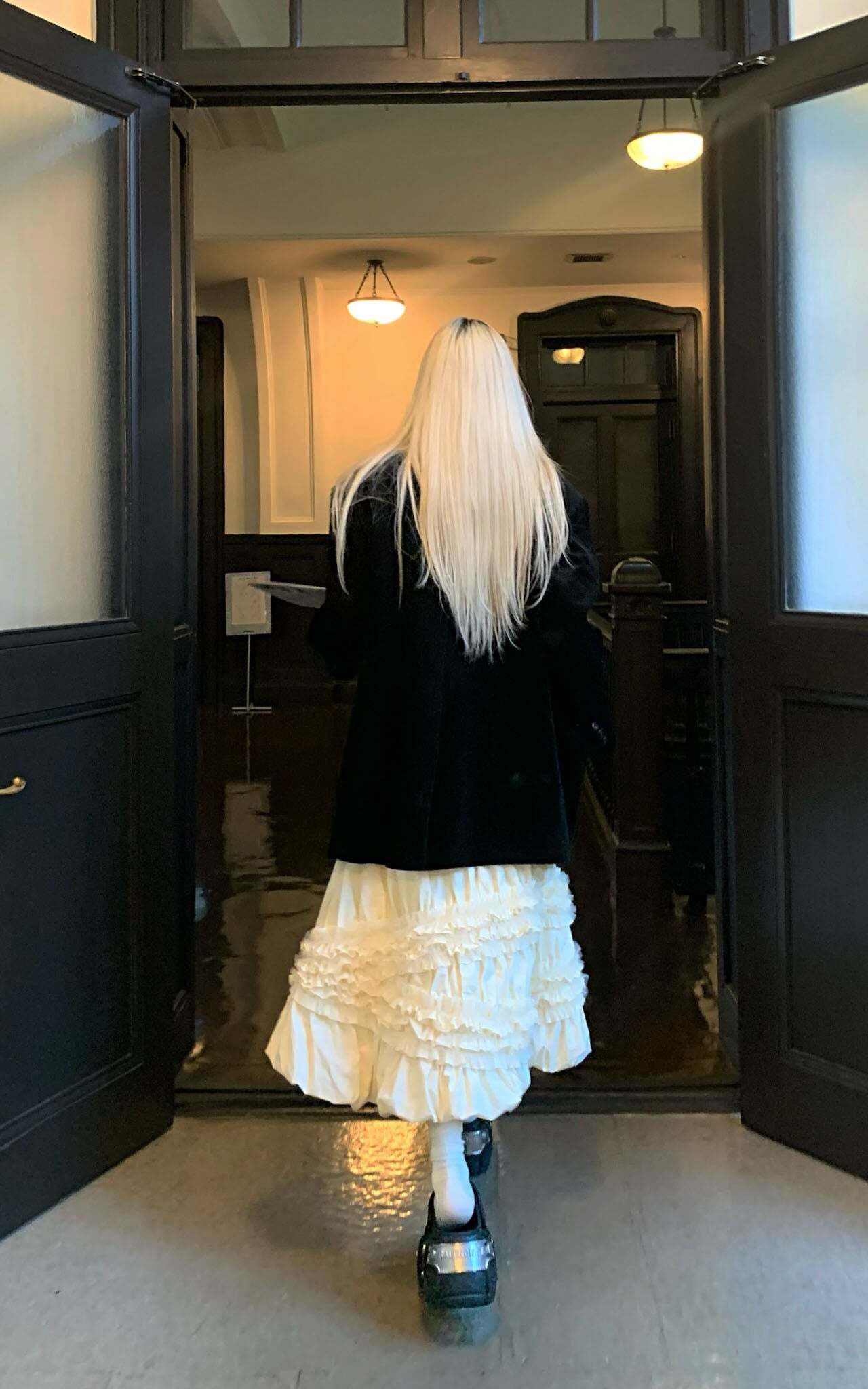 A statement piece that redefines femininity with an edge. Featuring intricate tiered lace details and a voluminous silhouette, this puff midi skirt combines playful structure with delicate craftsmanship. Elasticated at the waist for a customizable fit, it’s designed to flow effortlessly with your movements. Pair it with chunky boots for a juxtaposed aesthetic or with sleek heels for a dreamy, elevated look.