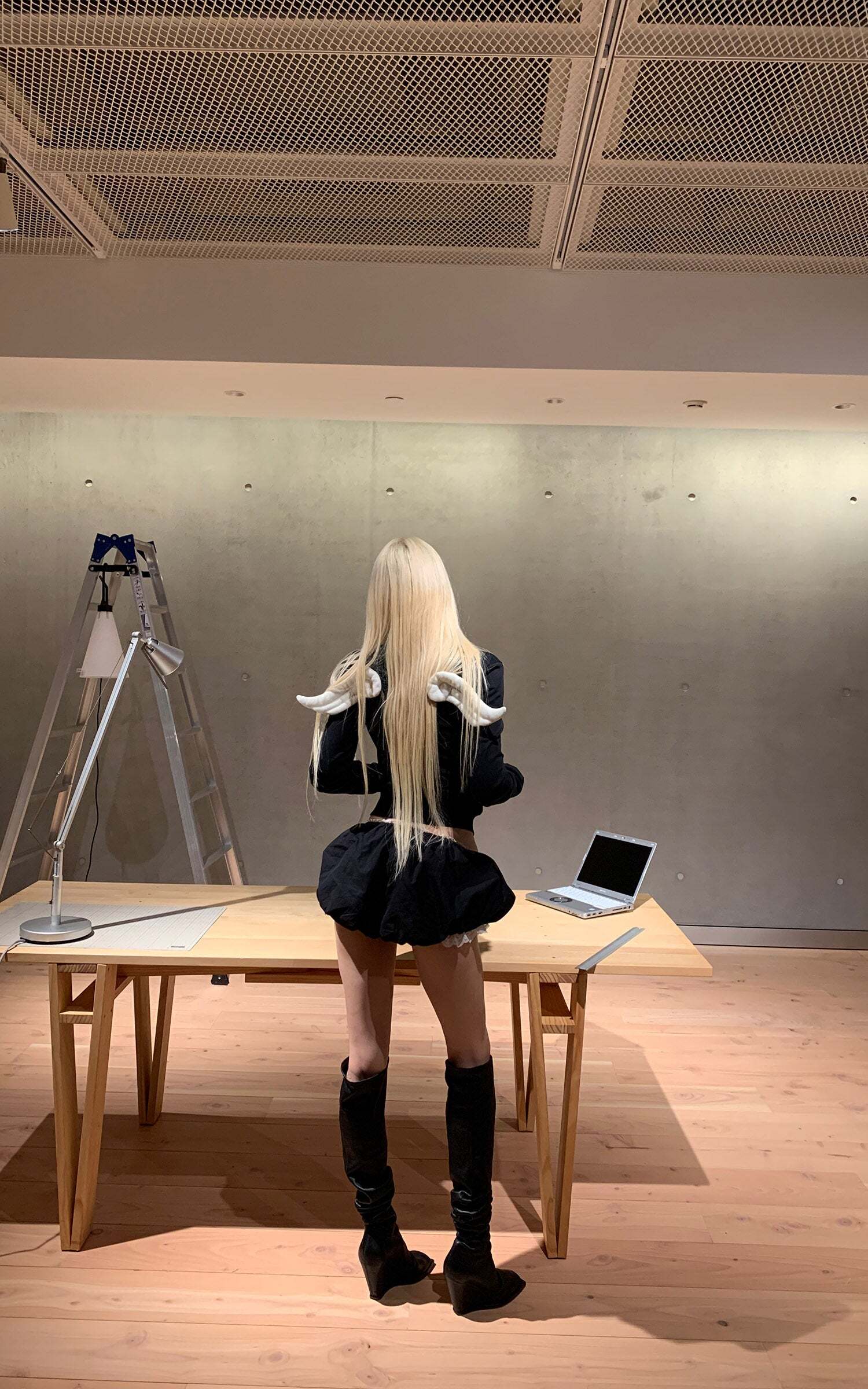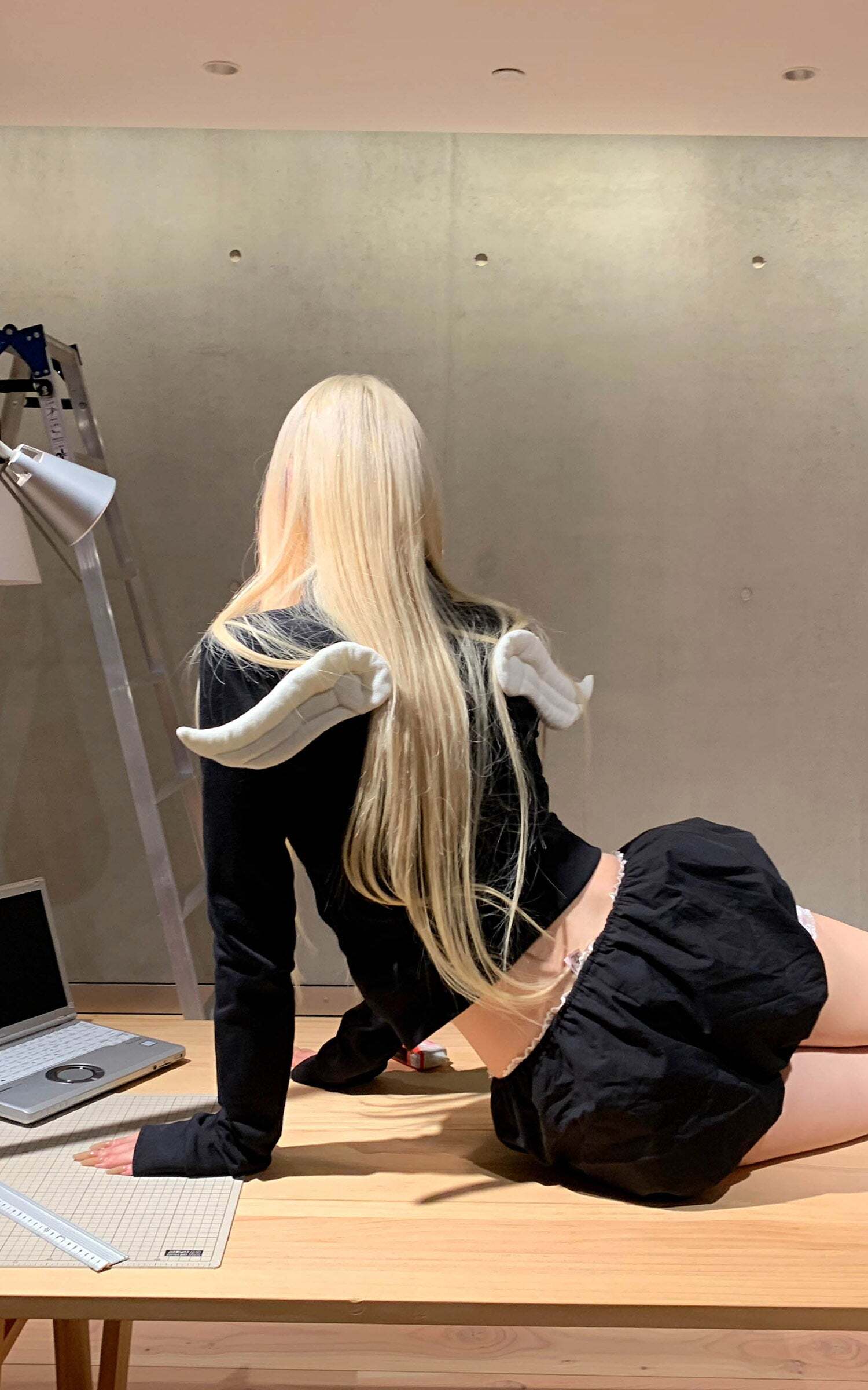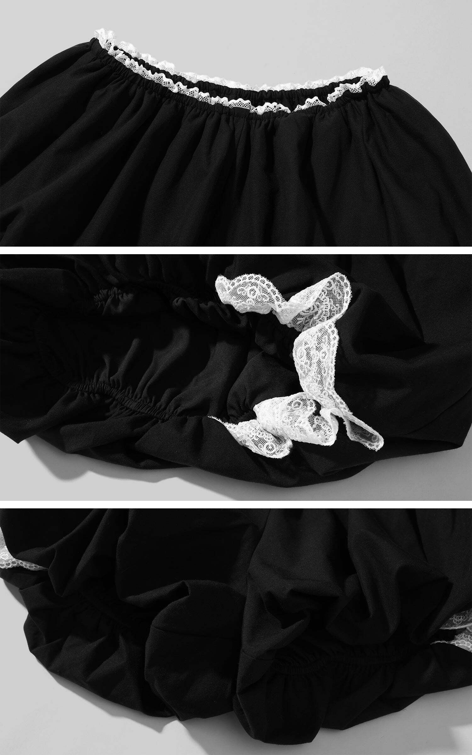These shorts embody a voluminous bubble silhouette, infused with a touch of drama. Delicate lace trims accentuate the edges, adding subtle romantic tension. The elastic waistband creates effortless gathers, offering comfort and fluid movement. Balancing simplicity and ornamentation, this piece can be worn alone or layered, evoking a distinctive mood between playful allure and stark restraint.