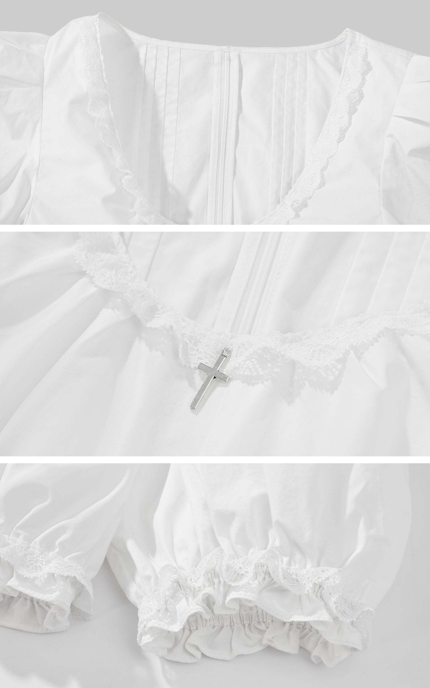 Innocence meets ascetic allure in this cropped cotton top. Puff sleeves and ruffled hems frame a delicate silhouette, while a silver cross pendant anchors the neckline with solemn gravity. Lace trim outlines the soft curves, and the fitted hem reveals the midriff—vulnerable, yet assured.