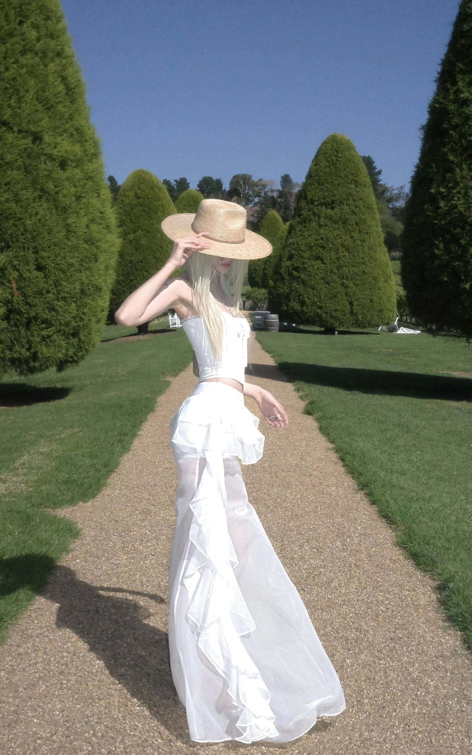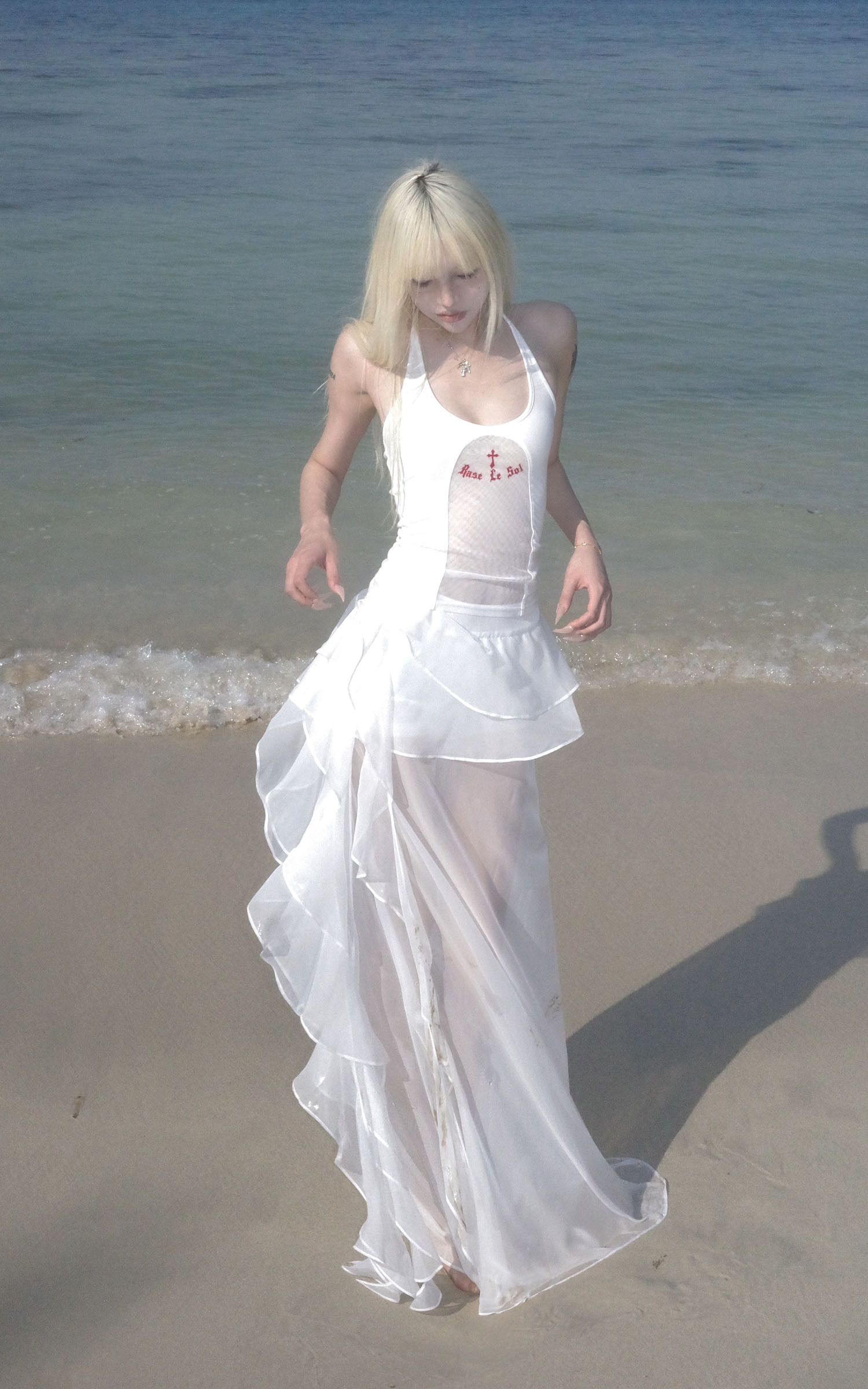 This skirt is crafted from airy sheer fabric, flowing with each movement like a silent murmur. A structured waistband gives way to delicate, layered ruffles that cascade naturally to the ankles, evoking a subtle, shifting rhythm. The translucent texture hovers between reality and illusion, endowing the body with a ghostly presence. An asymmetrical slit along the side disrupts the stillness of the form, tracing a silhouette that speaks of independence and quiet defiance. Light yet resolute, fragile yet strong.