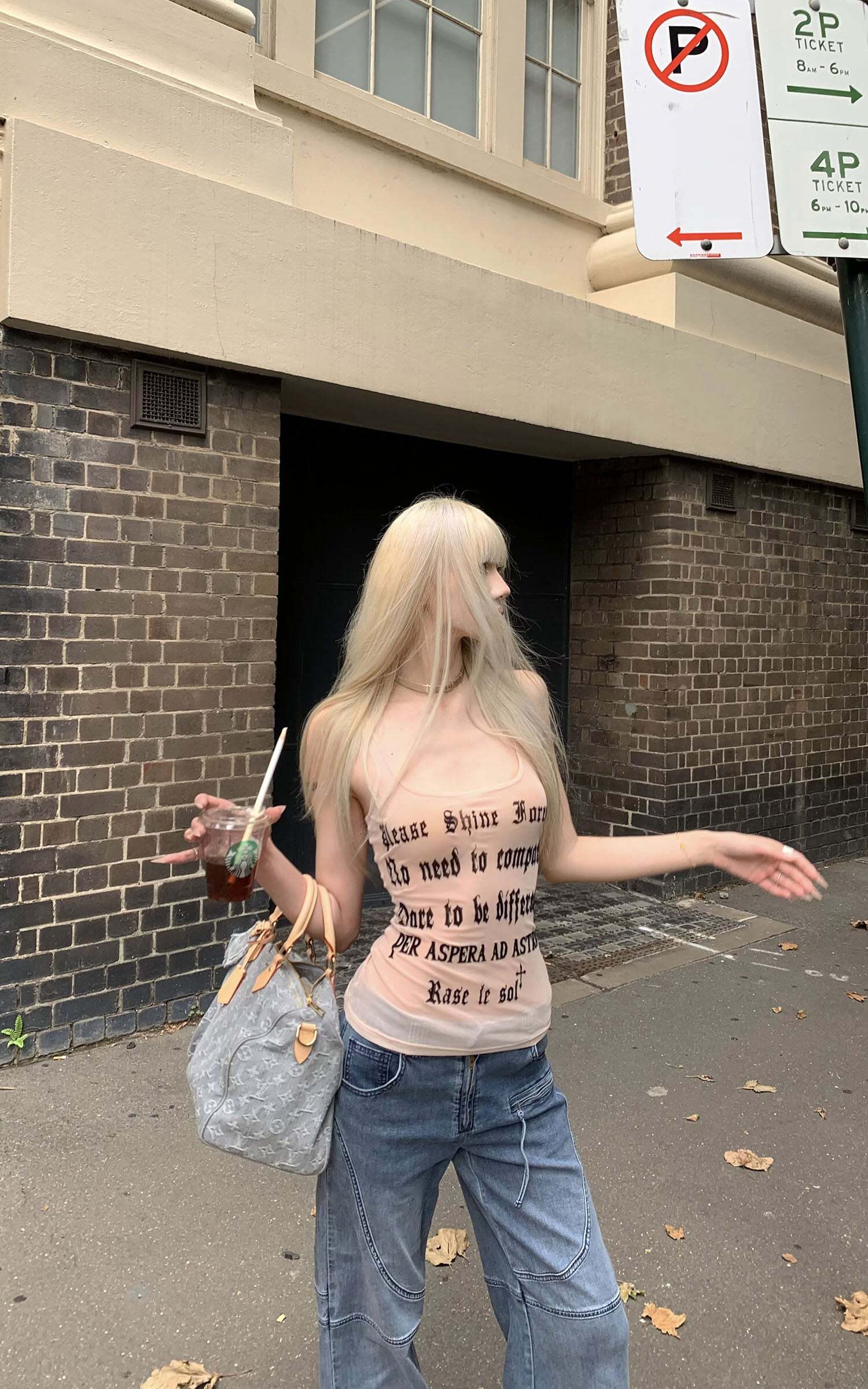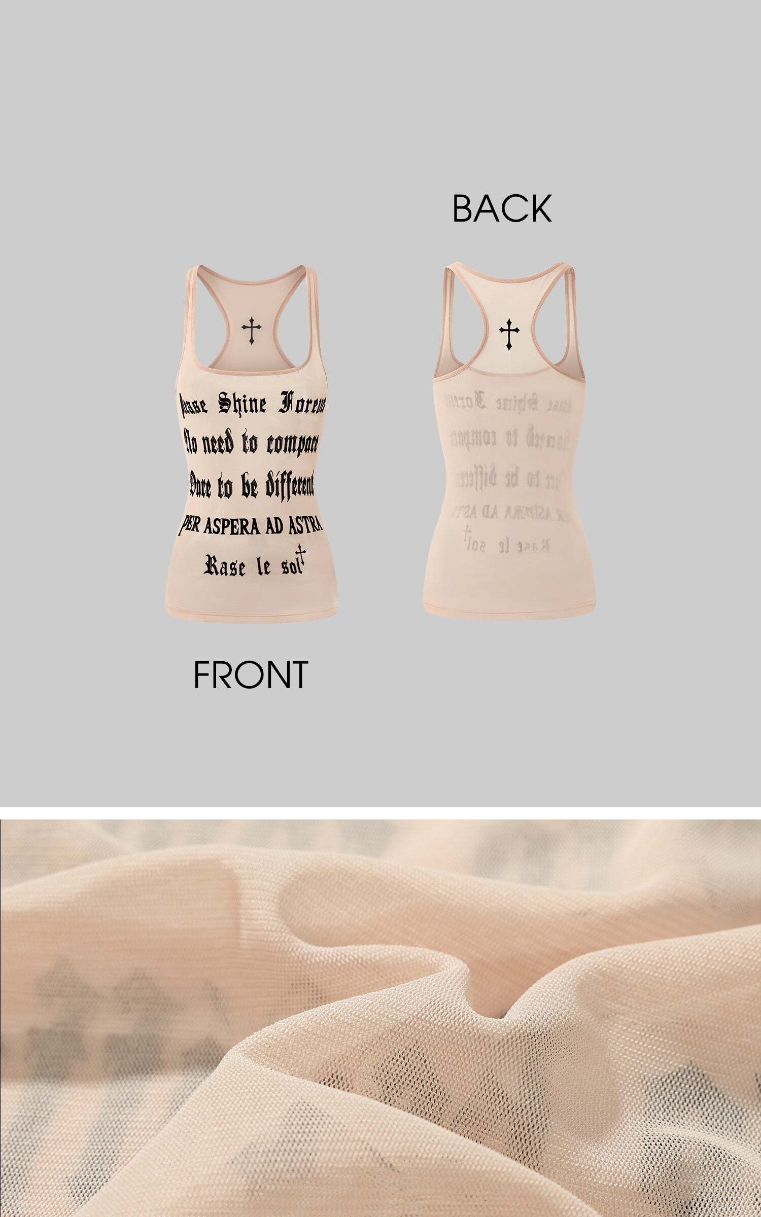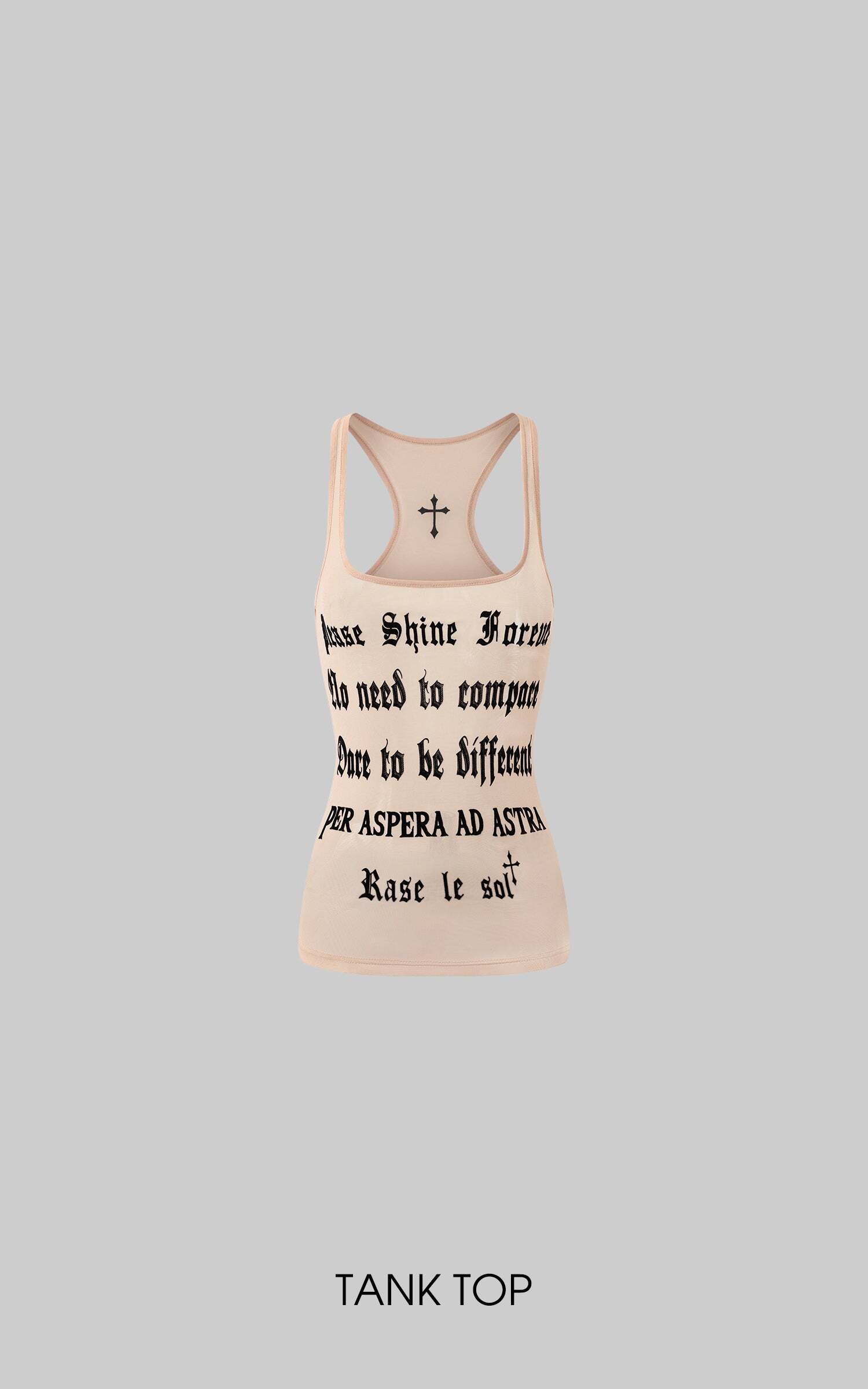 A sheer nude-pink mesh tank top paired with a matching bandeau forms this two-piece set—minimal in construction yet powerful in message. Gothic black lettering across the front weaves a manifesto of defiance, difference, and ascension, while a single cross printed at the upper back evokes a quiet, spiritual severity. The top drapes close to the body, subtly sculpting the silhouette without restricting movement. The included bandeau is crafted from a soft, slightly elastic fabric, offering a second-skin feel and discreet support. Designed for both layering and standalone wear, this set invites the wearer to make the body a site of expression—personal, poetic, and unapologetic.